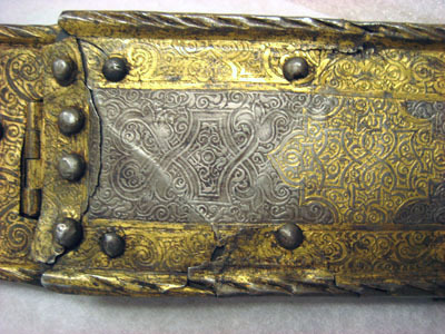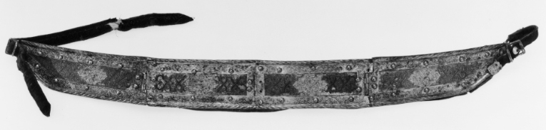 bringbetäckning med en drifven rund uphöjning på hvardera sidan samt 4 söljor af förgyldt jern,