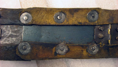 ländbetäckning, ryggskållan bildande en hög kam, slutande i en rund upstående plåtskifva, vid hvilken är fastnitadt ett förgyldt lejonhufvud i drifvet arbete på en utskuren skålla - på betäckningens högra sida finnas hål, orsakade af rost.