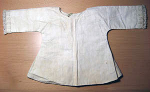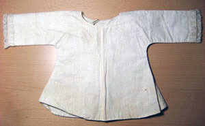 Naturvit nattröja i dubbelvävt (tuskaft) i linne, sydd i fyra delar. Halsringningen är rundad och på ärmen är en spets som är 30 mm. På baksidan är tre krysade band fastsydda på var sin sida som är 140 mm långa och 7 mm breda.