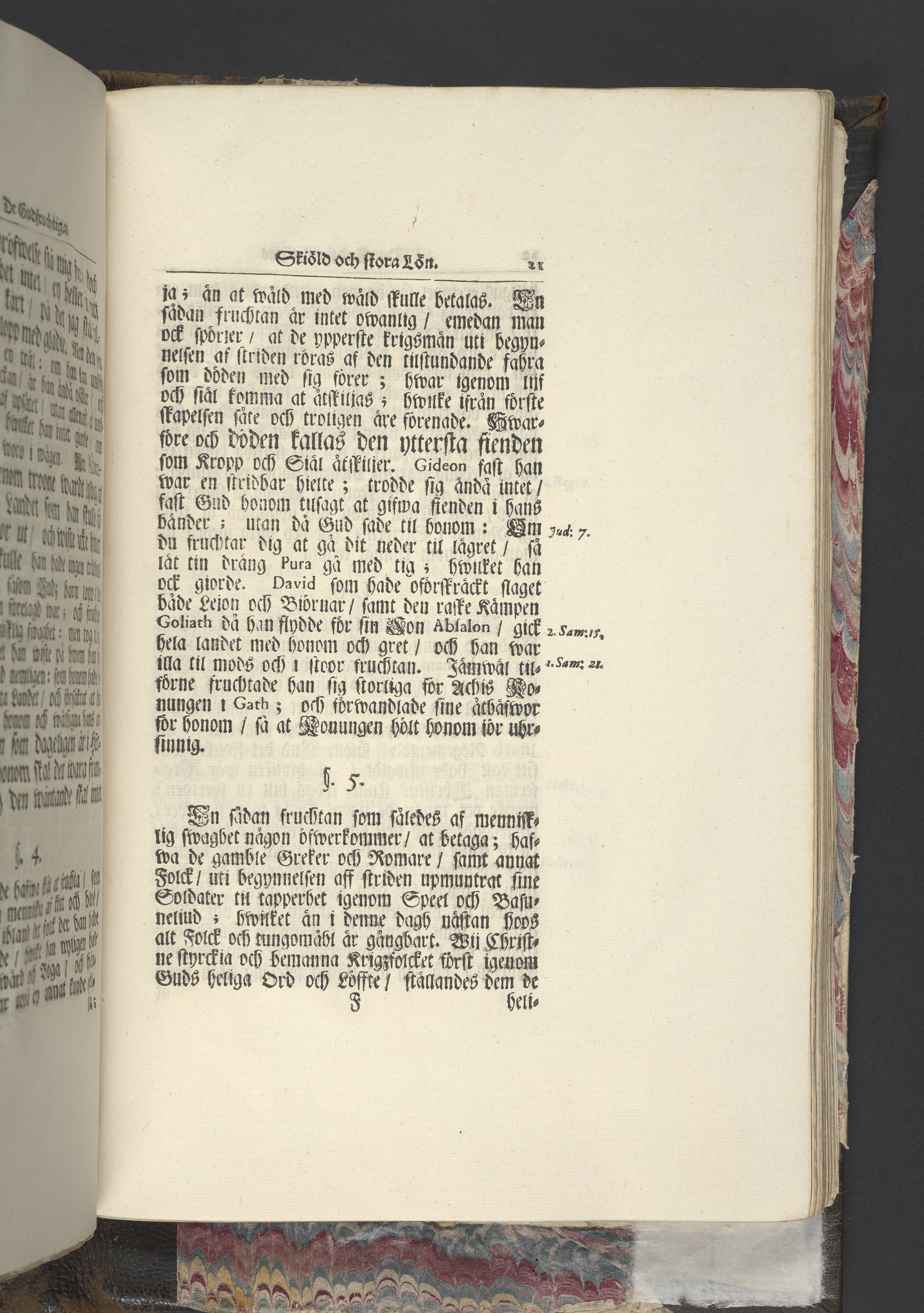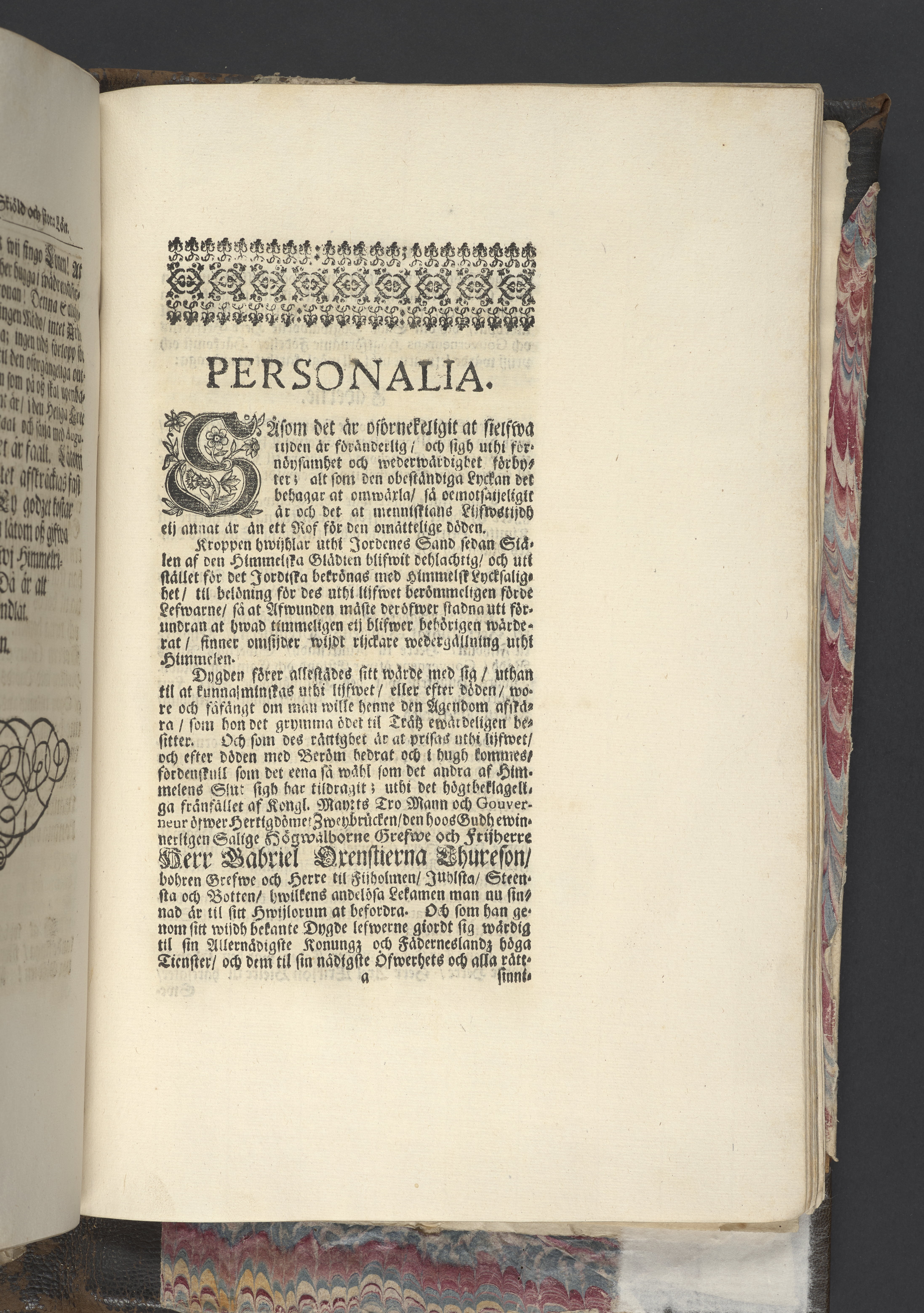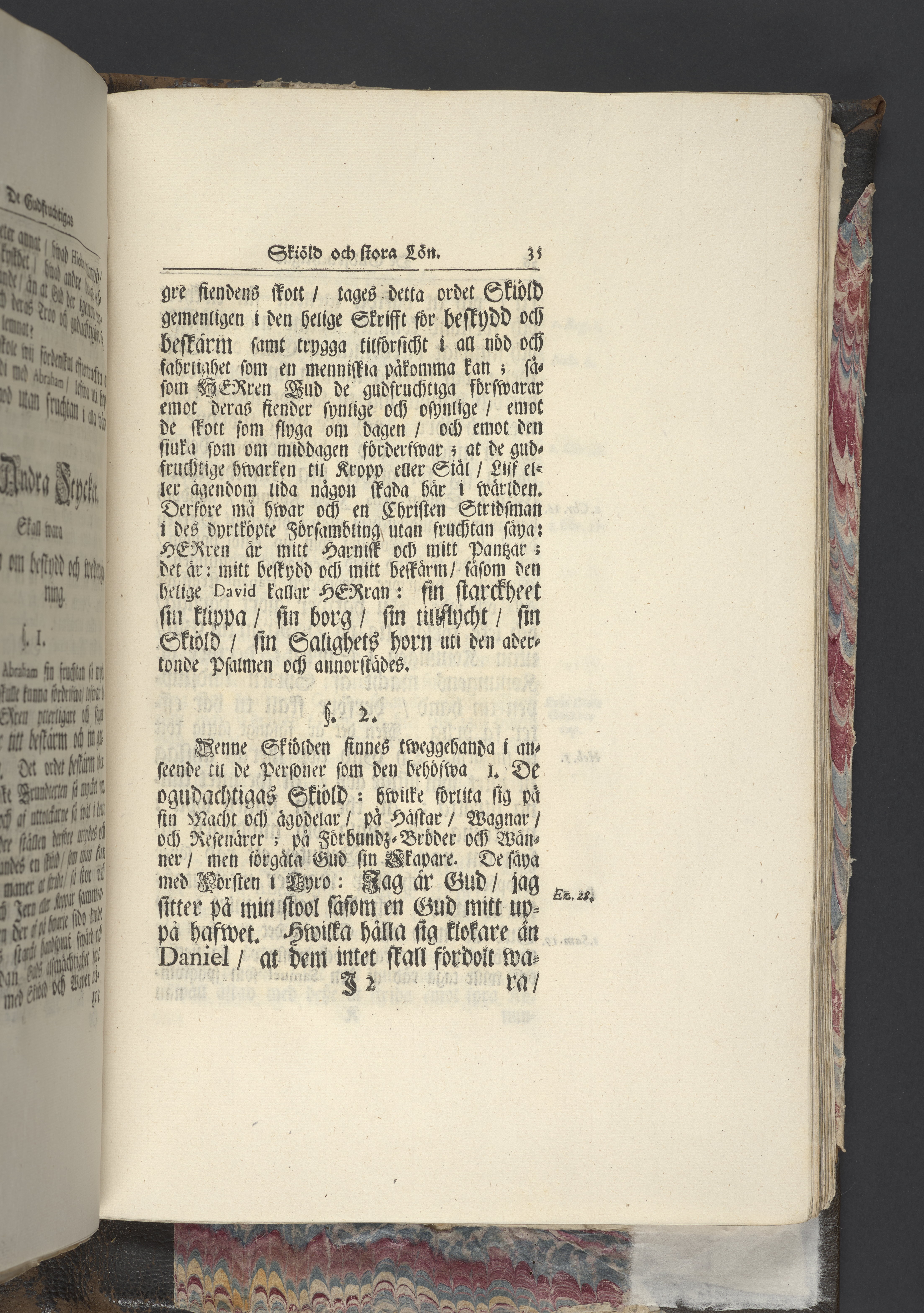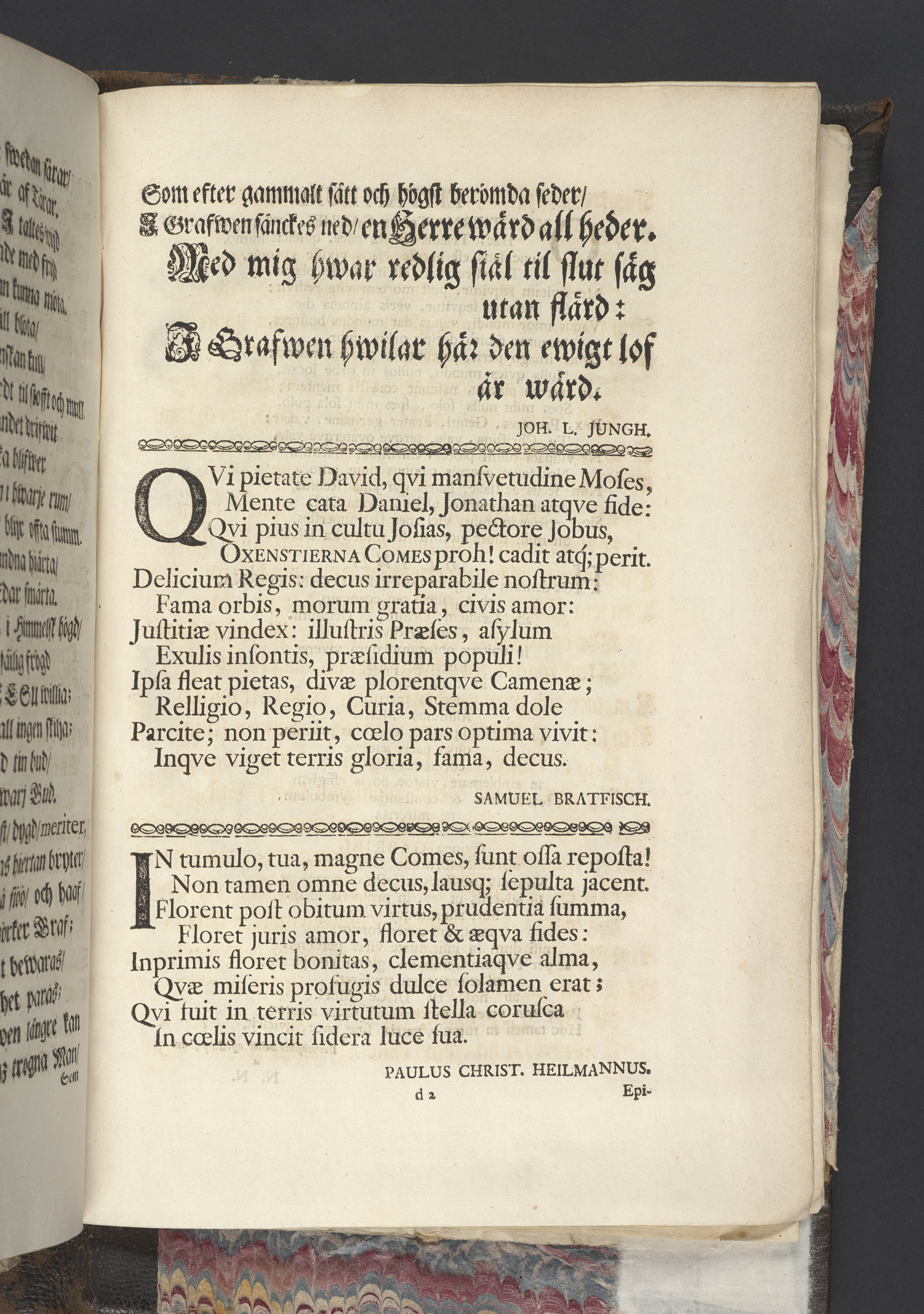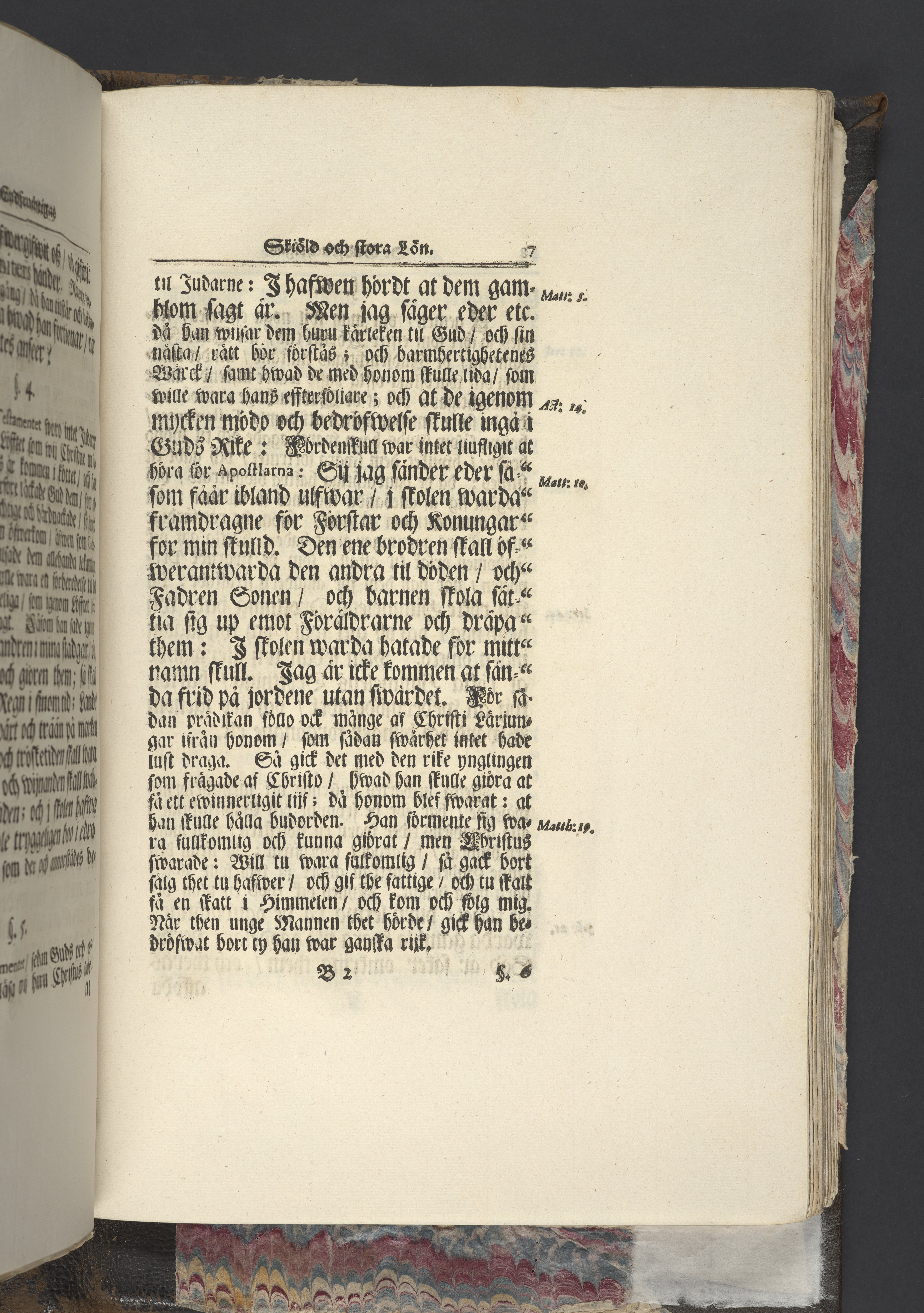 Band m. pärmar av marmorerat papper, rygg och hörn av pergament. Pärmfyllnad: trä.