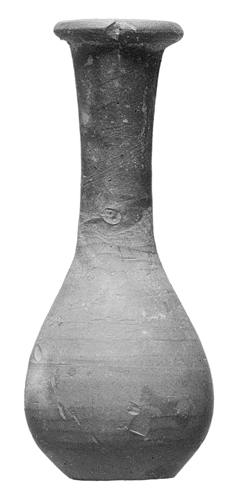 TÅRFLASKA. Av rödbrunt, bränt lergods. Päronformad, med plan botten samt lång, nästan cylindrisk hals med stavformigt utsvängd mynningskant; halsen målad i något mörkare rödbrunt. Mått: Höjd: 9,4 cm.; diameter: 3,9 cm. Botten, diasmeter: 2,3 cm. Mynning, diameter: 2,7 cm.