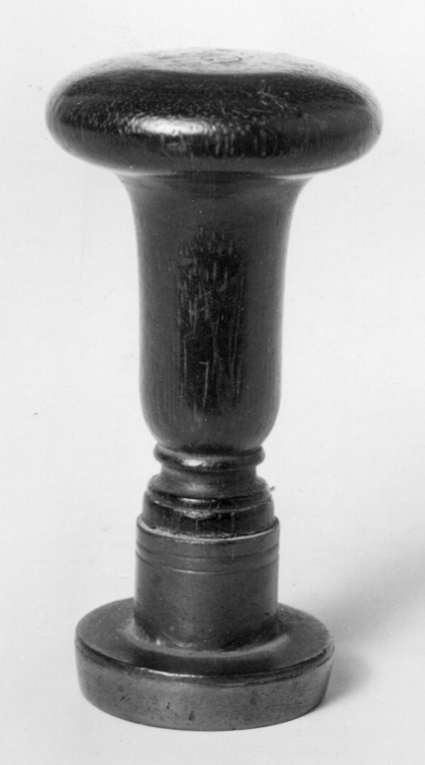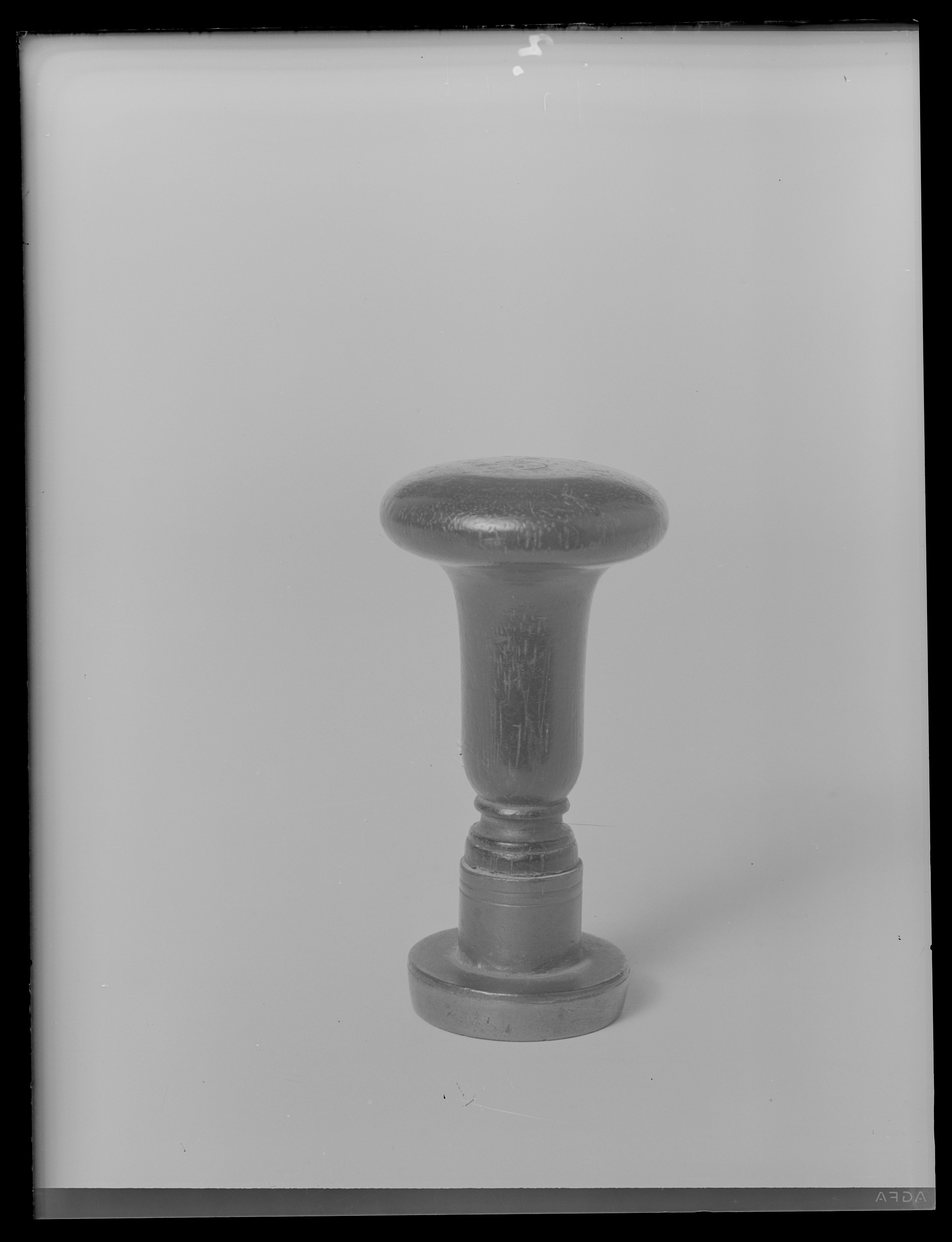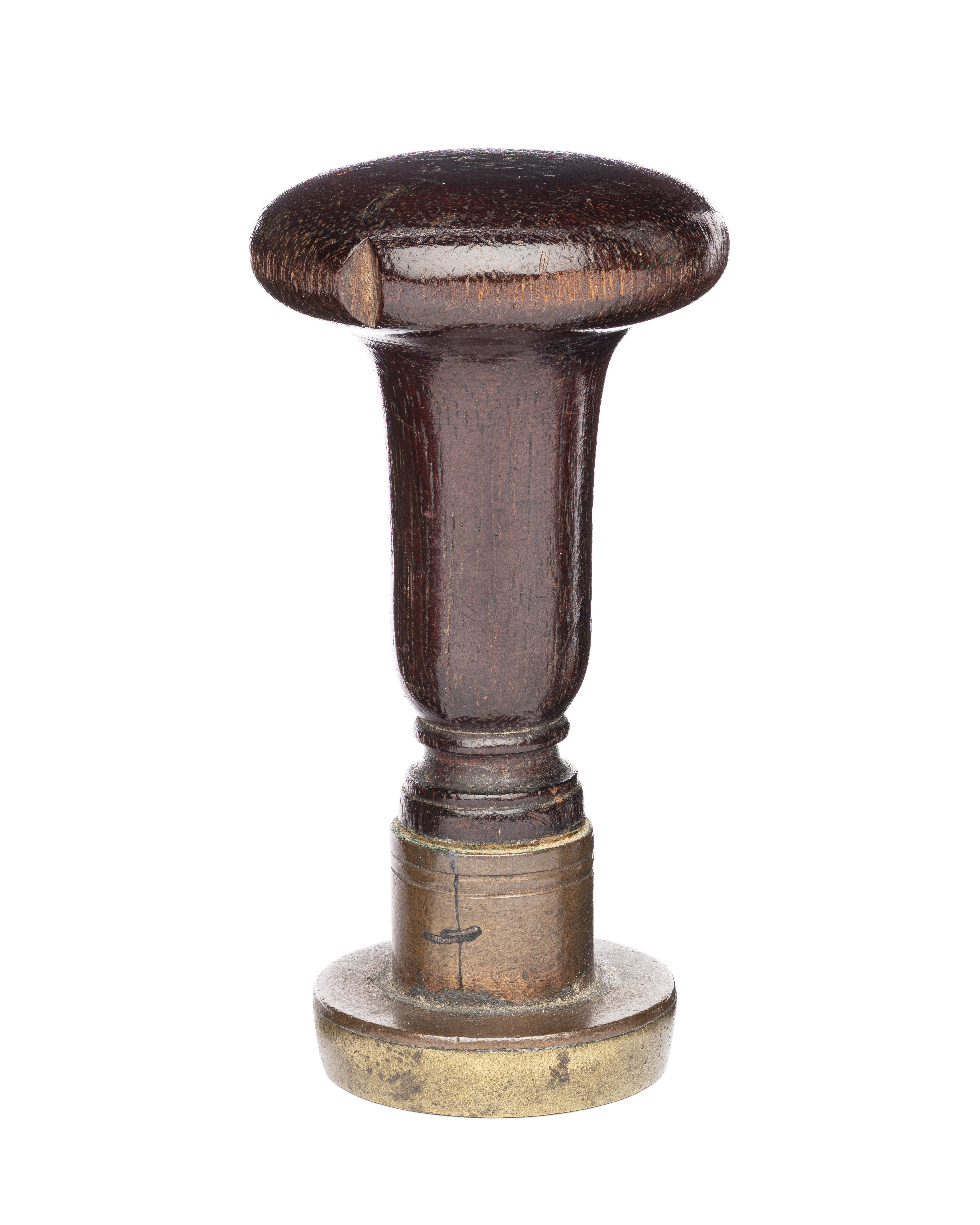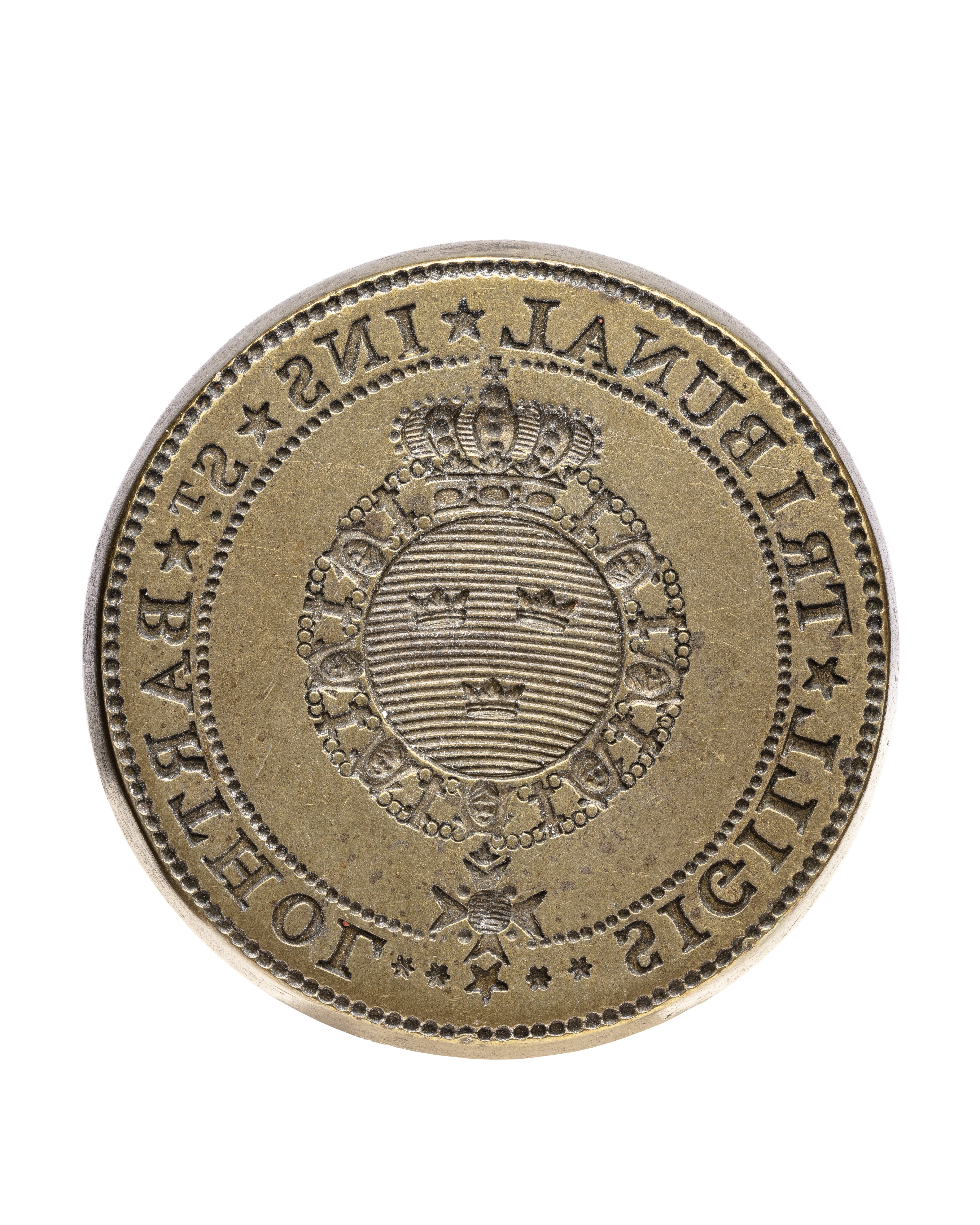 Rund platta av mässing, däri graverat vapen, rund sköld med tre kronor, vågformig skraffering. Skölden krönt av kunglig krona och omgiven av Serafimerordens kedja med tecken. Spegelvänd omskrift, omgiven av pärlstavsringar: "SIGILL TRIBUNAL INS S:T BARTHOL".Mellan orden femuddiga stjärnor. Randen fasad inåt-nedåt. På ovansidan kopparplatta samt cylindrisk holk av koppar. Svarvat skaft av mörkt rödbrunt trä, pokalformigt med låg fot och upptill rund, tillplattad skiva, d: 44,2 mm. I skivans kant inskuret ett hack.