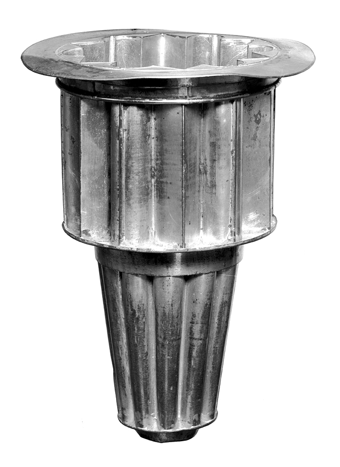GLASSFORM Av bleckplåt. Rund, i två avdelningar, den övre cylindrisk och vertikalt veckad, med vecken omväxlande skarpa och stavformiga, de sistnämnda med en längdgående smal stavformig rygg; kring övre kanten en rakt utstående fläns, fäst vid en utanpå vecken gående slät sarg med stavformig nederkant; nedre avdelningen omvänt konisk, vertikalt veckad, med stavformiga veck samt med starkt indragen, djupt skålig botten; upptill utanpå vecken en slät sarg. Höjd: 23,5 cm.; diameter: 17,3 cm.