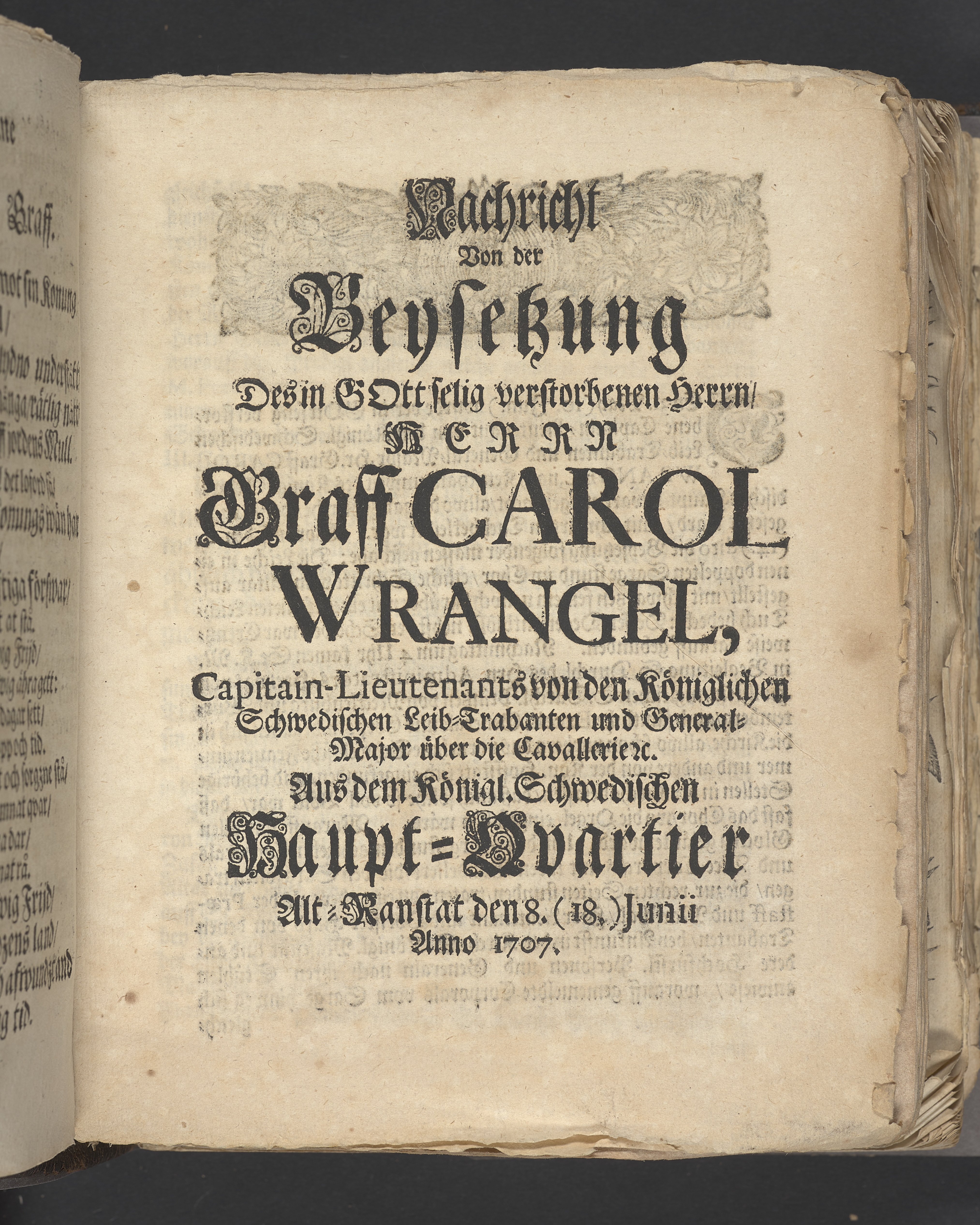 Nachricht von der Beysetzung des ... Graff Carol Wrangel ... General-Major über die Cavallerie. Aus dem Königl. Schwedischen Haupt-Qvartier Alt-Ranstat den 8. (18.) Junii Anno 1707.
