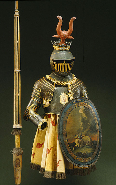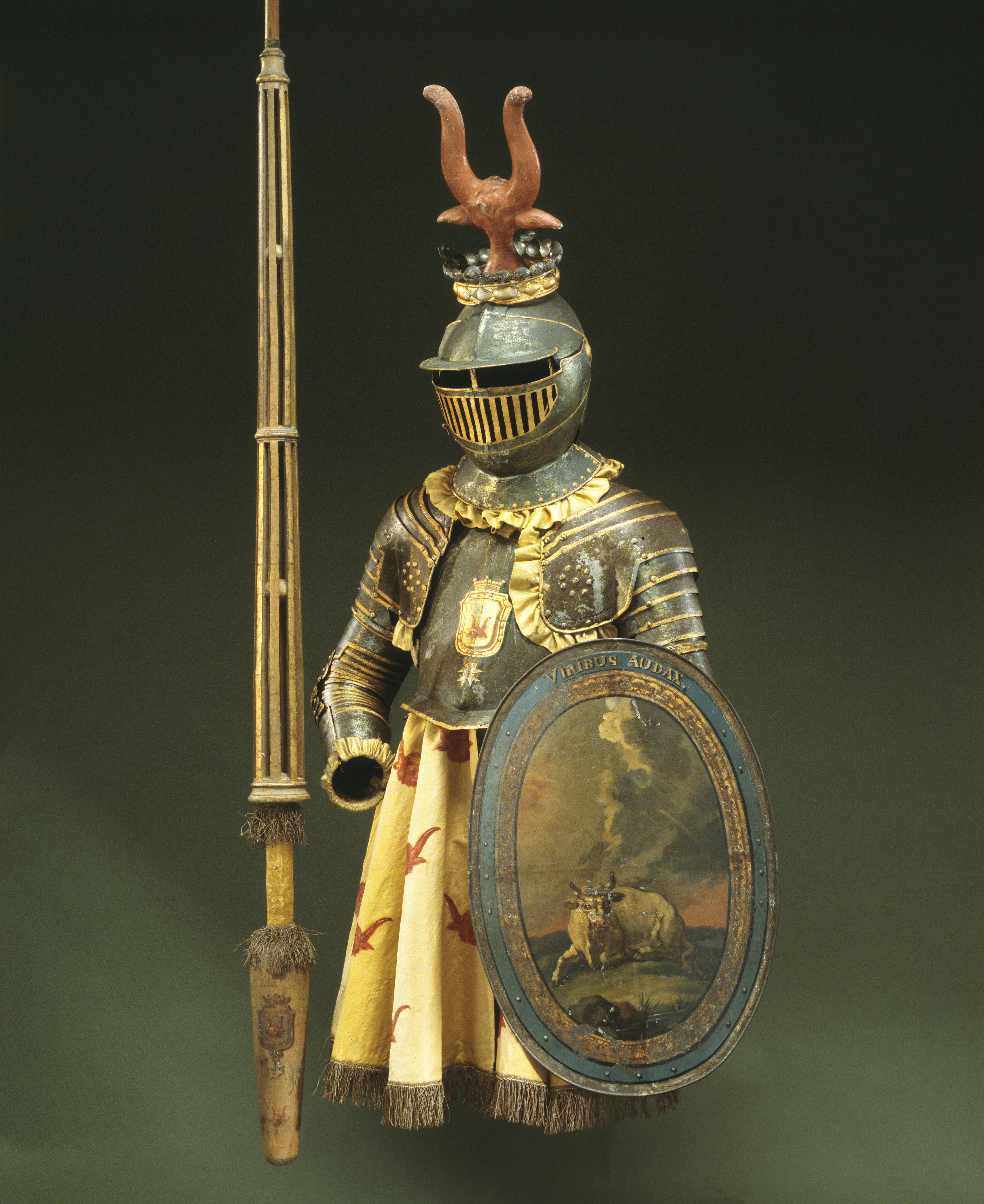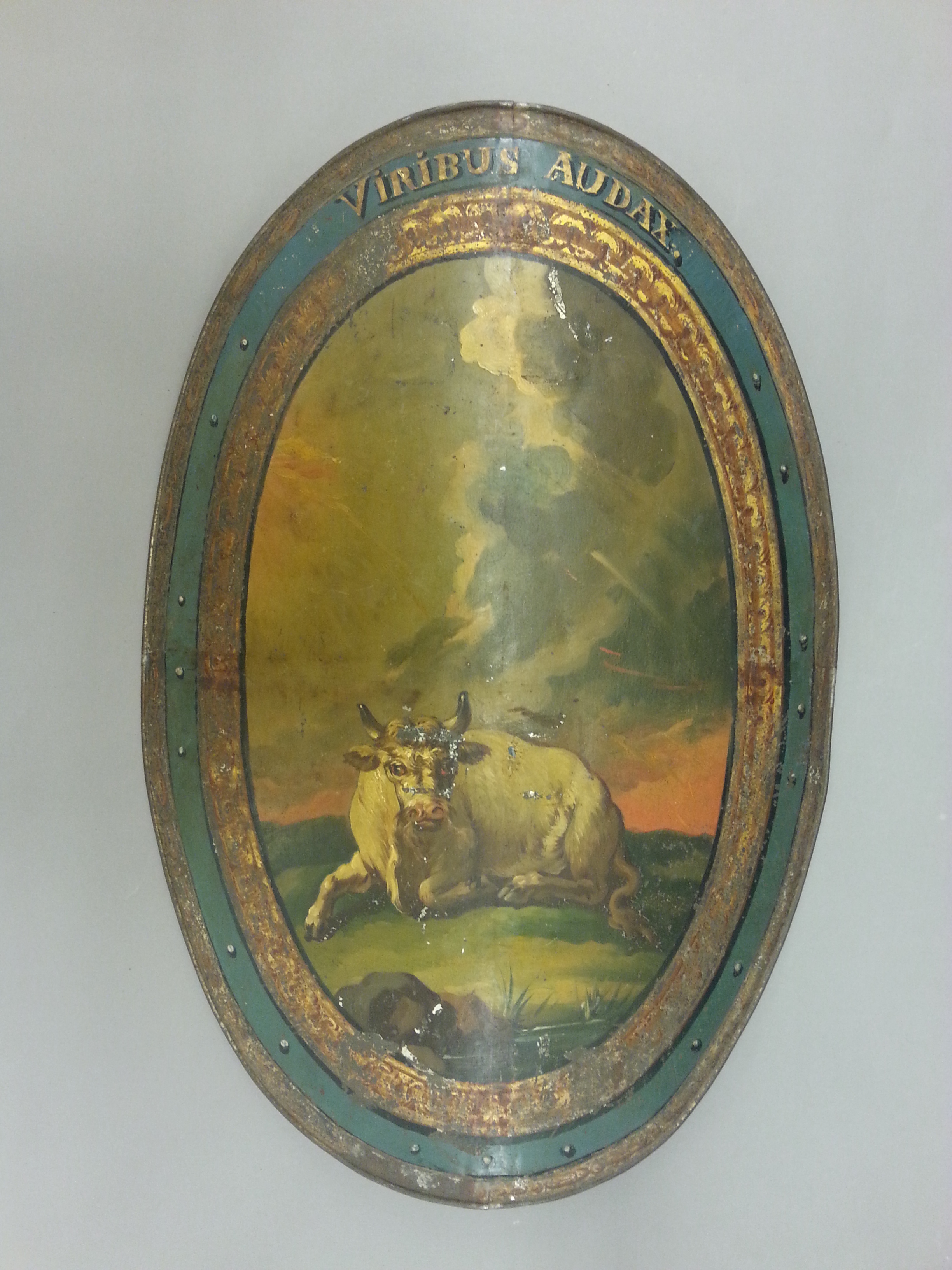 Buren av greve Axel Oxenstierna på Adolf Fredriks torg 1777 i konungens kadrilj. Troligen målad av hovmålare Lars Bolander, efter en idé av kanslirådet Berch. Oval sköld av förtent bleckplåt, bestående av 4 hoplödda delar. Skölde är välvd och har en 19 mm bred, något nedsänkt kantbård. Målad med guld och oljefärg. Emblematiskt motiv: liggande oxe, avtecknande sig mot ovädershimmel. Devis: VIRIBUS AUDAX. (Djärv genom sina krafter). Kring bilden en oval bård i guld med brun banddekor. Här utanför en blå bård på vilken devisen är målad. Yttersta kanten målad i guld med brun pärlstav. Sköldens baksida md tre fästpunkter för remmar. De båda övre remparen har en rem med metallslöja av mässing, samt en rem med spännhål. Nedersta bärremmen hel - nitad i vardera änden. Remmarna har punsad dekor i form av en vågig slinga utmed mittlinjen.