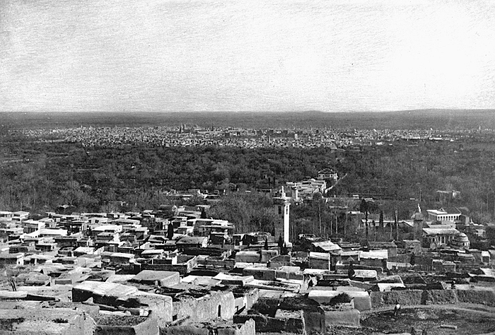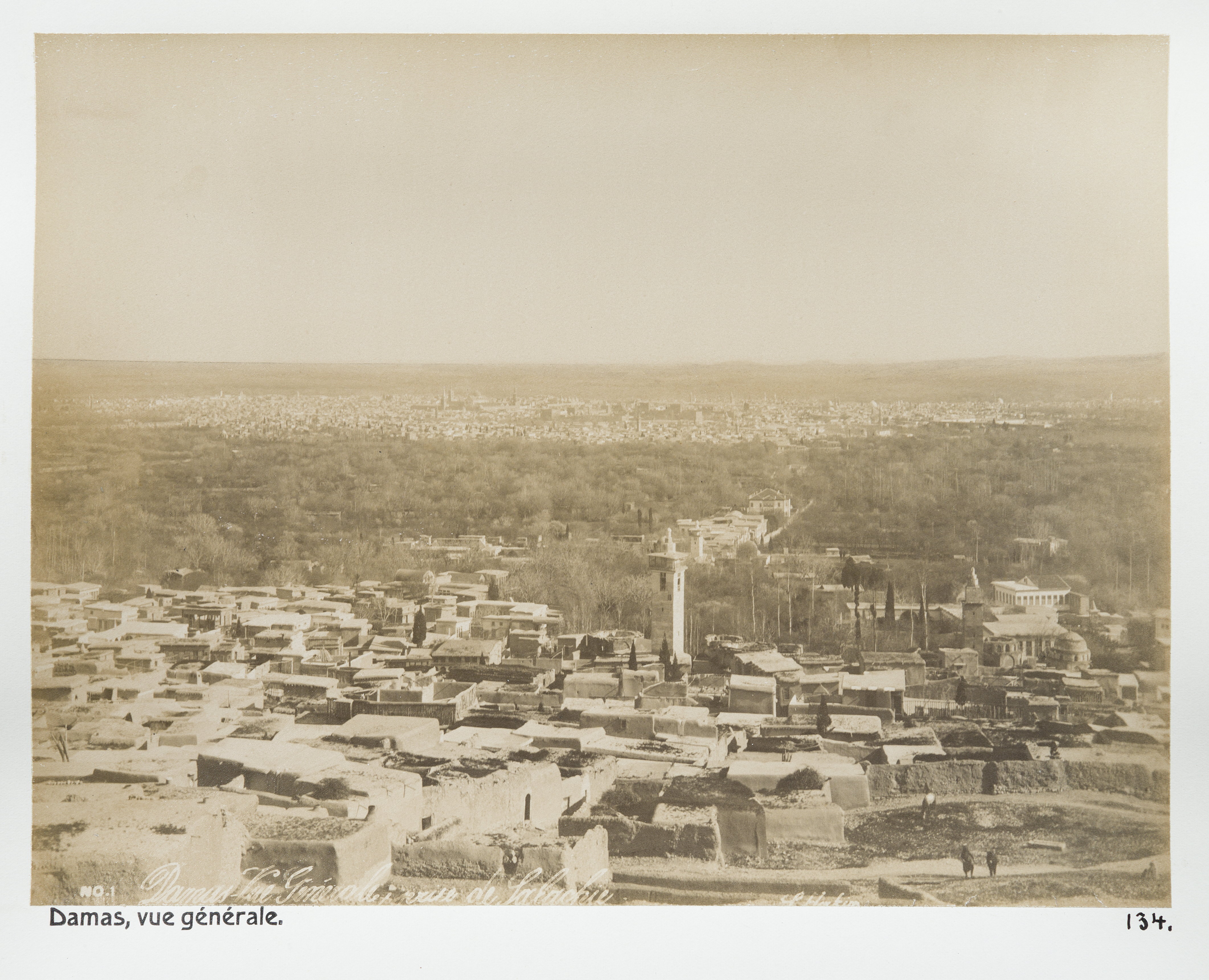 Vy över Damaskus. Text på originalet: "Damas, vue générale." Fotografierna LXVI:N.01.-180. kommer från resan till Palestina och Syrien som Wilhelmina och Walther von Hallwyl gjorde den 30 mars-27 april 1901. De lämnade Sverige den 5 november 1900 för Egypten, där de stannade till den 28 mars 1901, då de fortsatte till Palestina. Med på resan var Wilhelminas sällskapsdam, fröken Ida Uhse. Den 27 april fortsatte de till Turkiet och Mindre Asien. De mindre fotografierna (utom de från Samos) LXVI:N.90.-100. är tagna av Wilhelmina själv, under en resa till häst från Jerusalem till Damaskus 8-20 april 1901. Övriga fotografier är inköpta av Wilhelmina i Jerusalem, Damaskus och Beirut. Alla uppgifter kommer från Ida Uhses reseanteckningar.