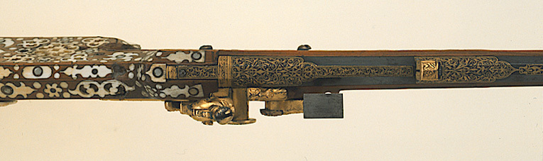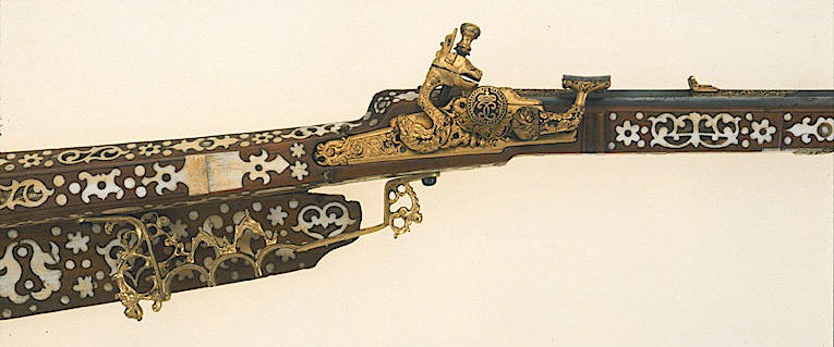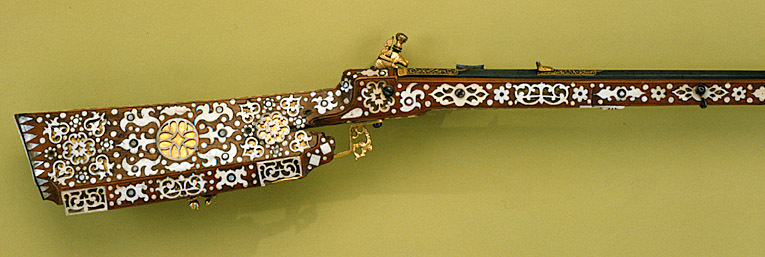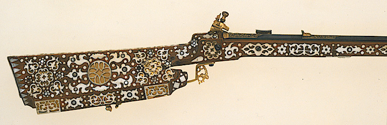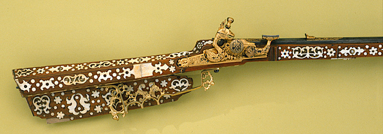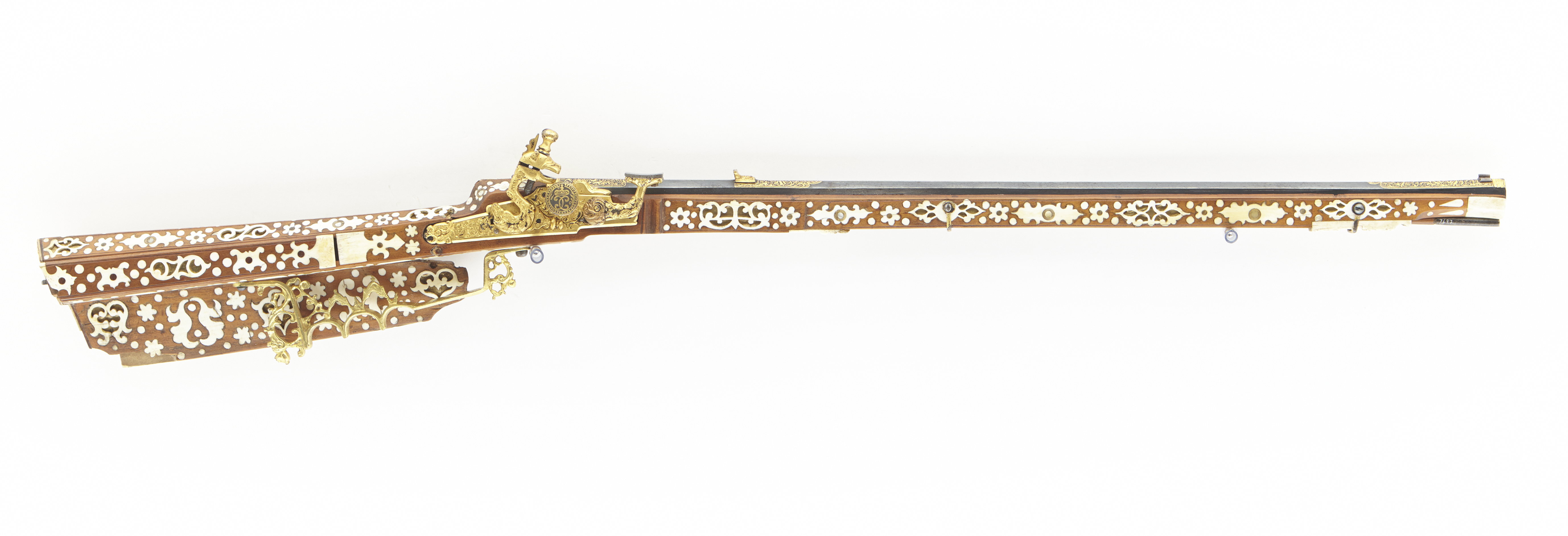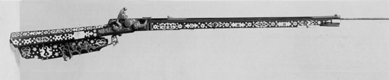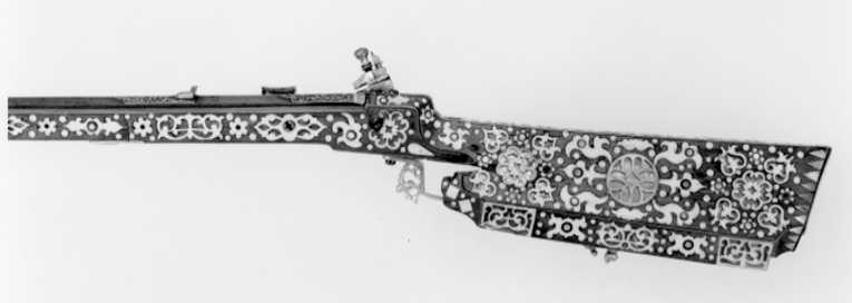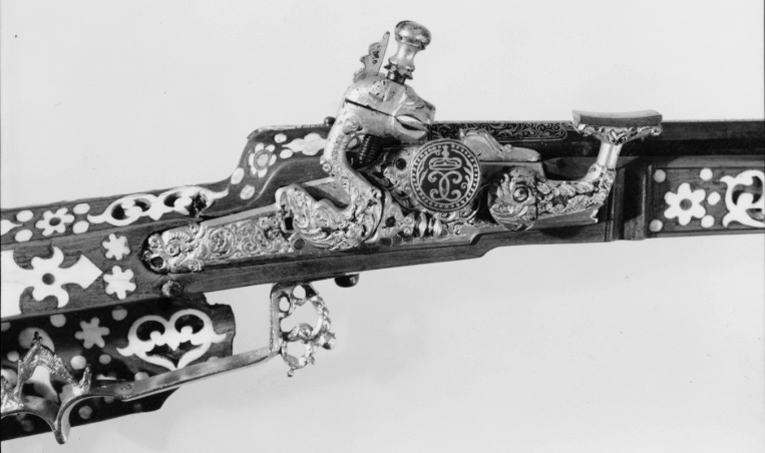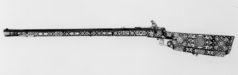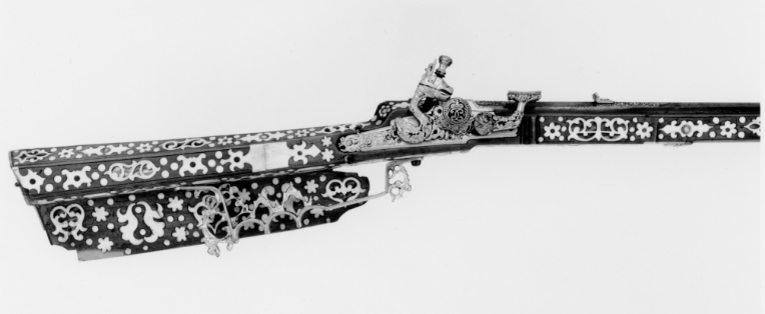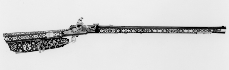 Gåva till dåvarande kronprins Karl (XII) 1687-06-16 av Johan Gabriel Sparfvenfeldt (1655-1727), svenskt sändebud till Moskwa 1684-1687 (Elgenstierna 7, sid. 373, tab. 1). Åttsidig, räfflad pipa av blånerat stål, sex räfflor, skålade bommar. Något vidgad mynning. Svansskruvbladet och kammarens ovansida och mynningspartiets ovansida ornerade med arabesker av påslaget guld. Längs pipans rygg fält med inskrift av påslaget guld: "CAROLO. XII.D.G.SVECORUM.GOTHOR.ET WANDAL.PRINC.HAERED.DDI". Runt mynningens kant två koncentriska cirklar, mellan dem åtta punsade stjärnor. Riktmedel: Ståndsikte av förgyllt stål, stolpkorn av stål. Fästning: Två häften. Pipan fäst med krysskruv underifrån (främre varbygelskruven) av blånerat stål med förgyllt huvud. Urspr. två pipstift, det bakre i form av en skruv som fäster en rektangulär rembygel av förgyllt stål runt stocken. Främre pipstiftet saknas. Snapplås av förgyllt stål av holländsk typ. Plant låsbleck med fasade kanter. Bakre änden i form av ett ciselerat odjurshuvud. Blecket täckt med ciselerade rankor. Hane med kropp och fot i form av en ciselerad delfin. Motstöd framför hankroppen. Käkar i form av ett odjurshuvud, lös överkäke. Rund käkskruv med profilerad hals. Separat eldstål, ciselerat med fot i form av odjurshuvud och blad. Fängpanna med lock med rörlig arm, rund, blånerad gavel med påslagen gulddekor i form av namnchiffer, spegelmonogram C under kunglig krona, omgivet av en bård med prickar. Fästning och avtryckare: Två låsskruvar av blånerat stål med förgyllda huvuden. Avtryckaren saknas. Helstock av päronträ med kolv av tysk typ med vinge och kolvlådelock av stockens trä med dekor som stockens. Framstock med fyrsidigt tvärsnitt. Plan bakplåt av valrossben(?). Kolv och framstock rikt ornerade med inläggningar av elfenben i olika former, en del med inläggningar av pärlemor- och horncirklar, en del konturerade och genombrutna med botten av tunna gulmetallbleck (enl. inv. 1867 kattguld). Profilerade elfenbensplattor som spets- och överrörka. Näsband av elfenben. Stor varbygel av förgylld mässing med tre fingerlägen, genombruten dekor vid stolparna. Tillbehör: Laddstock, l: 567 mm, av trä med stålskoning i båda ändar.