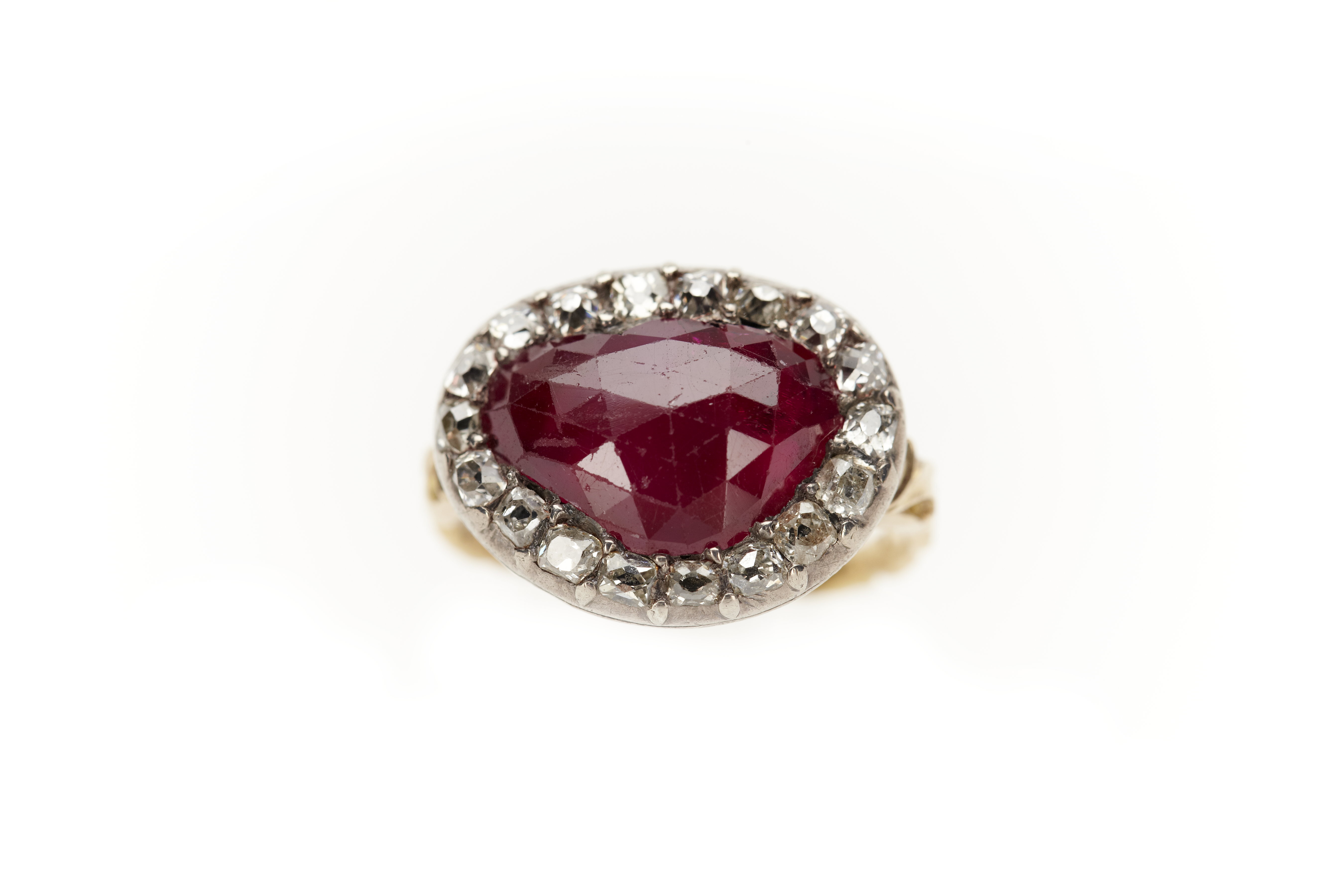 Ring, kring 1700-talets mitt. Guld infattningarna i silver. Oregelbunden, rosenslipad, folierad rubin omgiven av äldre briljantslipning. Baksidan av fattningen med ett rocailleornament, Skenan delvis genombruten. Ostämplad. Stor oregelbundet triangulär rubin, slipad i fasetter och omgiven av arton rosenstenar, infattade i silver, i klofattning. 1600-tal. Tillhörande skriven lapp samt tryckt etikett: Denna Gustav Adolphs och Ebba Brahes Förlofnings Ring har från äldre tider varit förwarad inom Braheska famillen och är gifven till Skoklosters samlingar af Grefvinnan Aurora Brahe.