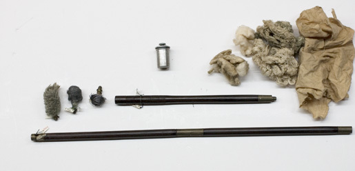 Läskstång i tre delar av mörkbrunt trä (jakarande?) med svarvade ränder på handtaget. Delarna förenade med gängade mässingsskoningar, fästade med stålnitar. I nederänden mässingsskoning med genomgående hål med försänkta kanter, därnedanför graverat räfflad ring. Skoningen invändigt gängad.