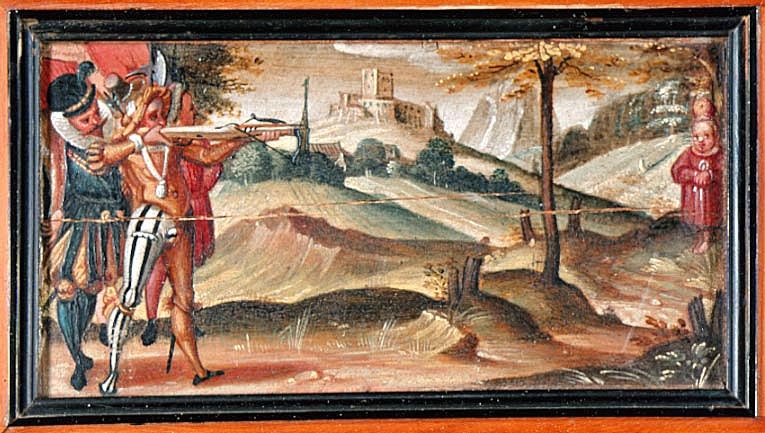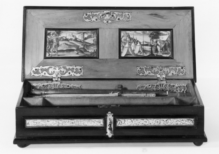 Rektangulärt schatull av päronträ (?), utvändigt fanerat med ebenholtz. På locket två rektangulära fält med intarsiadekor i form av symmetriska rankornament av brunt trä mot vit bakgrund. I vardera hörnet en rund, snidad maskaron av ben. På långsidorna två och på kortsidorna vardera ett raktangulärt fält av ben med graverade rankor. Profilerade lister runt alla fält. Fyra halvsfäriska fötter under bottnen. Lås av stål i främre långsidans mitt. Vertikalt, plant nyckelbeslag av mässing med konturerade ändar. Två skruvar av stål. På lockets insida två rektangulära fält med fint målade (tempera?) framställningar av Wilhelm Tells mästerskott samt papegojskjutning med armborst. Två gångjärn av förgyllt stål med avlånga, genombrutna beslag. Likadant beslag mitt fram vid vilket en pilformig låstapp är fäst. Schatullet är inrett med ett längsgående fakc med plats för 10 pilar, varav fem på en lås insatsskiva, vilande på en list. Ett smalare, längsgående, djup fakc har på vardera kortsidan ett litet fack, det ena av schatullets halva djup. Schatullet innehåller fem pilar, en pryl, en fjäder, en tofs, ett hornbeslag samt ett mässingsrör.