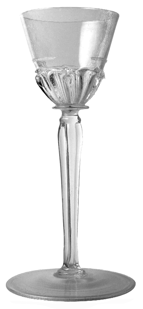 VINGLAS. På högt, smalt ben. Kuppa av omvändt koniskt form med en blomholkliknande nederdel av vertikalt ordnade kamliknande påläggningar. Därovanför två intill varandra horisontalt liggande trådar, kuppan nedtill med en skivformigt utstående kant. Benet sammansatt av fyra nedåt avsmalnande stavar, ställda intill varandra samt nedtill tvärt avslutade med en liten rund skiva på den stora, runt skivformiga foten på vars utsida, i mitten, en medels slipning avjämnad brottyta efter punteln. Höjd: 20,8, diameter: 7,7 cm. Fot, diameter: 10,1 cm.