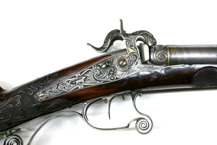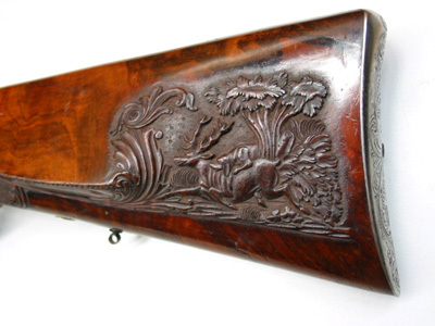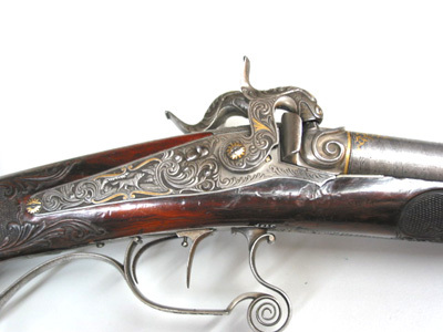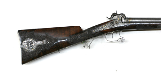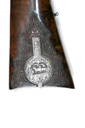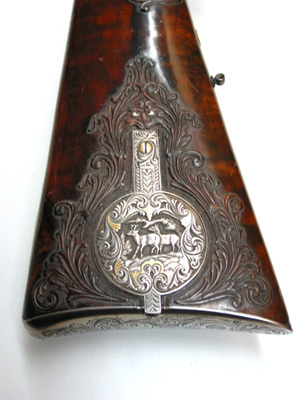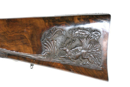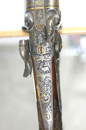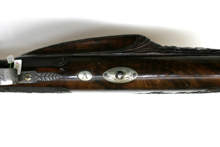 Baskyl med vingar, brett baskylblad längs hela kolvhalsen, dekor i stålsnitt, rankverk med detaljer av guld, i rankverket närmast pipan jägare i landskap, därbakom kronhjort. Hanlås med bakåtliggande slagfjädrar. Plana låsbleck med framåtriktade, smala spetsar framför hanarna. Dekor i stålsnitt, rankdekor, på mitten kartusch med inslagna gulddetaljer, i kartuschen på h. bleck en gående, på v. bleck en sittande hund. Platta,delvis förgyllda hanar med rankdekor i stålsnitt, nötskruvar med välvda huvuden, solformig dekor av guld. Slaghuvuden snidade i form av odjurshuvud med guldinslag. Invändiga skruvar blånerade. På h. nöt en yttre springkil. Säkring: Bakom hanarna skjutsäkring. Fästning: En genomgående låsskruv från v. sida, en kortare skruv från vardera sidan vid bakspetsen, alla med gulddekor på huvudet. Avtryckare: Två blånerade avtryckare, justerskruv på den högra. Avtryckarbleck med konturerad framspets, rankdekor med gulddetaljer. Halvstock av valnöt, kolv med kindstöd och kolvlåda. Rikt snidad dekor. Bakom kindstödet landskap i relief med hjort och hund. På h. sida rankverk med maskaron framtill, ögon av pärlemor och horn (?). Rankverket omger den runda kolvlådan, fodrad med röd sammet. Beslag och lock av stål med graverad och snidad rankdekor, på locket rankverk med två hjortar, guldrankor, skruv med gulddekorerat huvud. Nätskuren kolvhals med snidade rankor. Beslag av stål. Bakplåt med lång flik på kolvryggen, rankdekor i relief mot mörk bakgrund, på plåten graverad rankdekor med en inlagd silverfågel, två skruvar med graverade huvuden. På kolvens undersida en spetsoval silverplåt med graverad rankdekor, två stålskruvar. Blånerad ring för rembygel, därframför en rund, välvd silverknapp med graverat A. Två ovala pipstiftbrickor av stål med silverrankor, två skruvar. Näsband-spetsrörka med lång, konturerad spets, rankdekor med gulddetaljer. Piprännornas bakre del skodd med silverplåt, fyra blånerade skruvar. Varbygel med s-formigt svängd framstolpe, nederänden spiralformigt upprullad. Bygel med guldkantlister, landskap med liggande hjort i stålsnitt. Kluven bakre stolpe. Delvis fri bakre arm med spiralformig bakre del, graverad rankdekor, bakre platta med bladformig spets, graverad dekor, skruv med gulddekor på huvudet.