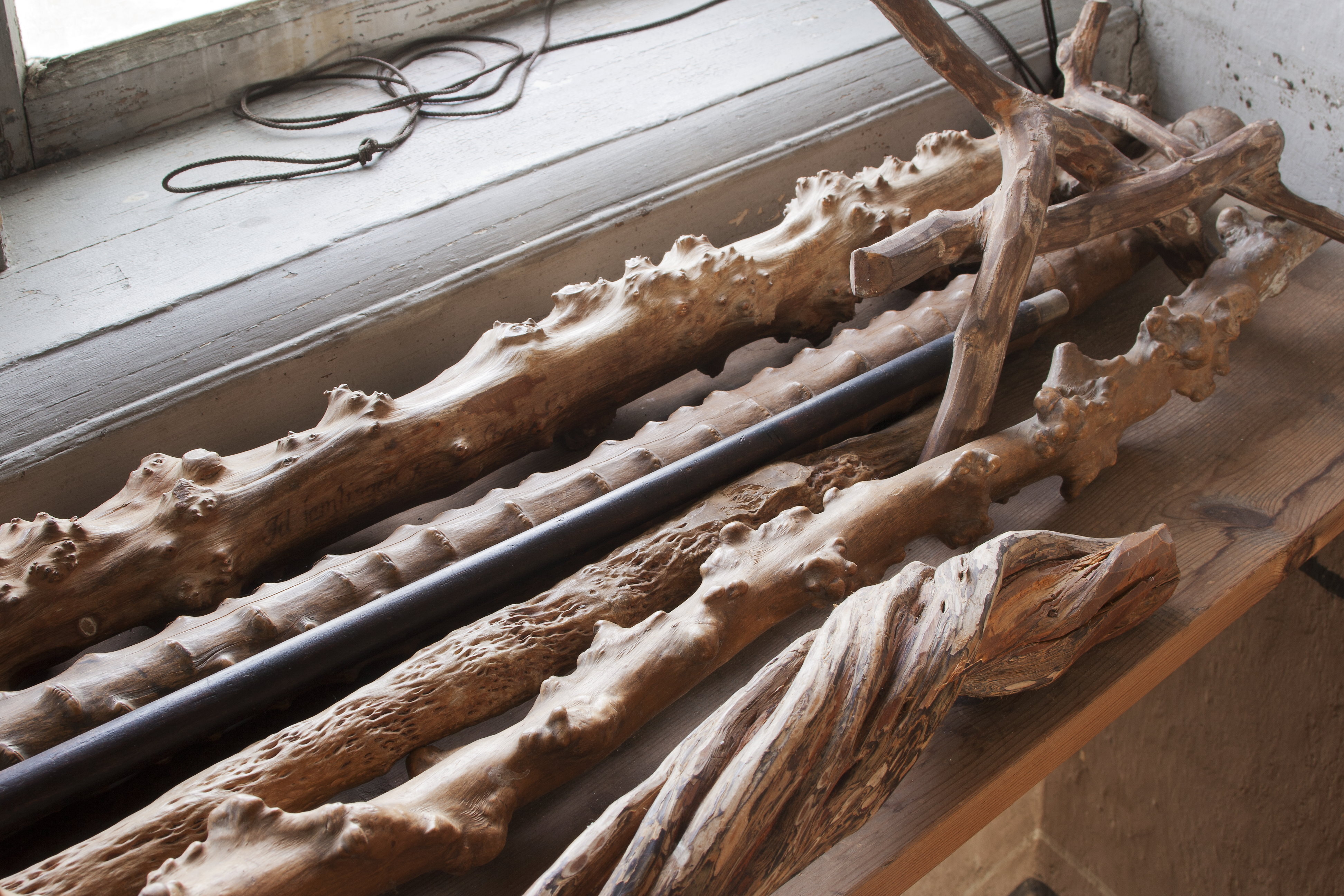 Av obehandlat trä, med knöliga utväxter. Ett ca 130 mm slätt skaft med genomdraget läderband.