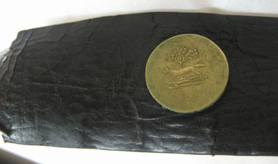 Rem av svart grovt läder med raka kanter. Baktill dubbelvikt ände fastsydd runt rembygeln med stygn i fyra rader. Framtill dubbelvikt och fäst med cirkulär knapp av mässing, diam 22 mm, dekor i låg relief föreställande springande räv framför träd mot slät bakgrund. Knappen fasthållen med stålnit på baksidan.