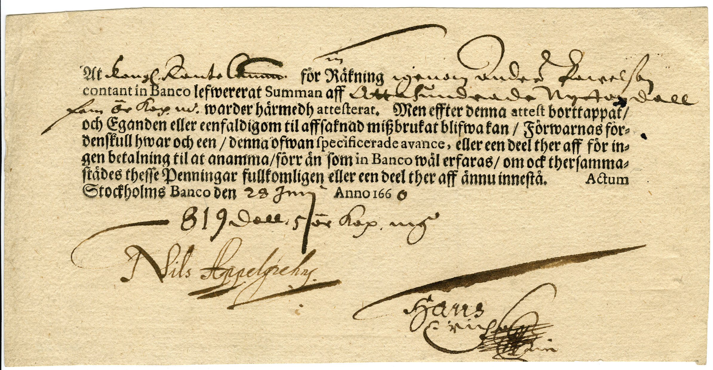 Upphov: Stockholms banco. Media: Bonnevier, Helena. Ekonomiska museet - Kungliga myntkabinettet/SHM, (PDM) Upphovsrätten till detta verk har gått ut och är därmed fritt att använda på alla sätt. Ange gärna upphovsperson om denne är känd.