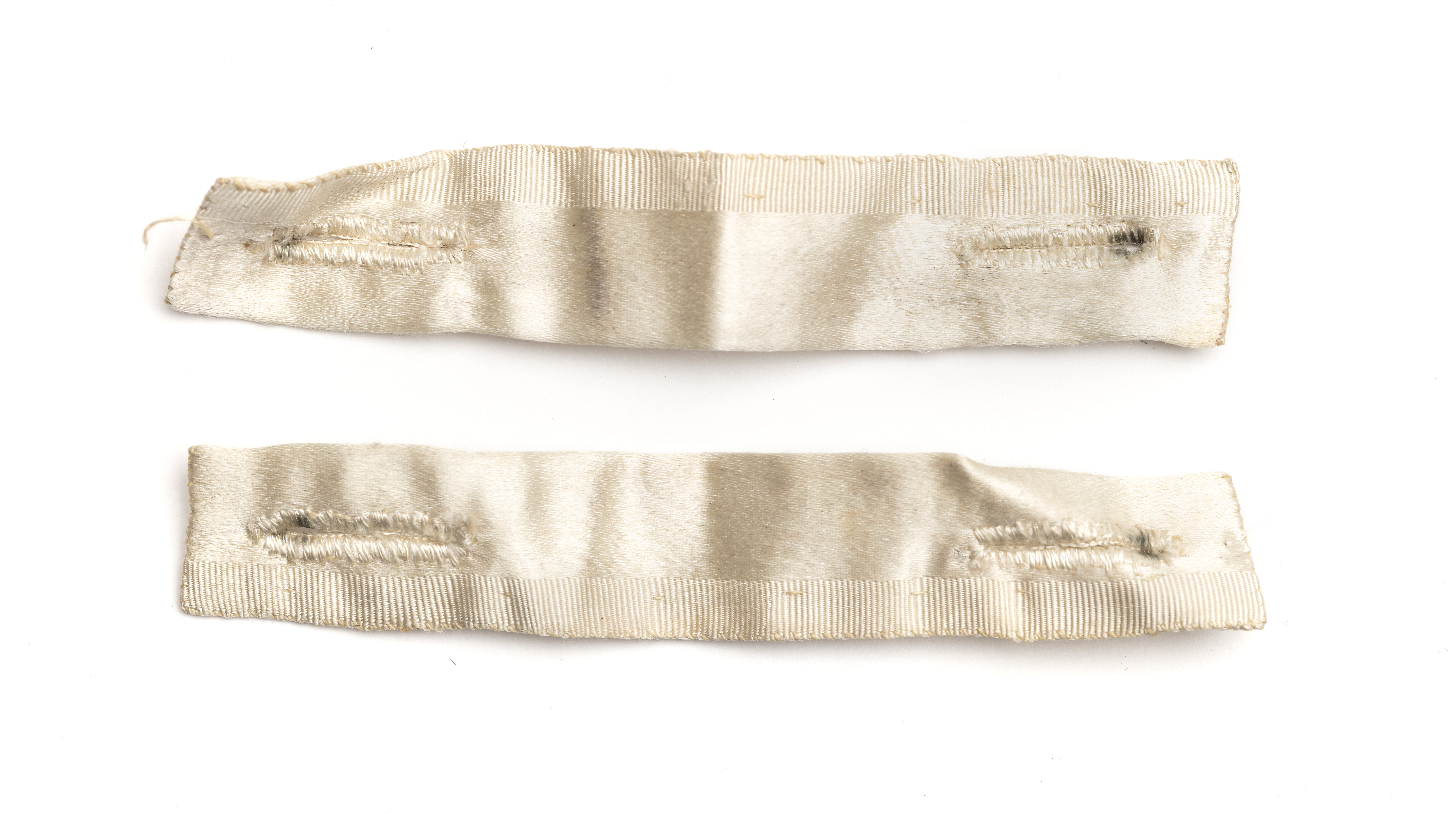 Sporrläder, rektangulär form, smalare på mitten, av svart silkessammet. Runt om kantat med en smal kant av benvitt sidentyg. Baksidan fodrad med benvitt sidan. På baksidan finns två delar, band sydda av likadant tyg som använts till kantningen. Det ena bandet (ca. 8,3 cm x 1,8 cm) avslutas i en spets, det andra bandet (ca. 4,6 cm x 1,6 cm) med ett knapphål. Två lösa band (ca. 10,2 cm x 1,8 cm) hör till sporrlädret. Banden är sydda av likadant tyg som de fastsydda banden, båda med en stadkant synlig och båda med två knapphål, ett i var kortände. Ytterligare ett band (ca. 4 mm brett) hopknutet till en rosett med fyra öglor hör till. Bandet är benvitt med en smal rand av metalltråd.
