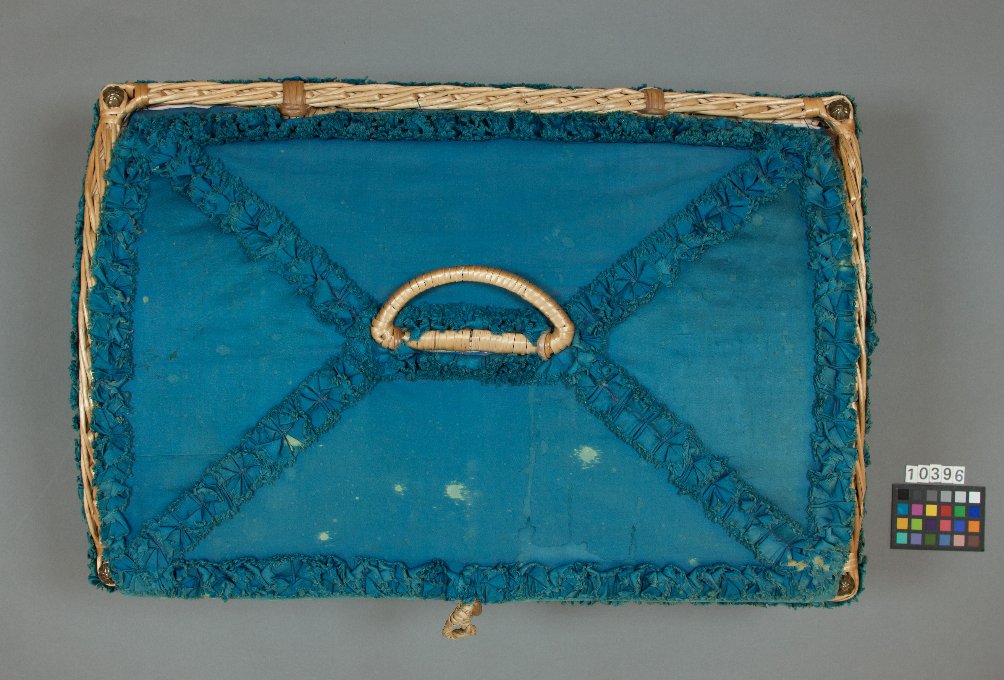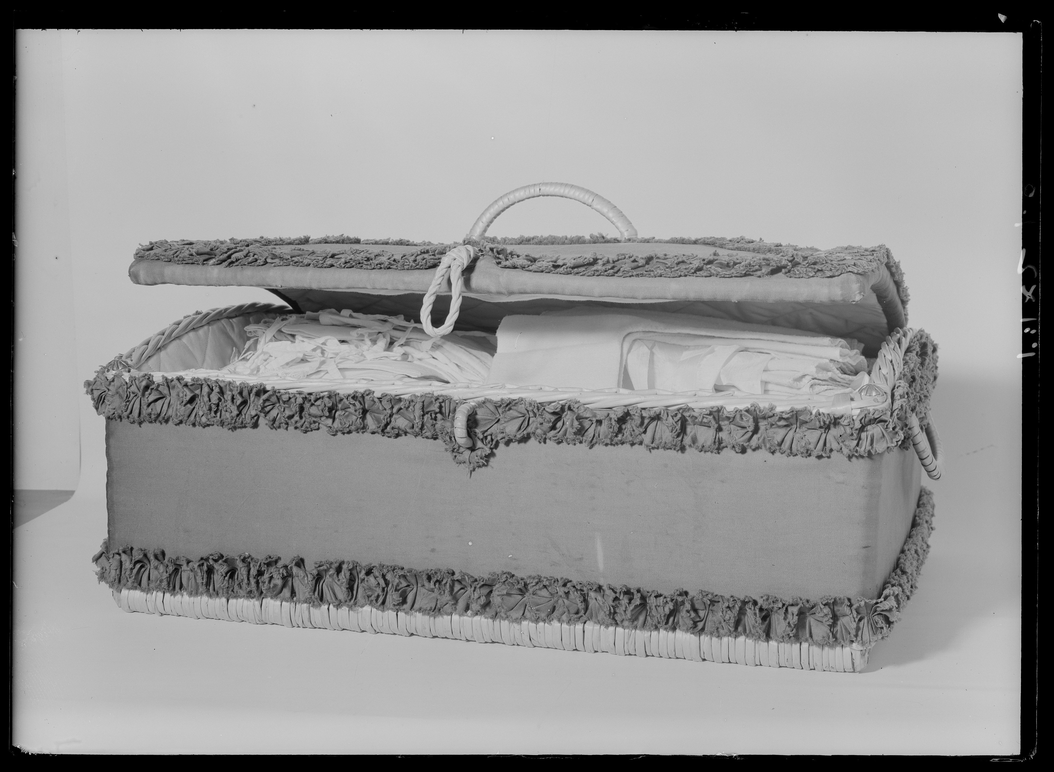 Rektangulär klädkorg av flätad rotting, locket välvt i längsriktningen och fäst vid ena långsidan. Ett handtag på locket och vardera kortsidan. Utvändigt klädd med blå bomullssatin med veckade band av samma material fastsydda runt kanterna och på locket sammanlöpande vid handtaget. Invändigt klädd med rosa, matelasserad bomull. I vardera av korgens fyra övre hörn en tännlika av mässing. På främre långsidan förslutningsanordning. Korgen innehåller babykläder skänkta av Gustav V.