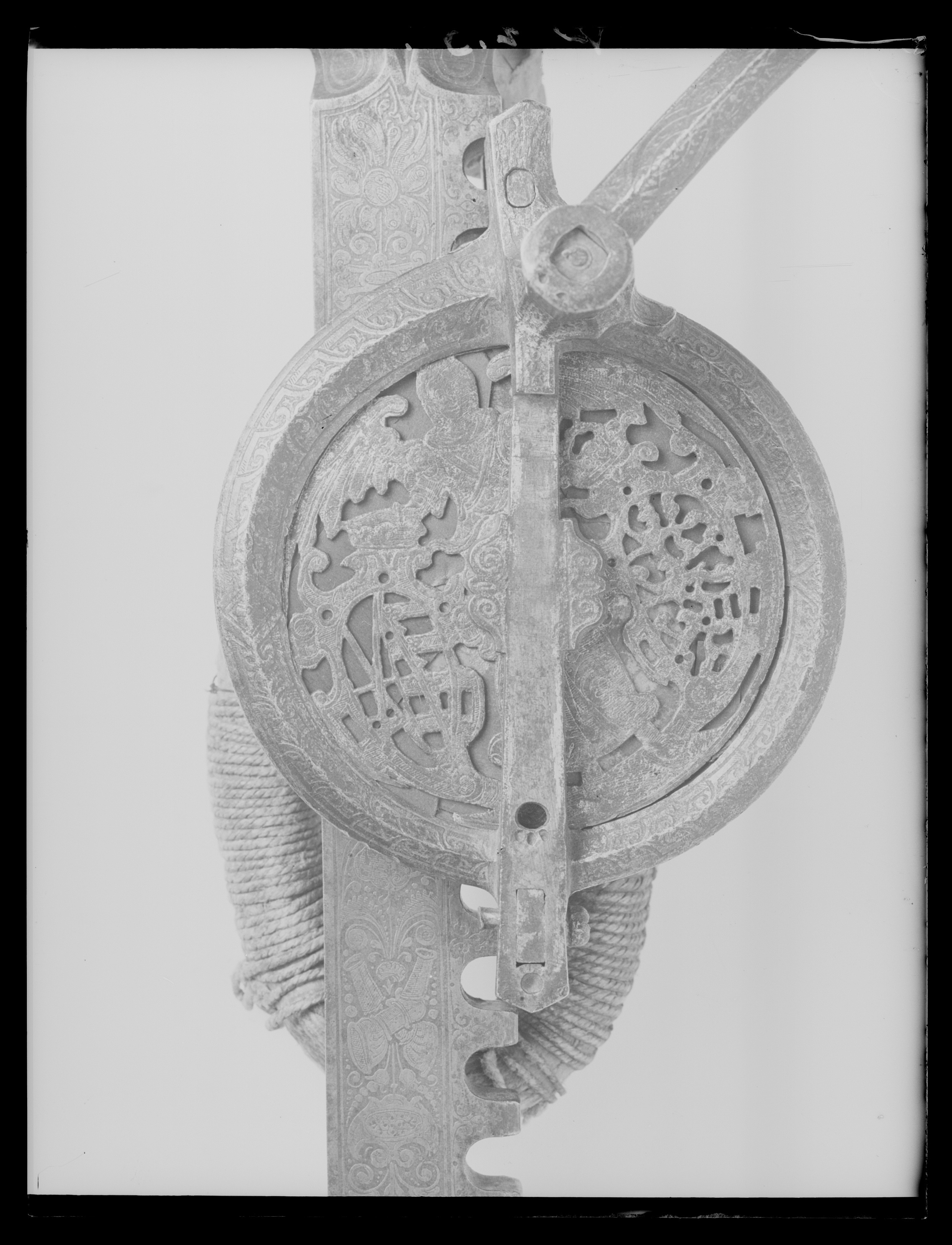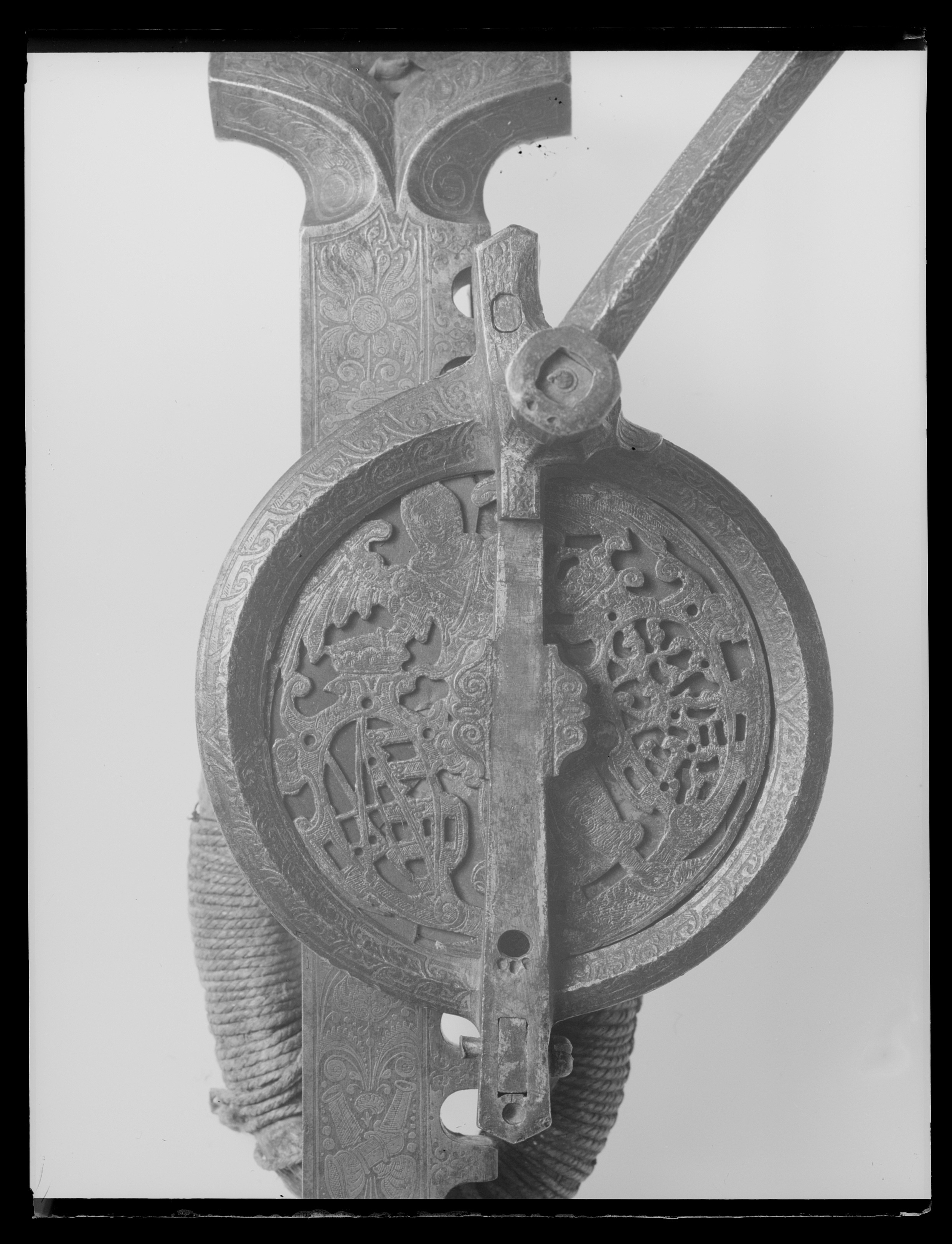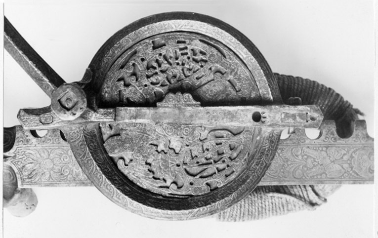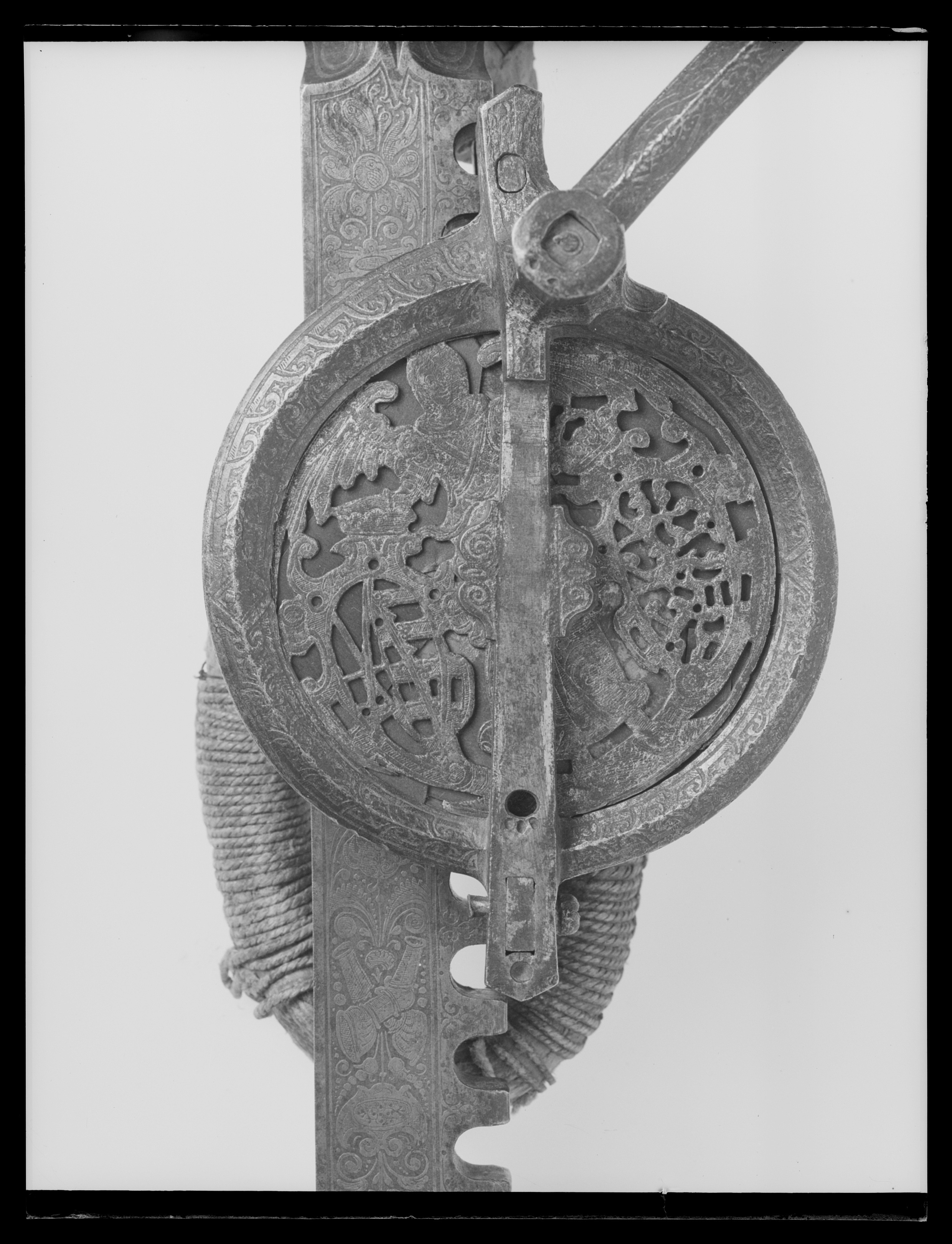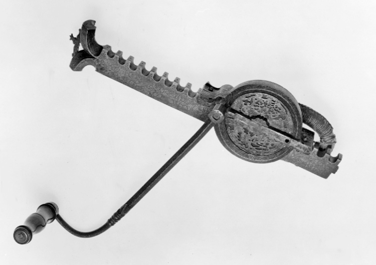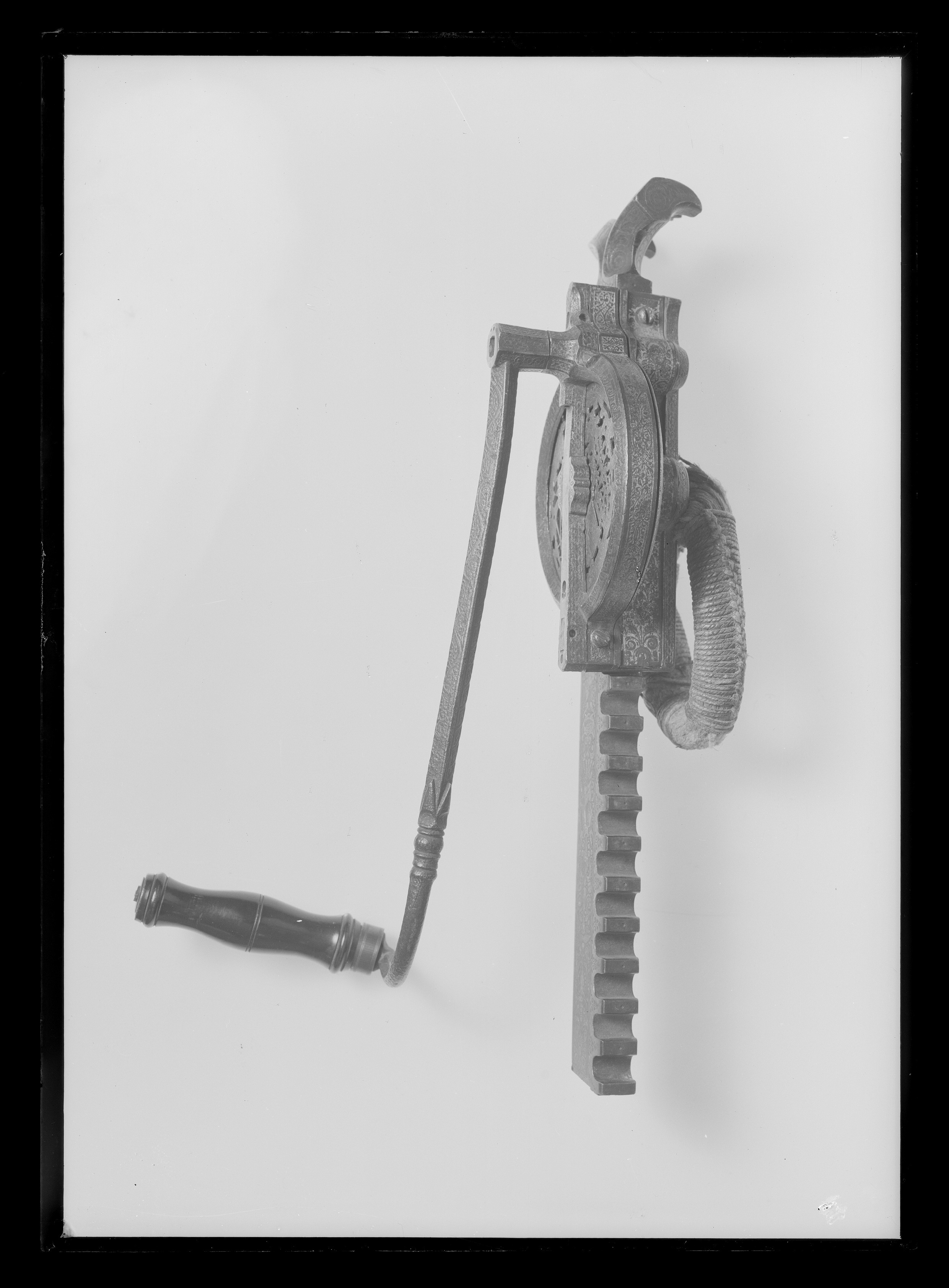 Vinda av stål med horisontalt placerat hjul. Hjulet på ovansidan täckt av genombruten, ursprungligen förgylld skiva med graverade detaljer, en ängel hållande två vapensköldar, dexter: Kursachsen, sinister Danmark. Runt hjulhus med åsade kantringar, etsad och förgylld rankdekor. På hjulets undersida en fast, genombruten platta, rankor och sittande människofigurer. Kuggstångshållare med etsad och förgylld dekor av bladrankor samt ansiktet fas. Öglehållare med etsad oförgylld rankdekor. Svängd vev med fyrsidigt tvärsnitt, etsad rankdekor, i rät vinkel, mjukt svängd ytterände med rundat tvärsnitt, åsar på över- och undersidan, vid övergången ringar samt fyra spetsar riktade mot hjulhuset. Ej ursprungligt, svarvat skaft av ebenholts(?), mässingsbrickor i ändarna. Kuggstång med fint etsad rankdekor på båda sidor, på undersidan vid stränghållaren djupt inhugget årtal: 1579. Mellan stränghållarens klor en rörlig, konturerad bricka. I kuggstångens andra ände klack för fästning av bälthake. Ögla av hampgarn, lindningen saknas delvis.