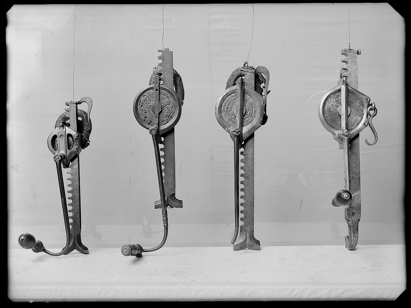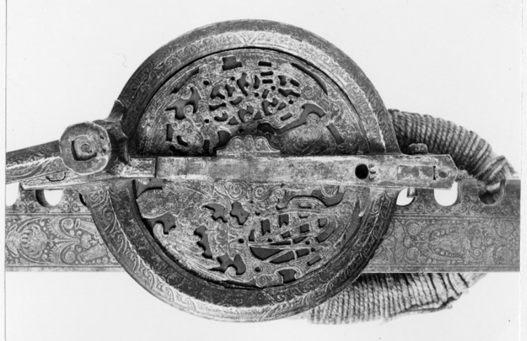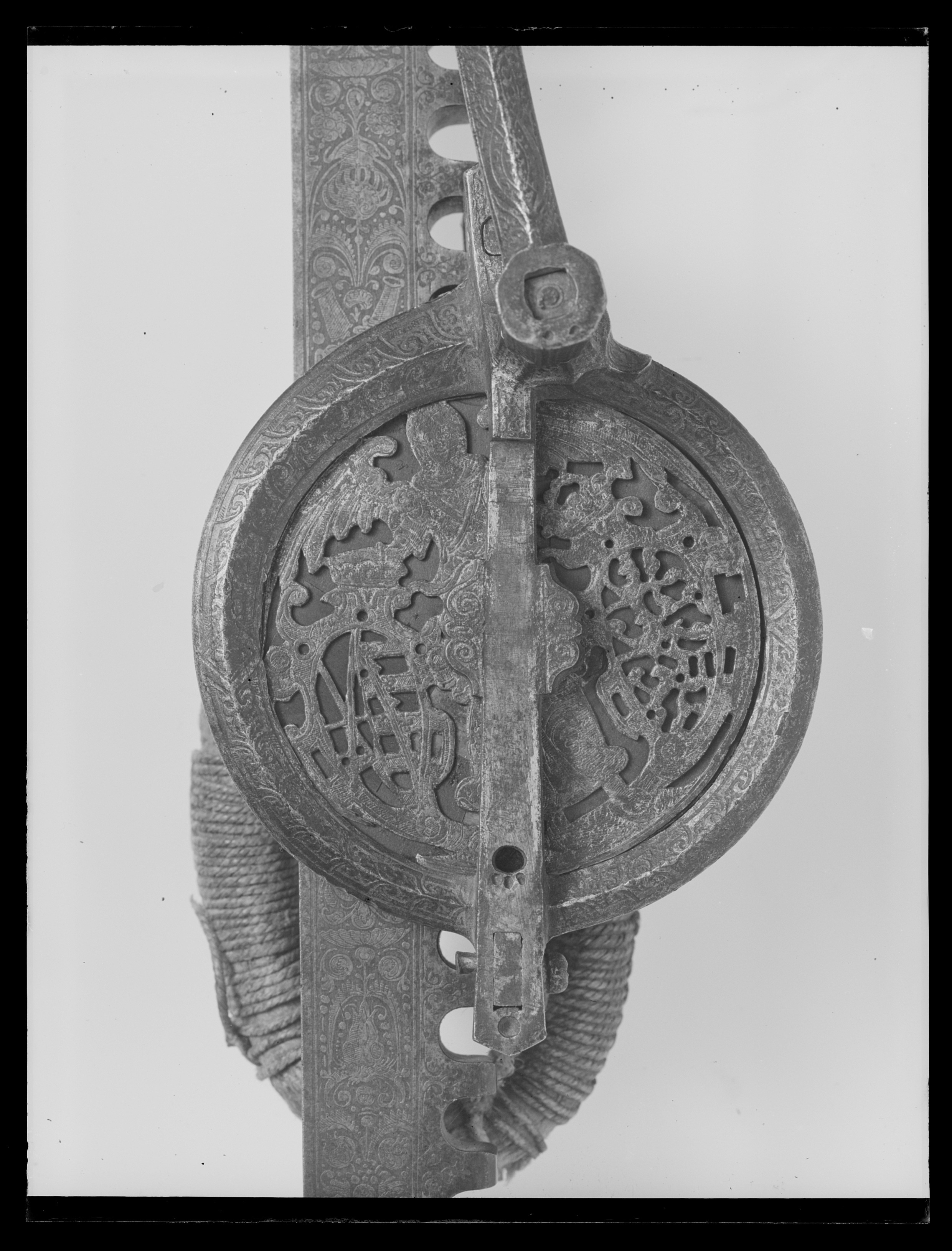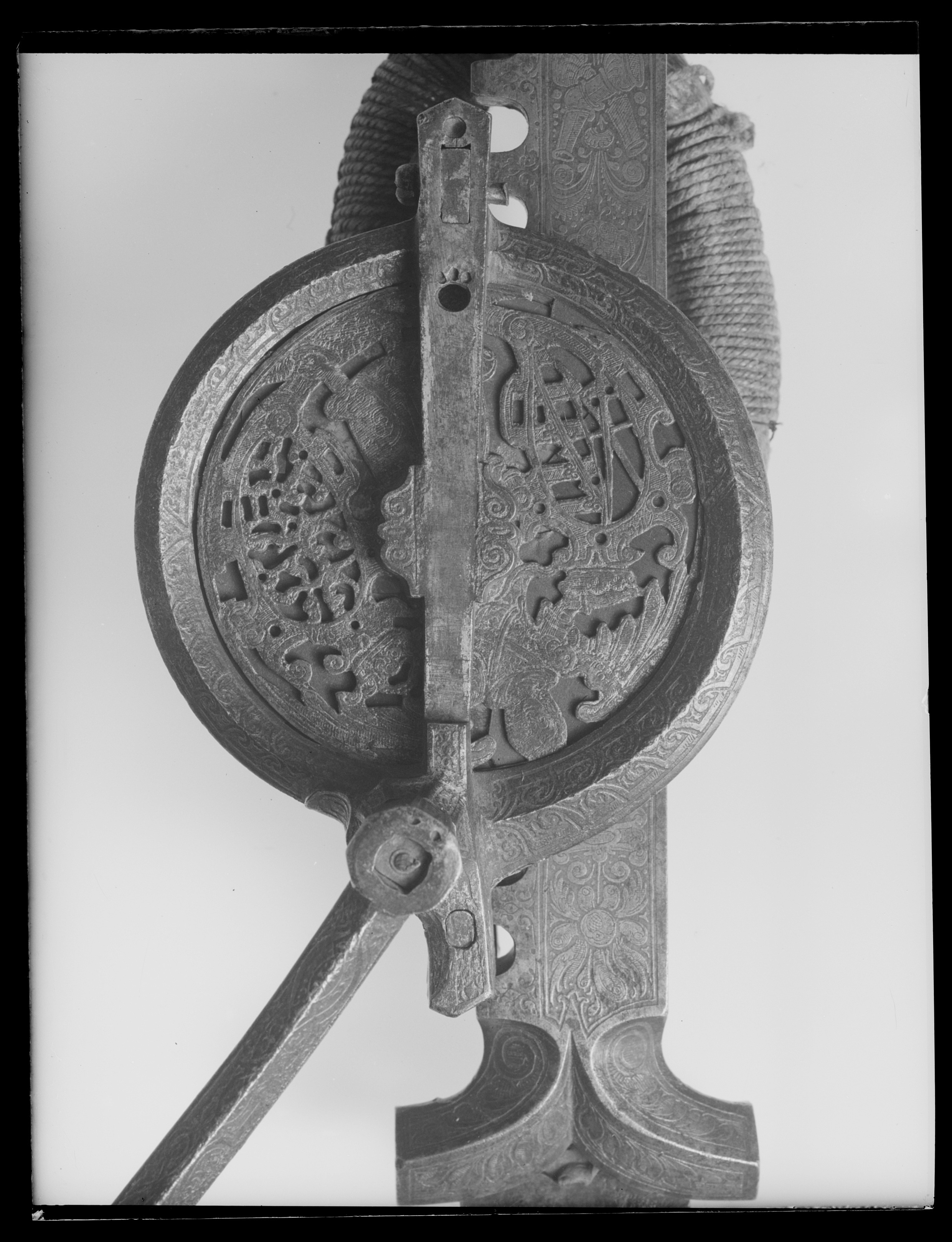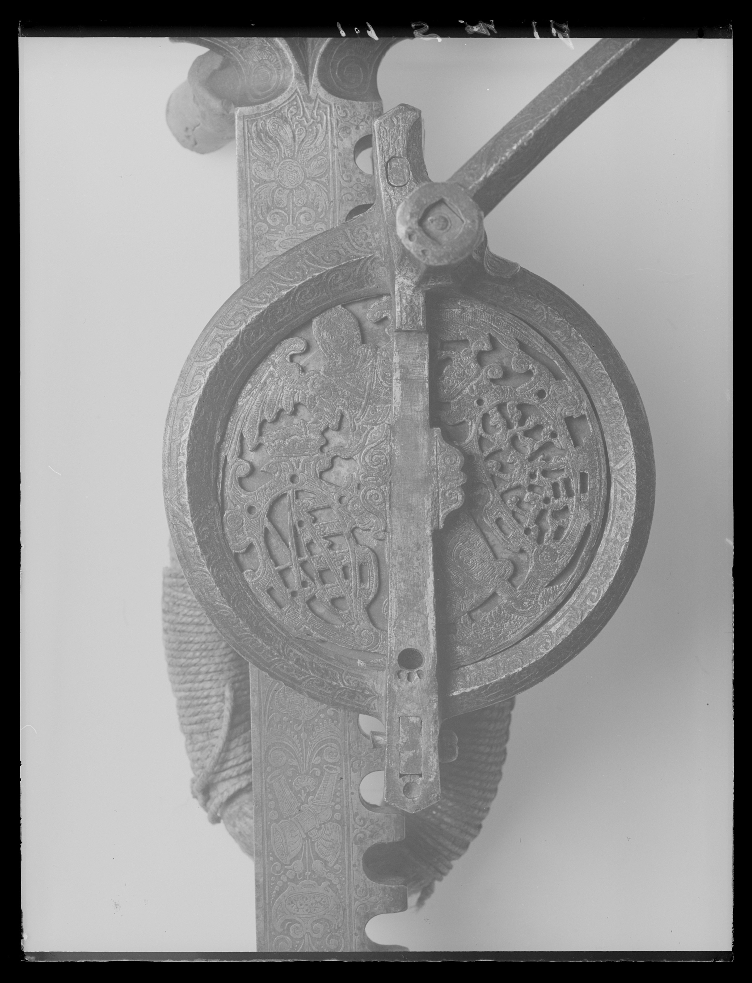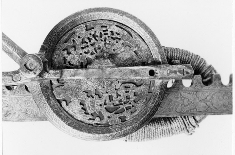 Vinda av stål med horisontalt placerat hjul. Hjulet på ovansidan täckt av genombruten, ursprungligen förgylld skiva med graverade detaljer, en ängel hållande två vapensköldar, dexter: Kursachsen, sinister Danmark. Runt hjulhus med åsade kantringar, etsad och förgylld rankdekor. På hjulets undersida en fast, genombruten platta, rankor och sittande människofigurer. Kuggstångshållare med etsad och förgylld dekor av bladrankor samt ansiktet fas. Öglehållare med etsad oförgylld rankdekor. Svängd vev med fyrsidigt tvärsnitt, etsad rankdekor, i rät vinkel, mjukt svängd ytterände med rundat tvärsnitt, åsar på över- och undersidan, vid övergången ringar samt fyra spetsar riktade mot hjulhuset. Ej ursprungligt, svarvat skaft av ebenholts(?), mässingsbrickor i ändarna. Kuggstång med fint etsad rankdekor på båda sidor, på undersidan vid stränghållaren djupt inhugget årtal: 1579. Mellan stränghållarens klor en rörlig, konturerad bricka. I kuggstångens andra ände klack för fästning av bälthake. Ögla av hampgarn, lindningen saknas delvis.
