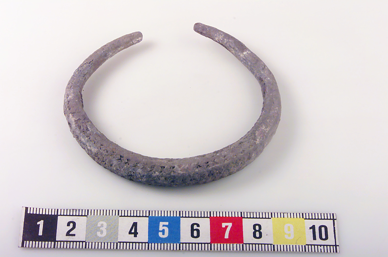 Av svagt oval ten med avsmalnande ändar. Ornerad med motställda trianglar i fyra rader. Korroderat ytskikt.