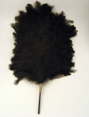 Svart plym bestående av ett flertal mindre fjädrar. Fästad med ett naturfärgat snöre virat kring skaftet, en svart träpinne, 120mm.