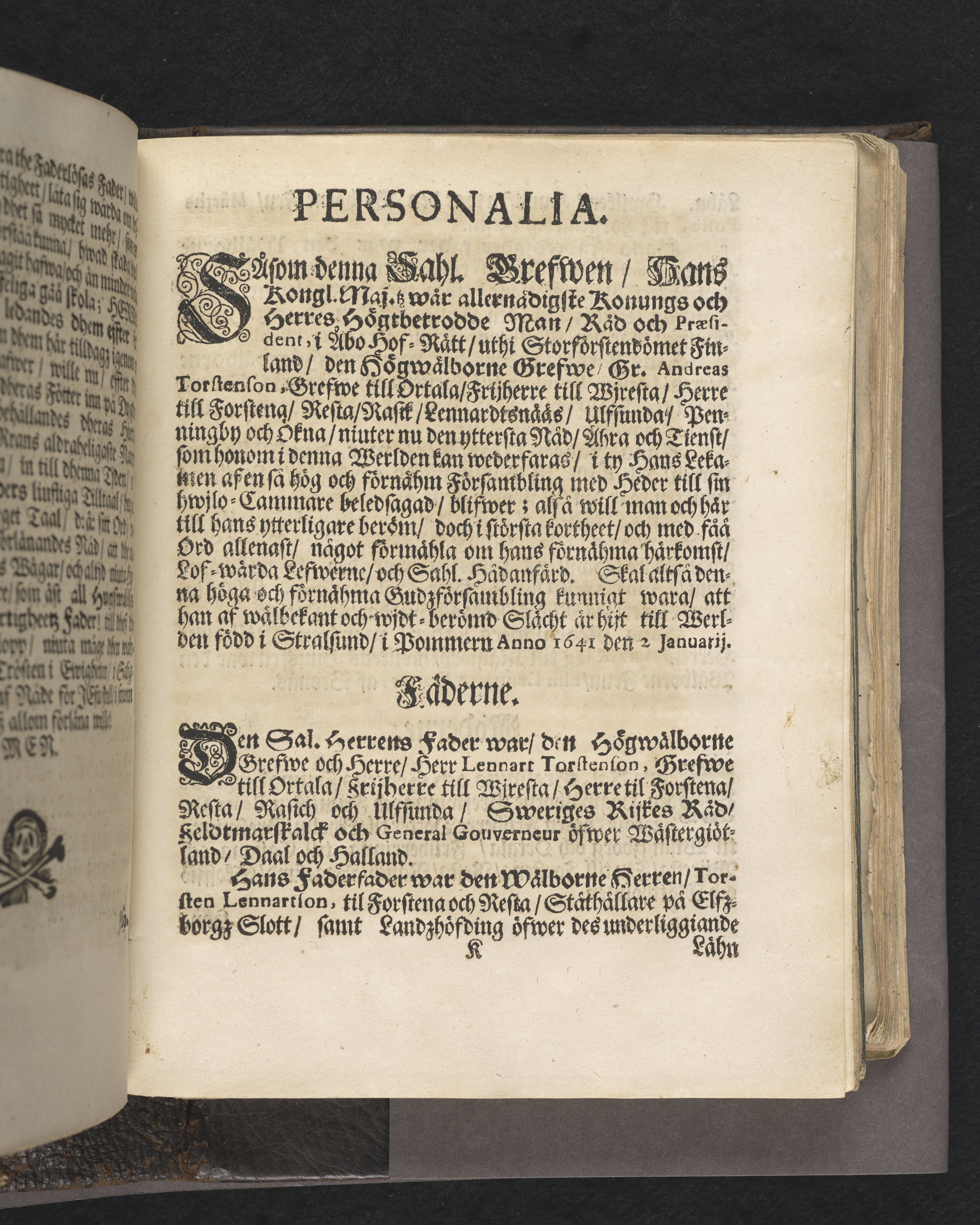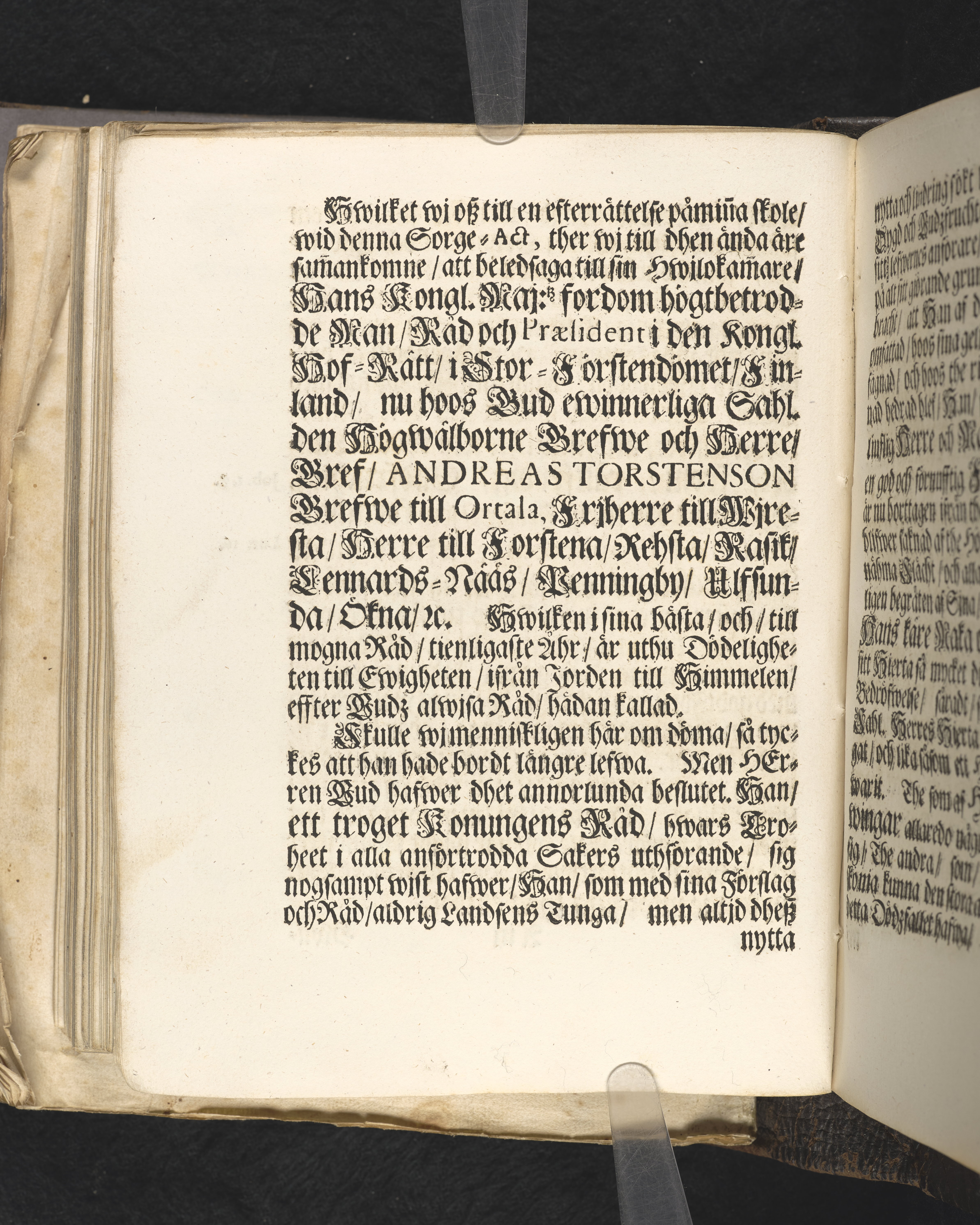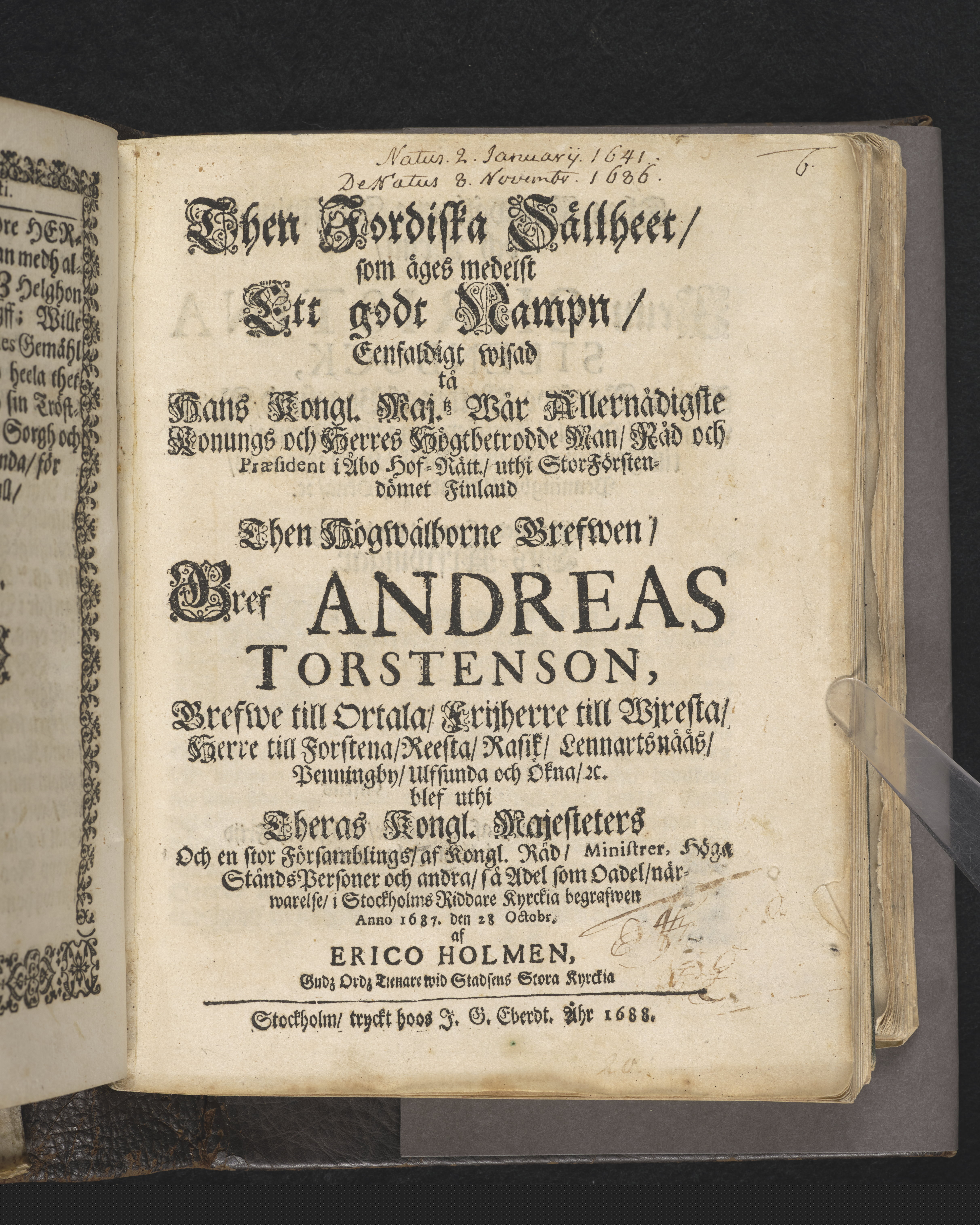 Then jordiska sällheet, som äges medelst ett godt nampn, eenfaldigt wisad tå ... Gref Andreas Torstenson ... blef ... i Stockholms Riddare kyrckia begrafwen anno 1687. den 28 Octobr. af Erico Holmen ... Stockholm, tryckt hoos I. G. Eberdt. Åhr 1688.
