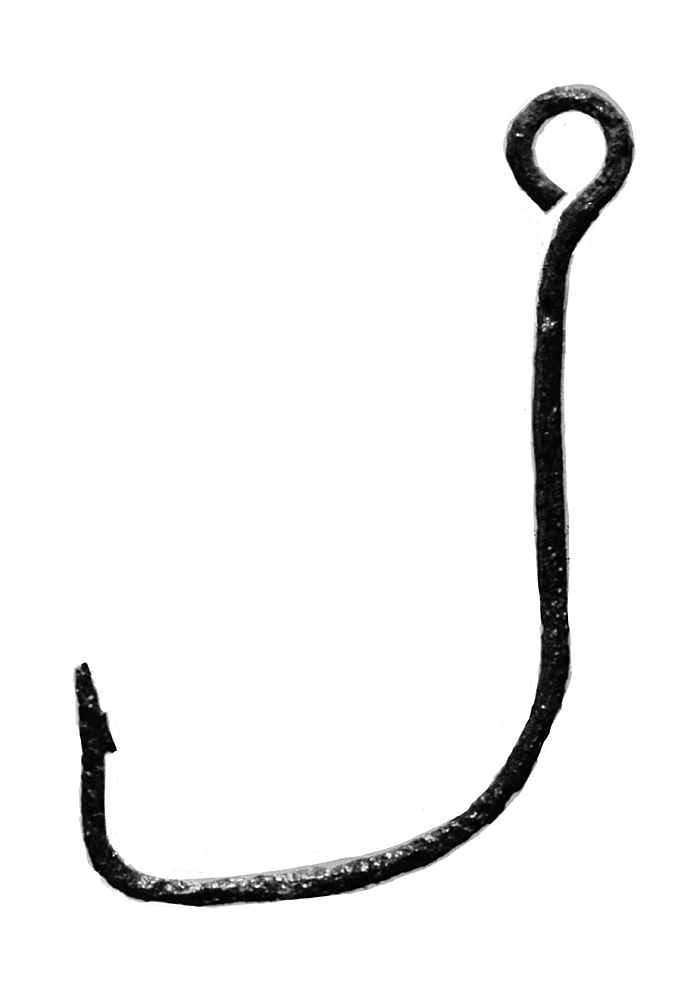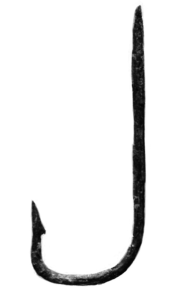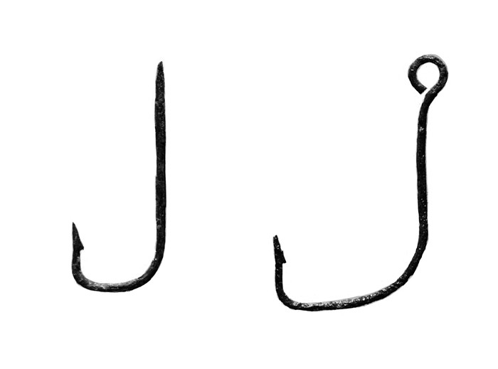 FISKKROKAR, två stycken Av runstavig tråd. Nedre ändan tillspetsad samt med en kort hulling på insidan. Övre ändan på den större omböjd till en ögla, på den mindre tillplattad till en liten skaiva som fäste på rev eller tafs. Längd: 3,3 och 4 cm
