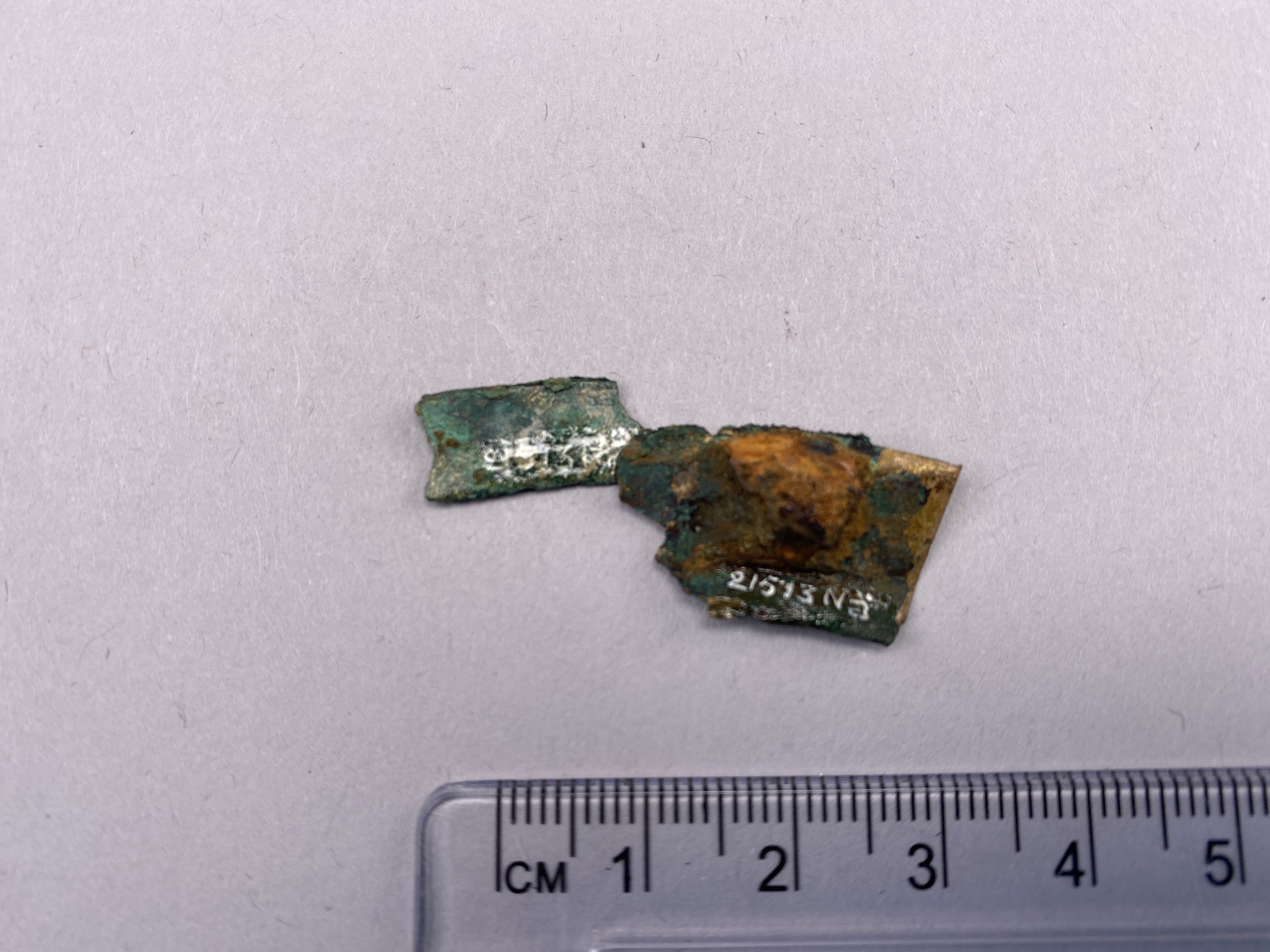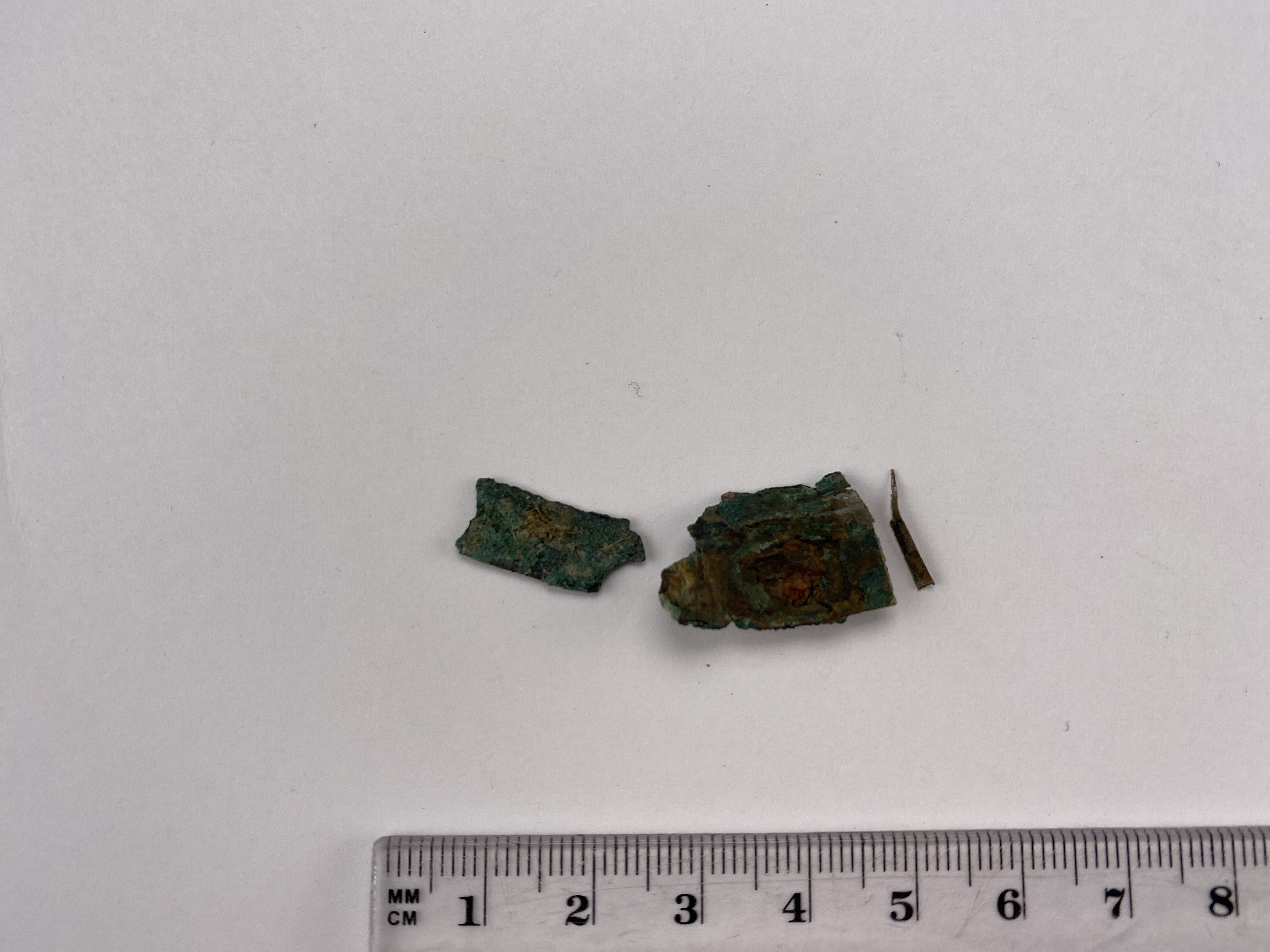 fragment av troligen av rund skiva. Med fastkoroderad nit och små rester av järnkorosion. Två fragment som korroderat ihop. Klippt med plåtsax för tidigare analys