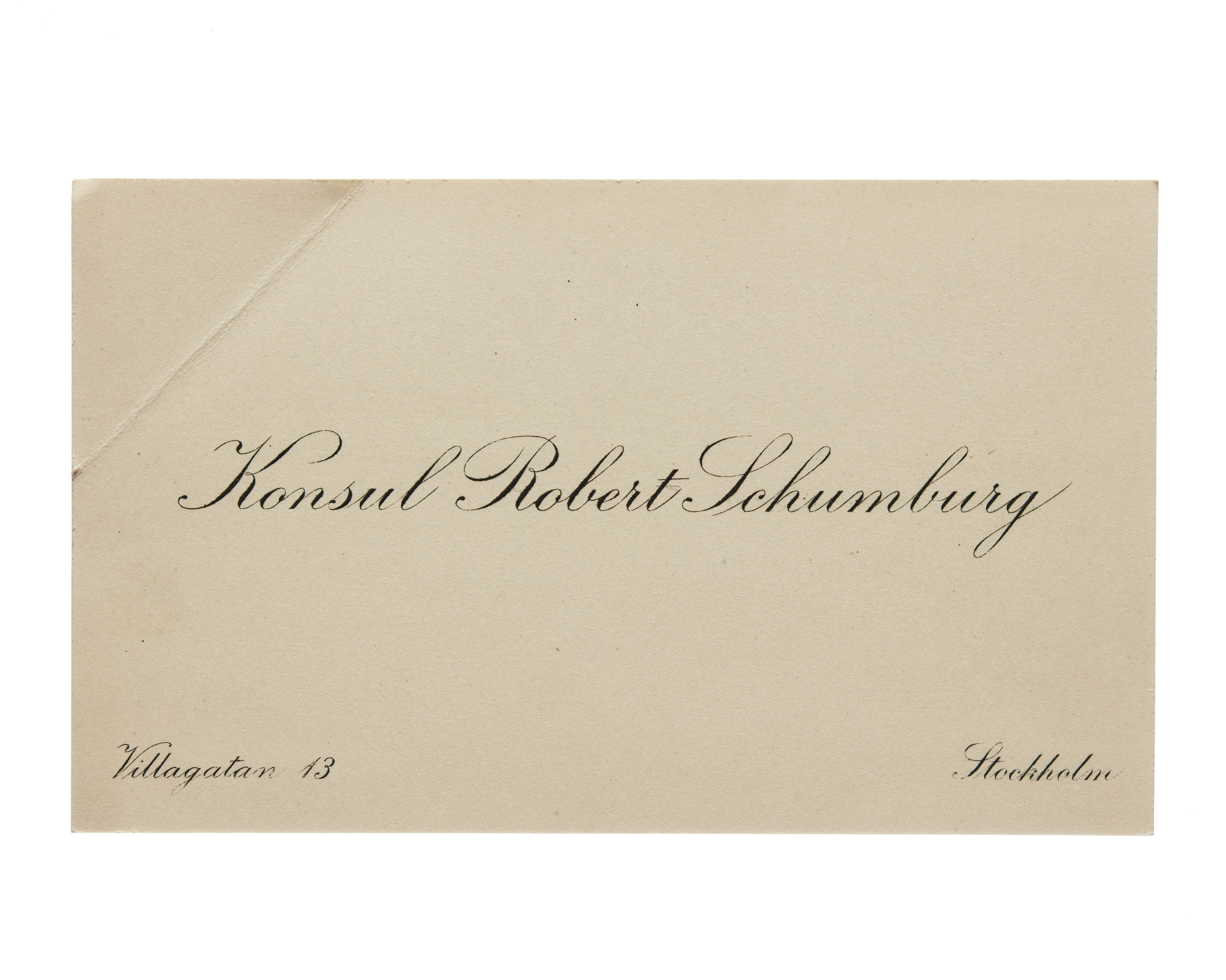 Två visitkort från Konsul Robert Schumburg. Första kortet daterat 1922, vikt i övre vänstra hörnet. Adress (nedre vänstra hörnet) Villagatan 13, (nedre högta hörnet) Stockholm. Andra kortet daterat 1923, vikt i övre vänstra hörnet.