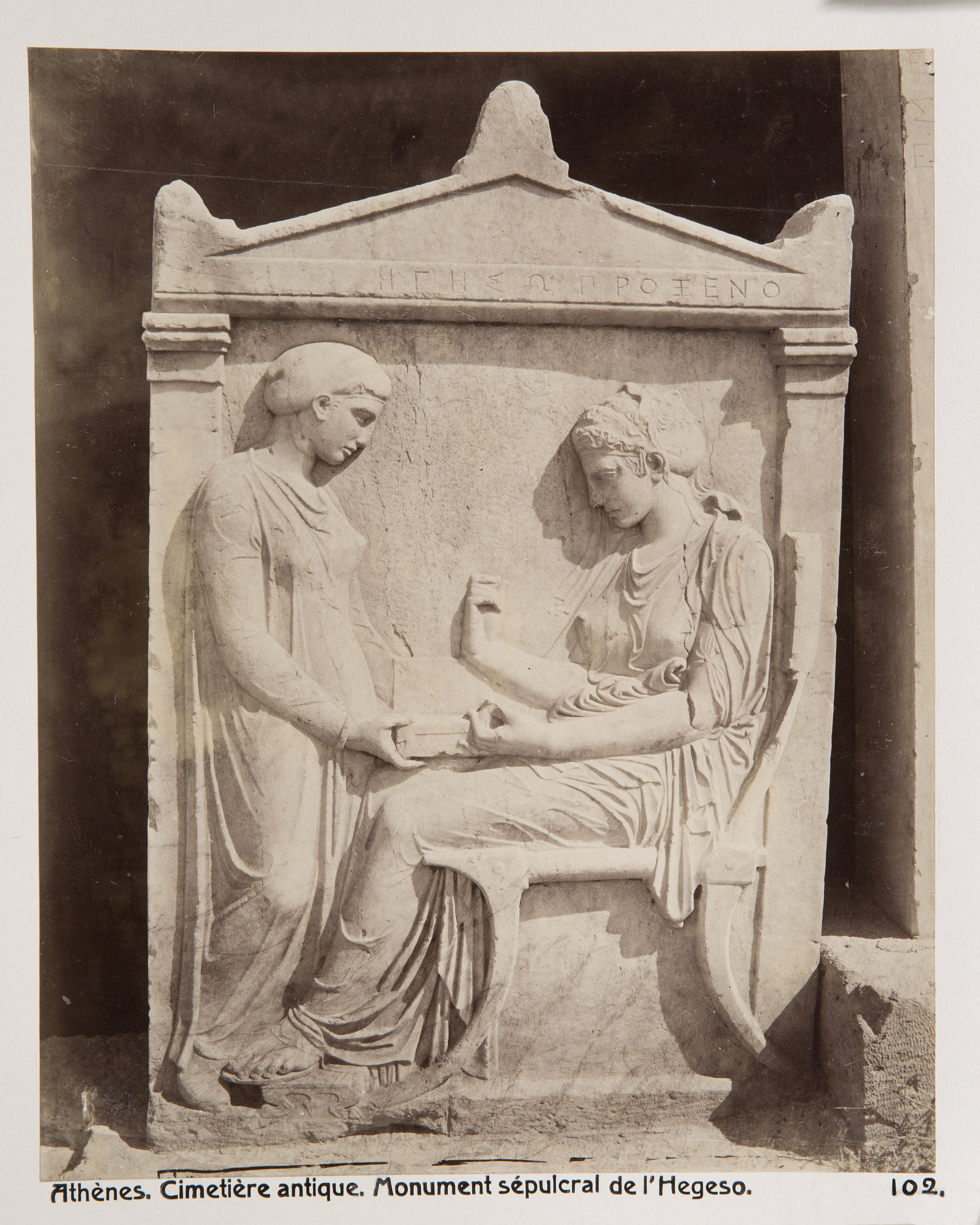 Monument på den antika kyrkogården i Aten, Grekland. Text på originalet: Athènes. Cimetière antique. Monument sépulcral de l`Hegeso. Foto från resa genom Grekland, Makedonien och Serbien, 15 mars-6 juni 1896. Fotografierna LXVI:K.18.-147. är köpta av Wilhelmina von Hallwyl, f. Kempe på Korfu samt i Patras, Nafplion, Aten, Thessaloniki och Belgrad. Med på resan var maken Walther von Hallwyl och fröken Ida Uhse. Uppgifterna kommer från Ida Uhses reseanteckningar.
