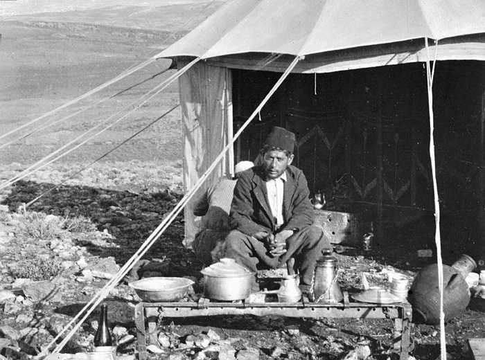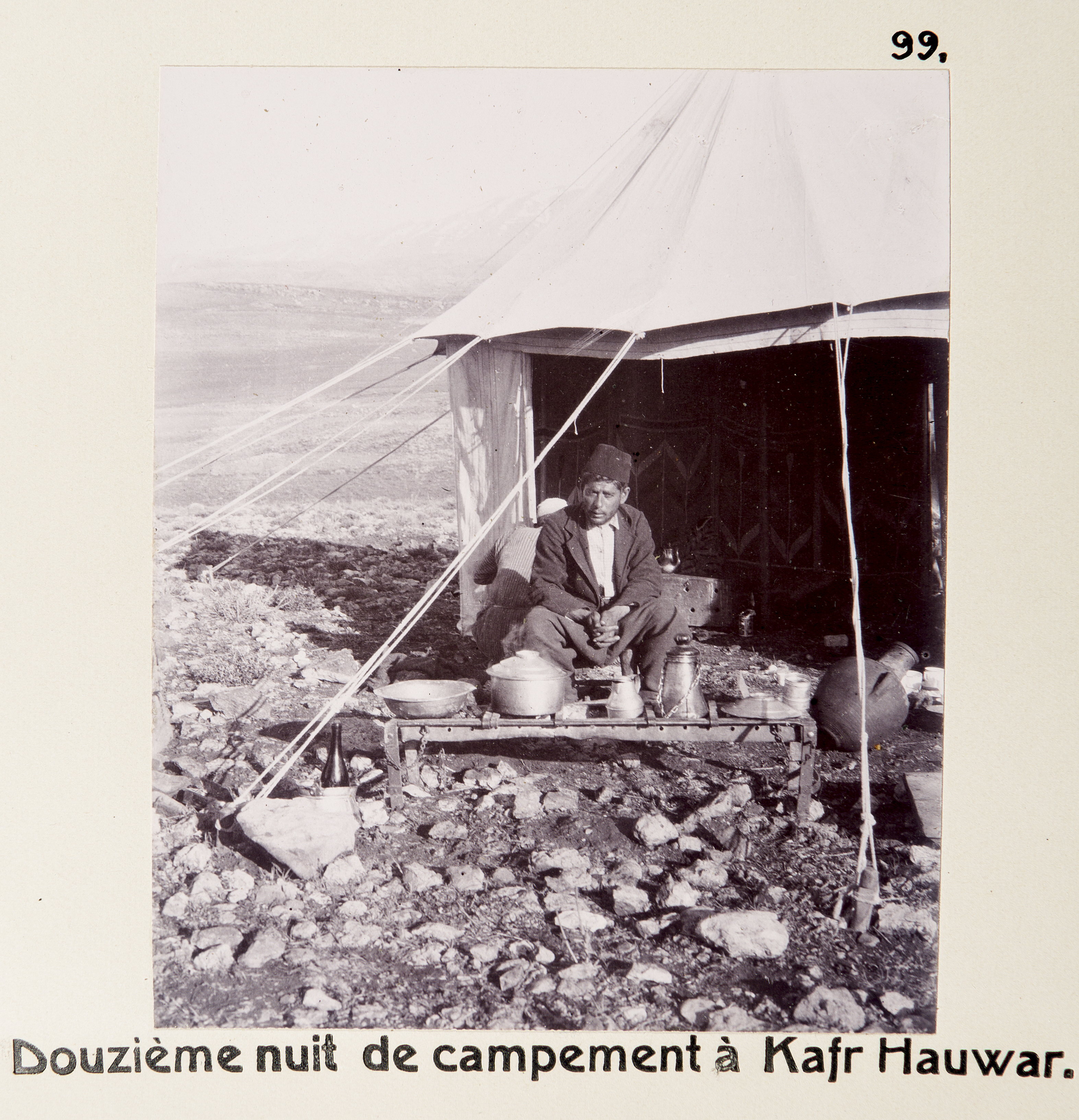 Fotografi. Tolfte natten. Lägret i Kafr Hawr. Text på originalet: "Douzième nuit de Campement à Kafr Hauwar". Fotografierna LXVI:N.01.-180. kommer från resan till Palestina och Syrien som Wilhelmina och Walther von Hallwyl gjorde den 30 mars-27 april 1901. De lämnade Sverige den 5 november 1900 för Egypten, där de stannade till den 28 mars 1901, då de fortsatte till Palestina. Med på resan var Wilhelminas sällskapsdam, fröken Ida Uhse. Den 27 april fortsatte de till Turkiet och Mindre Asien. De mindre fotografierna (utom de från Samos) LXVI:N.90.-100. är tagna av Wilhelmina själv, under en resa till häst från Jerusalem till Damaskus 8-20 april 1901. Övriga fotografier är inköpta av Wilhelmina i Jerusalem, Damaskus och Beirut. Alla uppgifter kommer från Ida Uhses reseanteckningar.