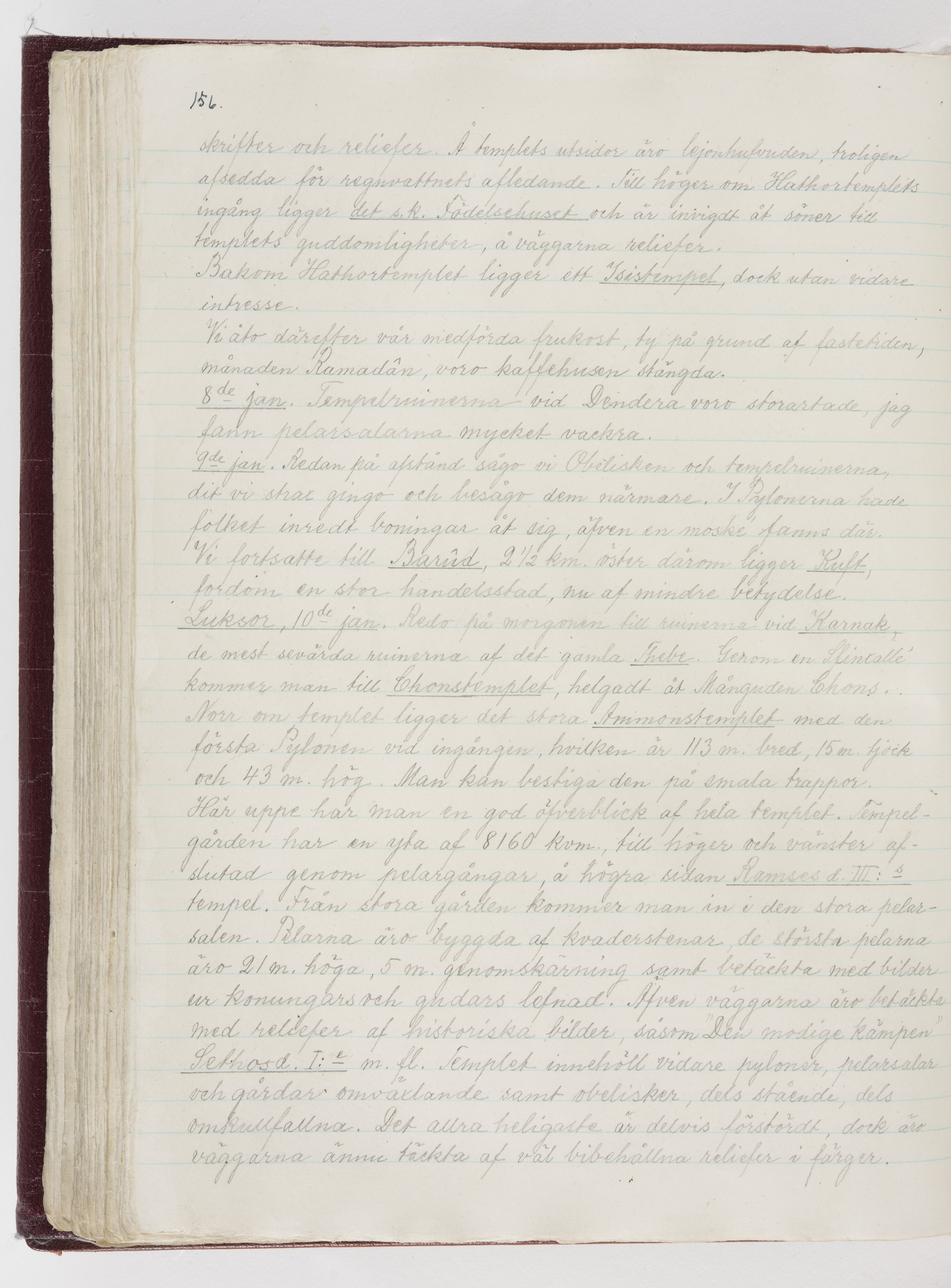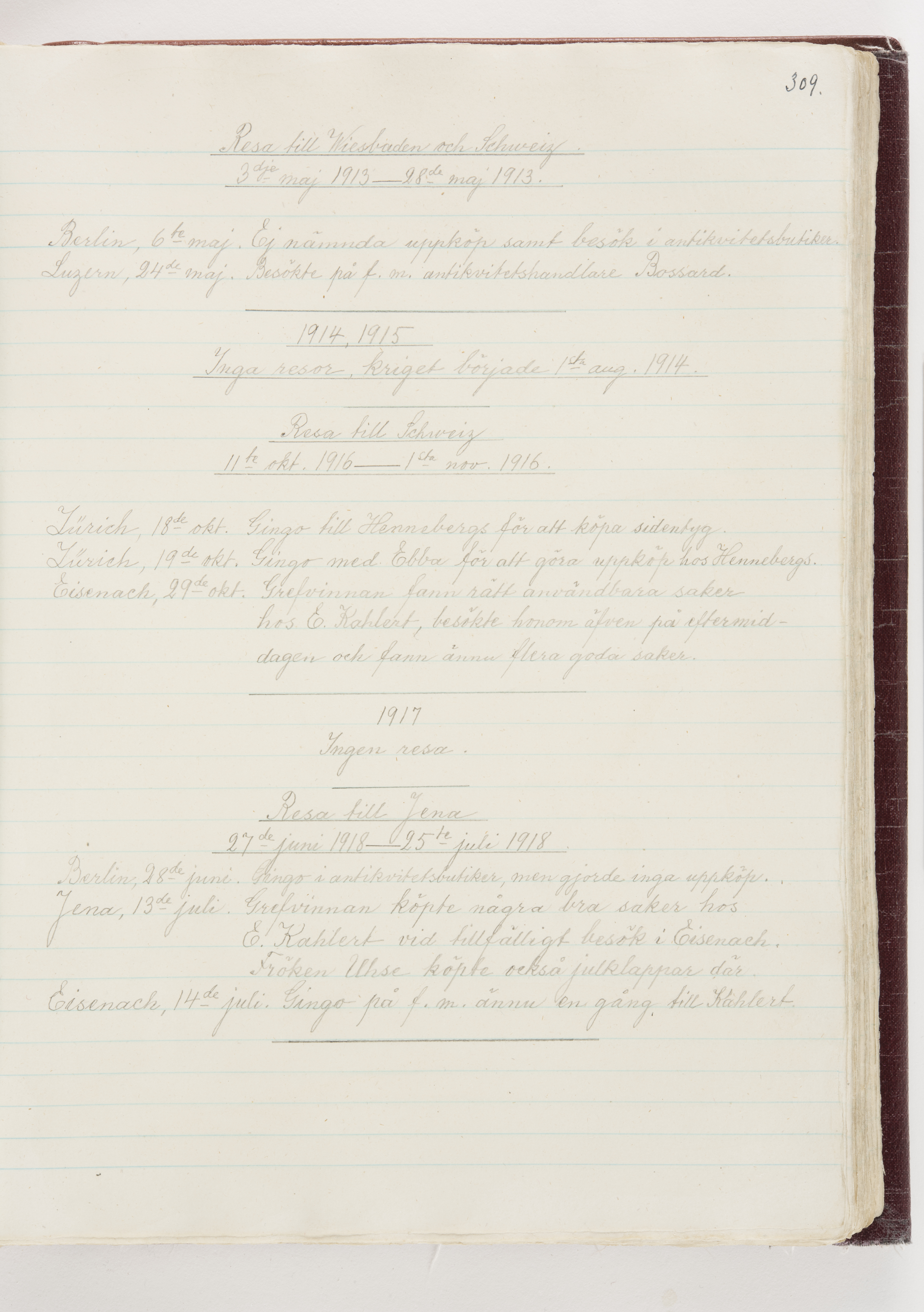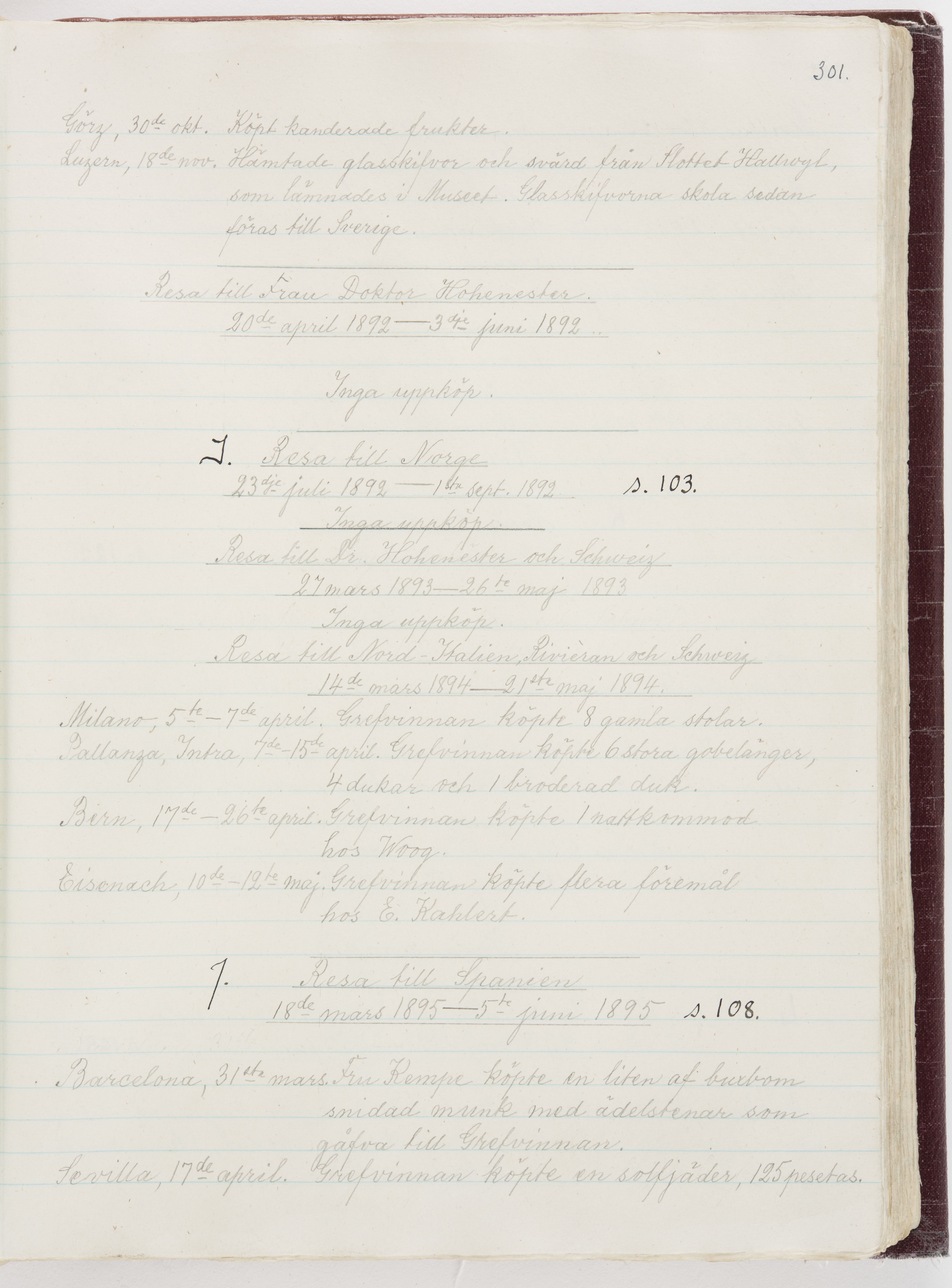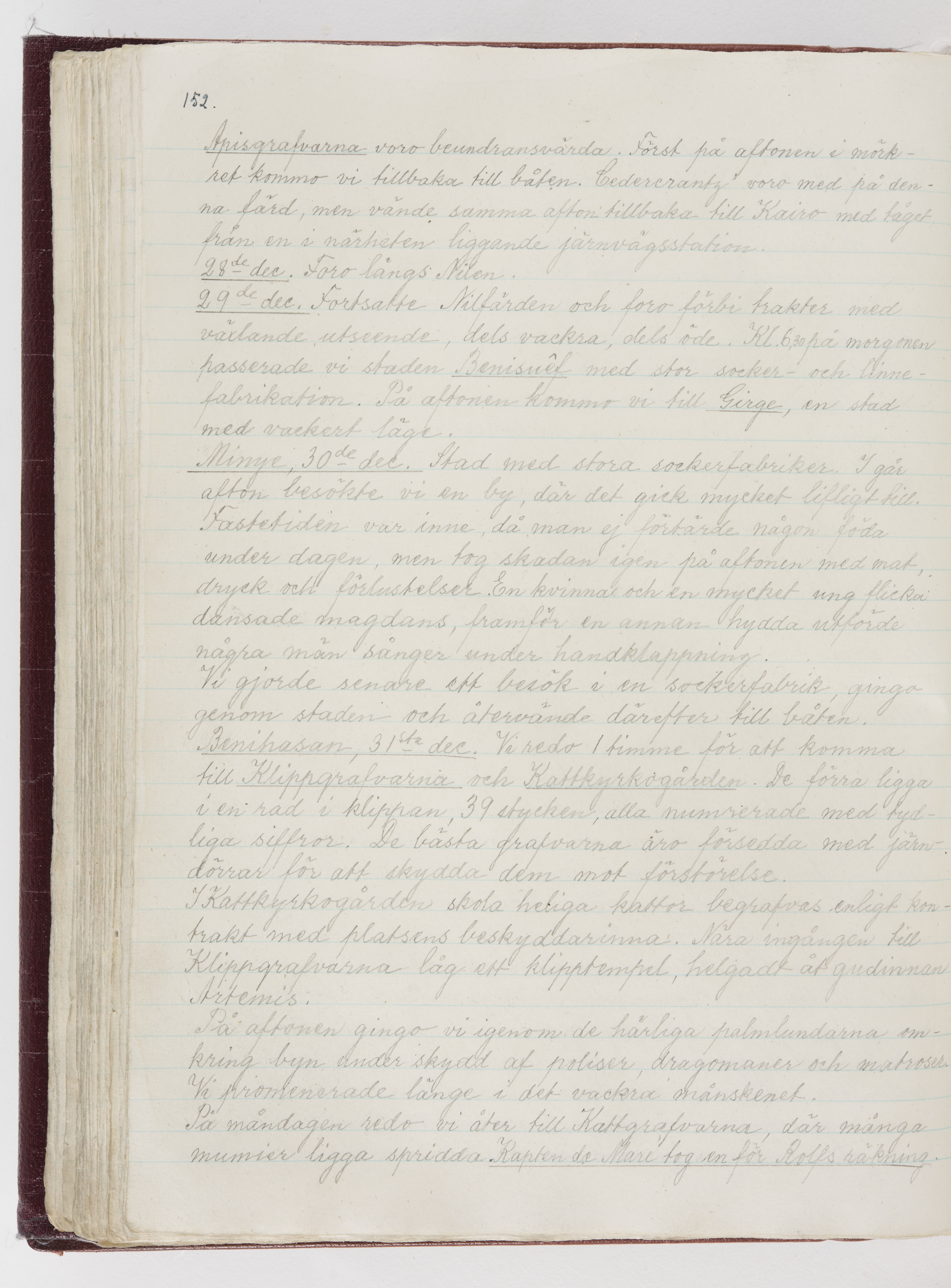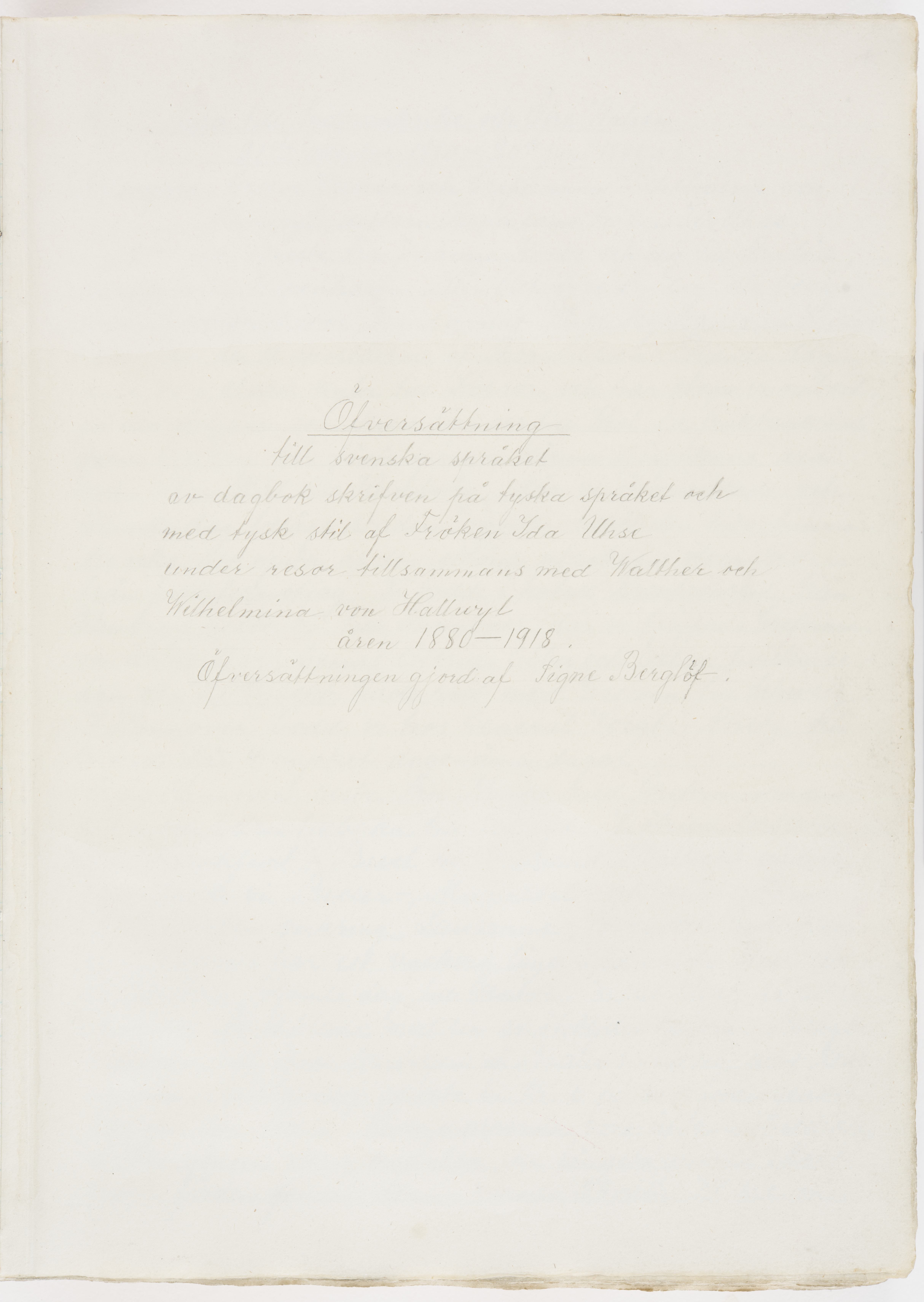 Översättning till svenska språket av dagbok skriven på tyska språket av Ida Uhse under resor tillsammans med Walther och Wilhelmina von Hallwyl åren 1880-1918 samt företeckning över fynd, gåvor och inköpta föremål under resorna åren 1881-1918. Av Signe Berglöf. 309 s. Skrivet med blyerts. Band (helt skinn-). Av brun >>oasis morocco>>, bundet med dubble ansättning och >>knäpprygg>>. Kapitäl av gult sämskskinn. Försättsblad av läderimitationspapper i brunt och svart. Fals av röd klot. 32*25*4,8 cm. Bundet av bokbindaren Otto Olsson.