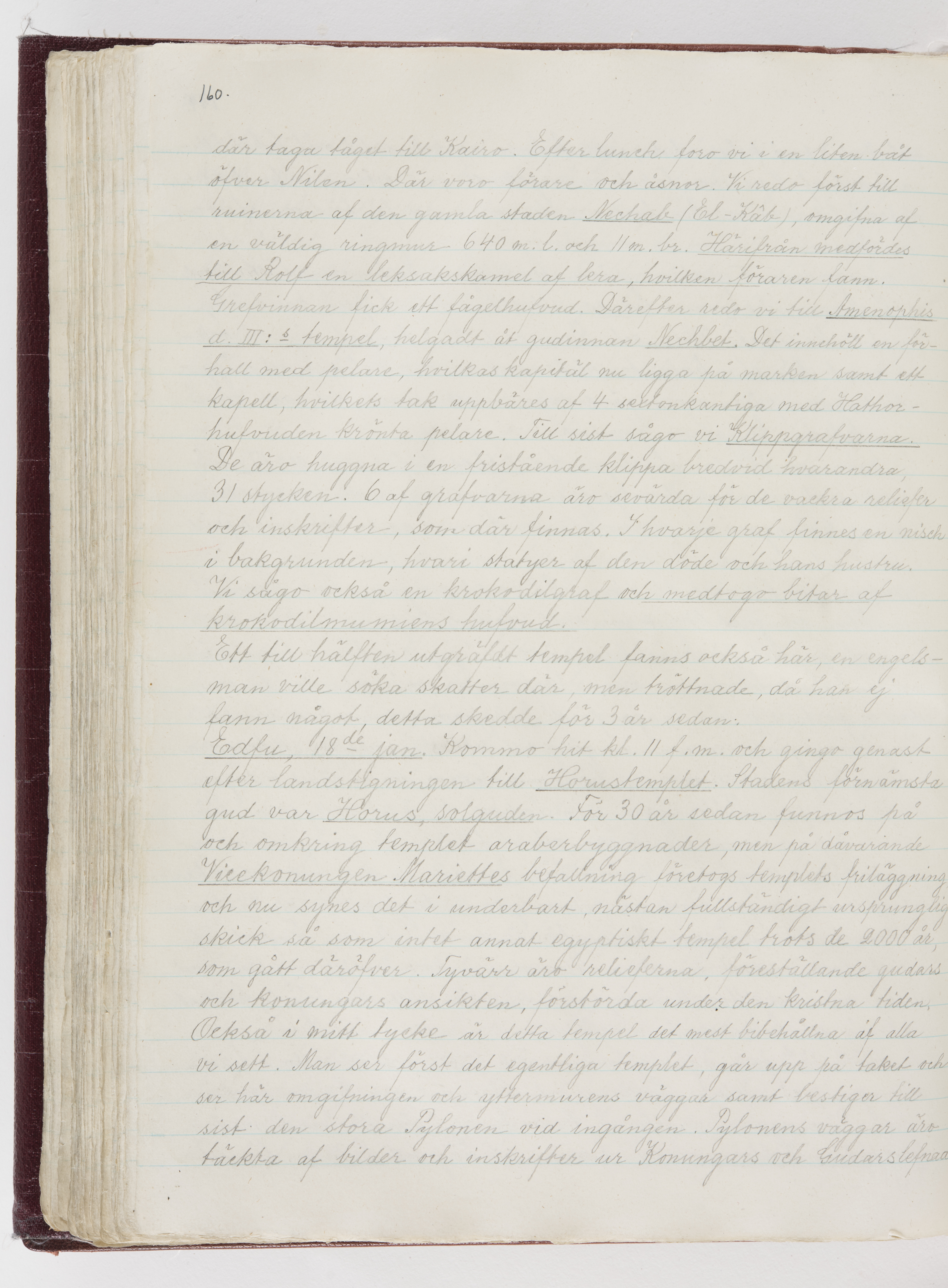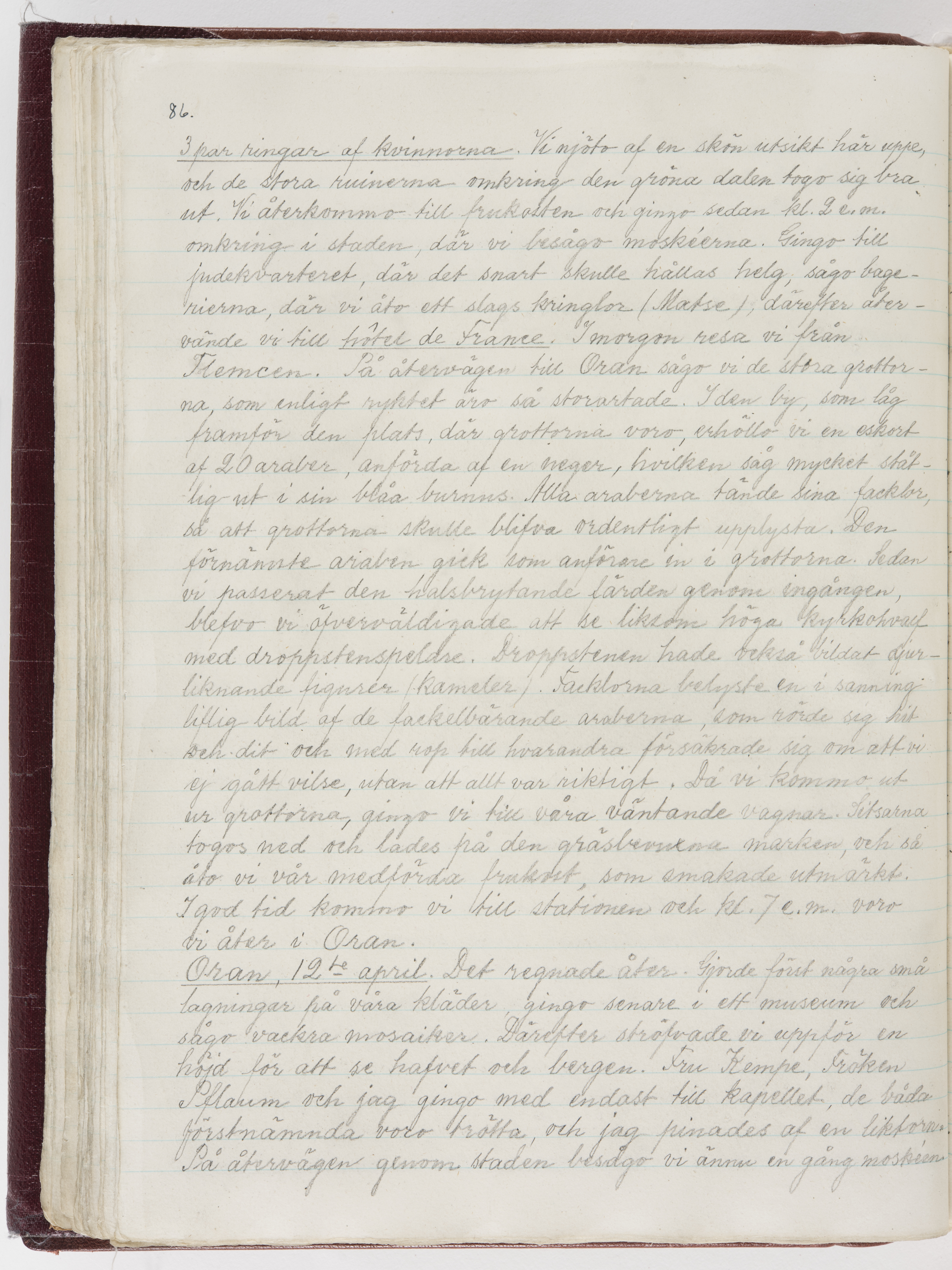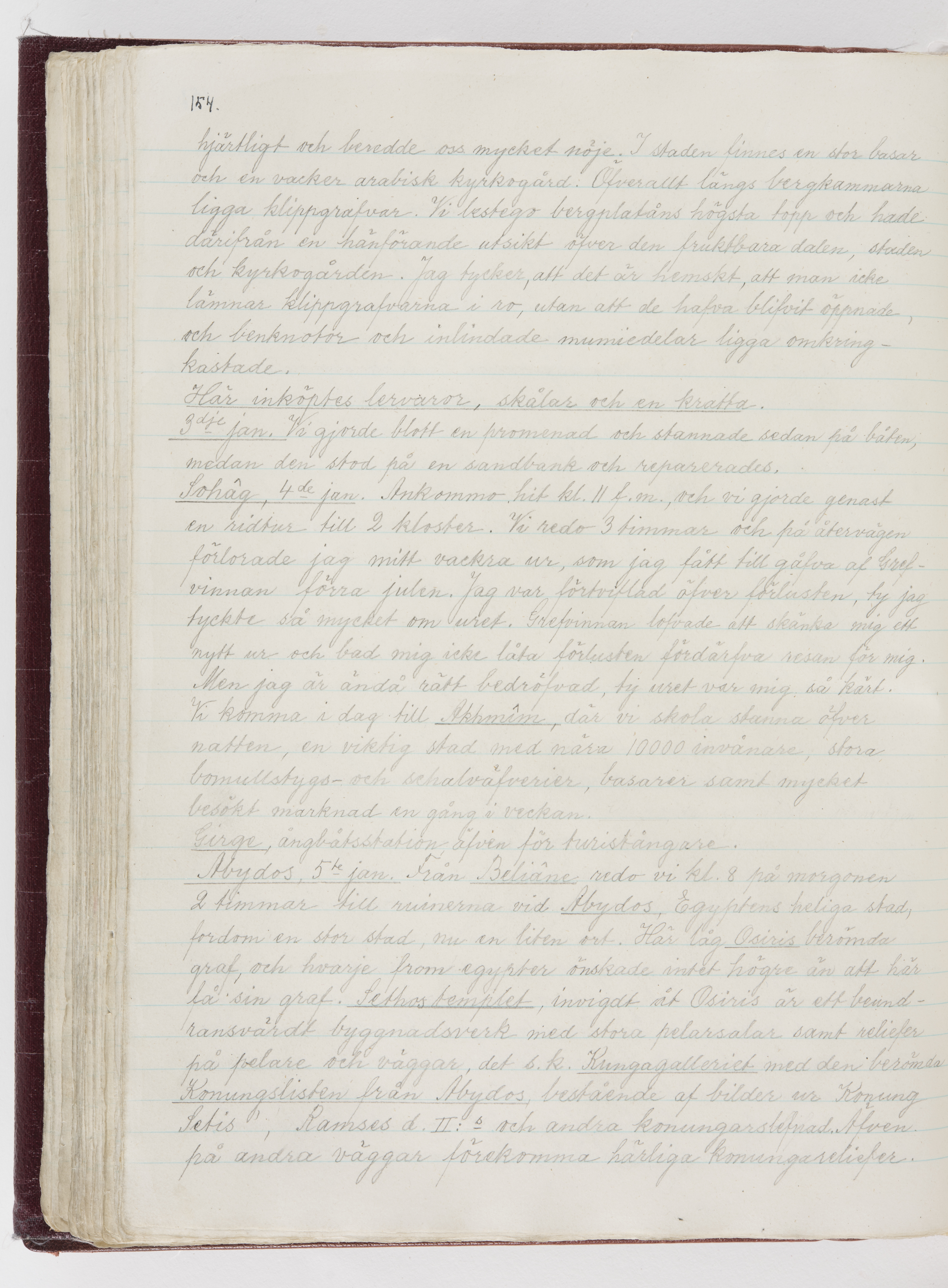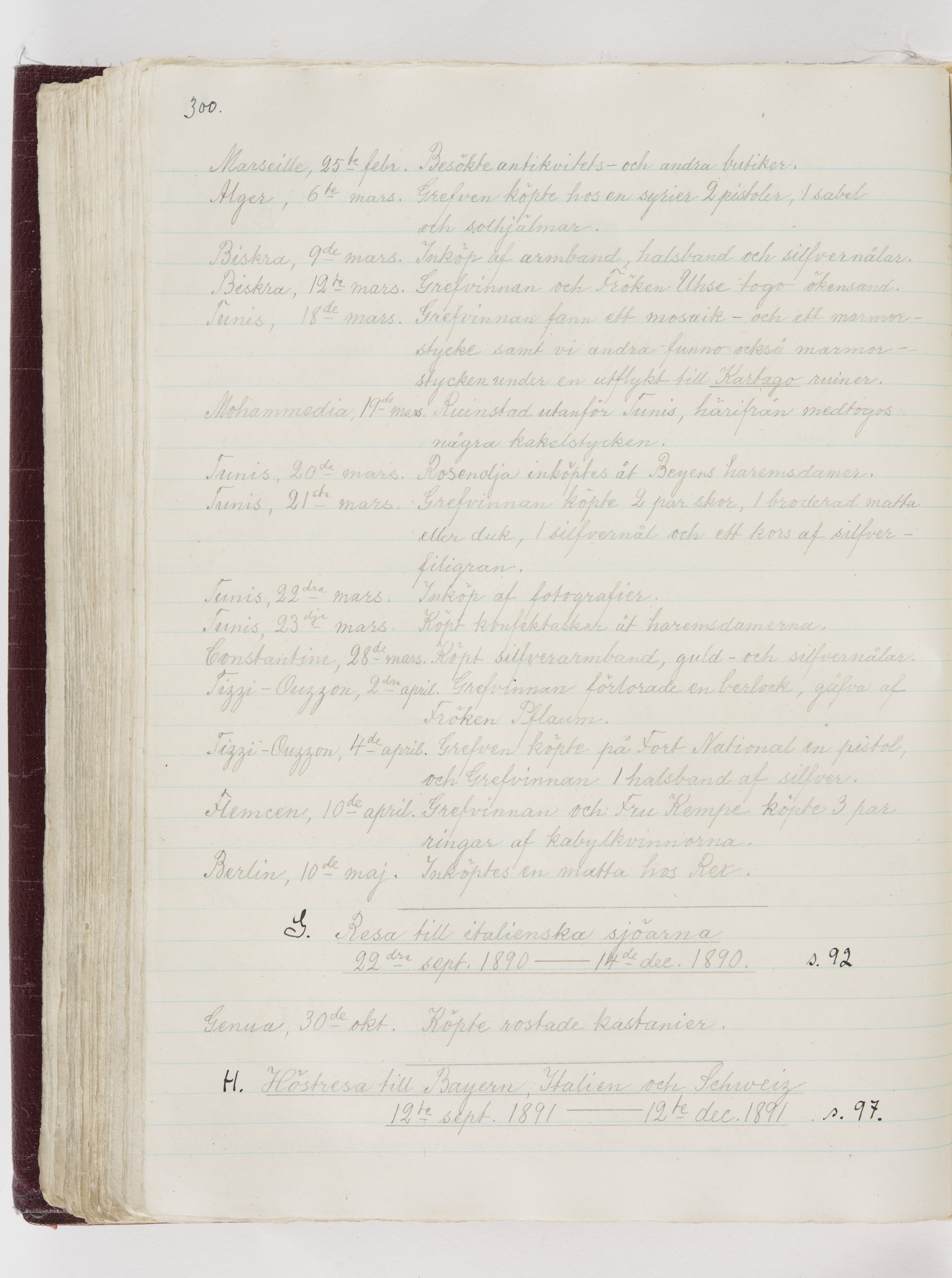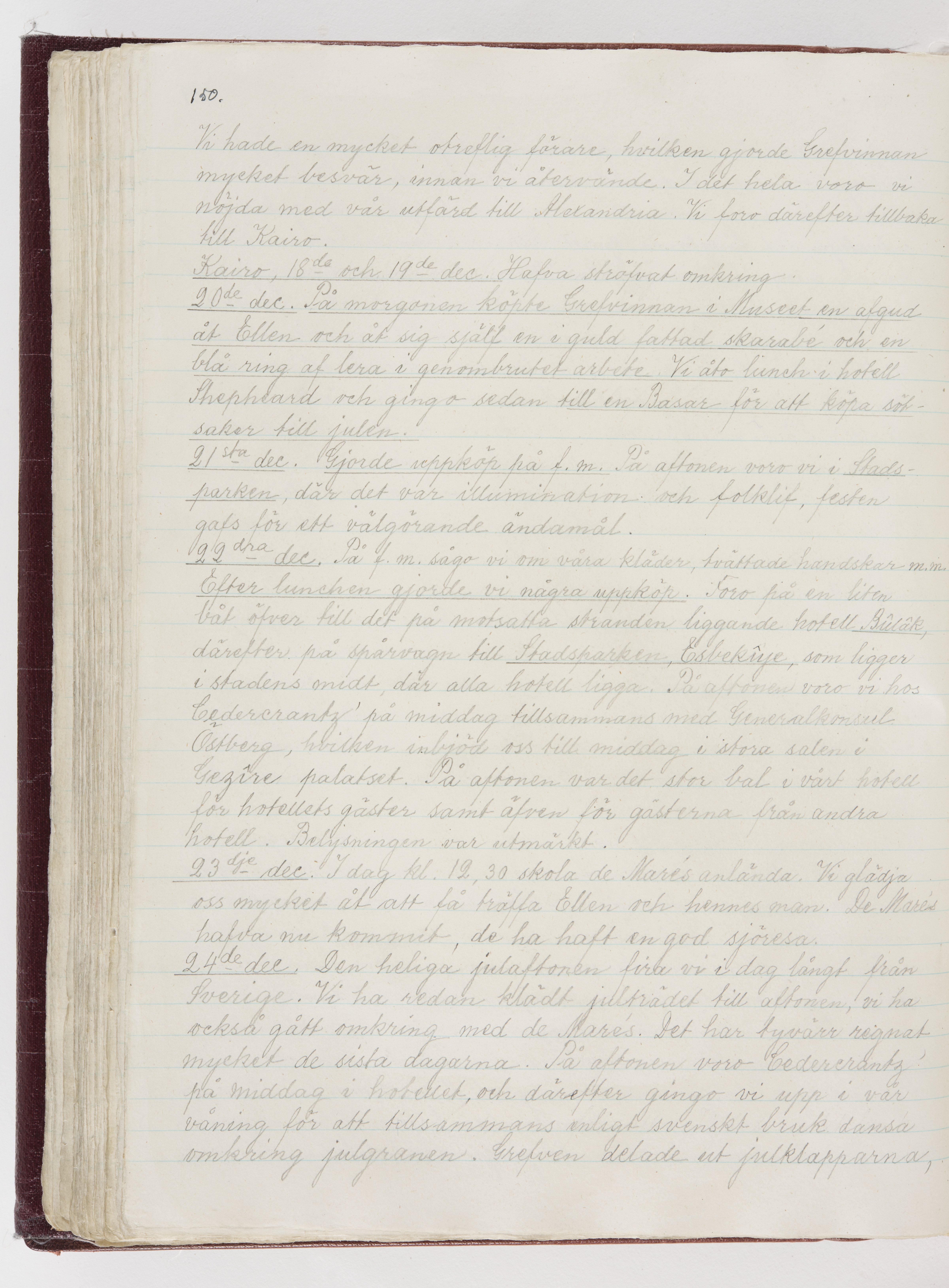 Översättning till svenska språket av dagbok skriven på tyska språket av Ida Uhse under resor tillsammans med Walther och Wilhelmina von Hallwyl åren 1880-1918 samt företeckning över fynd, gåvor och inköpta föremål under resorna åren 1881-1918. Av Signe Berglöf. 309 s. Skrivet med blyerts. Band (helt skinn-). Av brun >>oasis morocco>>, bundet med dubble ansättning och >>knäpprygg>>. Kapitäl av gult sämskskinn. Försättsblad av läderimitationspapper i brunt och svart. Fals av röd klot. 32*25*4,8 cm. Bundet av bokbindaren Otto Olsson.