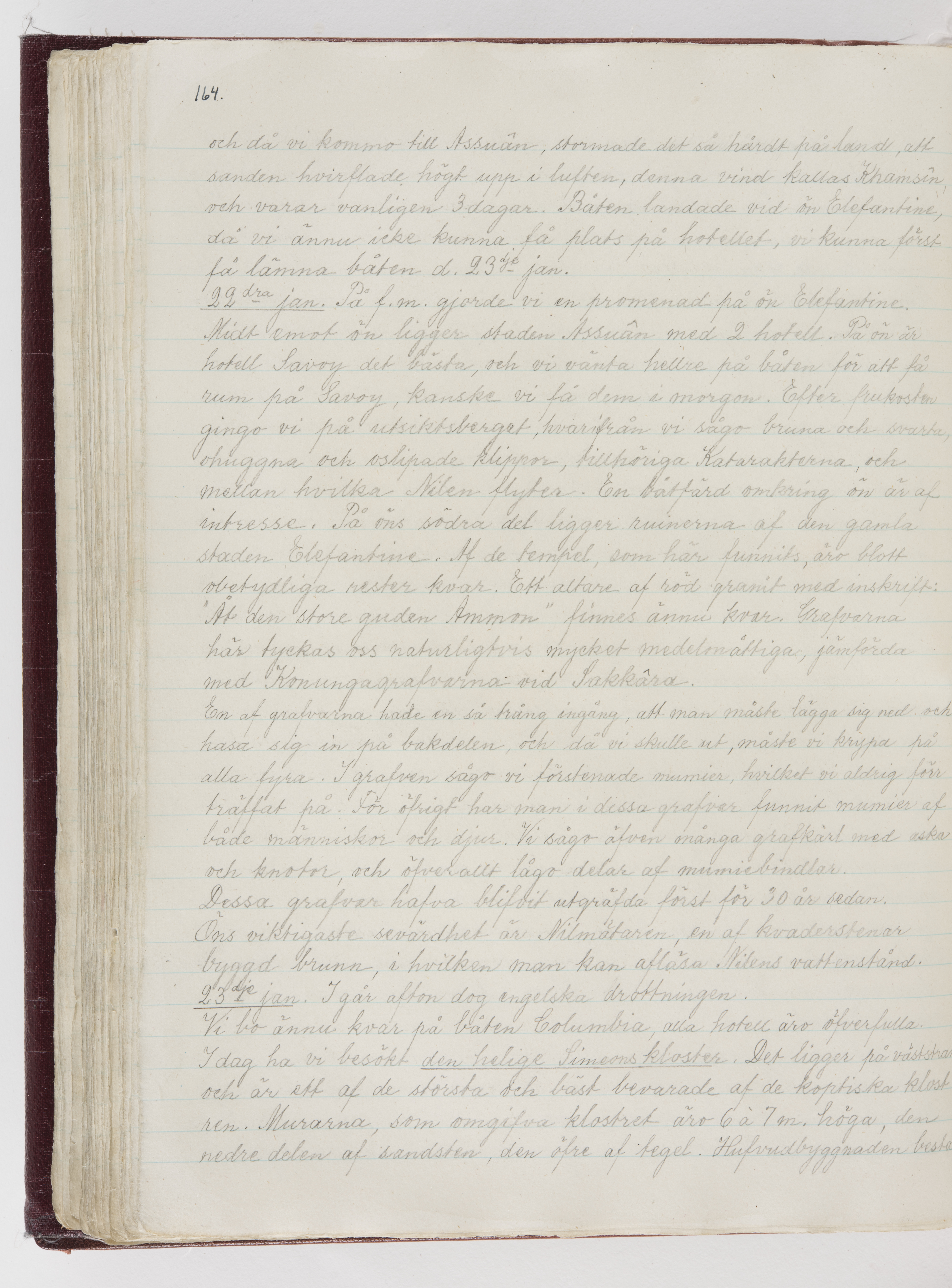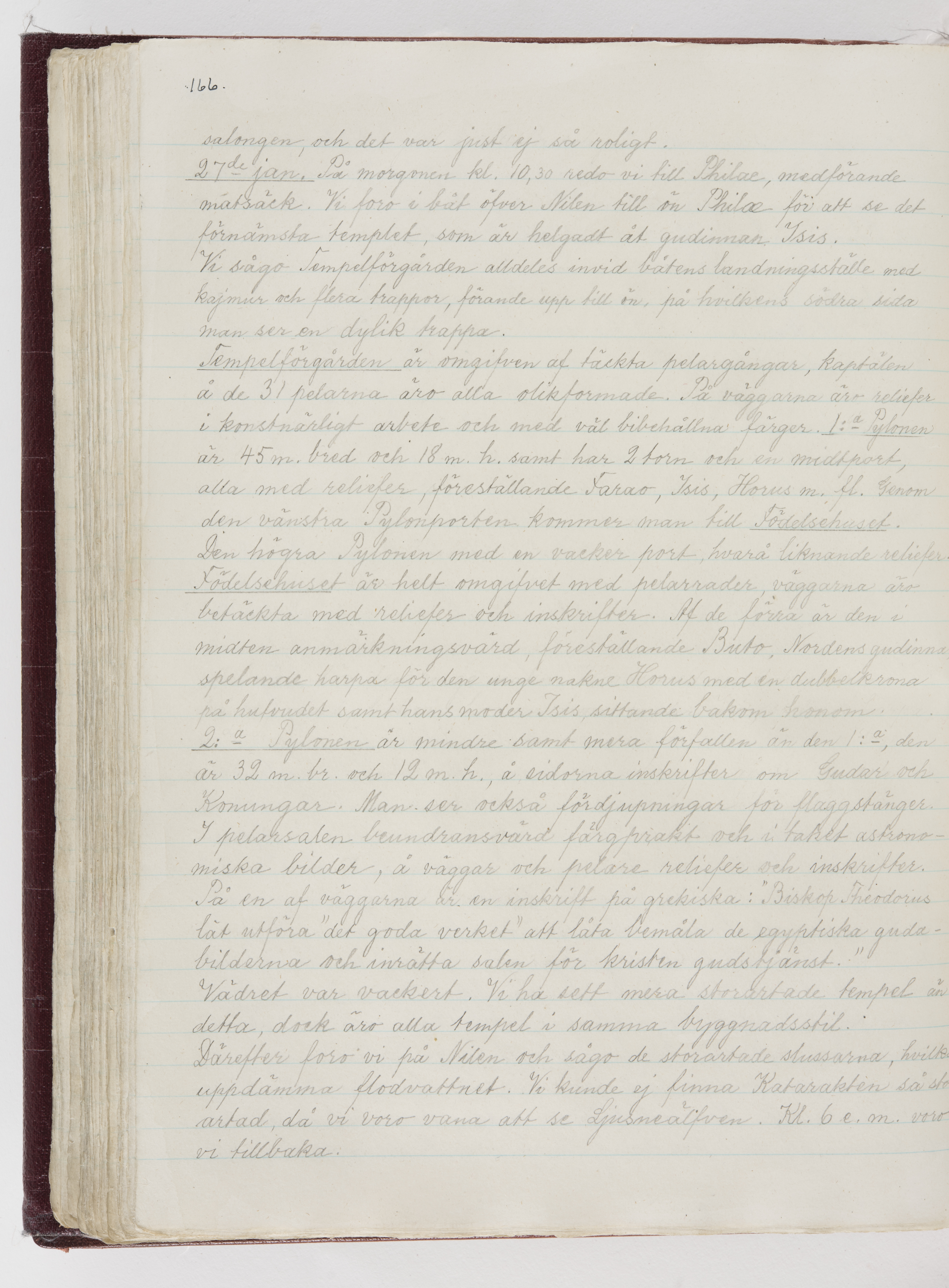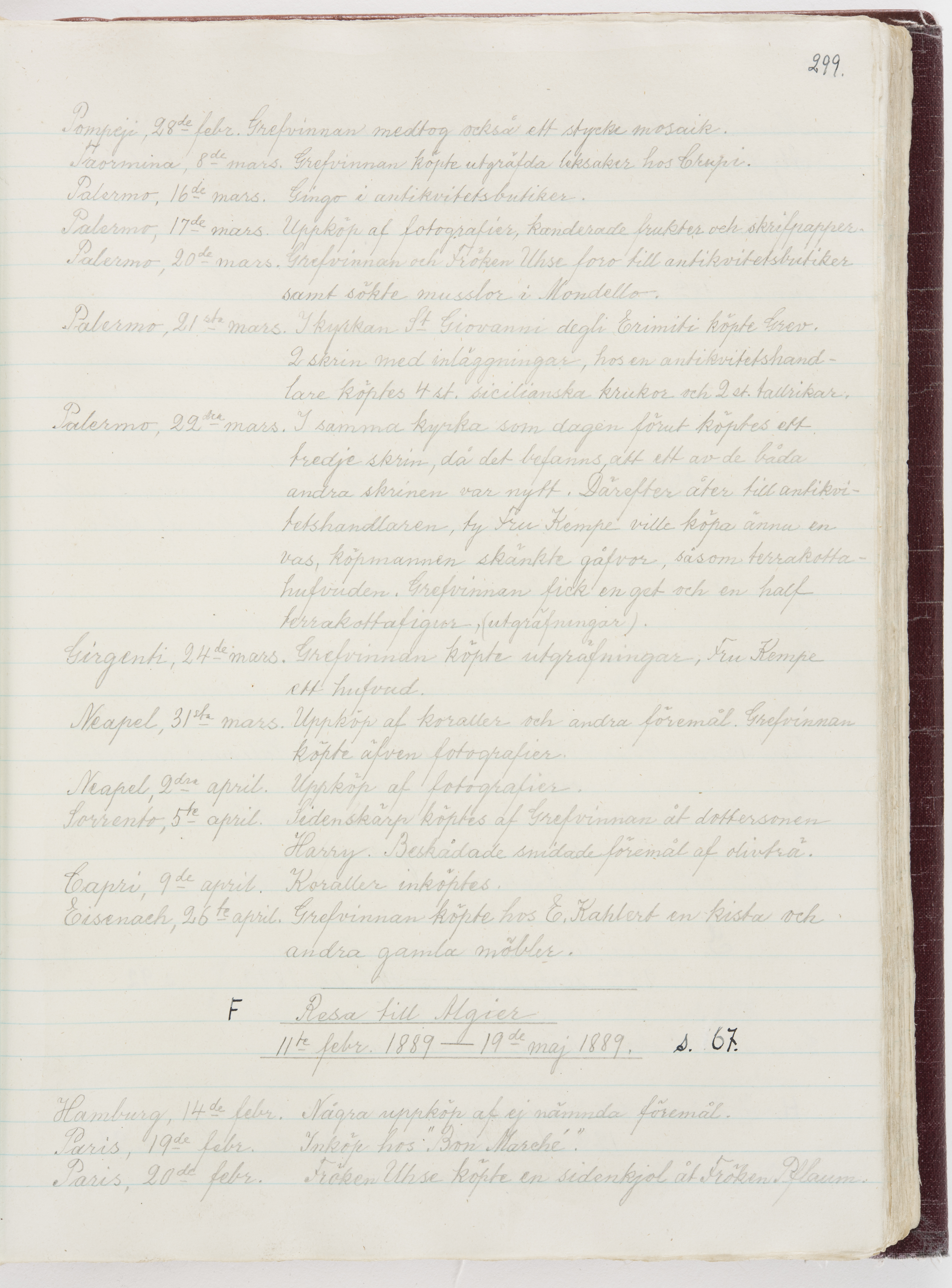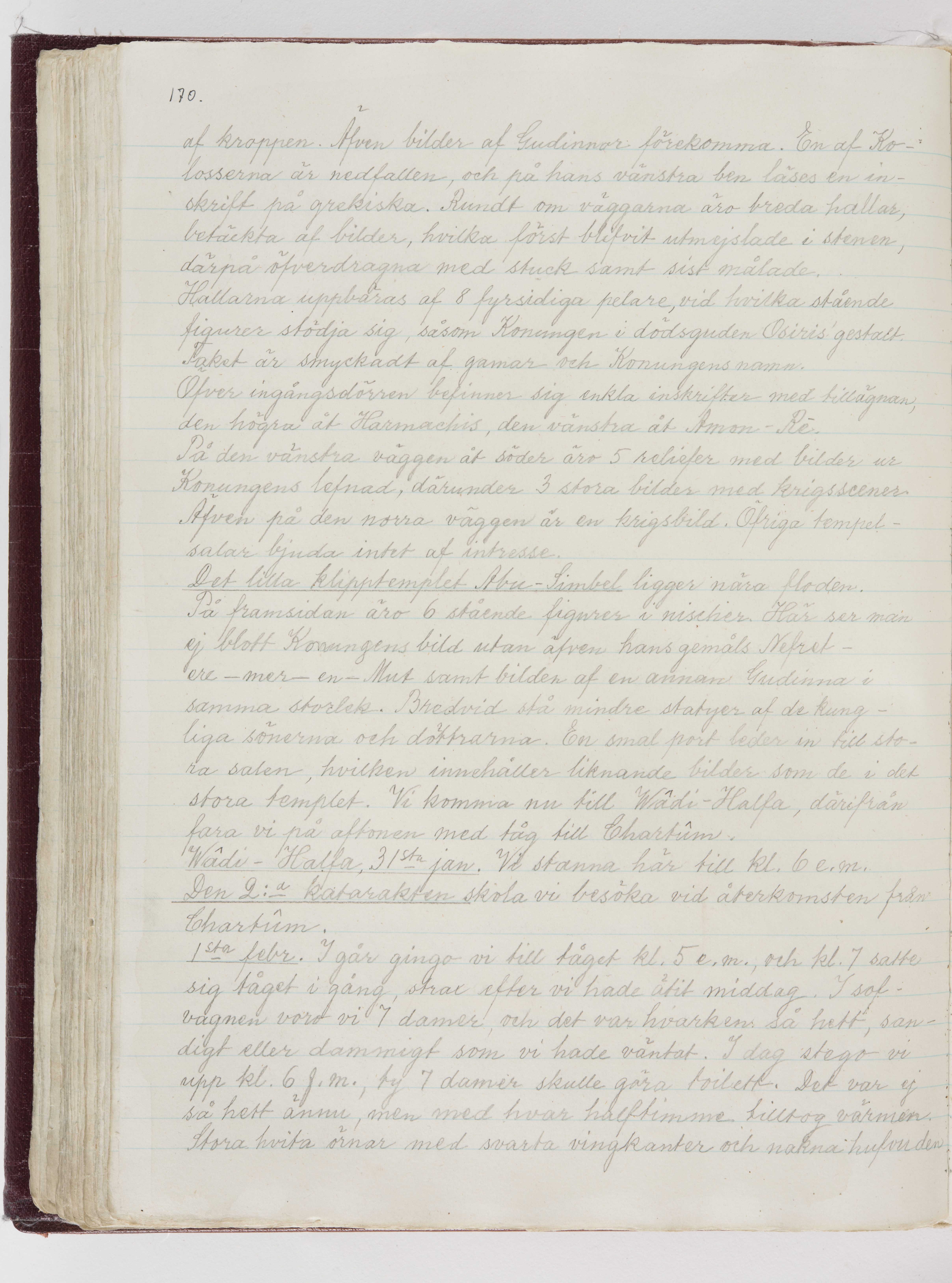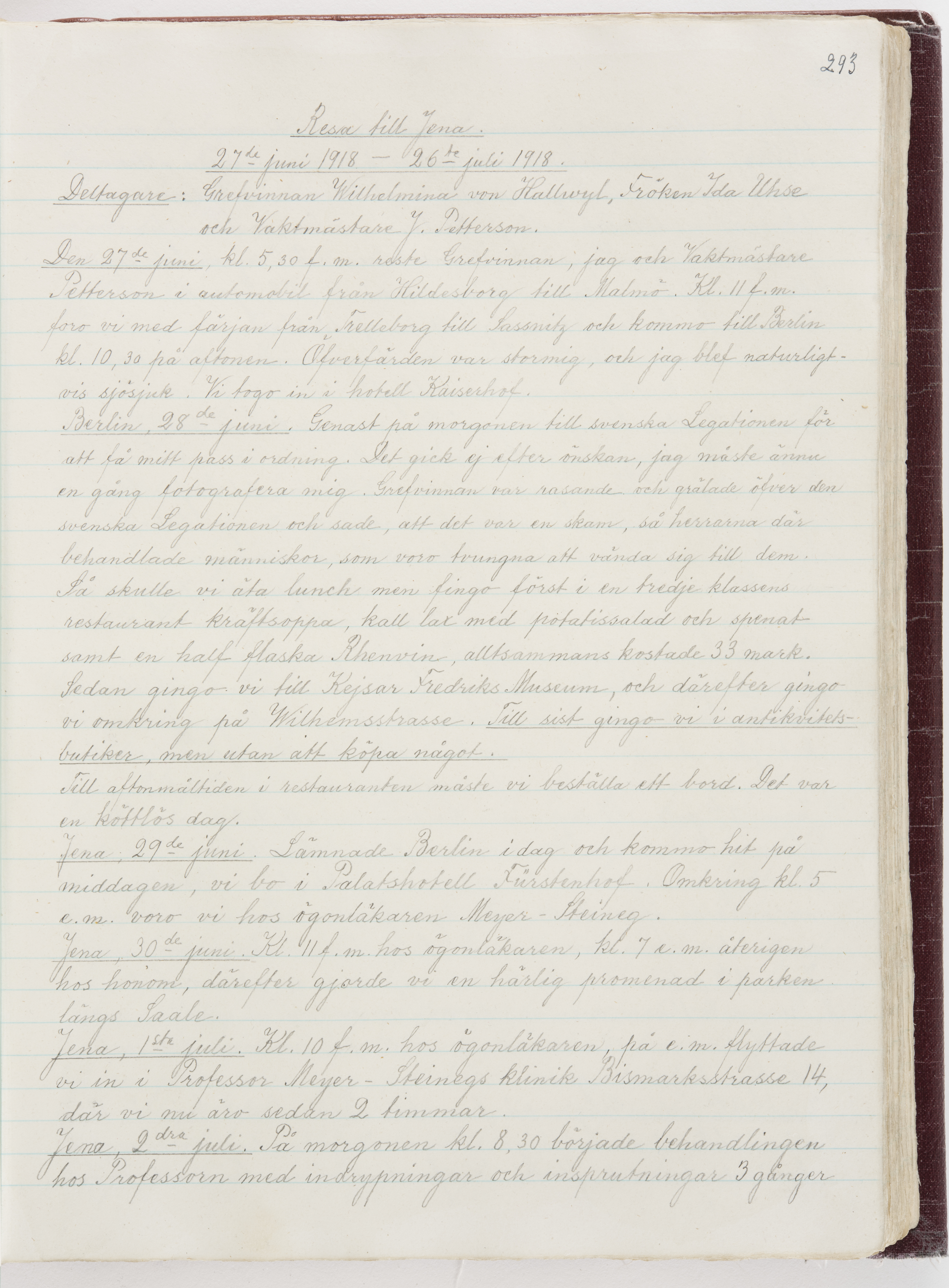 Översättning till svenska språket av dagbok skriven på tyska språket av Ida Uhse under resor tillsammans med Walther och Wilhelmina von Hallwyl åren 1880-1918 samt företeckning över fynd, gåvor och inköpta föremål under resorna åren 1881-1918. Av Signe Berglöf. 309 s. Skrivet med blyerts. Band (helt skinn-). Av brun >>oasis morocco>>, bundet med dubble ansättning och >>knäpprygg>>. Kapitäl av gult sämskskinn. Försättsblad av läderimitationspapper i brunt och svart. Fals av röd klot. 32*25*4,8 cm. Bundet av bokbindaren Otto Olsson.