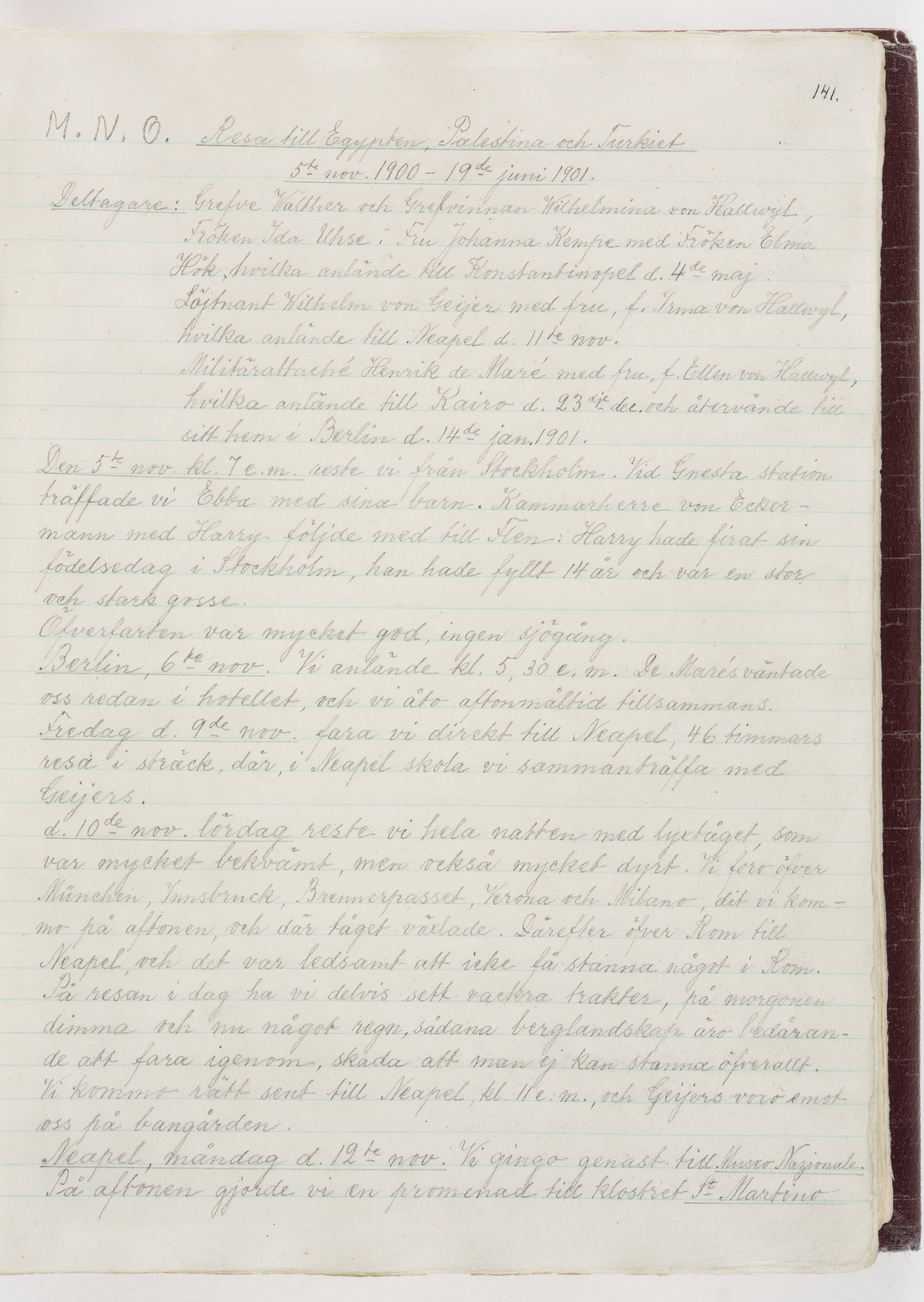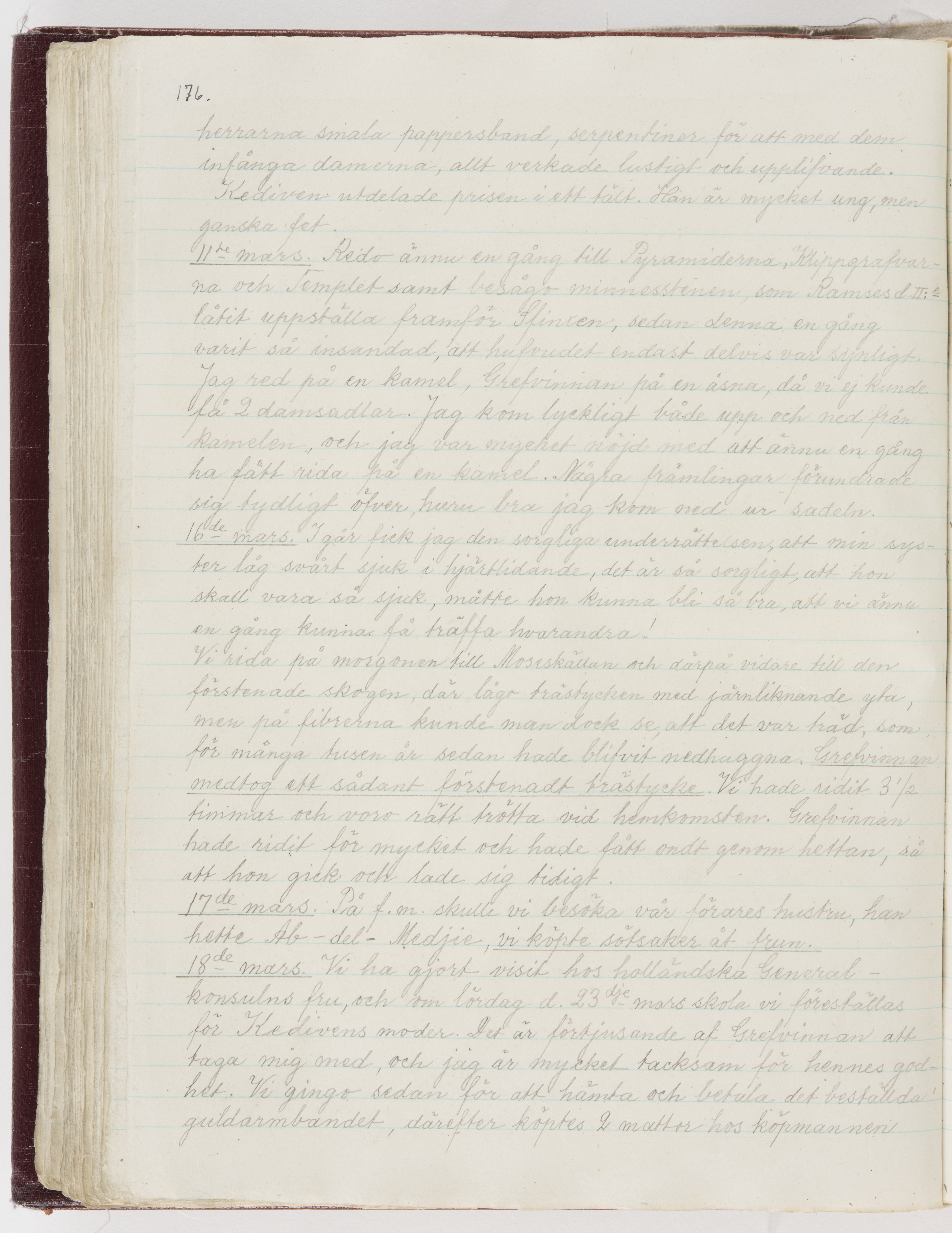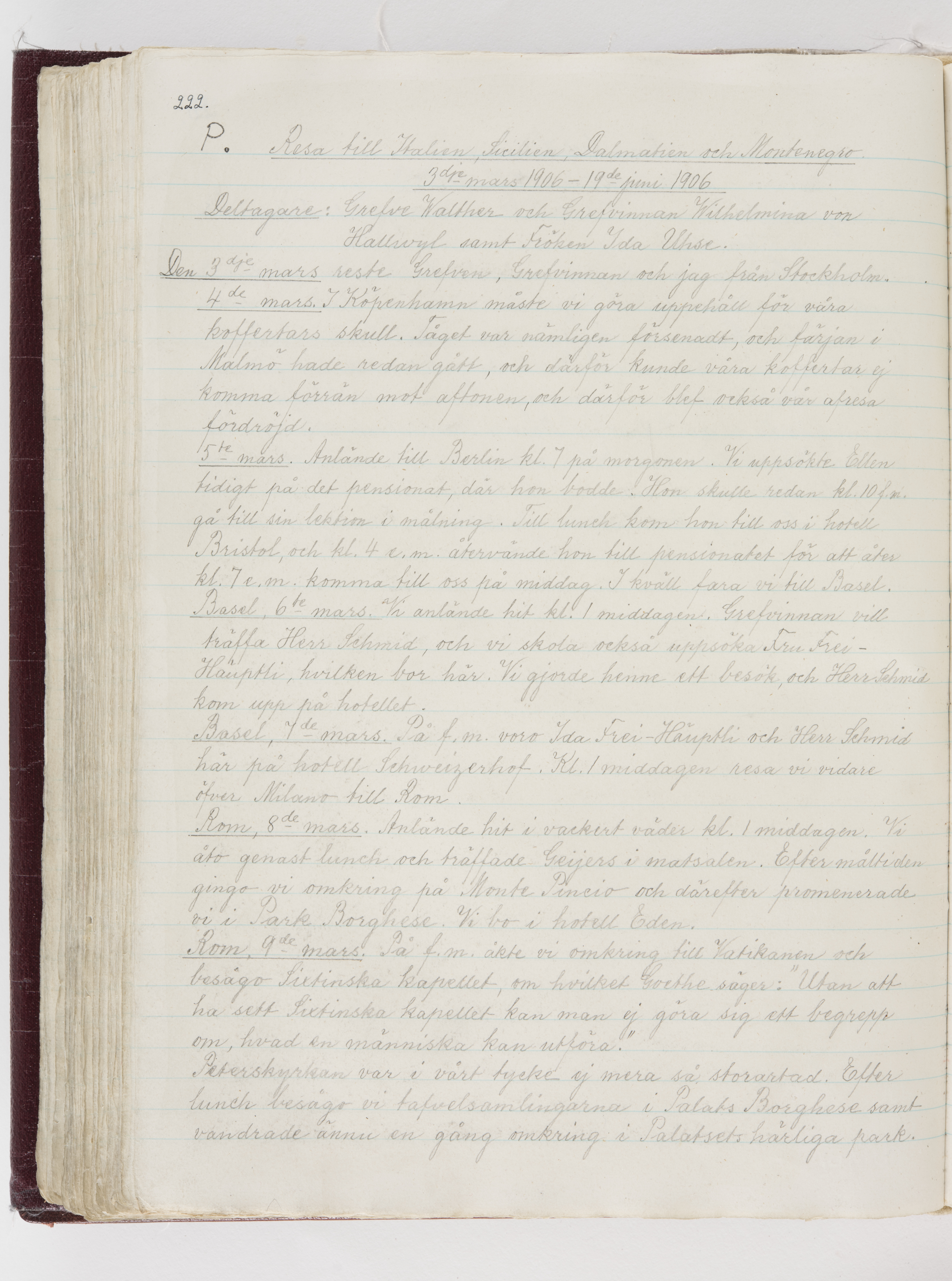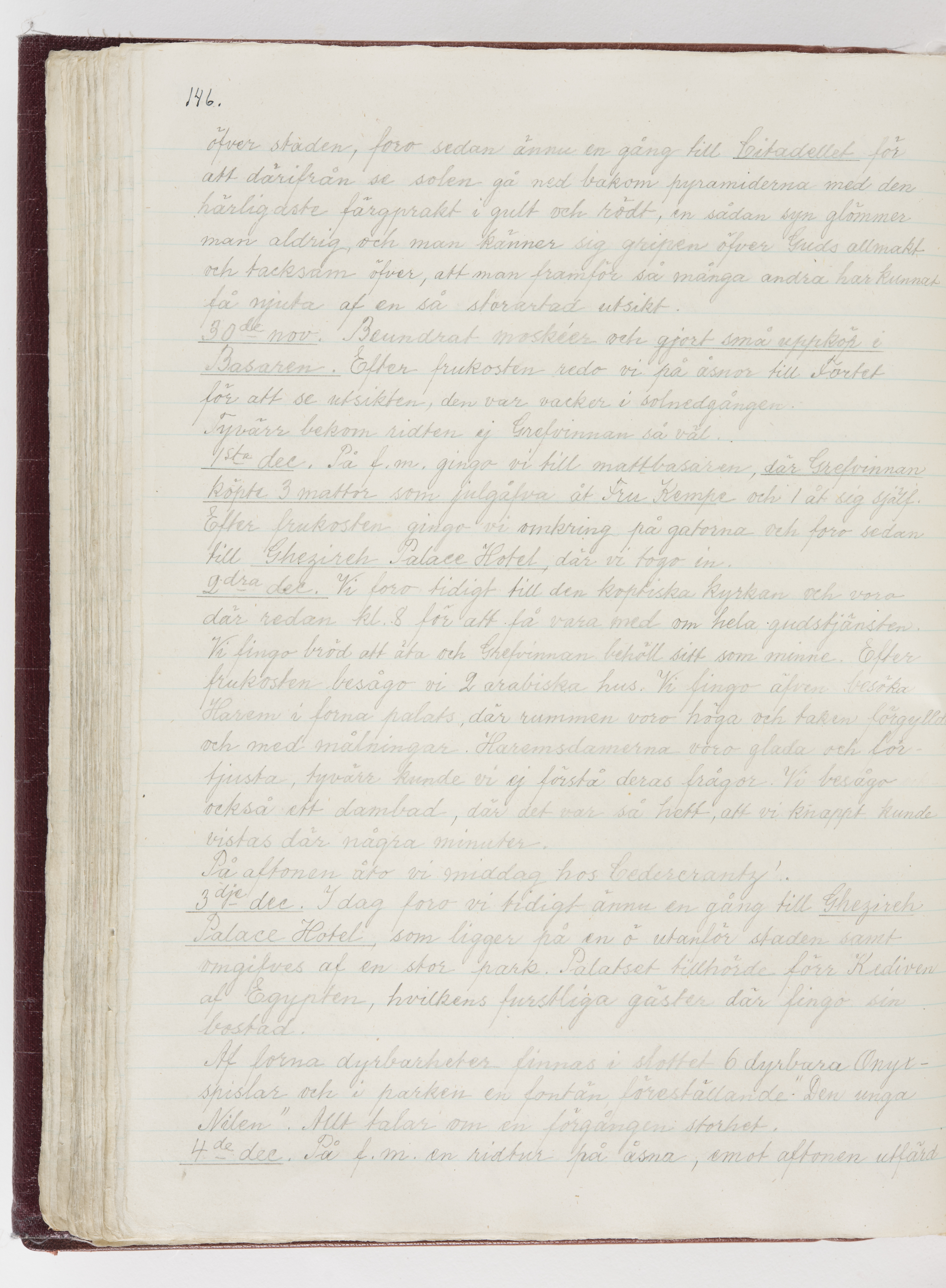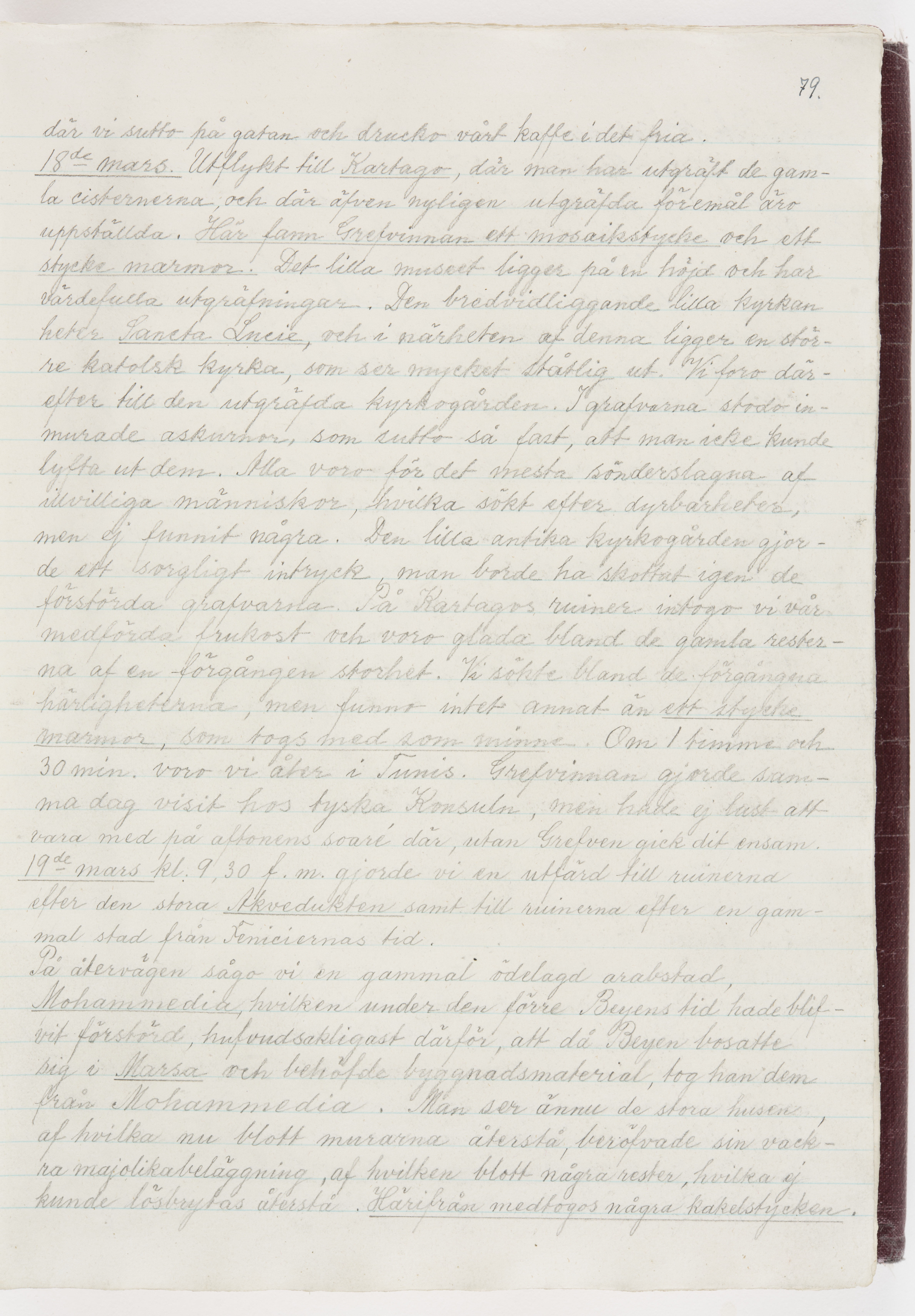 Översättning till svenska språket av dagbok skriven på tyska språket av Ida Uhse under resor tillsammans med Walther och Wilhelmina von Hallwyl åren 1880-1918 samt företeckning över fynd, gåvor och inköpta föremål under resorna åren 1881-1918. Av Signe Berglöf. 309 s. Skrivet med blyerts. Band (helt skinn-). Av brun >>oasis morocco>>, bundet med dubble ansättning och >>knäpprygg>>. Kapitäl av gult sämskskinn. Försättsblad av läderimitationspapper i brunt och svart. Fals av röd klot. 32*25*4,8 cm. Bundet av bokbindaren Otto Olsson.