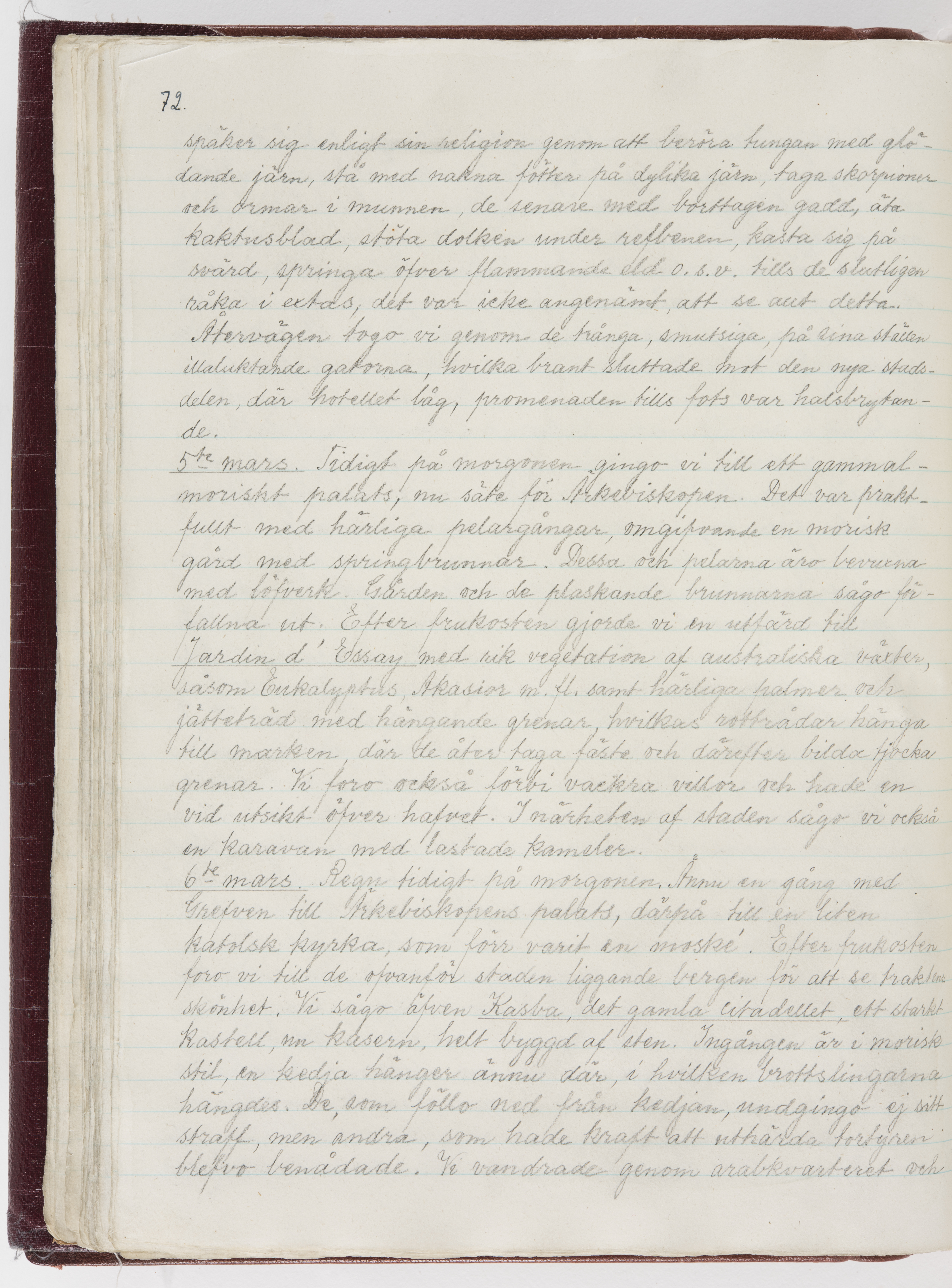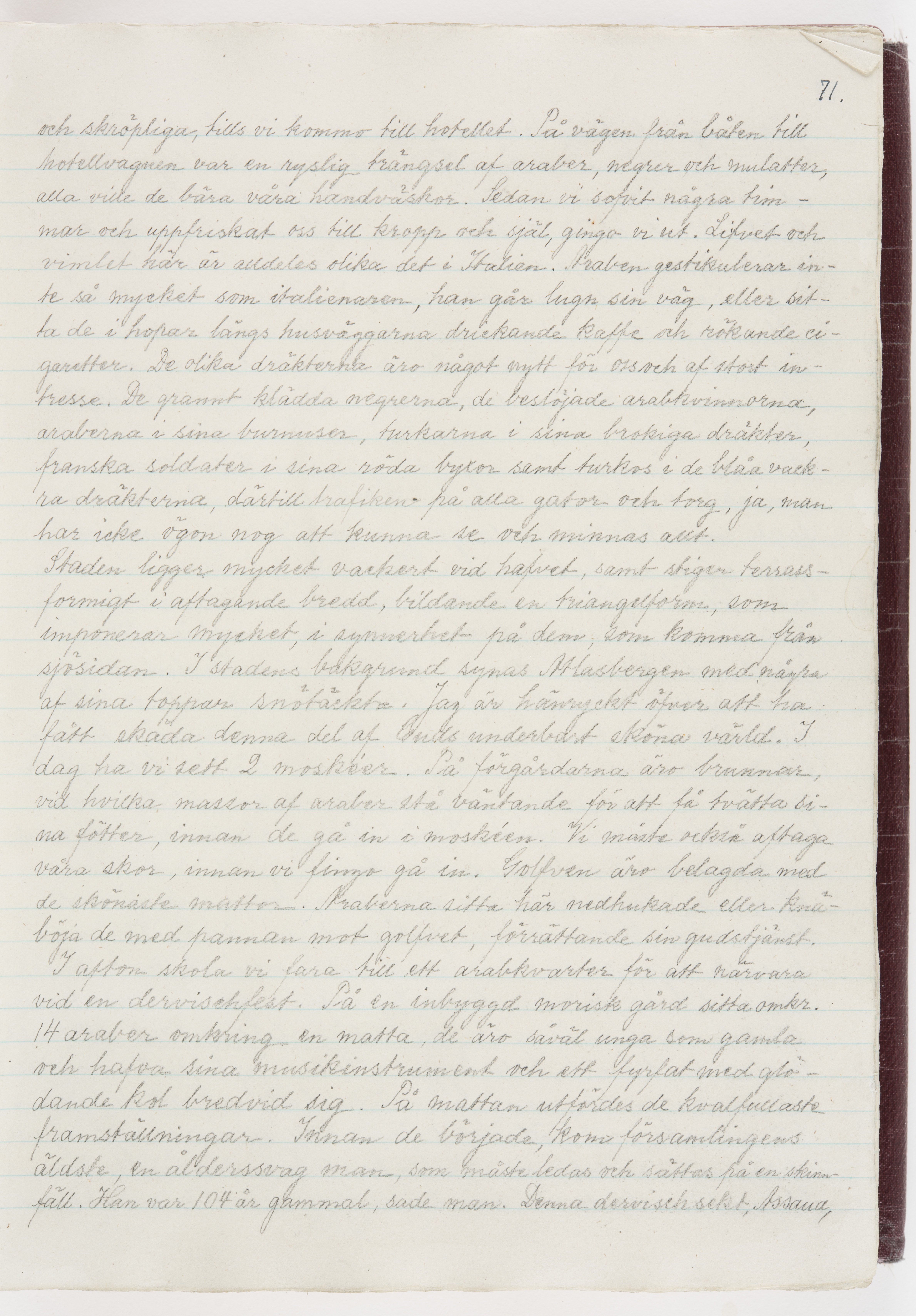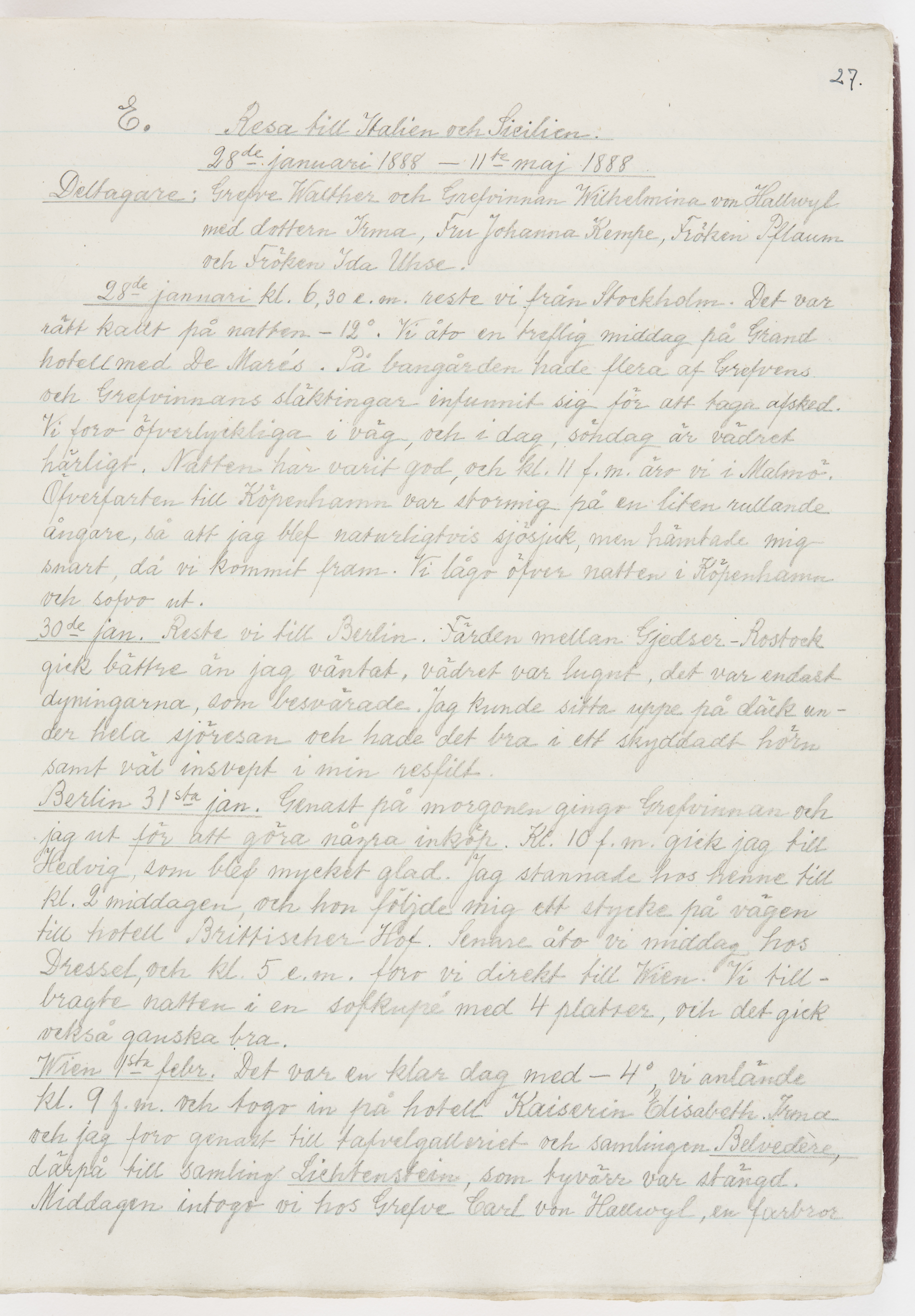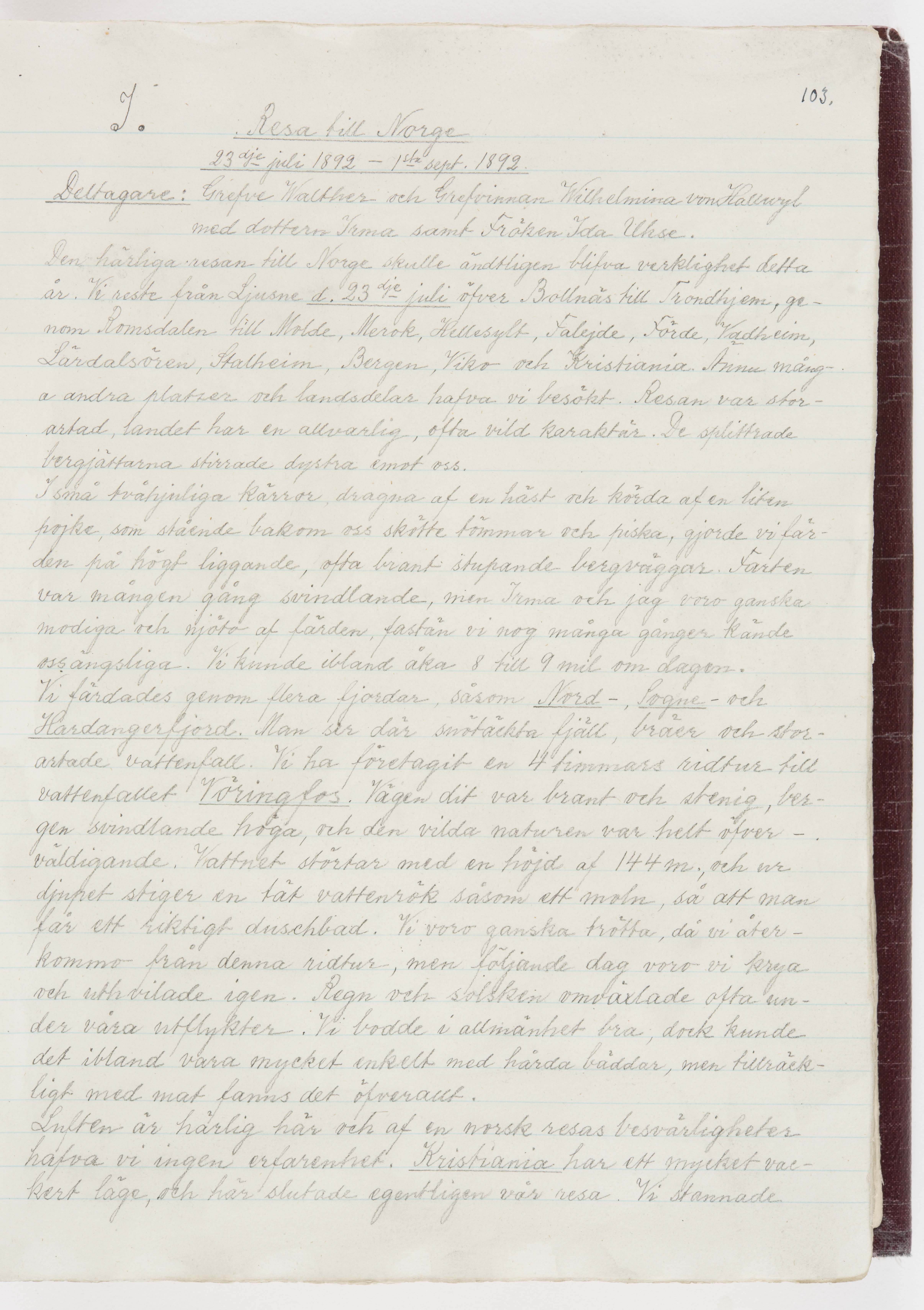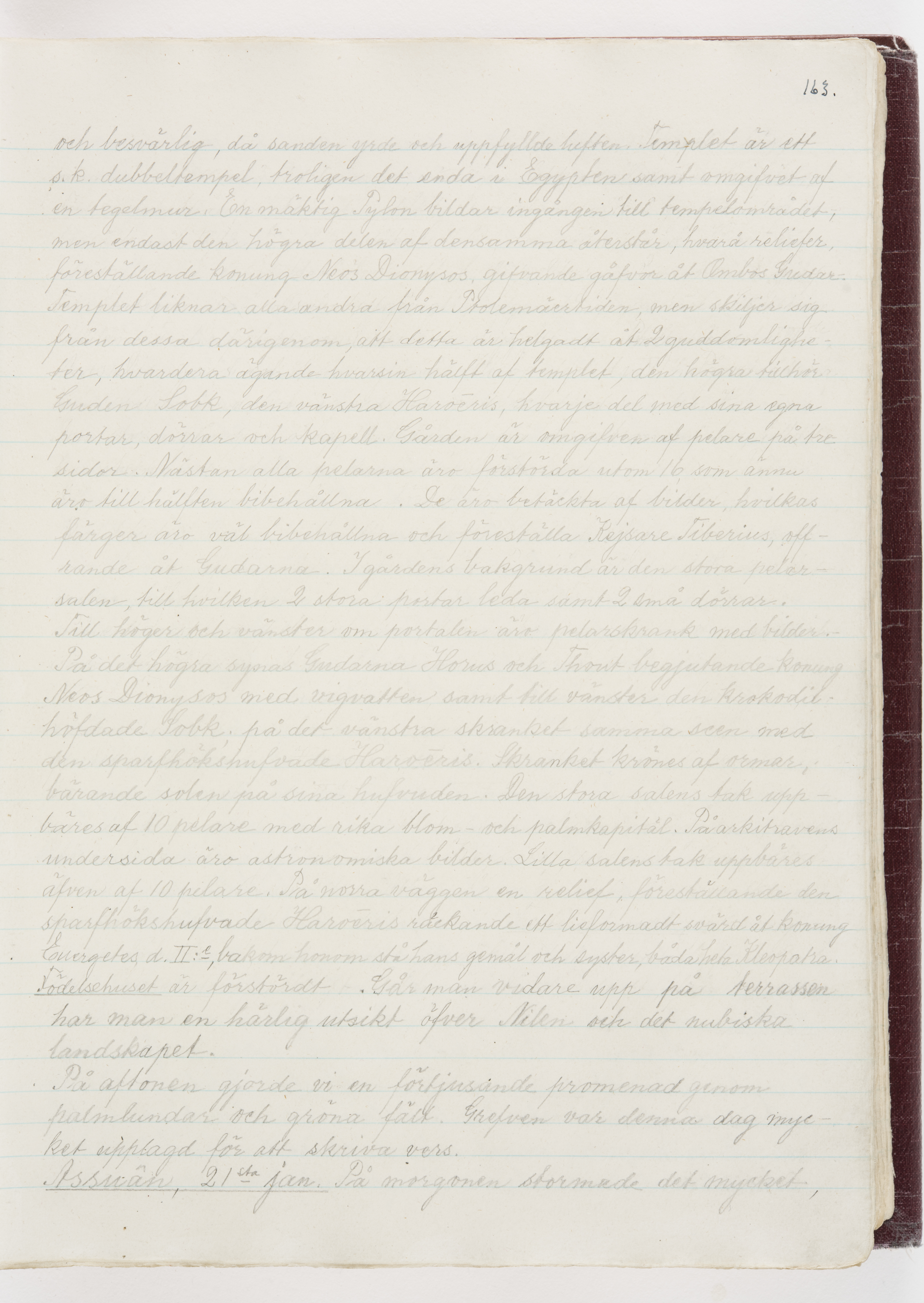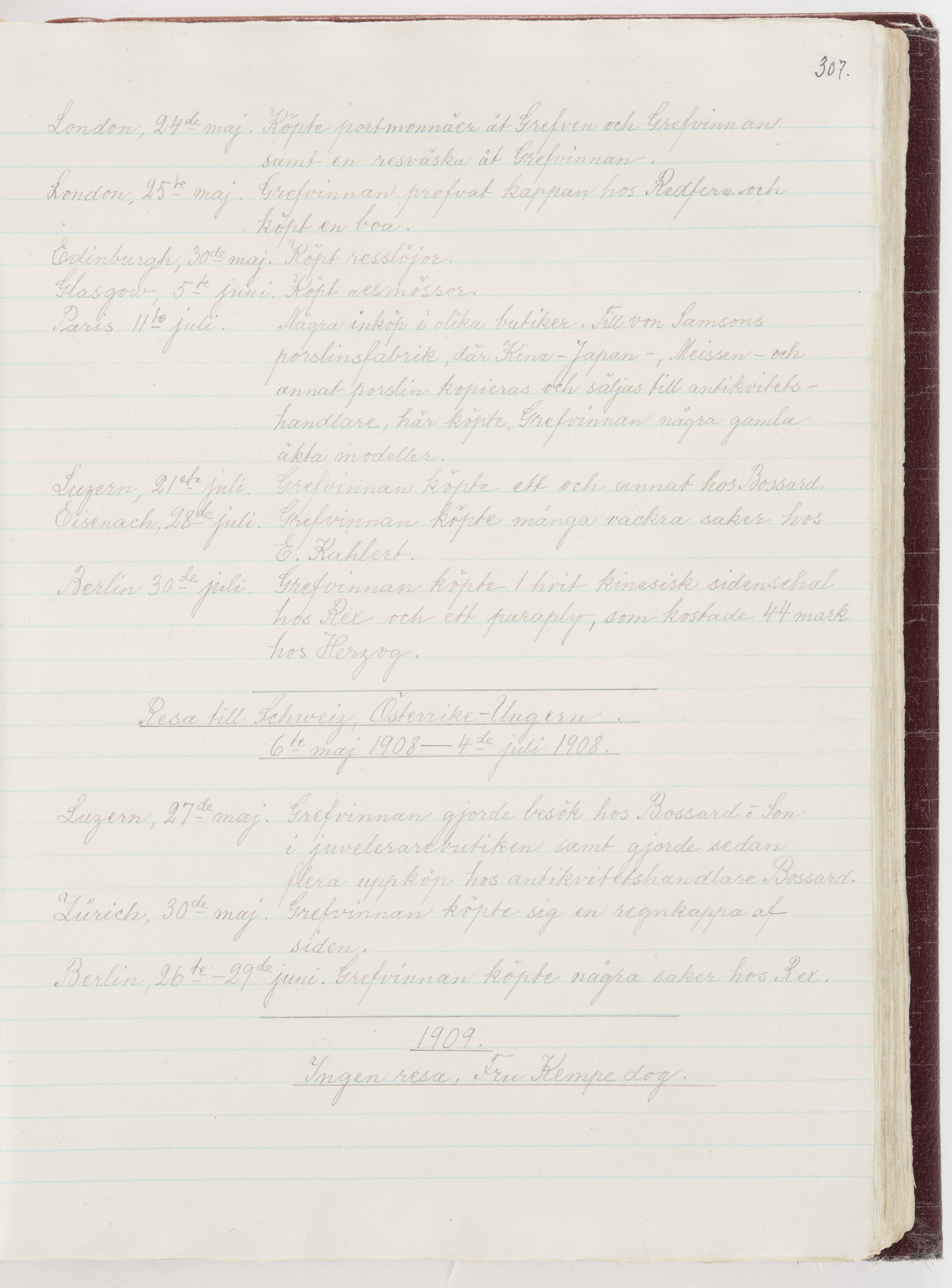 Översättning till svenska språket av dagbok skriven på tyska språket av Ida Uhse under resor tillsammans med Walther och Wilhelmina von Hallwyl åren 1880-1918 samt företeckning över fynd, gåvor och inköpta föremål under resorna åren 1881-1918. Av Signe Berglöf. 309 s. Skrivet med blyerts. Band (helt skinn-). Av brun >>oasis morocco>>, bundet med dubble ansättning och >>knäpprygg>>. Kapitäl av gult sämskskinn. Försättsblad av läderimitationspapper i brunt och svart. Fals av röd klot. 32*25*4,8 cm. Bundet av bokbindaren Otto Olsson.