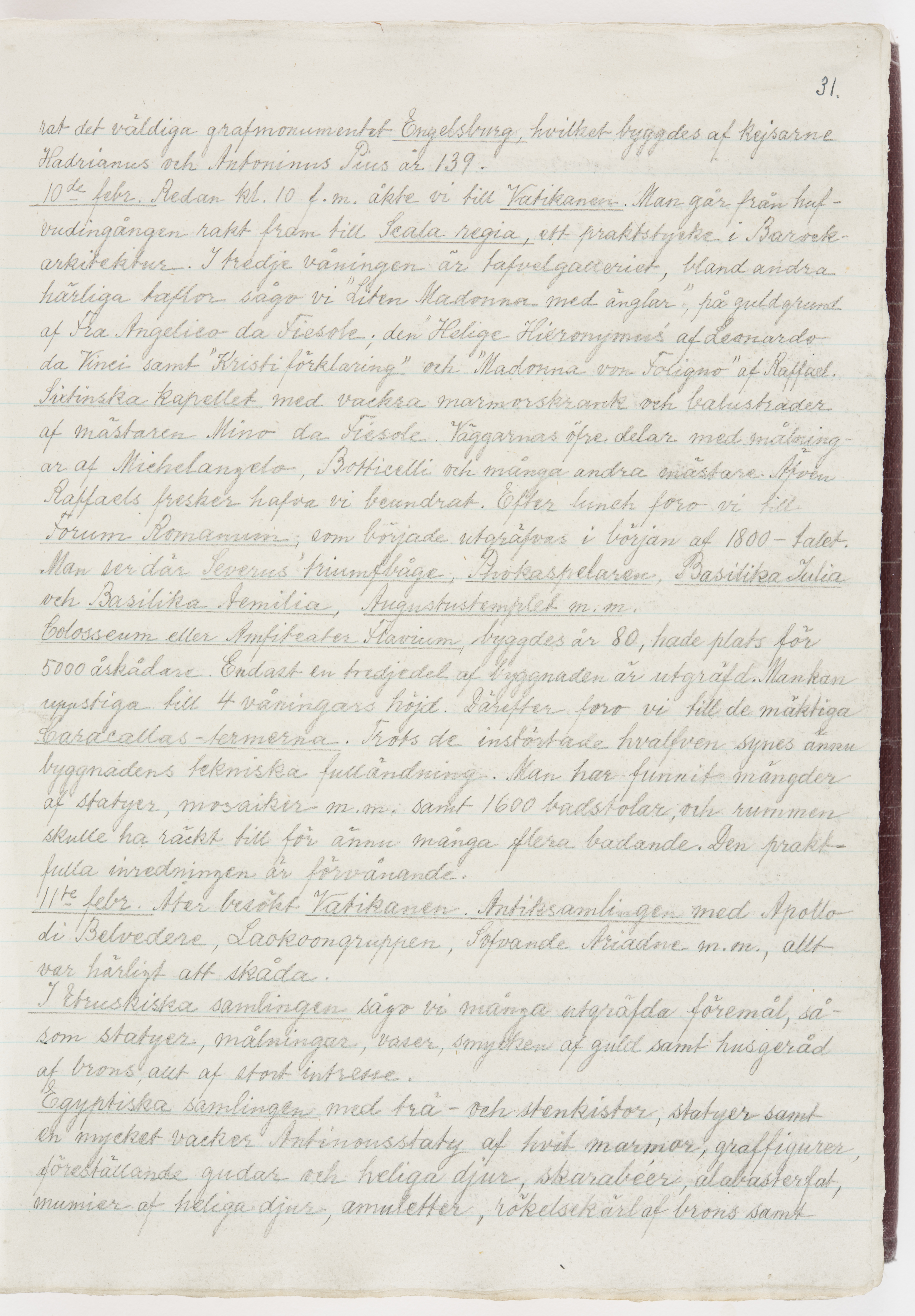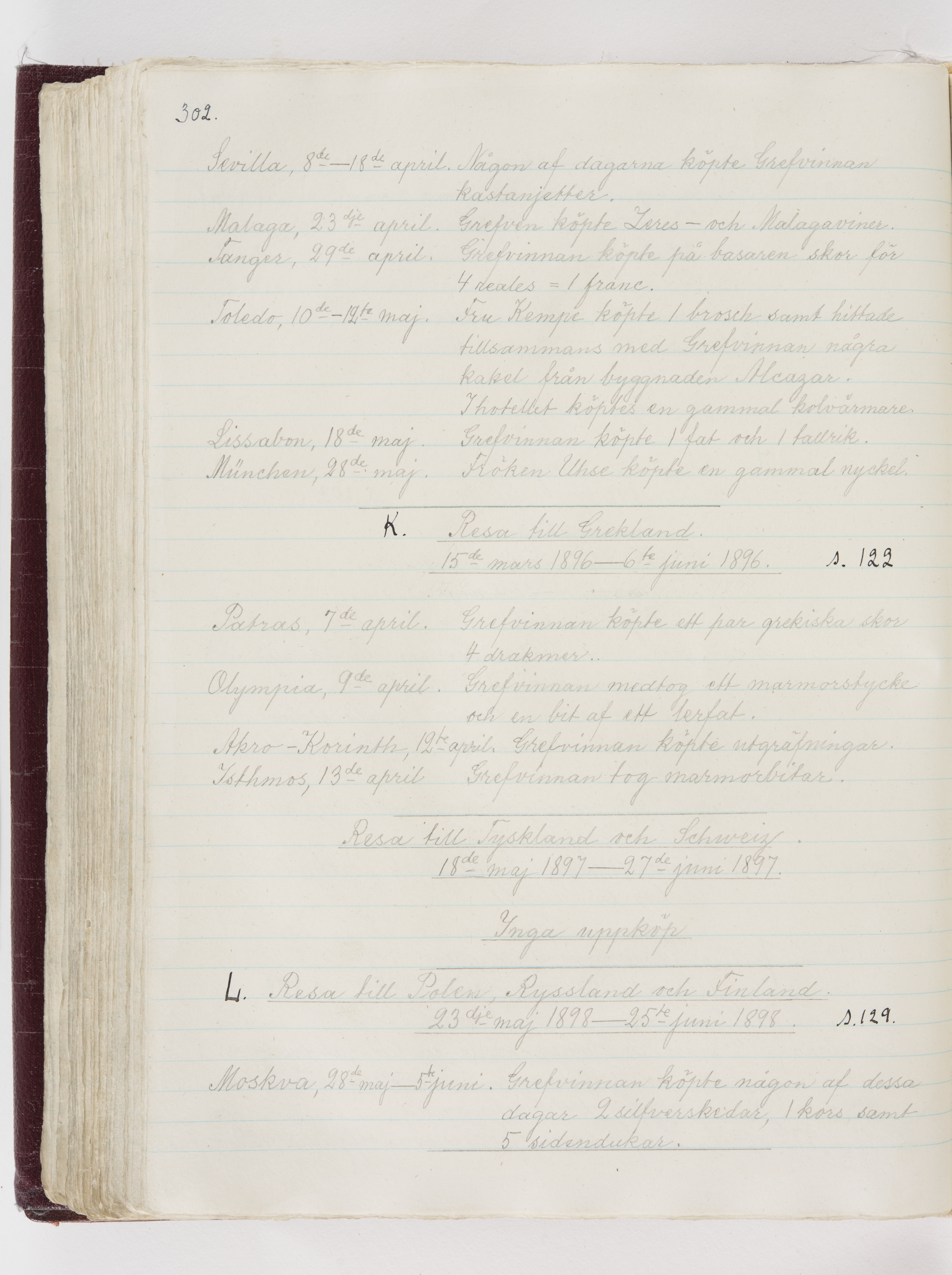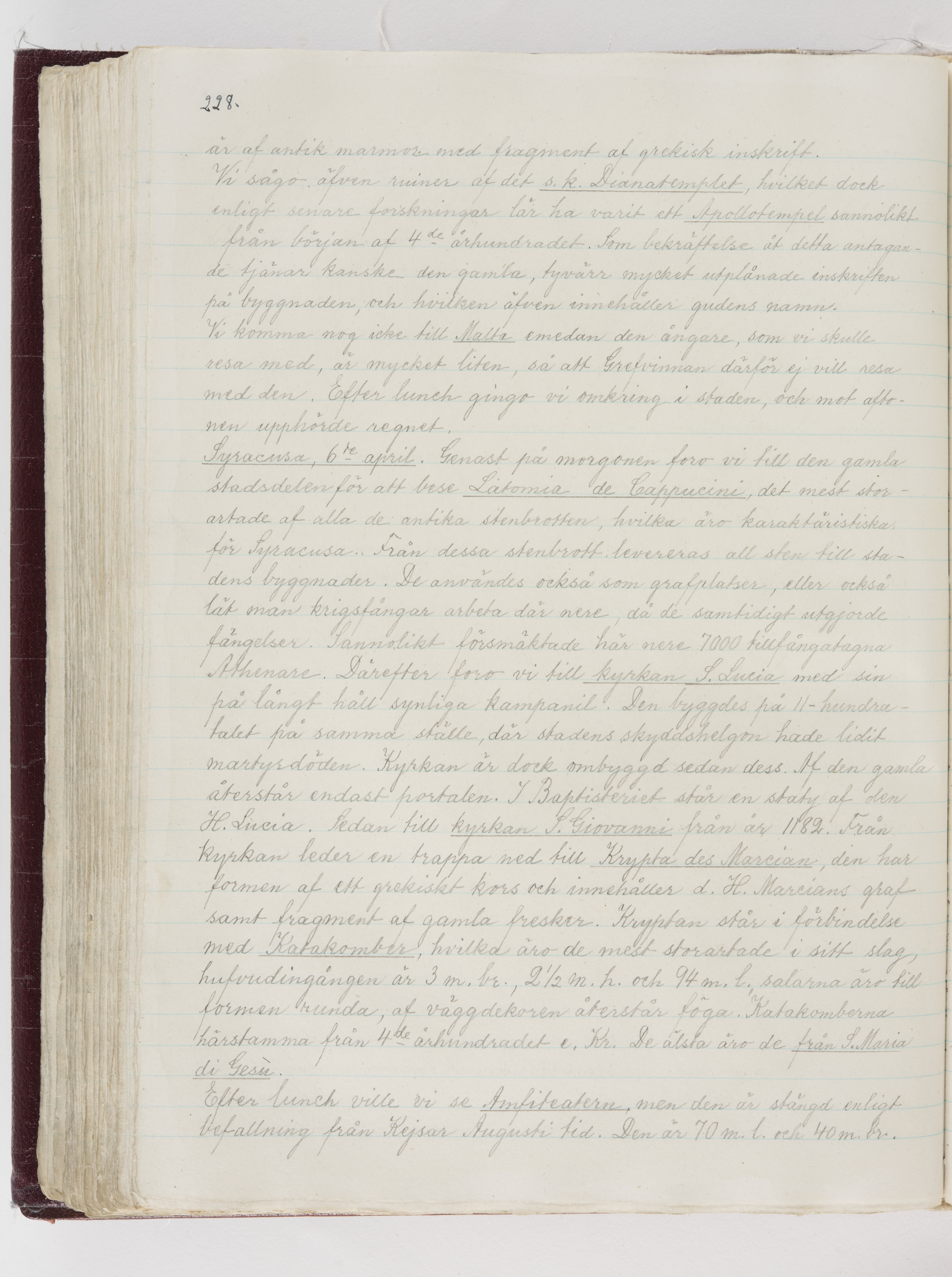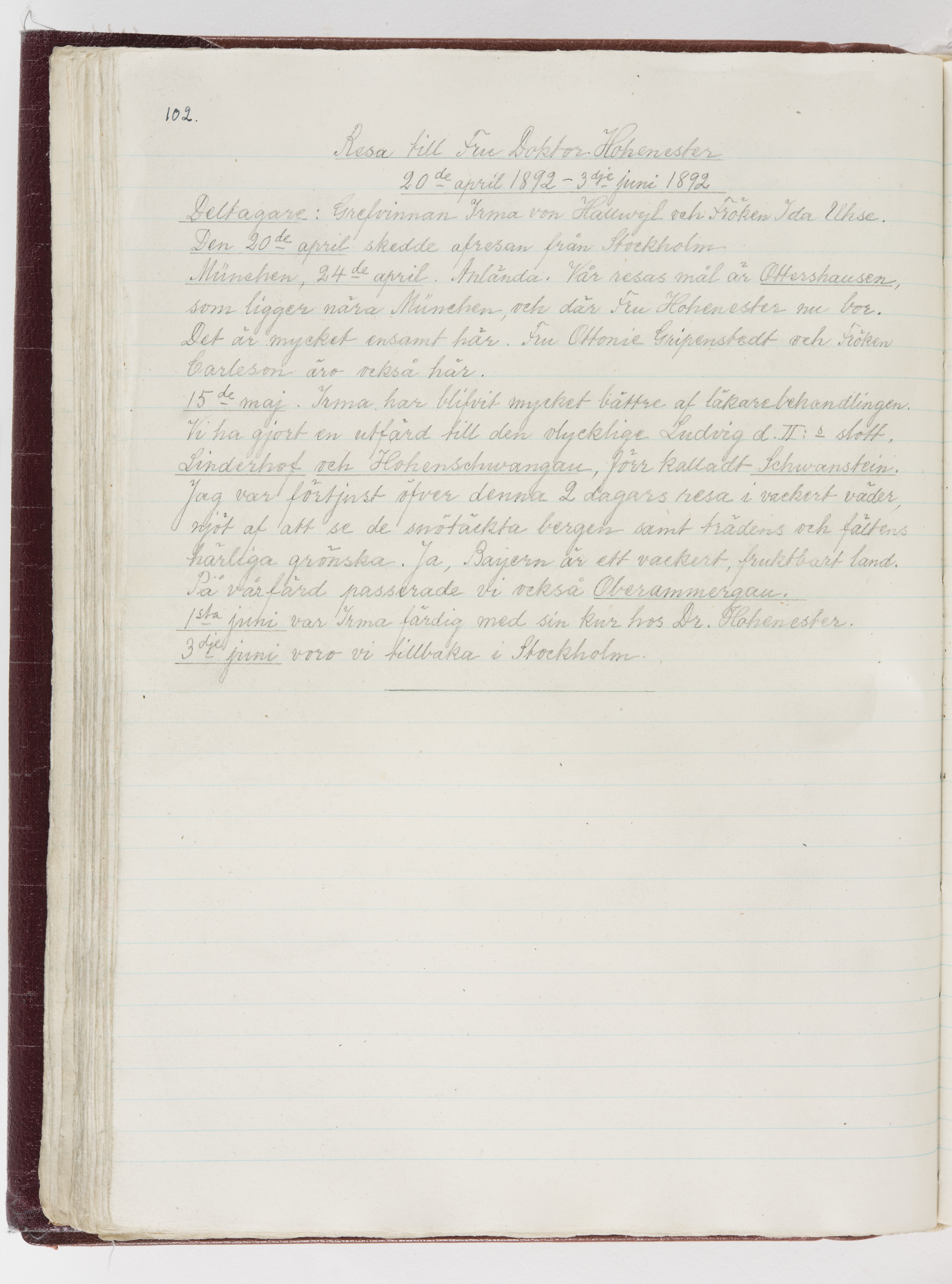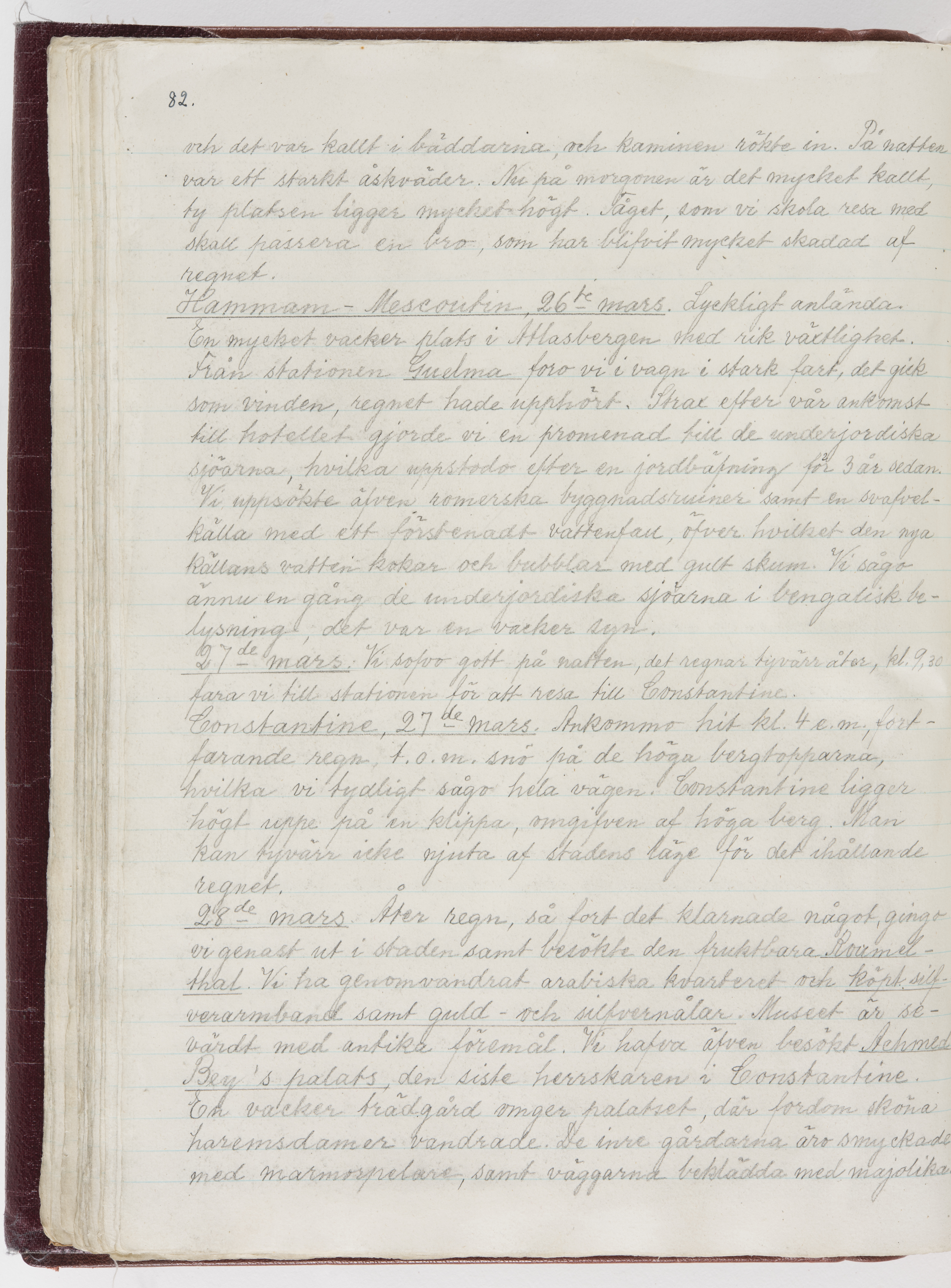 Översättning till svenska språket av dagbok skriven på tyska språket av Ida Uhse under resor tillsammans med Walther och Wilhelmina von Hallwyl åren 1880-1918 samt företeckning över fynd, gåvor och inköpta föremål under resorna åren 1881-1918. Av Signe Berglöf. 309 s. Skrivet med blyerts. Band (helt skinn-). Av brun >>oasis morocco>>, bundet med dubble ansättning och >>knäpprygg>>. Kapitäl av gult sämskskinn. Försättsblad av läderimitationspapper i brunt och svart. Fals av röd klot. 32*25*4,8 cm. Bundet av bokbindaren Otto Olsson.