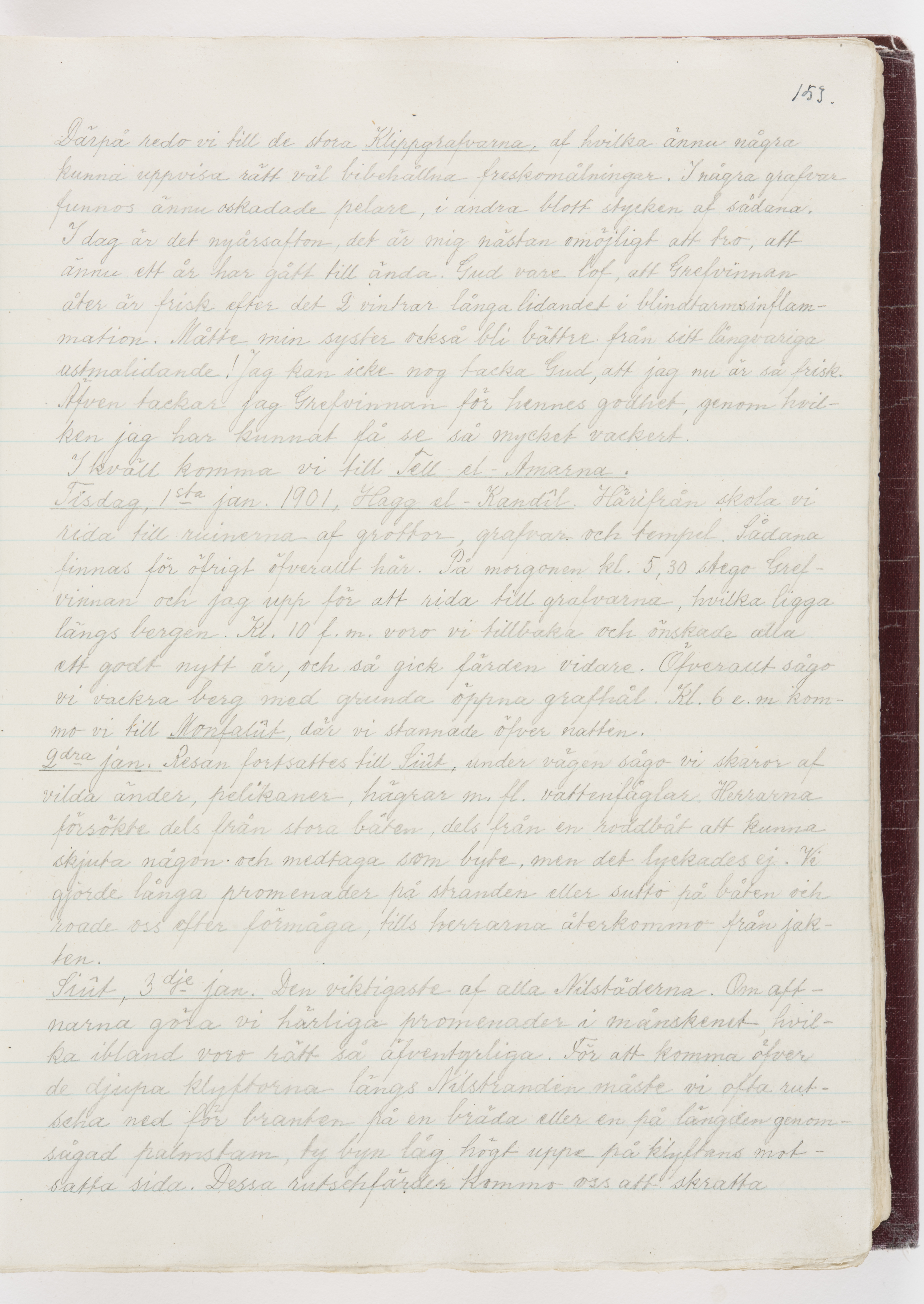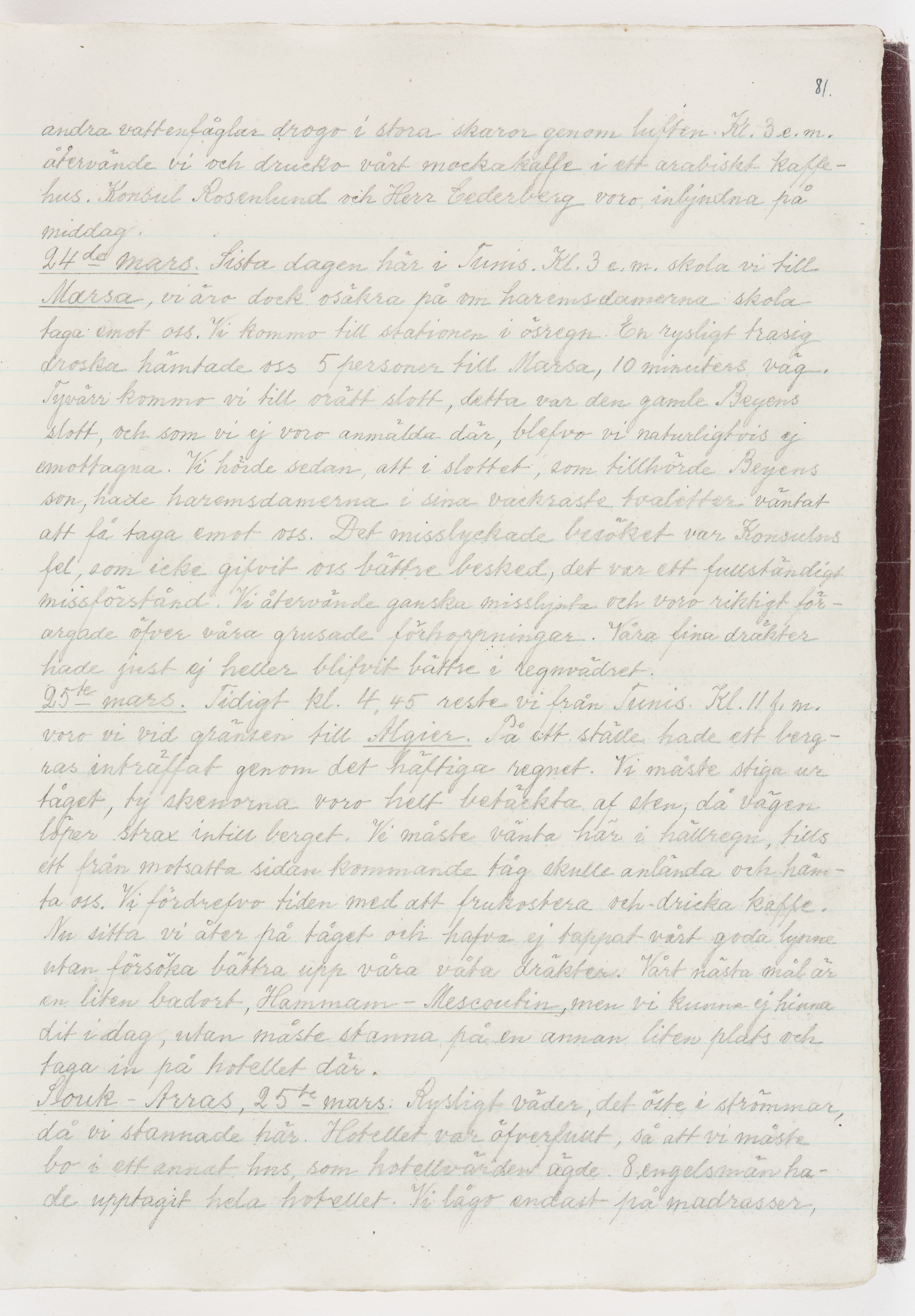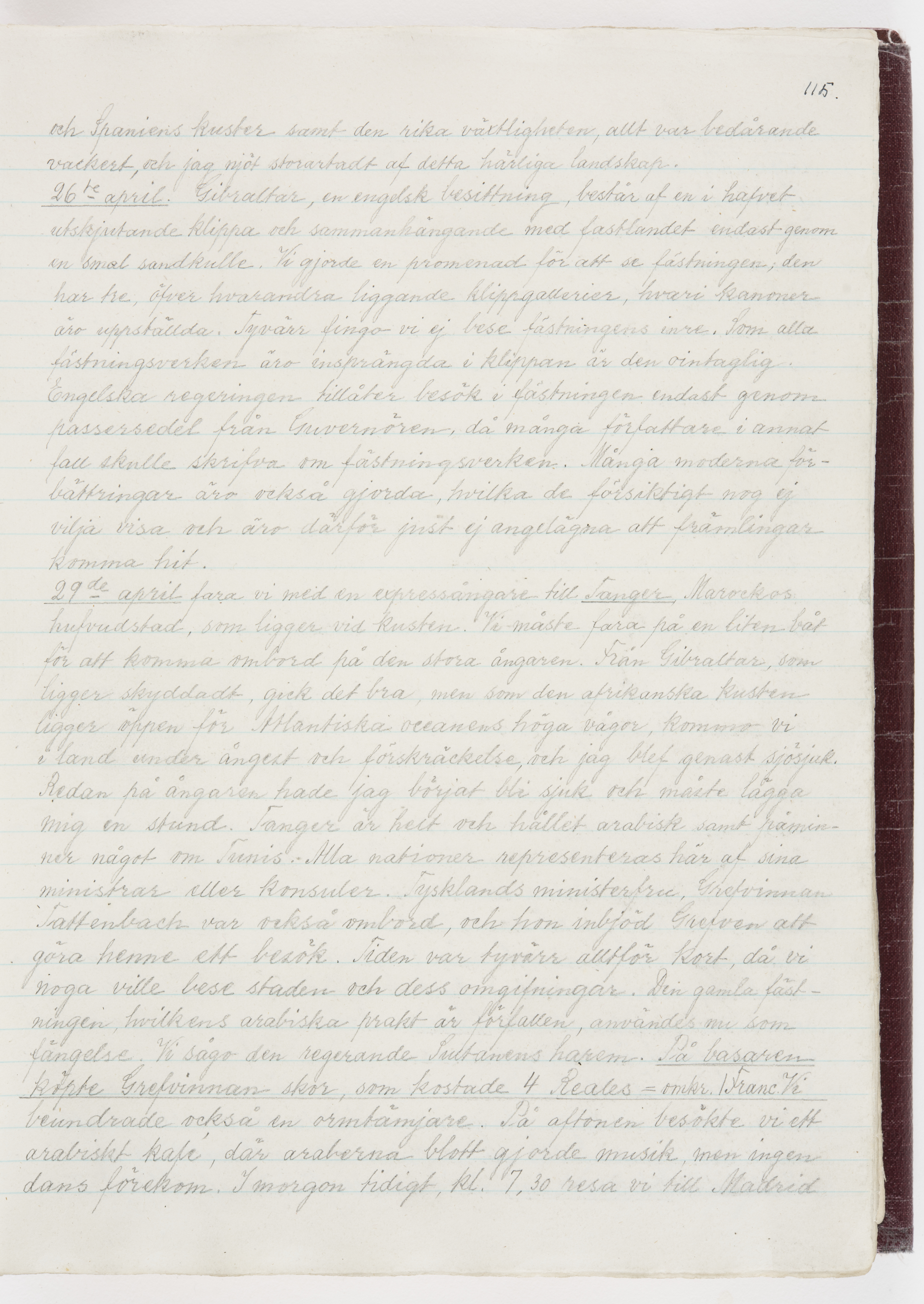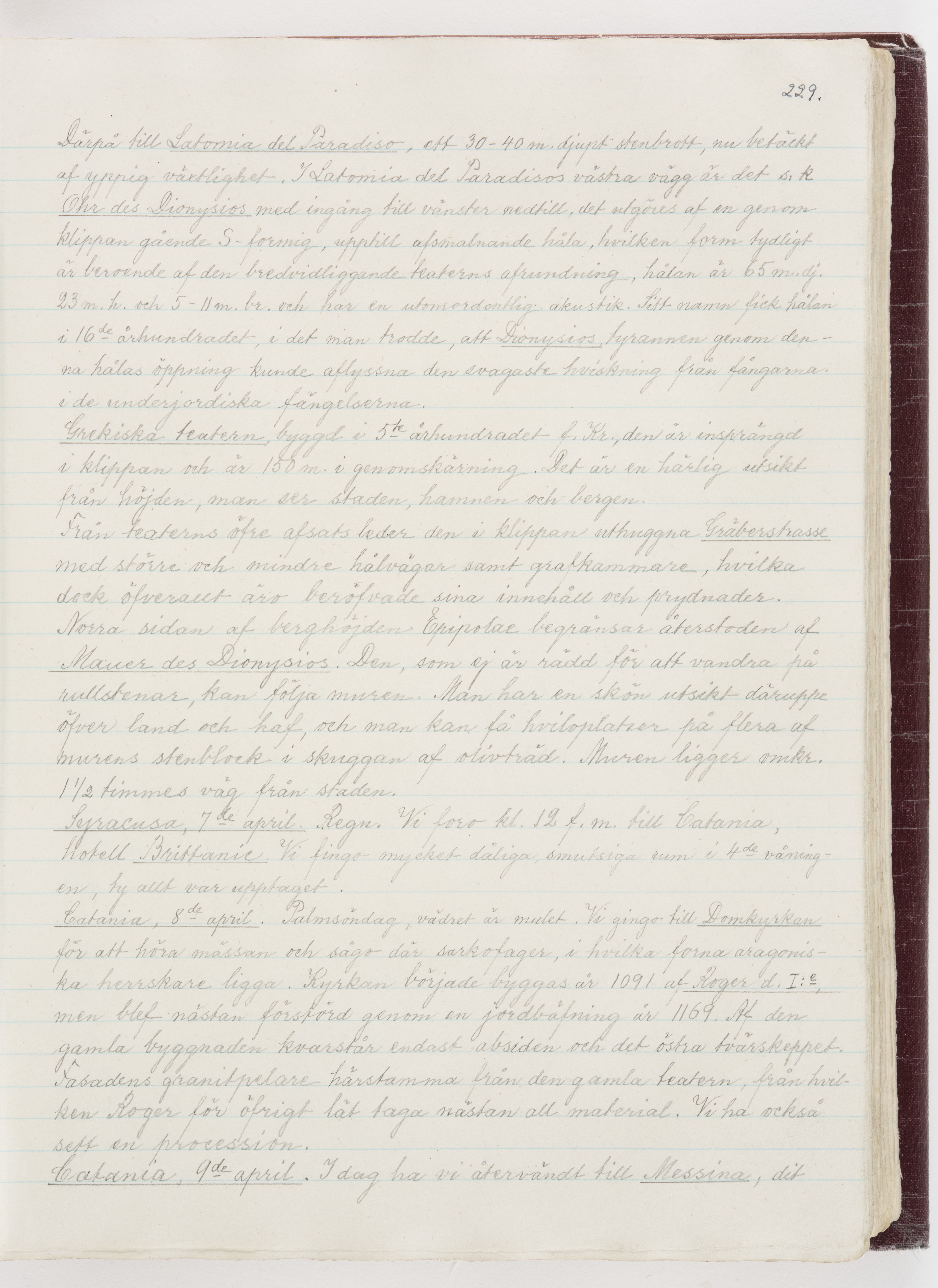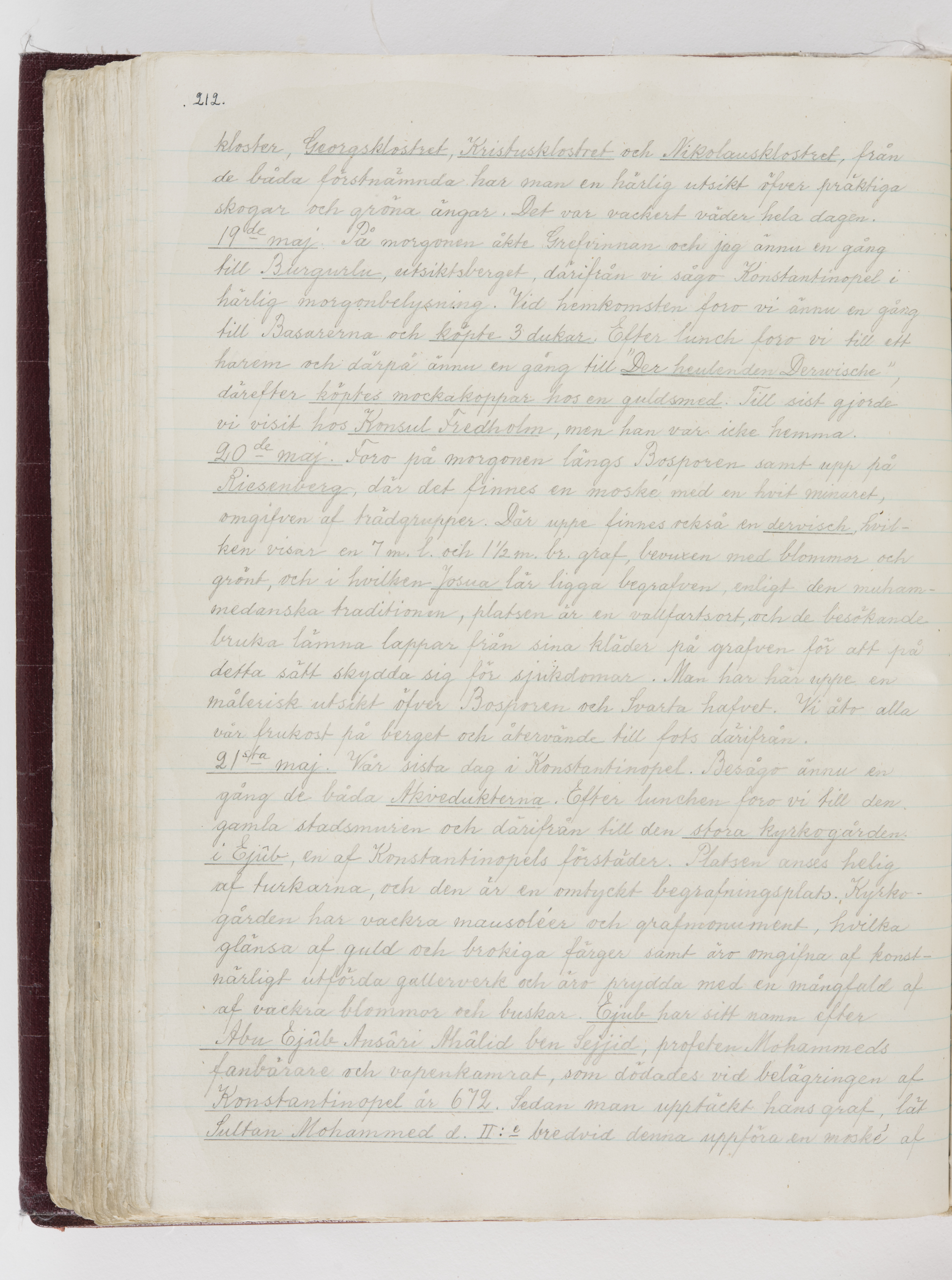 Översättning till svenska språket av dagbok skriven på tyska språket av Ida Uhse under resor tillsammans med Walther och Wilhelmina von Hallwyl åren 1880-1918 samt företeckning över fynd, gåvor och inköpta föremål under resorna åren 1881-1918. Av Signe Berglöf. 309 s. Skrivet med blyerts. Band (helt skinn-). Av brun >>oasis morocco>>, bundet med dubble ansättning och >>knäpprygg>>. Kapitäl av gult sämskskinn. Försättsblad av läderimitationspapper i brunt och svart. Fals av röd klot. 32*25*4,8 cm. Bundet av bokbindaren Otto Olsson.