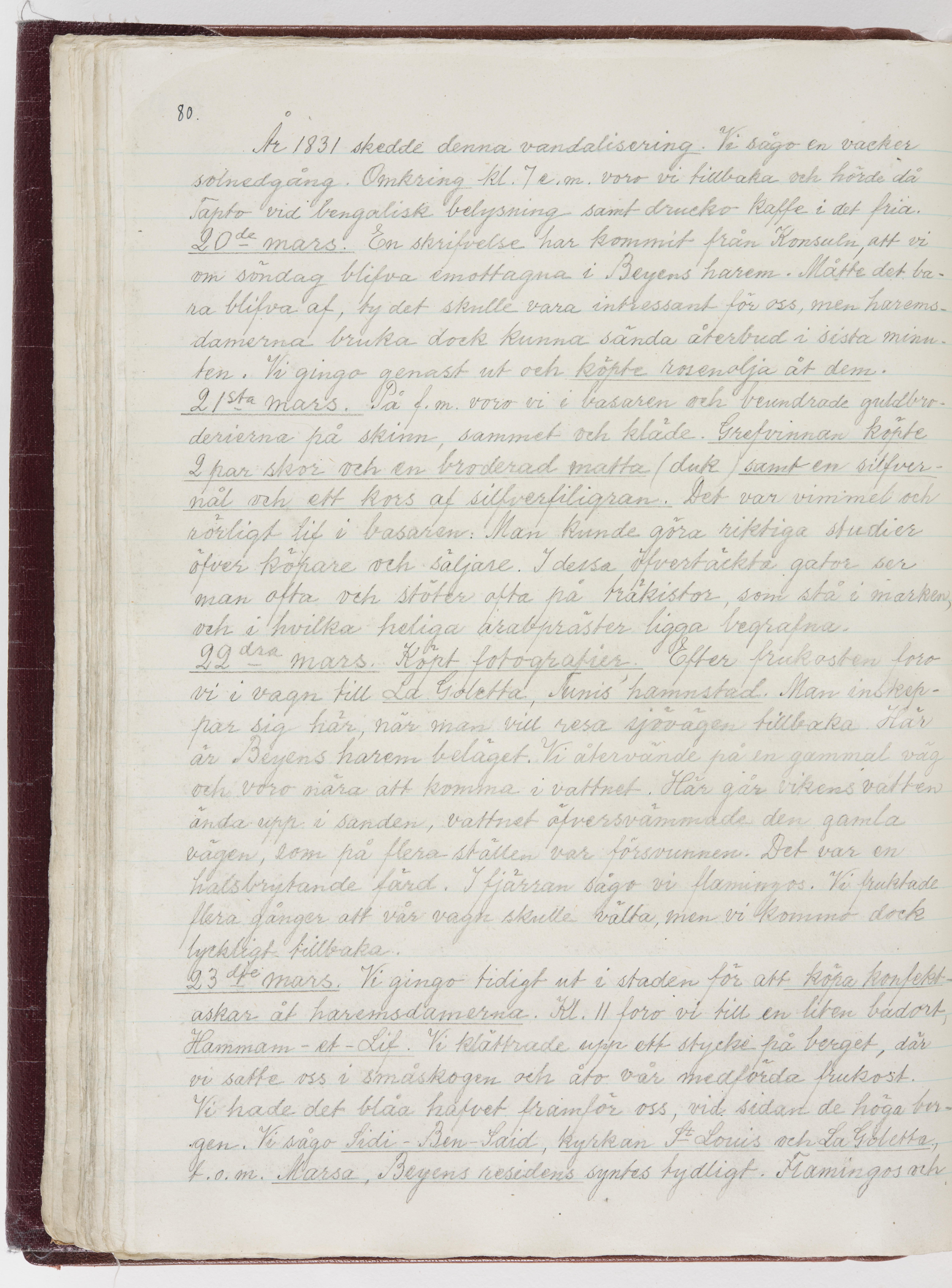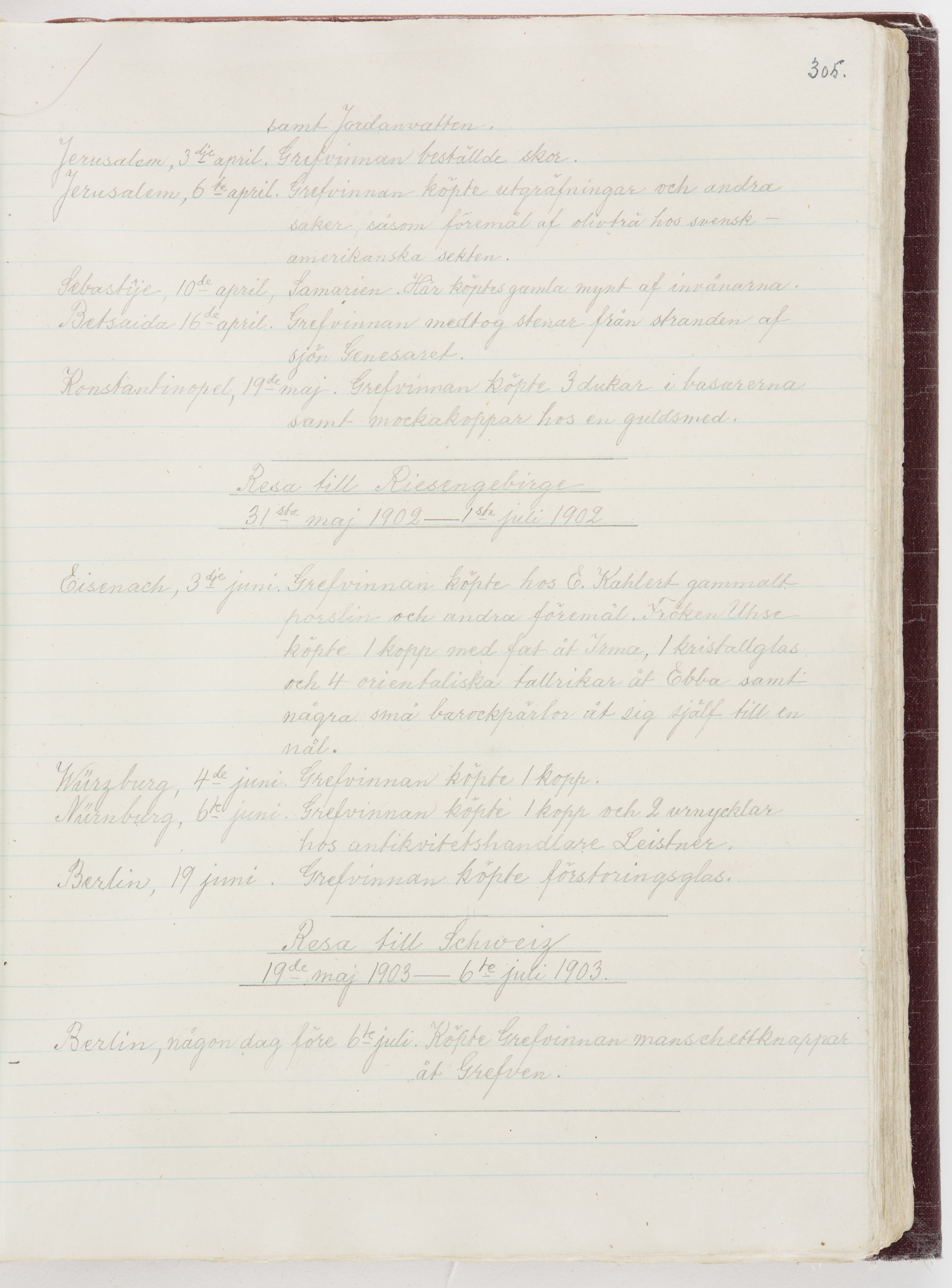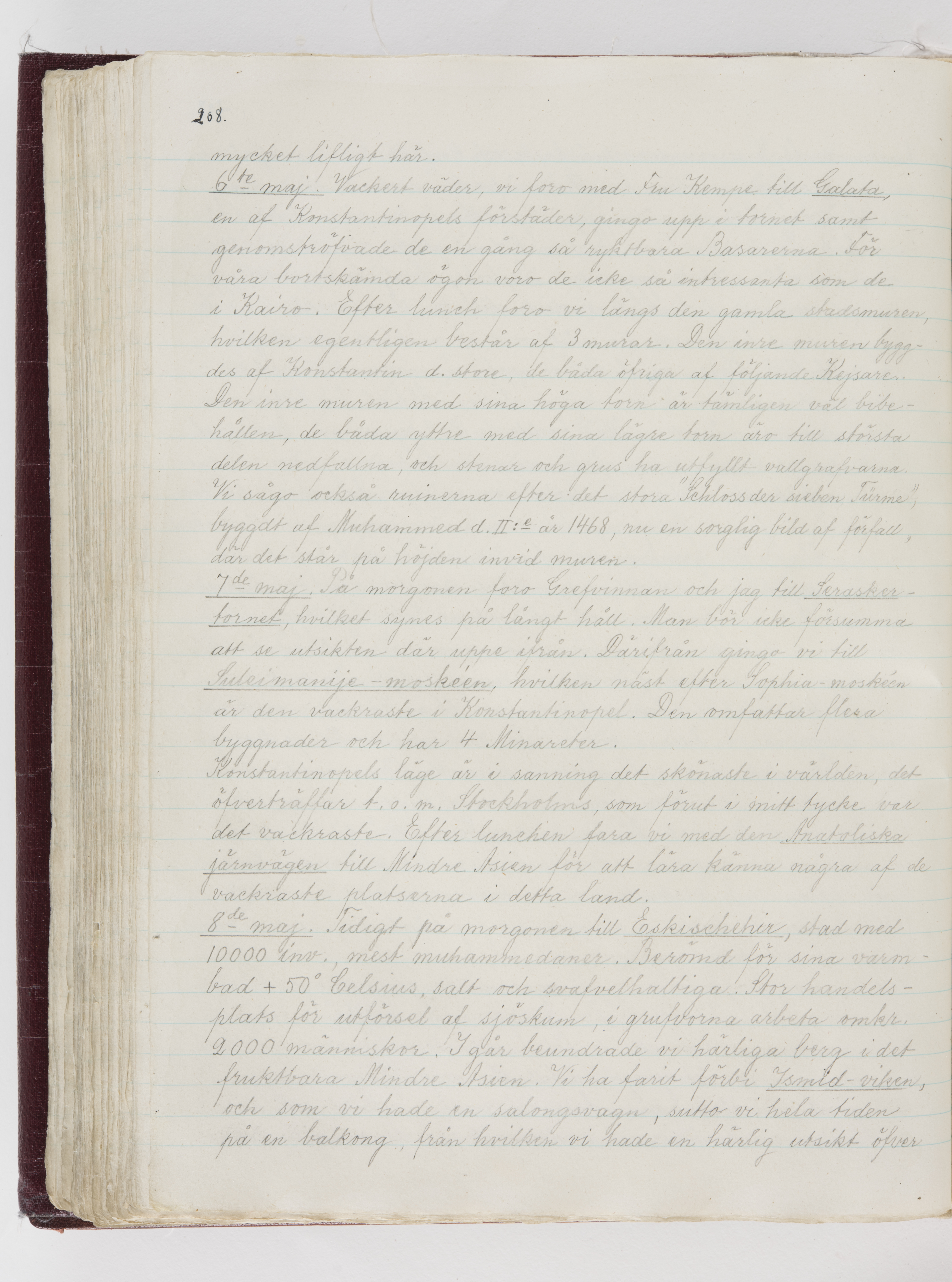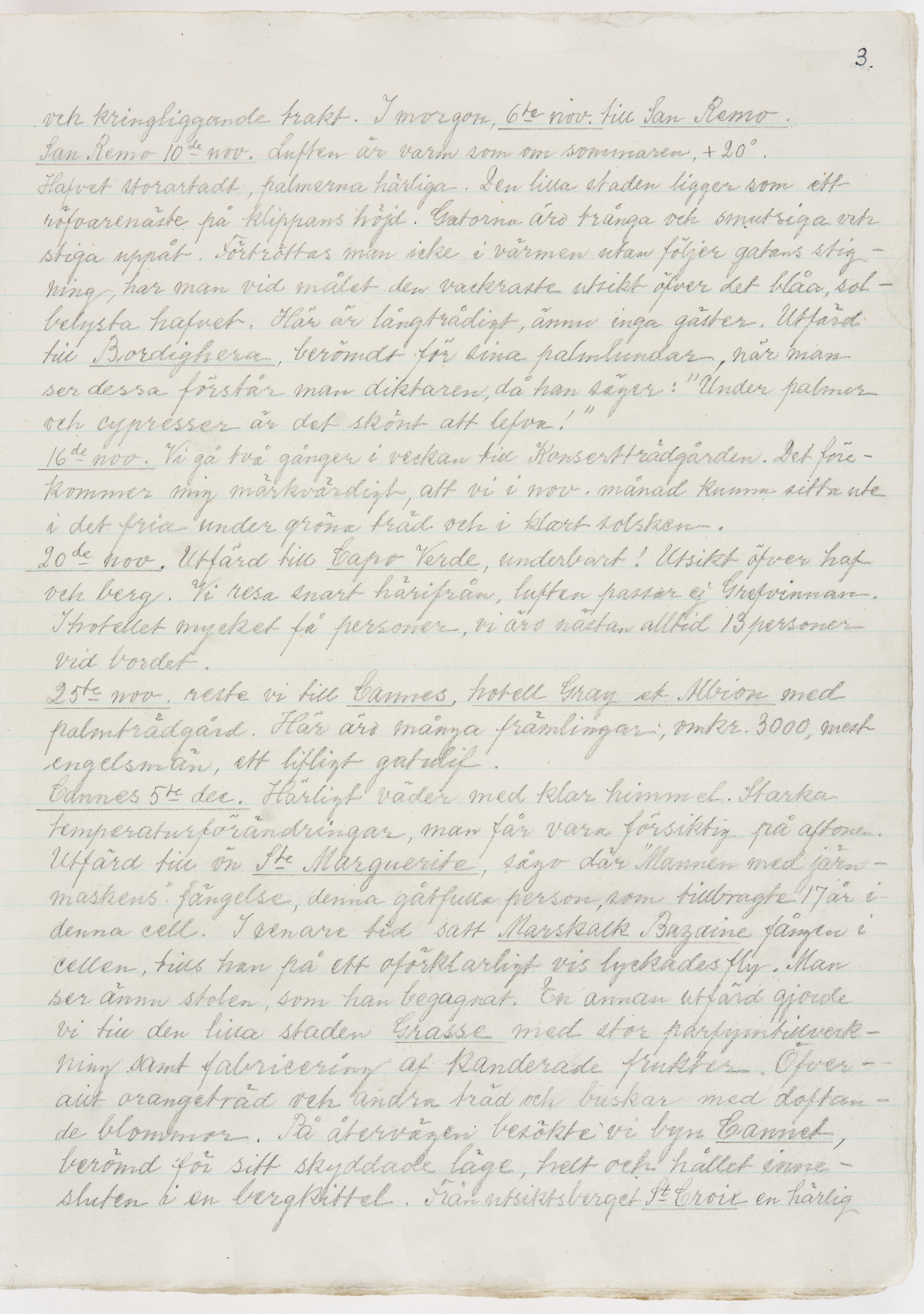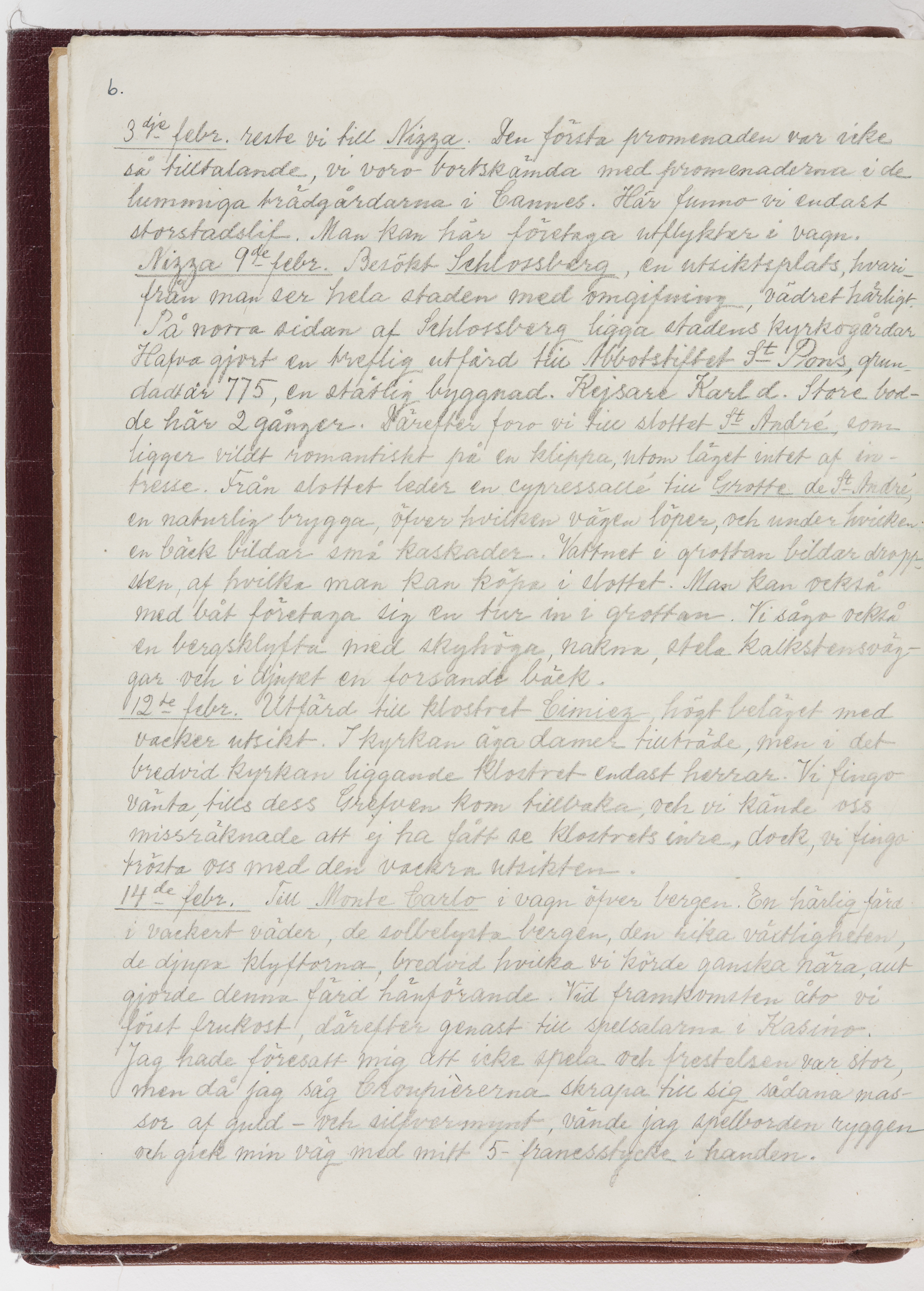 Översättning till svenska språket av dagbok skriven på tyska språket av Ida Uhse under resor tillsammans med Walther och Wilhelmina von Hallwyl åren 1880-1918 samt företeckning över fynd, gåvor och inköpta föremål under resorna åren 1881-1918. Av Signe Berglöf. 309 s. Skrivet med blyerts. Band (helt skinn-). Av brun >>oasis morocco>>, bundet med dubble ansättning och >>knäpprygg>>. Kapitäl av gult sämskskinn. Försättsblad av läderimitationspapper i brunt och svart. Fals av röd klot. 32*25*4,8 cm. Bundet av bokbindaren Otto Olsson.