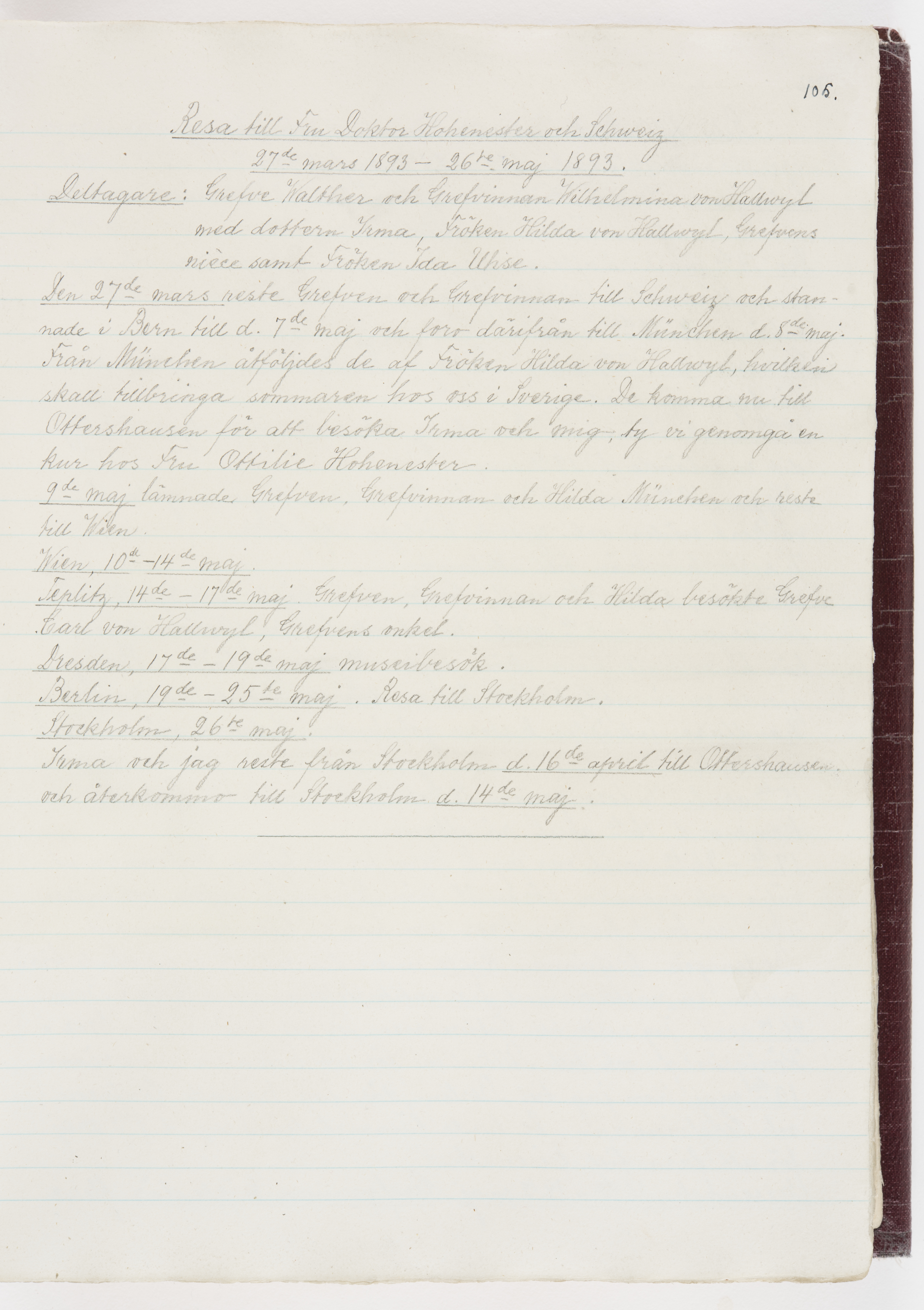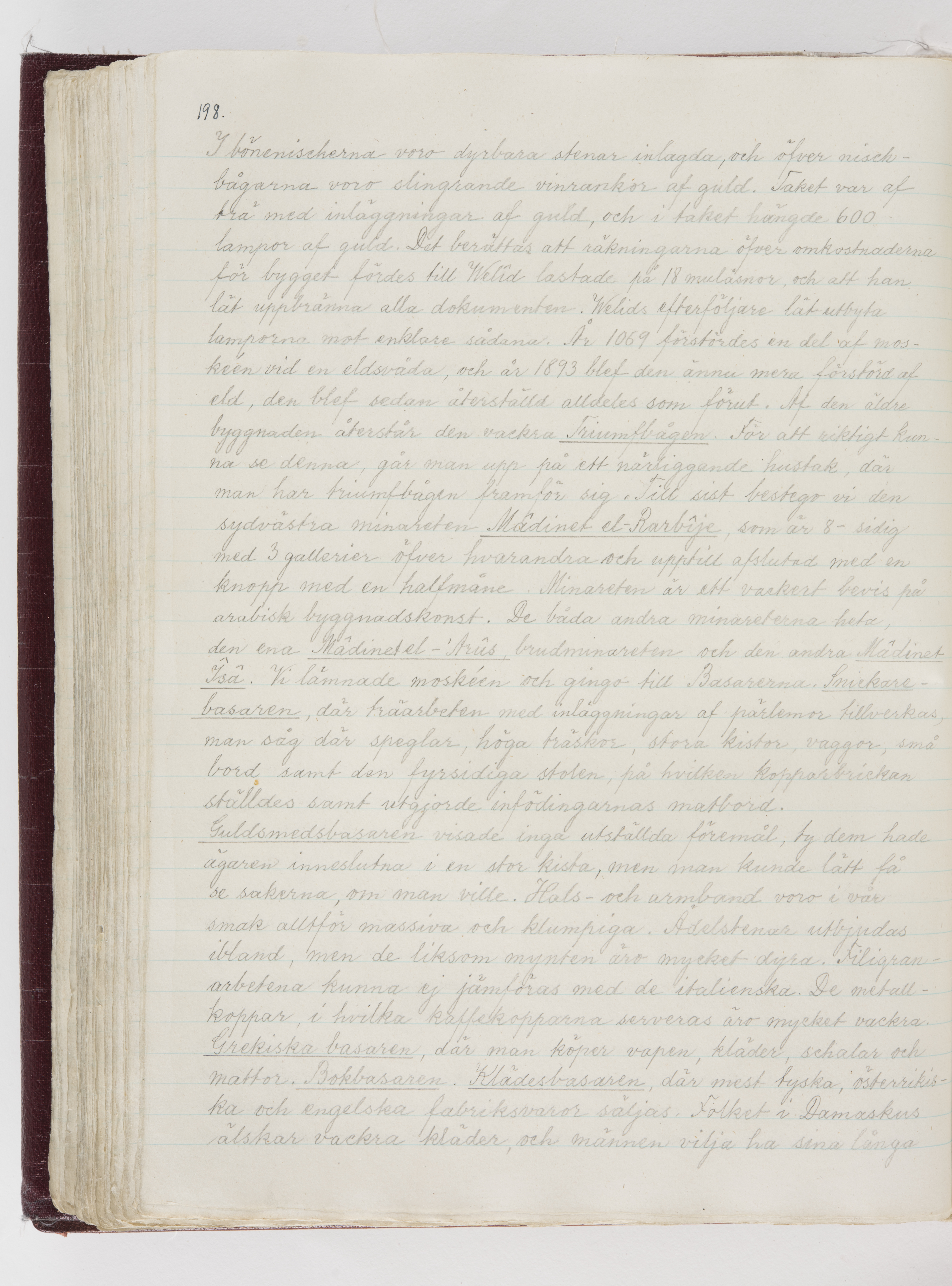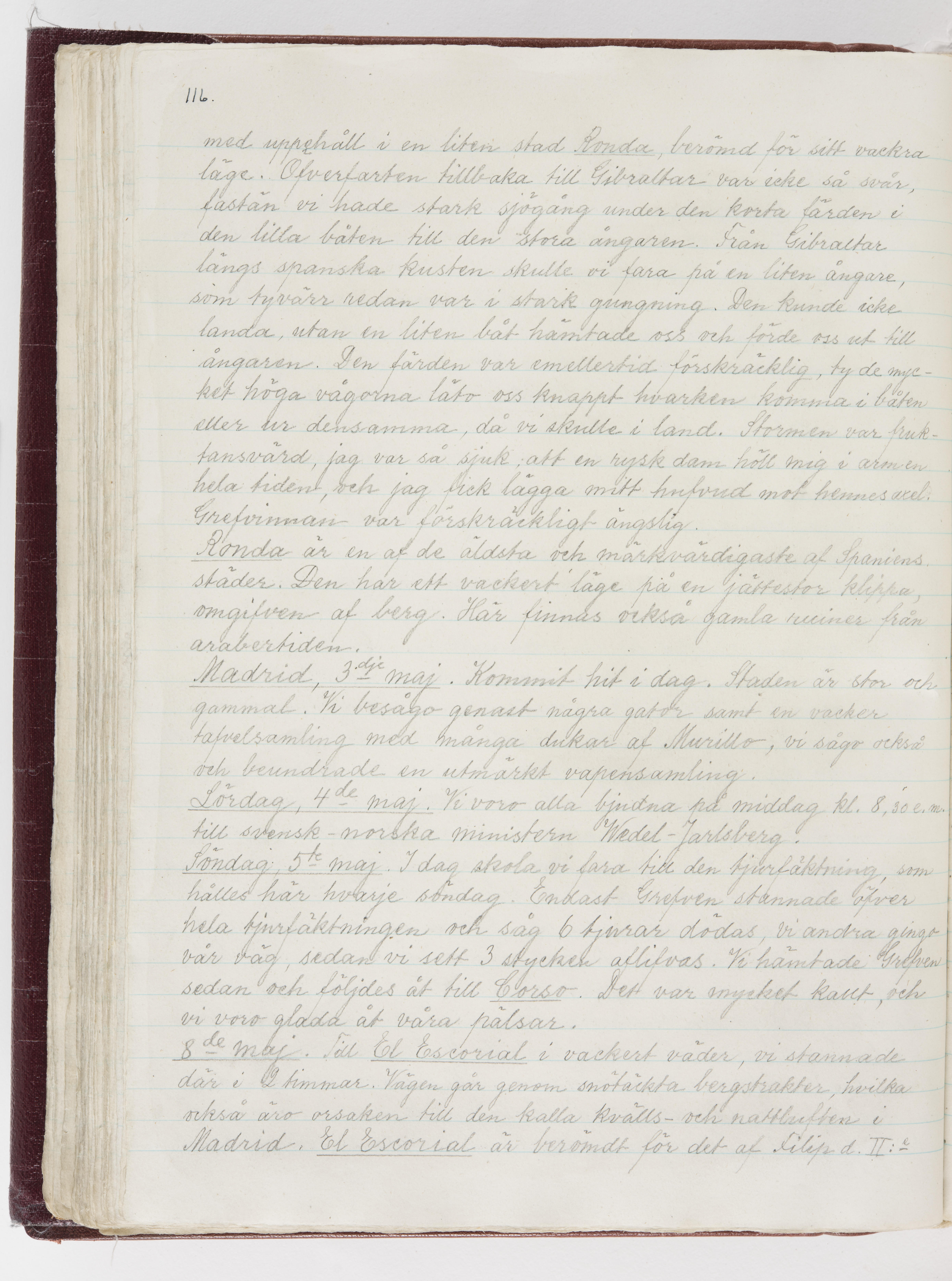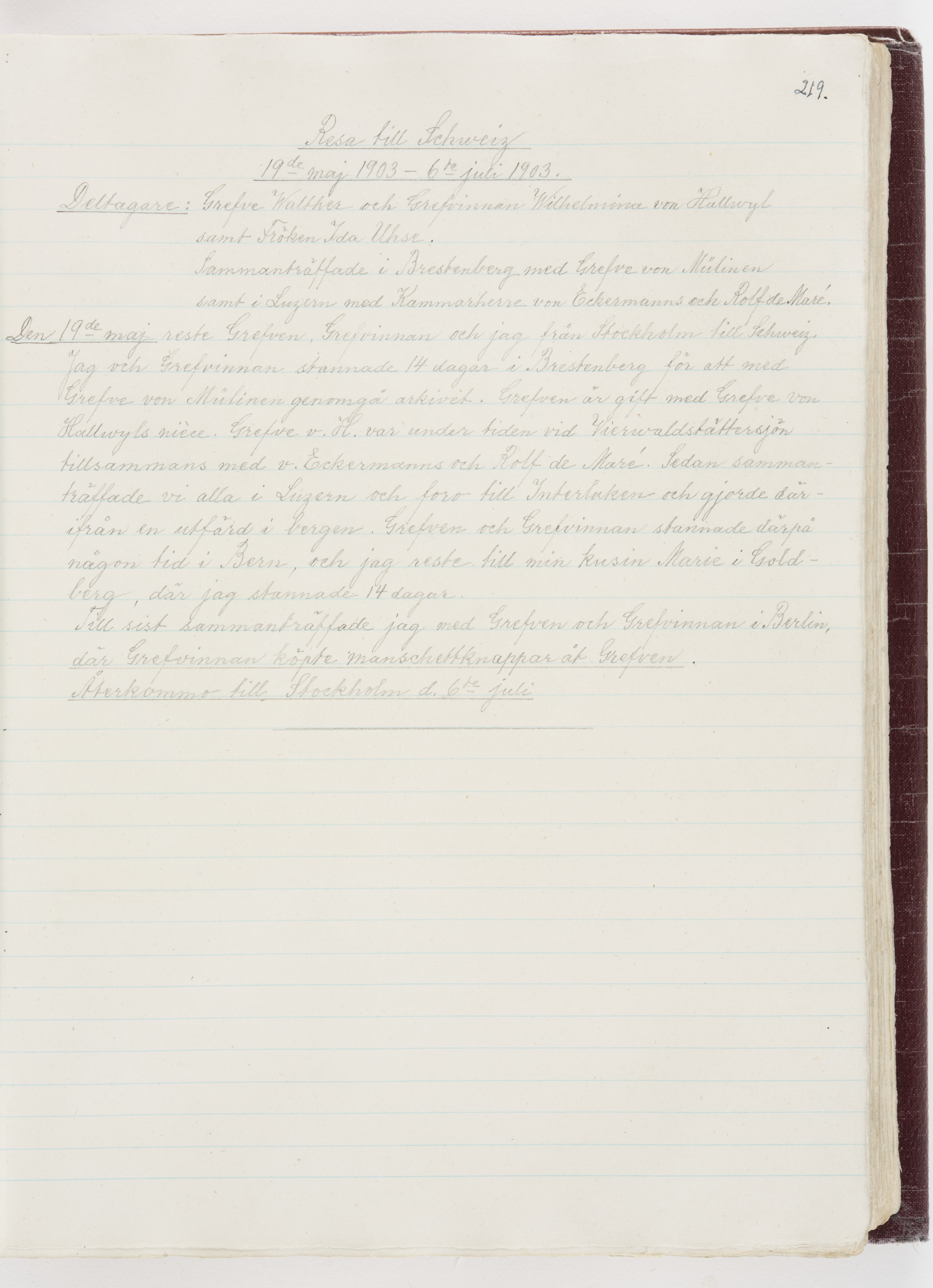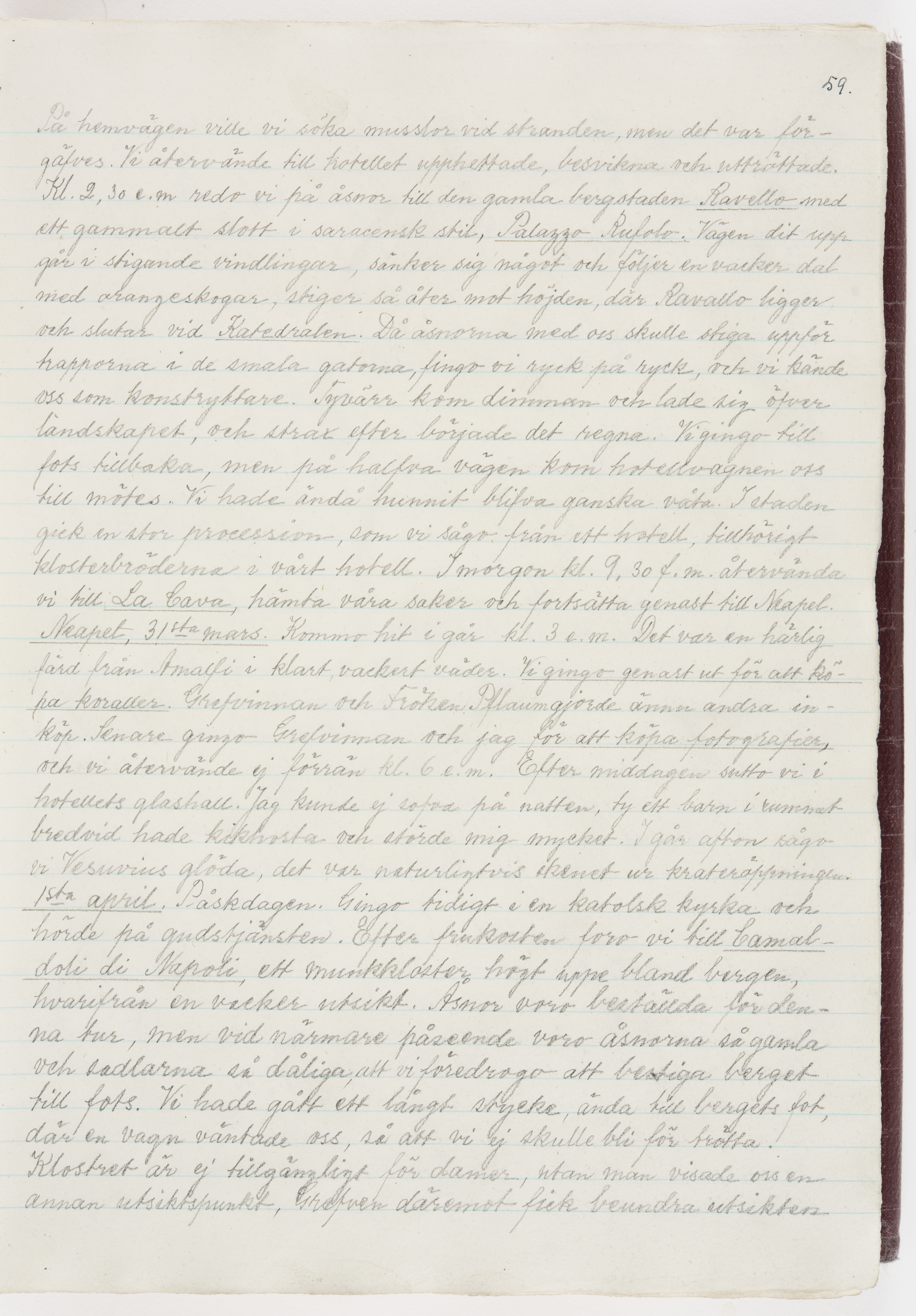 Översättning till svenska språket av dagbok skriven på tyska språket av Ida Uhse under resor tillsammans med Walther och Wilhelmina von Hallwyl åren 1880-1918 samt företeckning över fynd, gåvor och inköpta föremål under resorna åren 1881-1918. Av Signe Berglöf. 309 s. Skrivet med blyerts. Band (helt skinn-). Av brun >>oasis morocco>>, bundet med dubble ansättning och >>knäpprygg>>. Kapitäl av gult sämskskinn. Försättsblad av läderimitationspapper i brunt och svart. Fals av röd klot. 32*25*4,8 cm. Bundet av bokbindaren Otto Olsson.