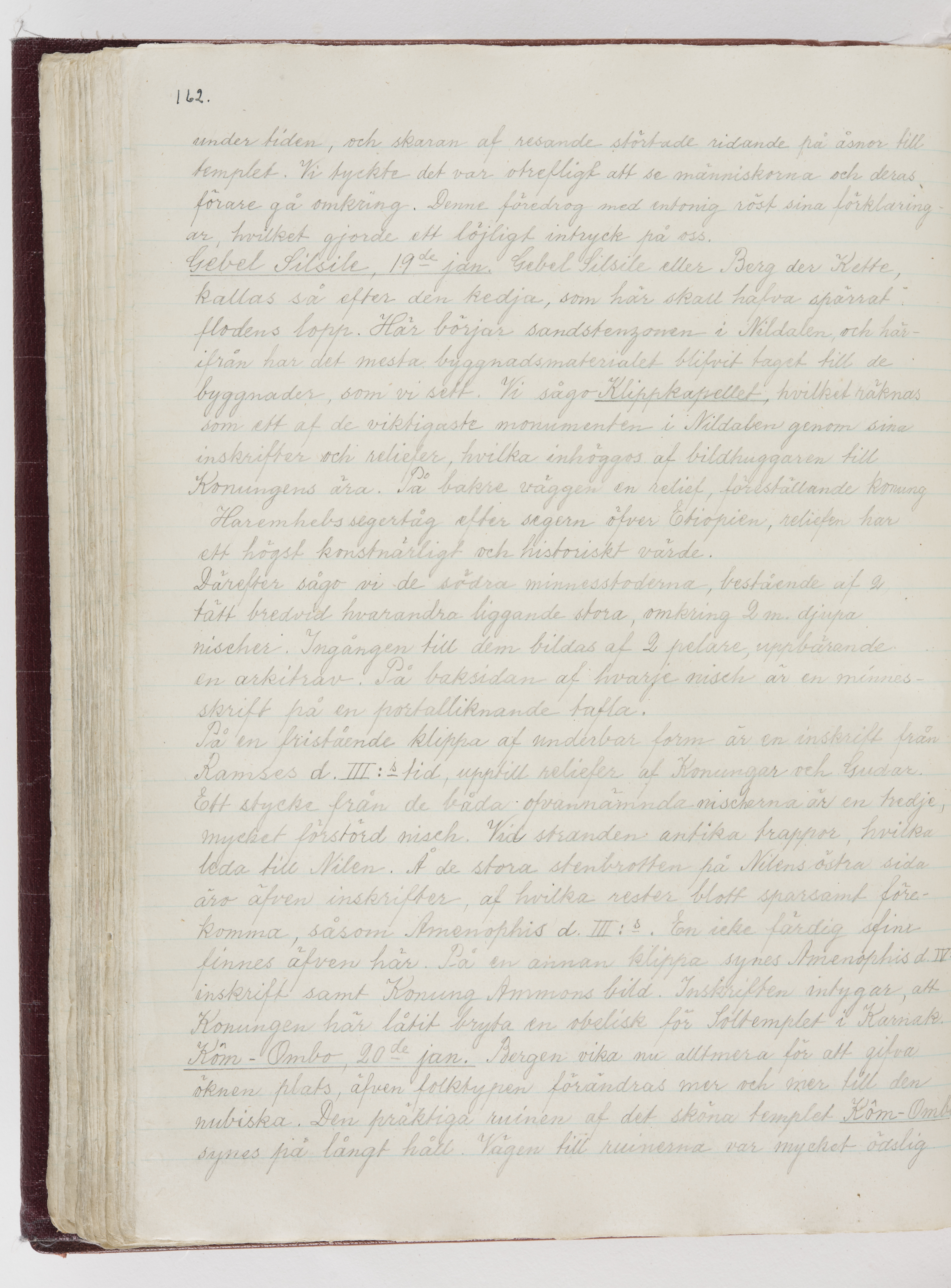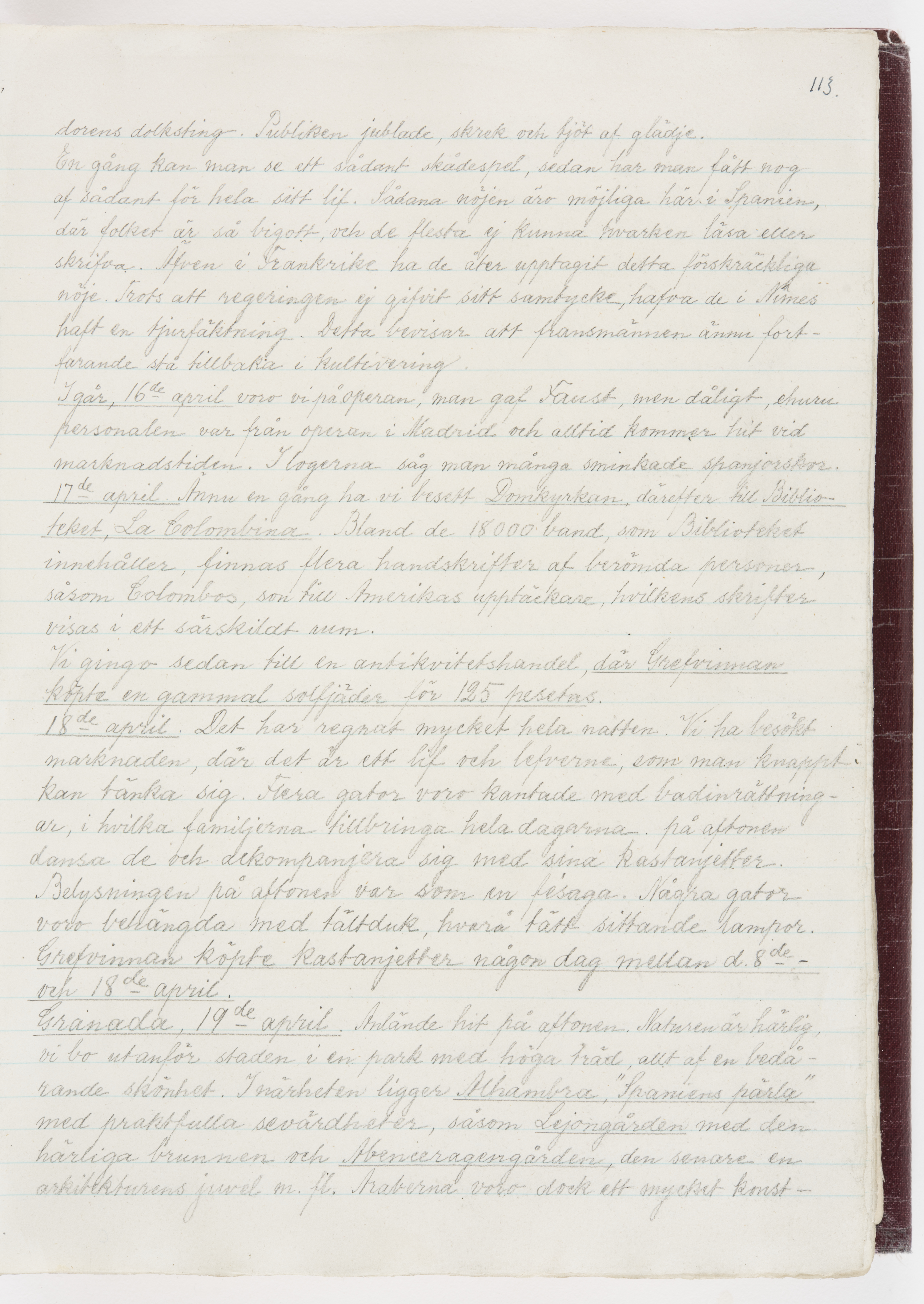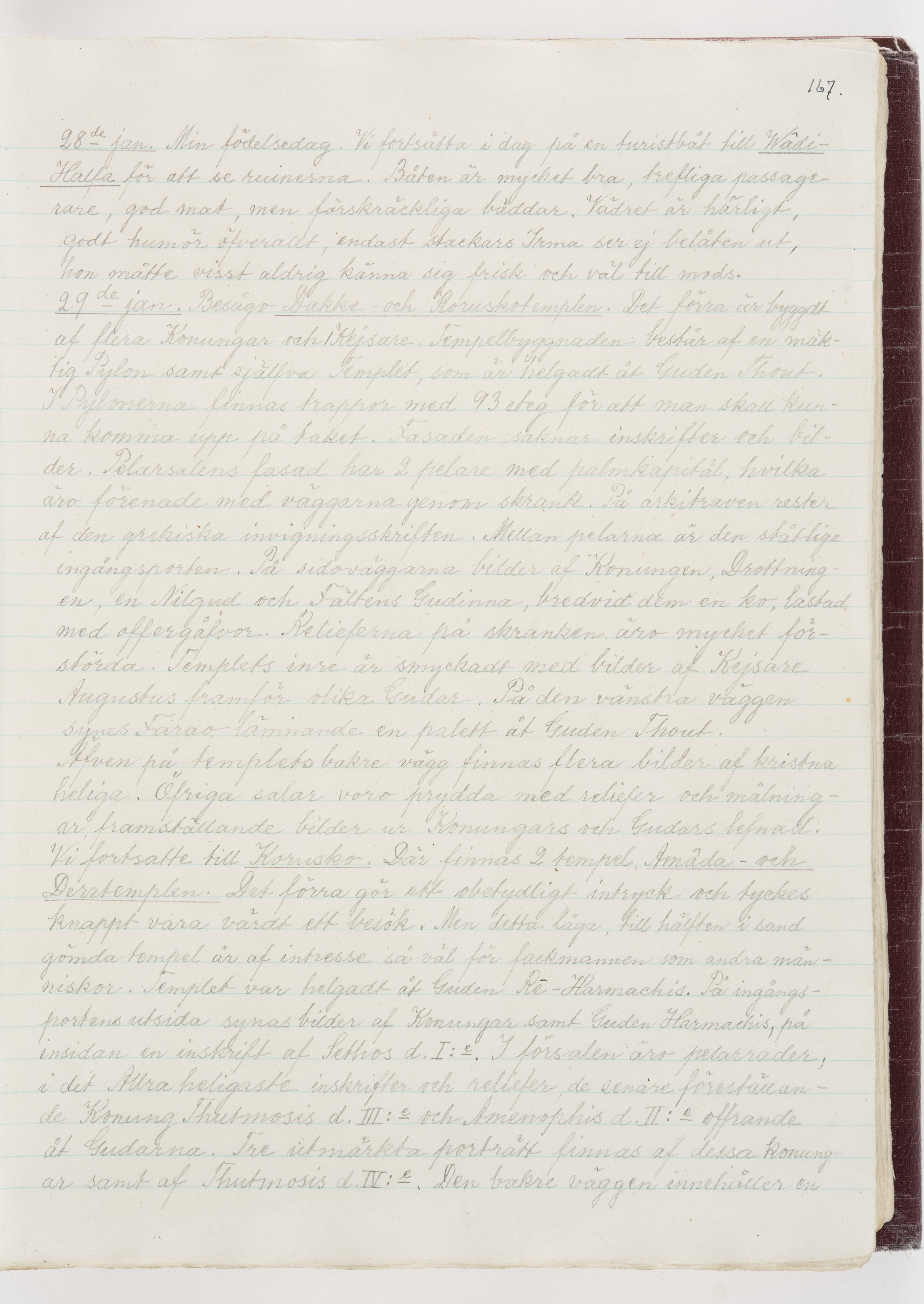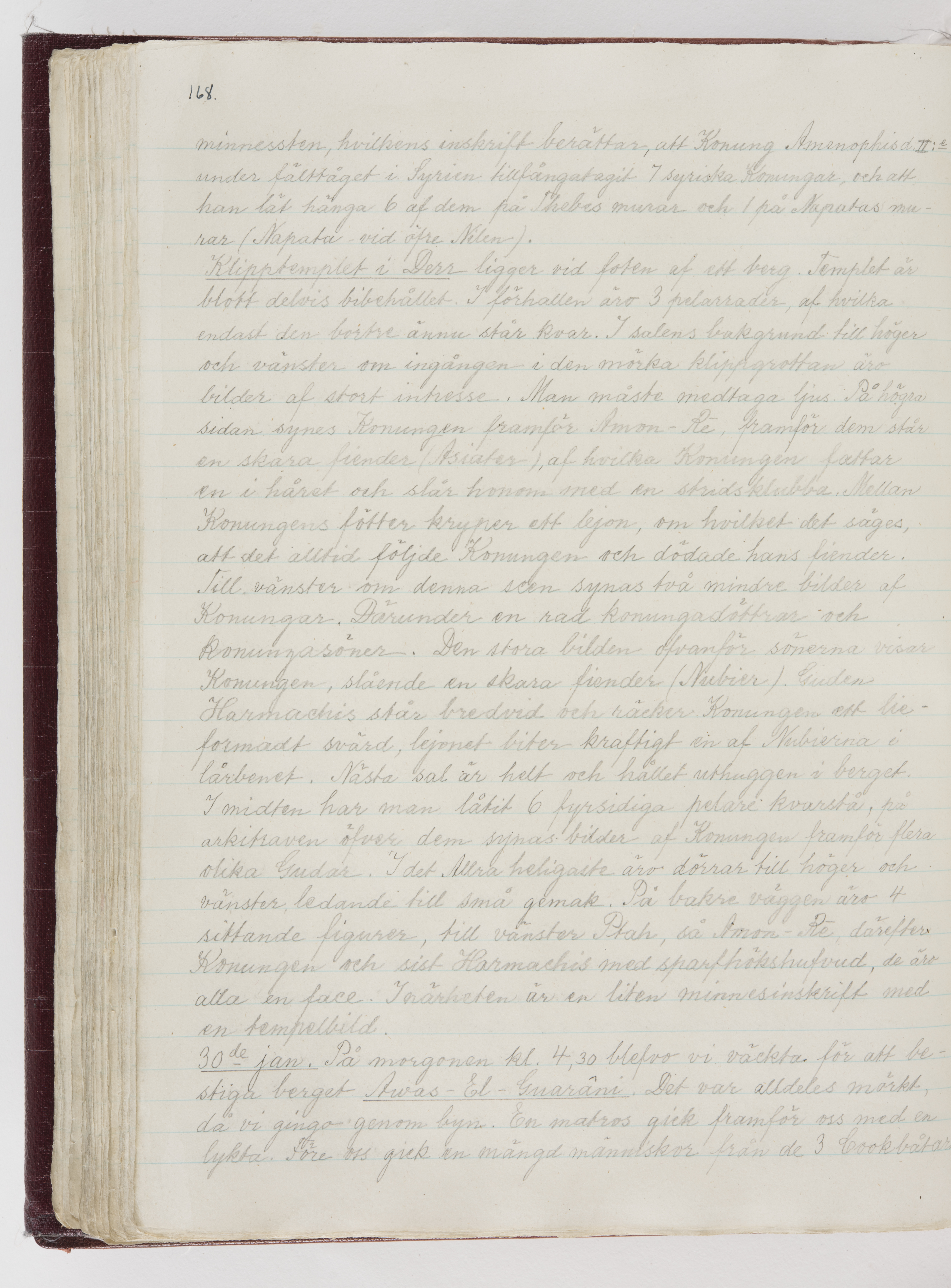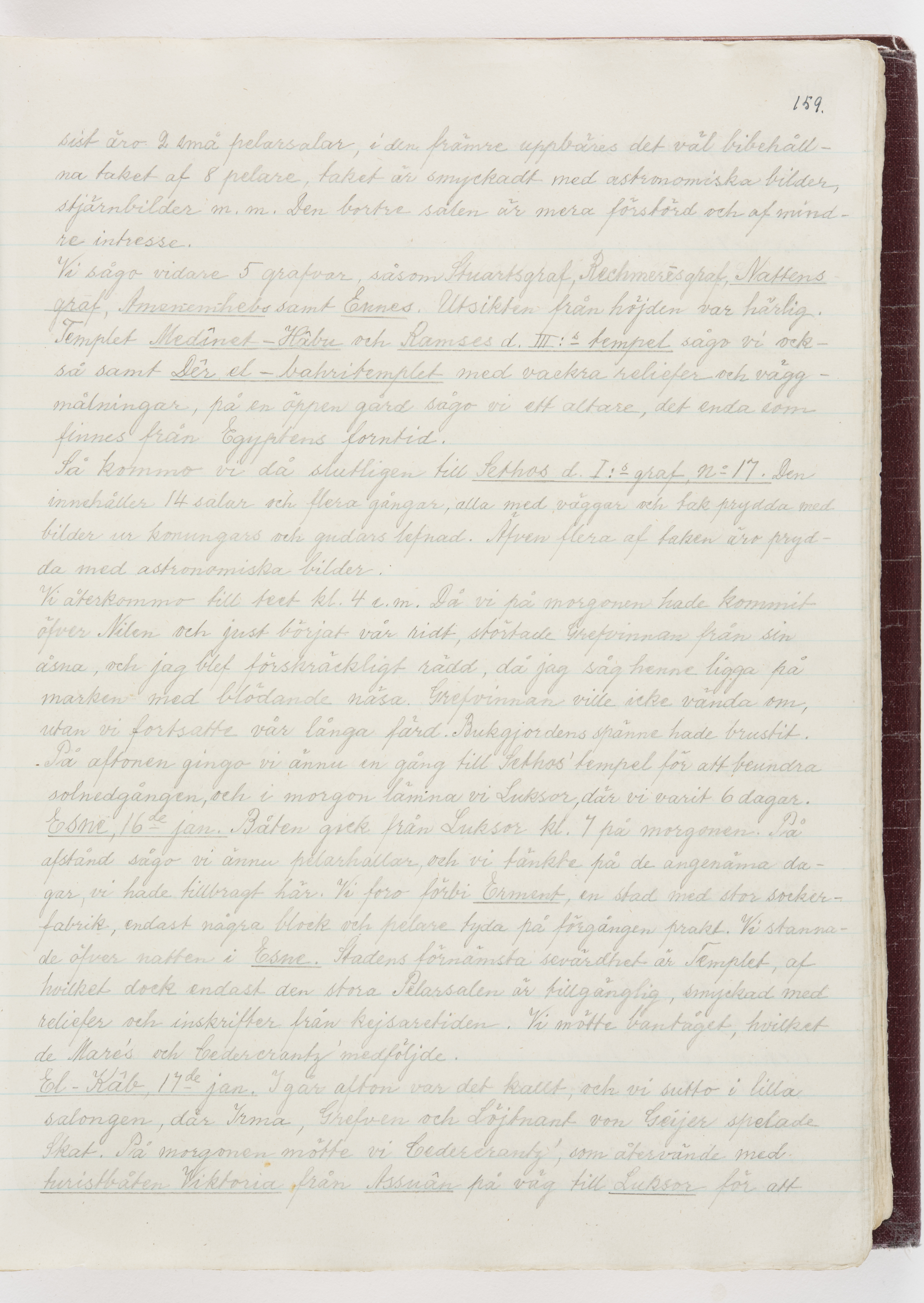 Översättning till svenska språket av dagbok skriven på tyska språket av Ida Uhse under resor tillsammans med Walther och Wilhelmina von Hallwyl åren 1880-1918 samt företeckning över fynd, gåvor och inköpta föremål under resorna åren 1881-1918. Av Signe Berglöf. 309 s. Skrivet med blyerts. Band (helt skinn-). Av brun >>oasis morocco>>, bundet med dubble ansättning och >>knäpprygg>>. Kapitäl av gult sämskskinn. Försättsblad av läderimitationspapper i brunt och svart. Fals av röd klot. 32*25*4,8 cm. Bundet av bokbindaren Otto Olsson.