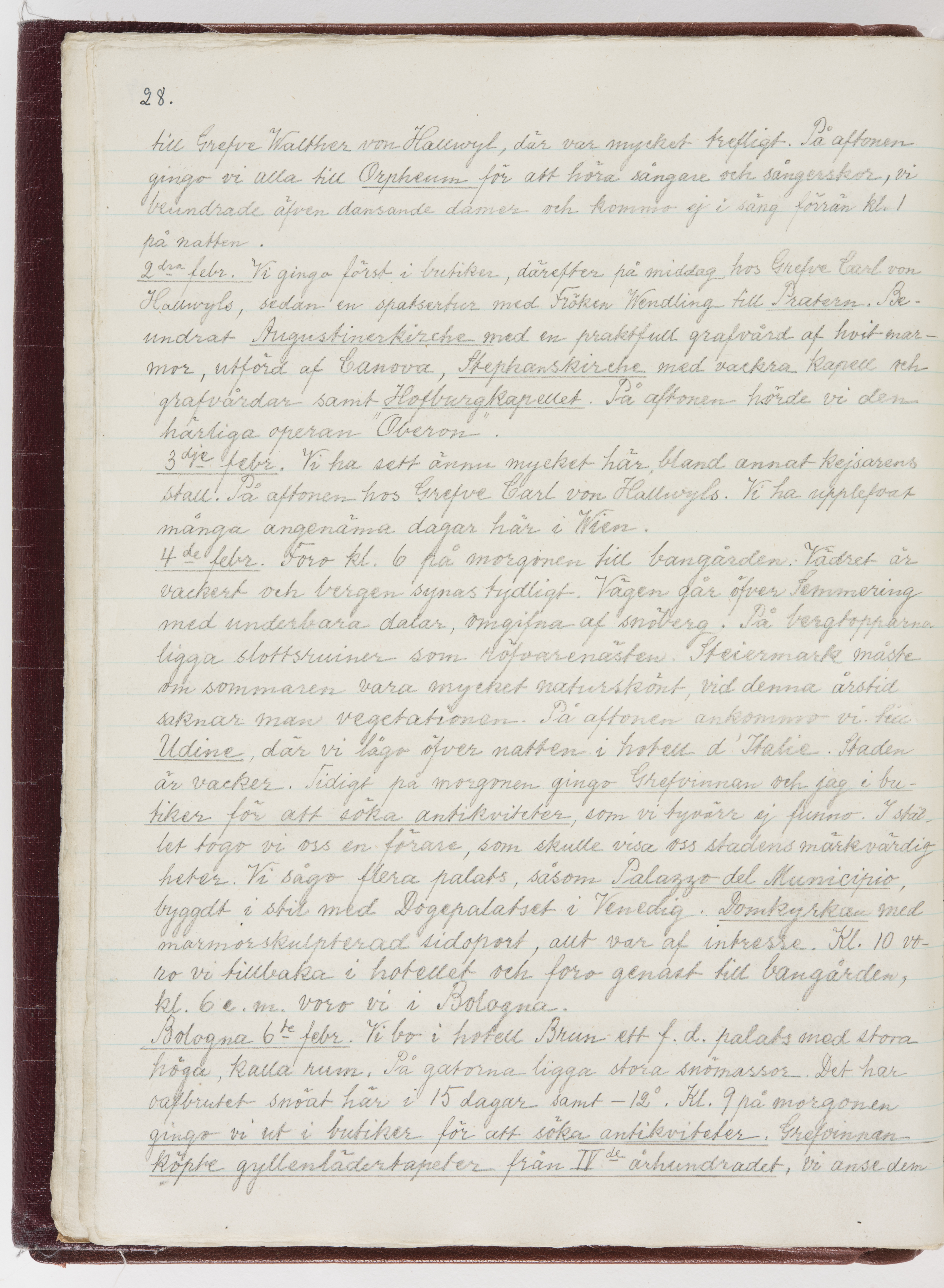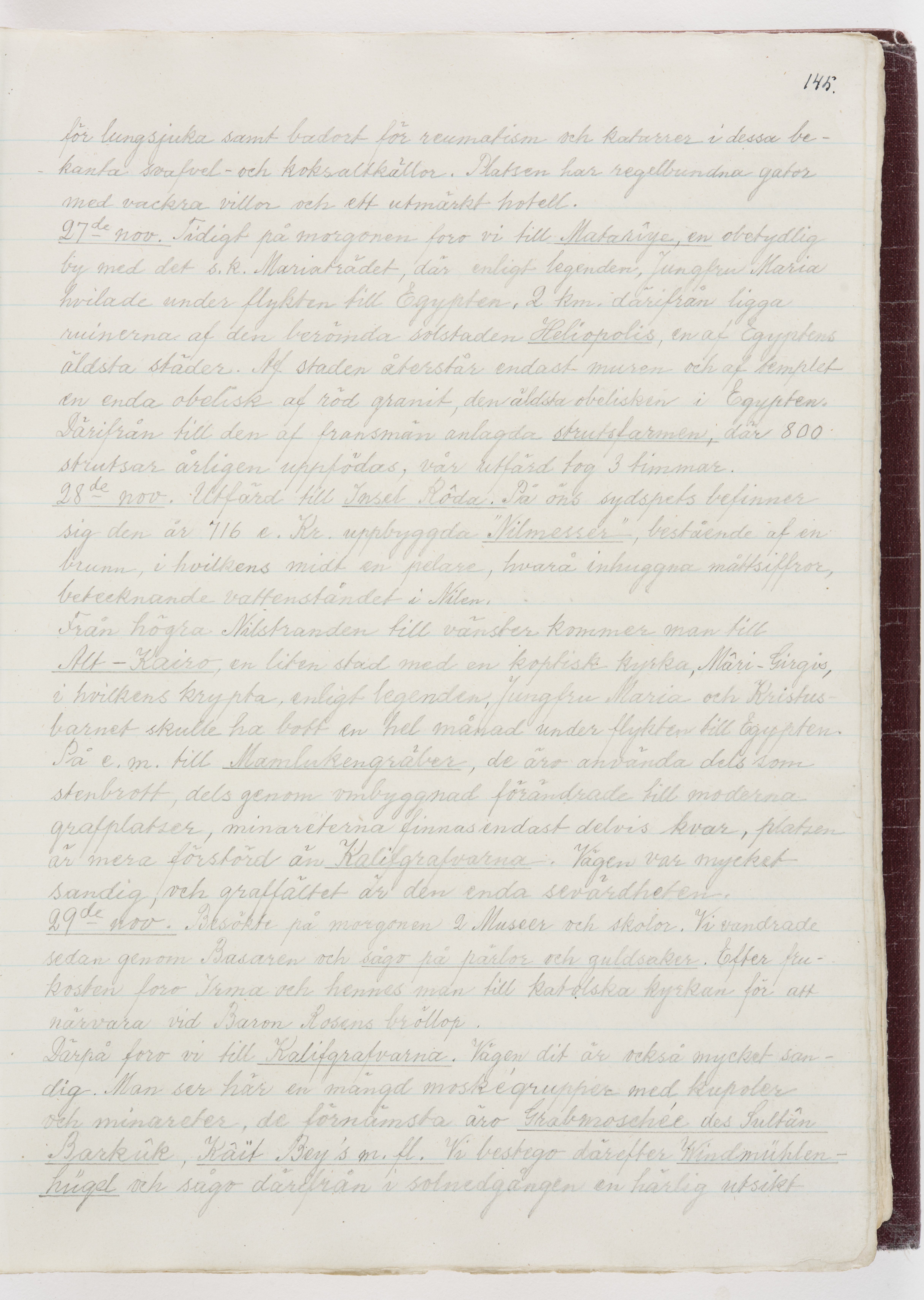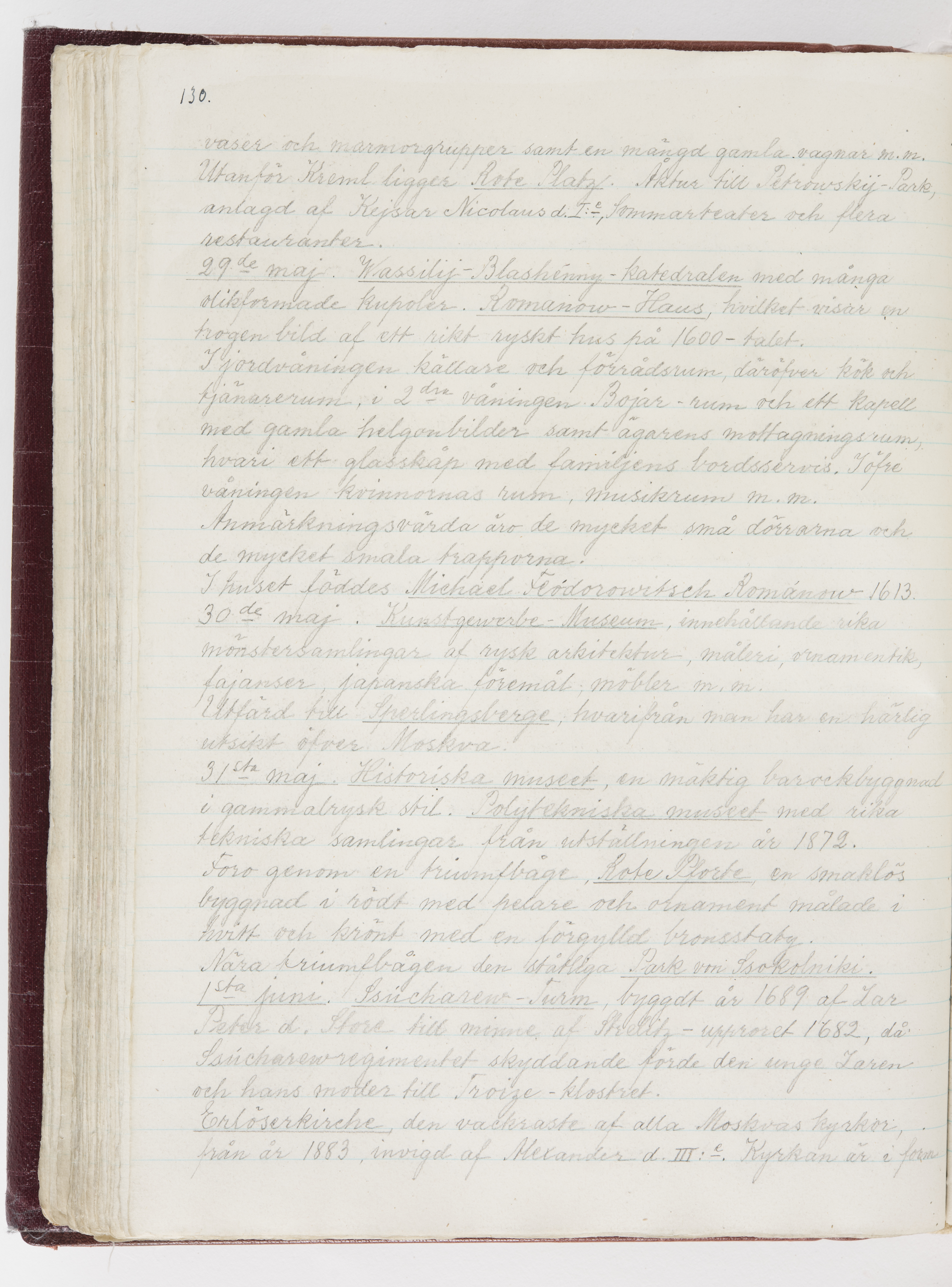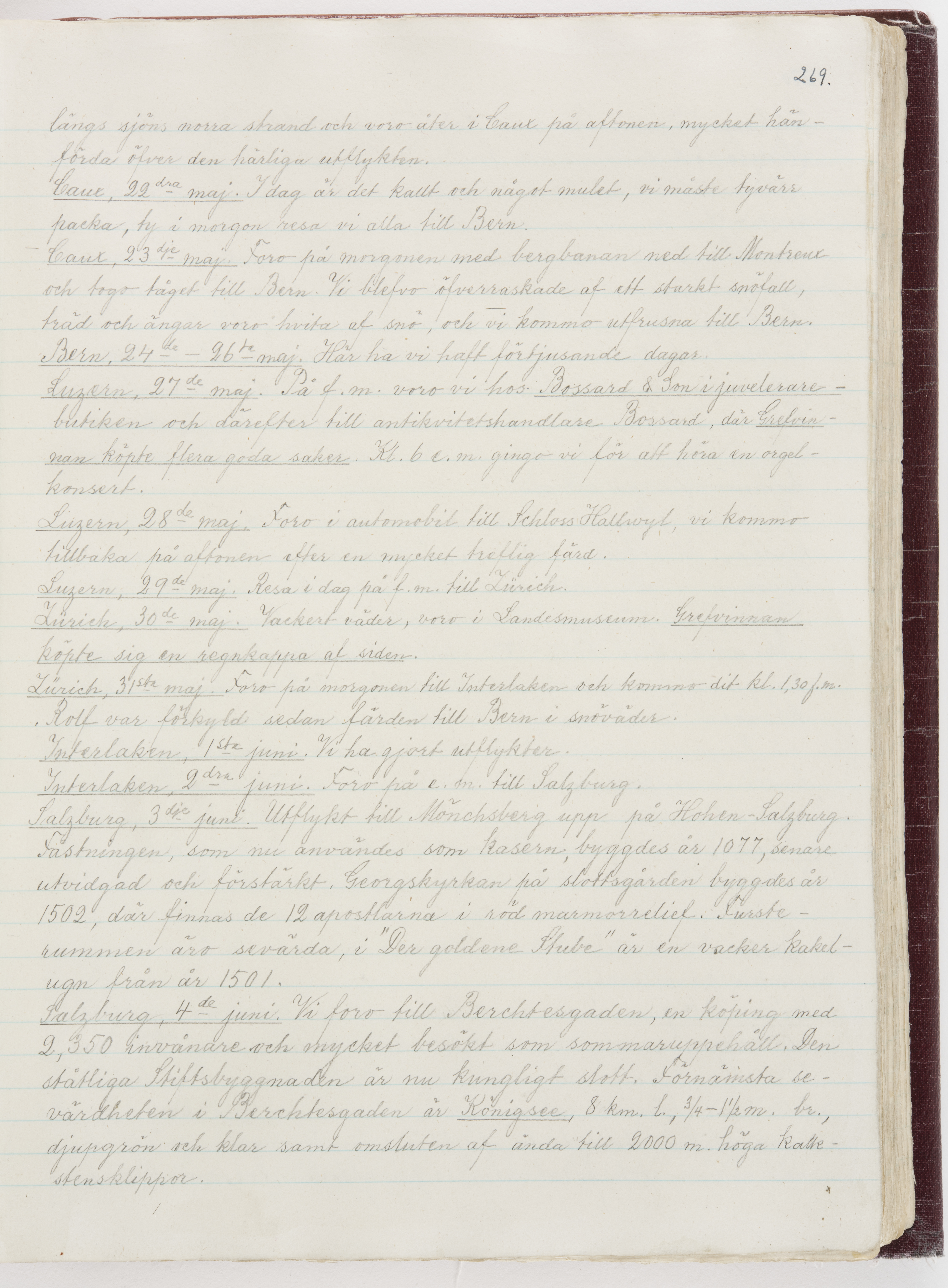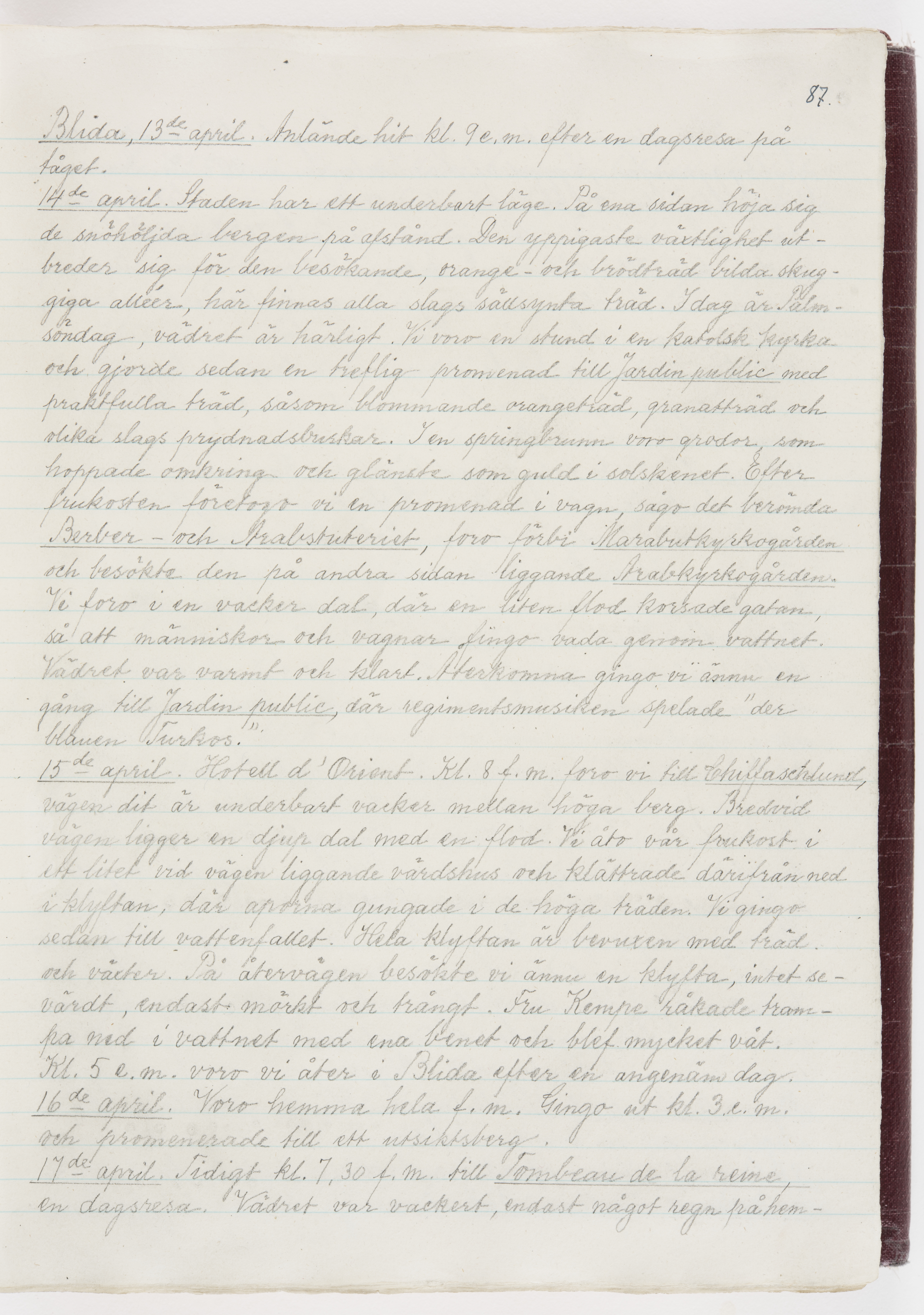 Översättning till svenska språket av dagbok skriven på tyska språket av Ida Uhse under resor tillsammans med Walther och Wilhelmina von Hallwyl åren 1880-1918 samt företeckning över fynd, gåvor och inköpta föremål under resorna åren 1881-1918. Av Signe Berglöf. 309 s. Skrivet med blyerts. Band (helt skinn-). Av brun >>oasis morocco>>, bundet med dubble ansättning och >>knäpprygg>>. Kapitäl av gult sämskskinn. Försättsblad av läderimitationspapper i brunt och svart. Fals av röd klot. 32*25*4,8 cm. Bundet av bokbindaren Otto Olsson.