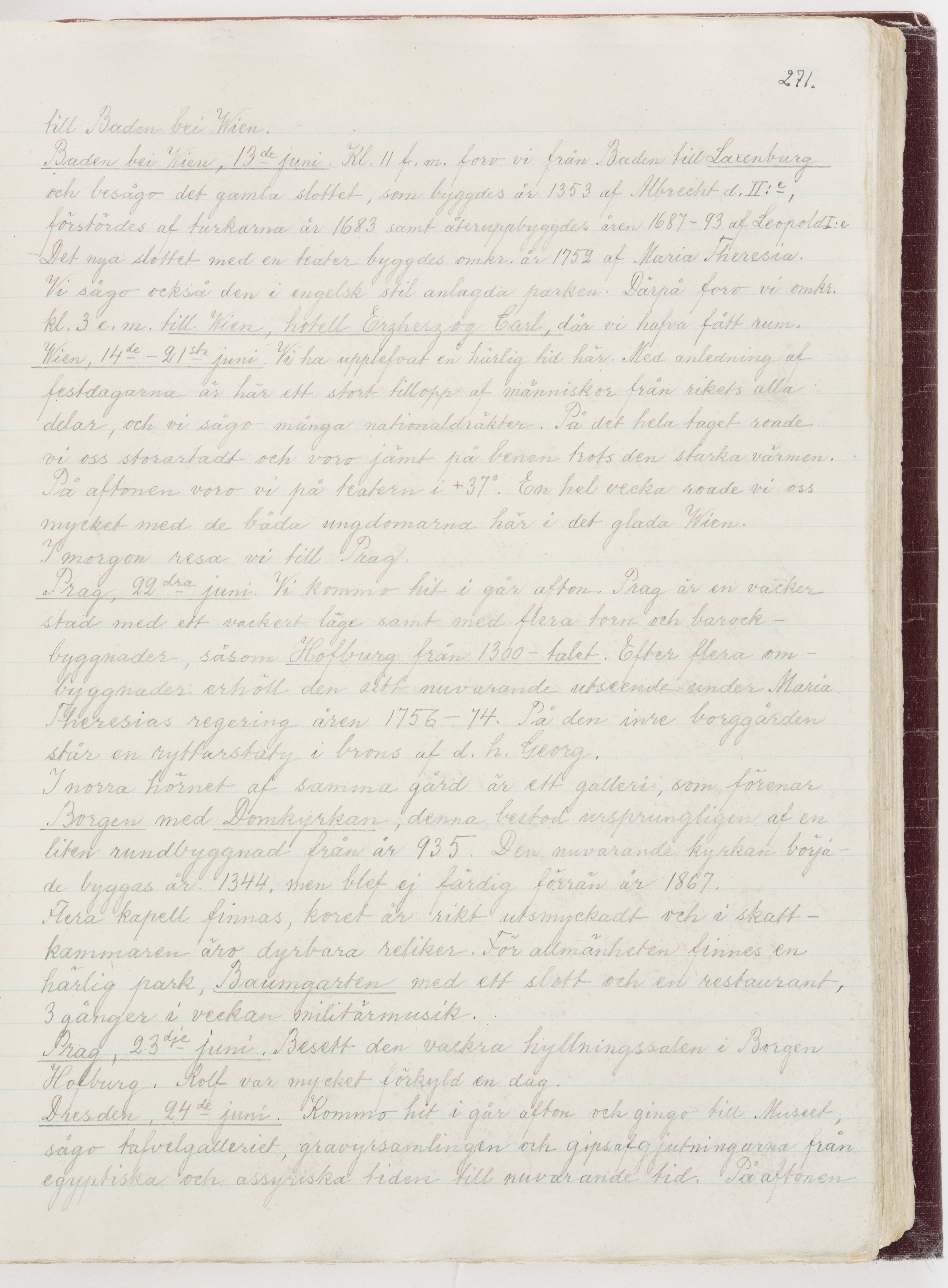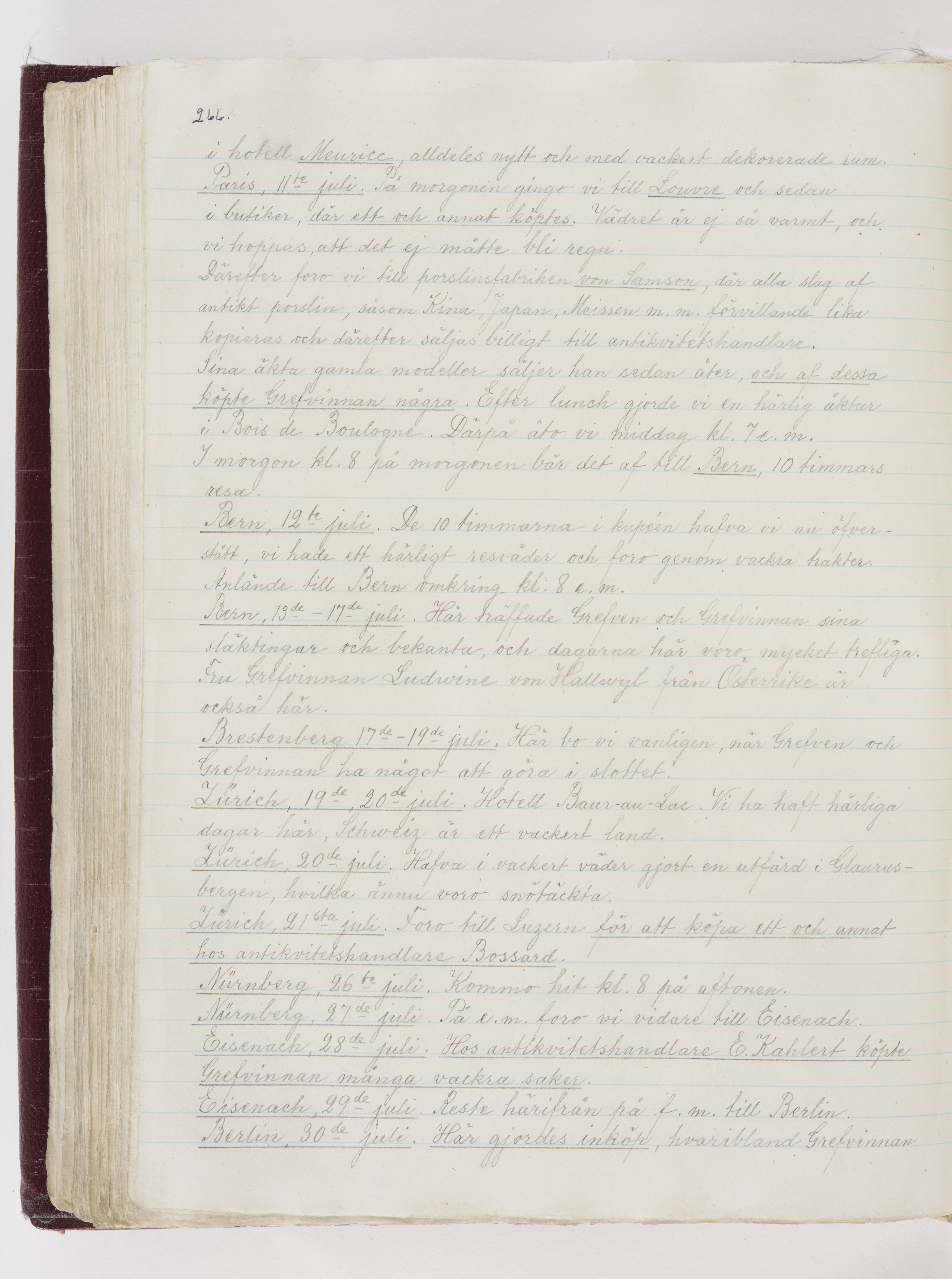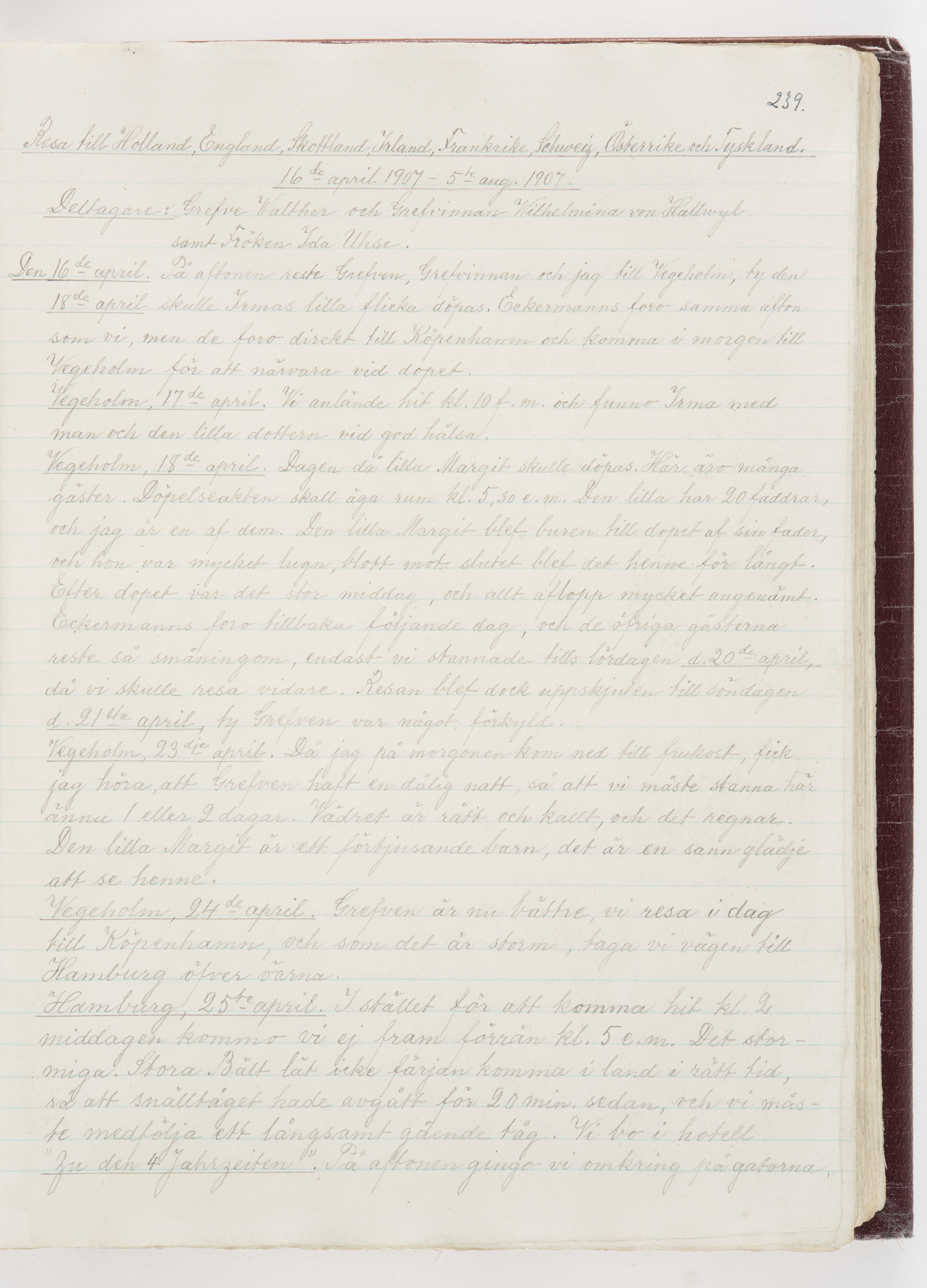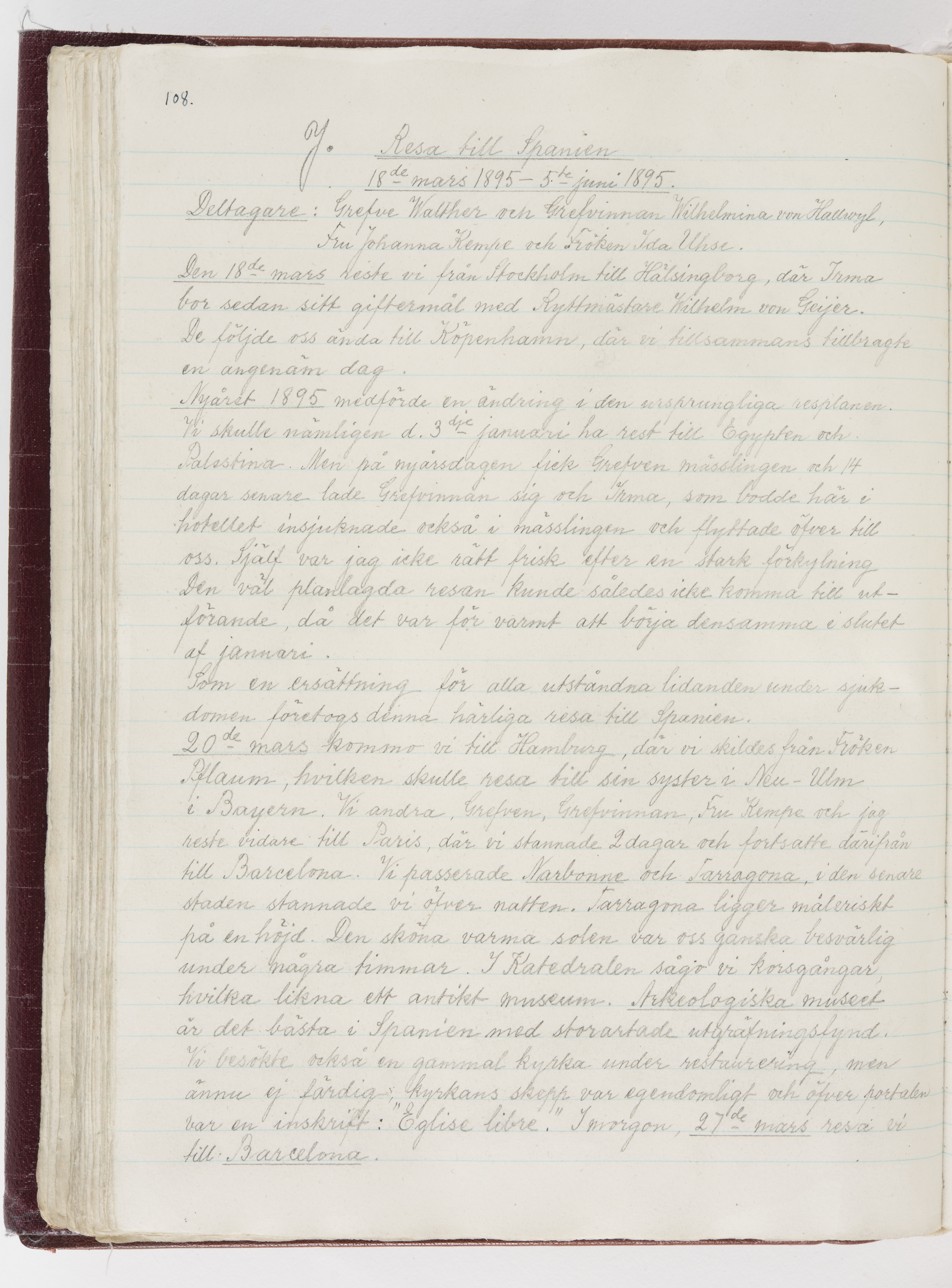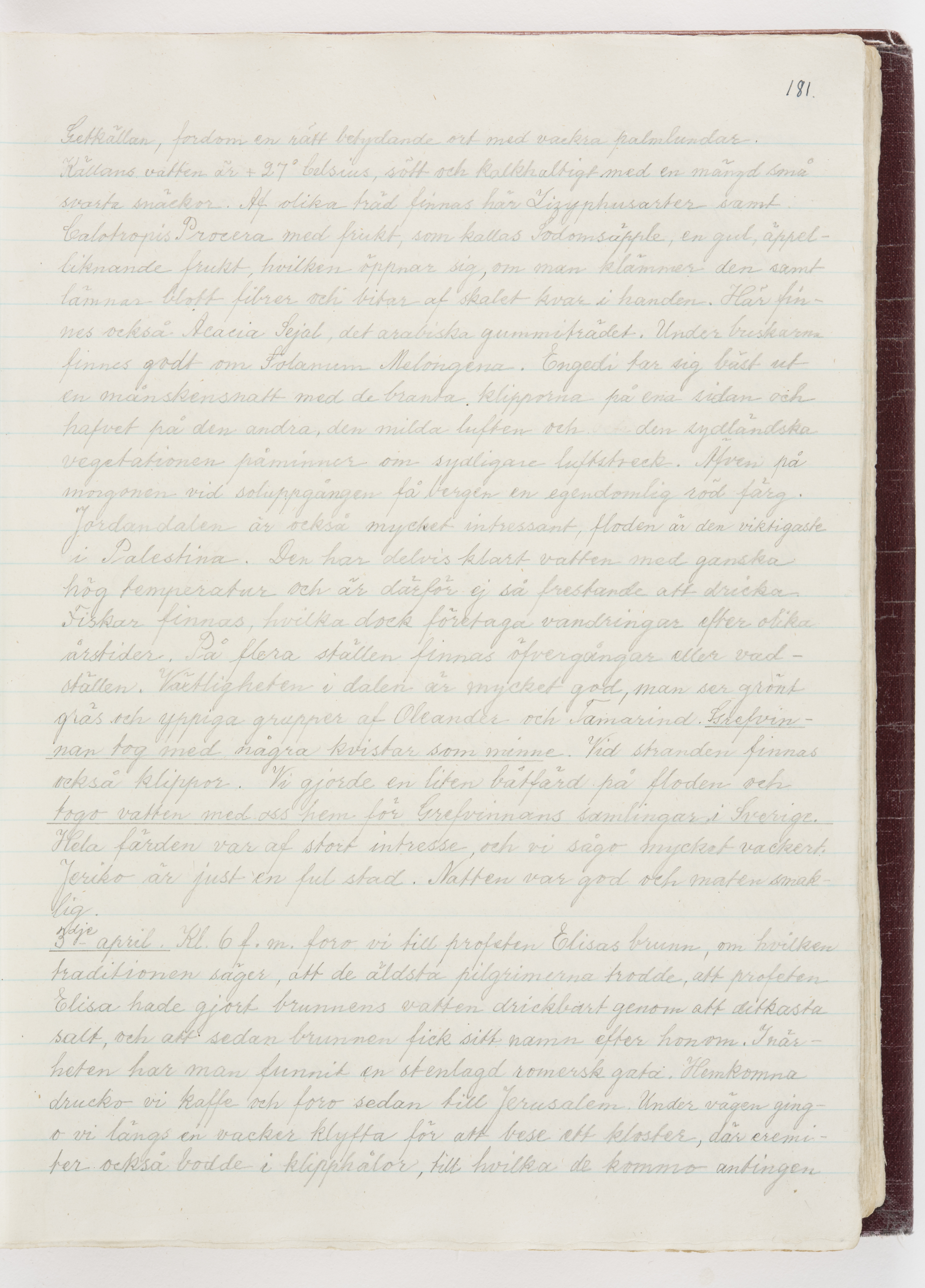 Översättning till svenska språket av dagbok skriven på tyska språket av Ida Uhse under resor tillsammans med Walther och Wilhelmina von Hallwyl åren 1880-1918 samt företeckning över fynd, gåvor och inköpta föremål under resorna åren 1881-1918. Av Signe Berglöf. 309 s. Skrivet med blyerts. Band (helt skinn-). Av brun >>oasis morocco>>, bundet med dubble ansättning och >>knäpprygg>>. Kapitäl av gult sämskskinn. Försättsblad av läderimitationspapper i brunt och svart. Fals av röd klot. 32*25*4,8 cm. Bundet av bokbindaren Otto Olsson.
