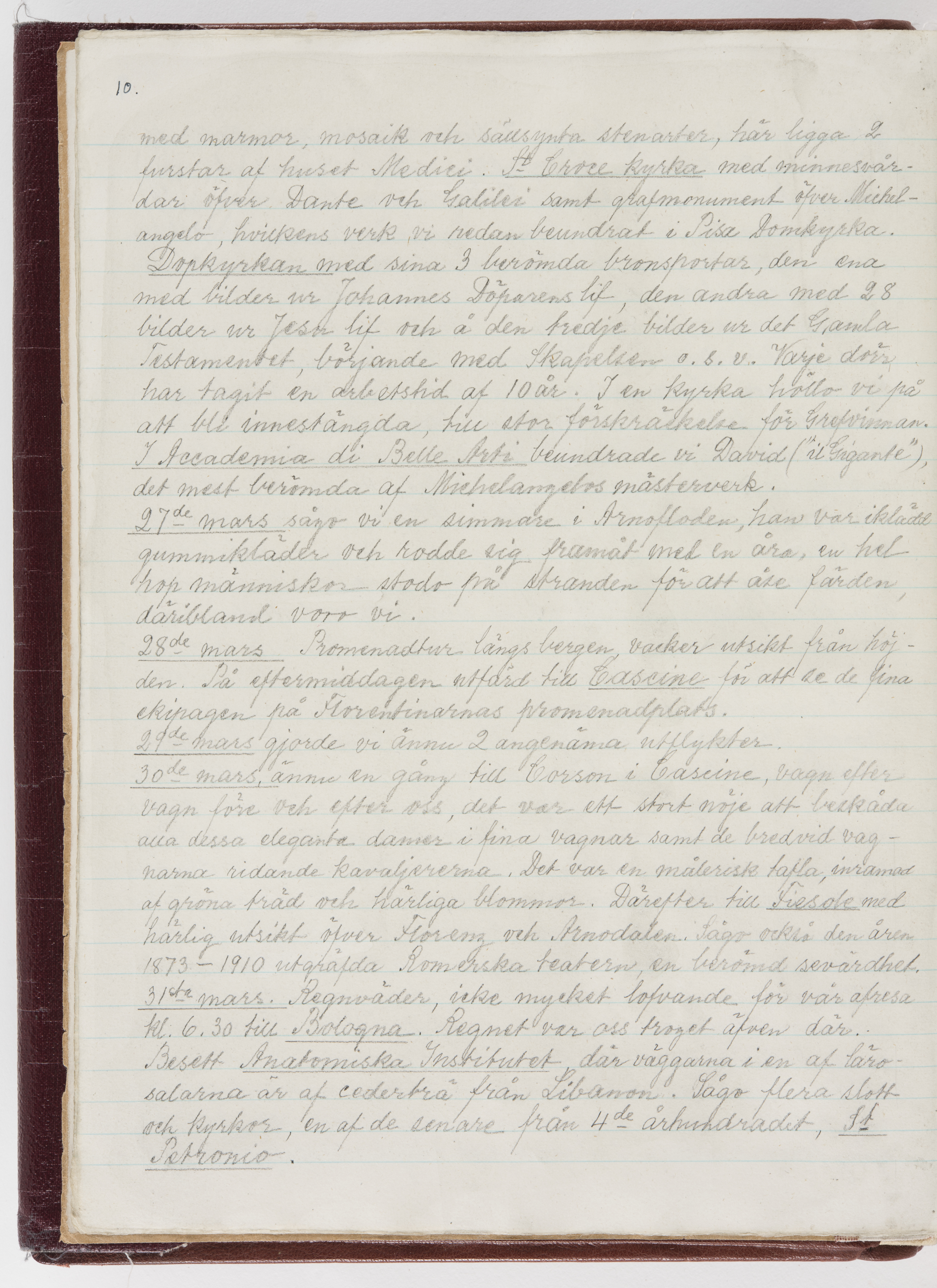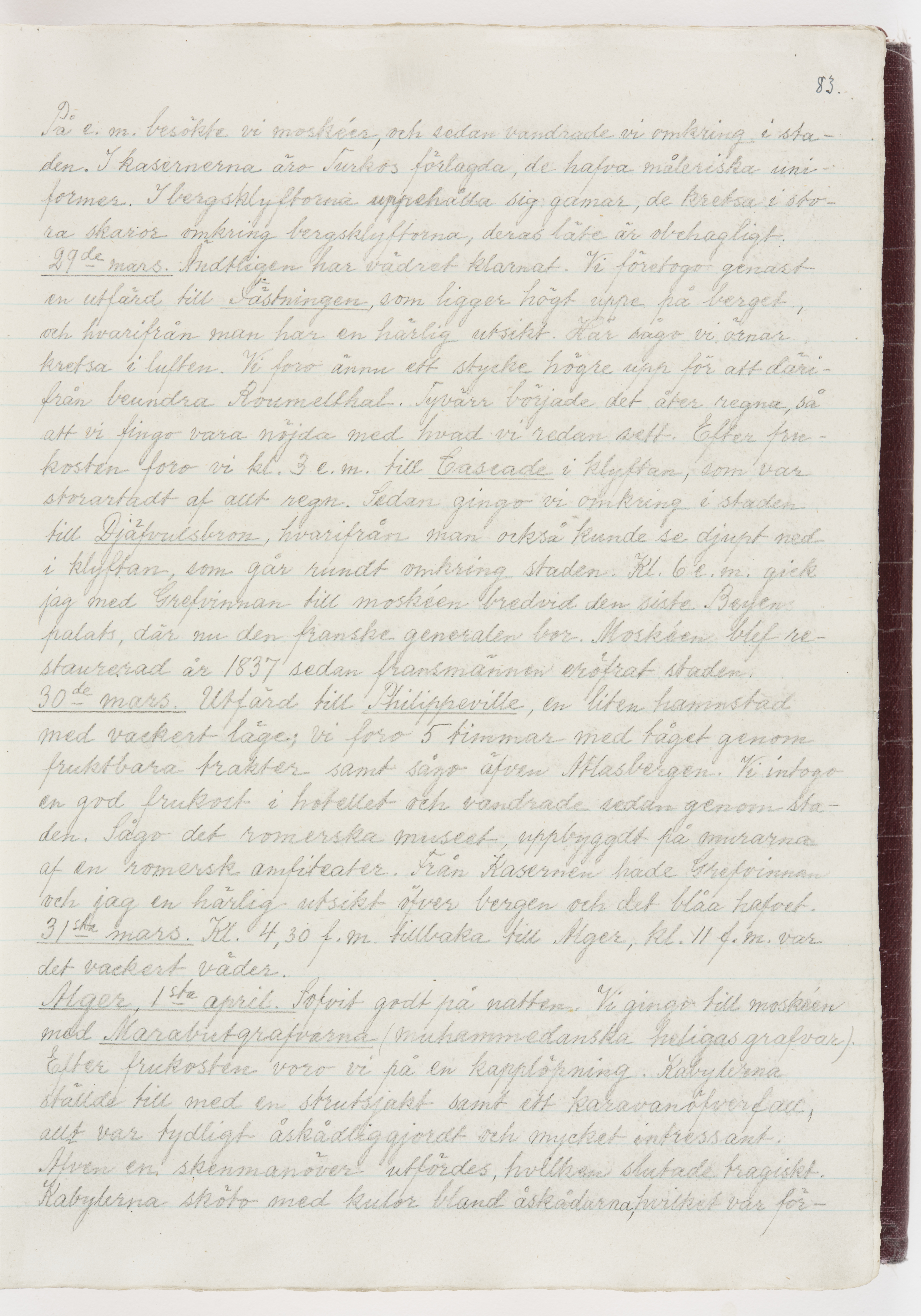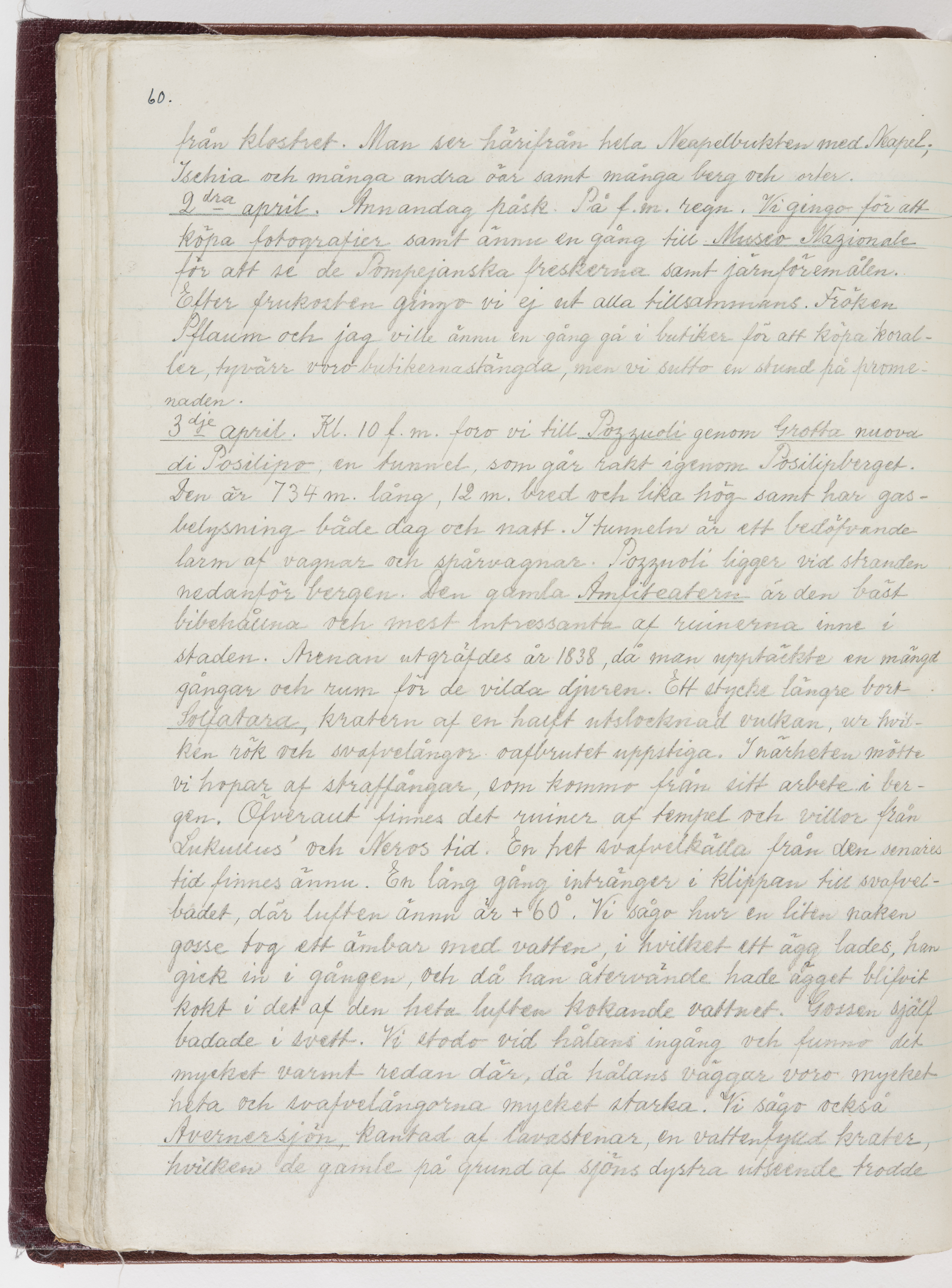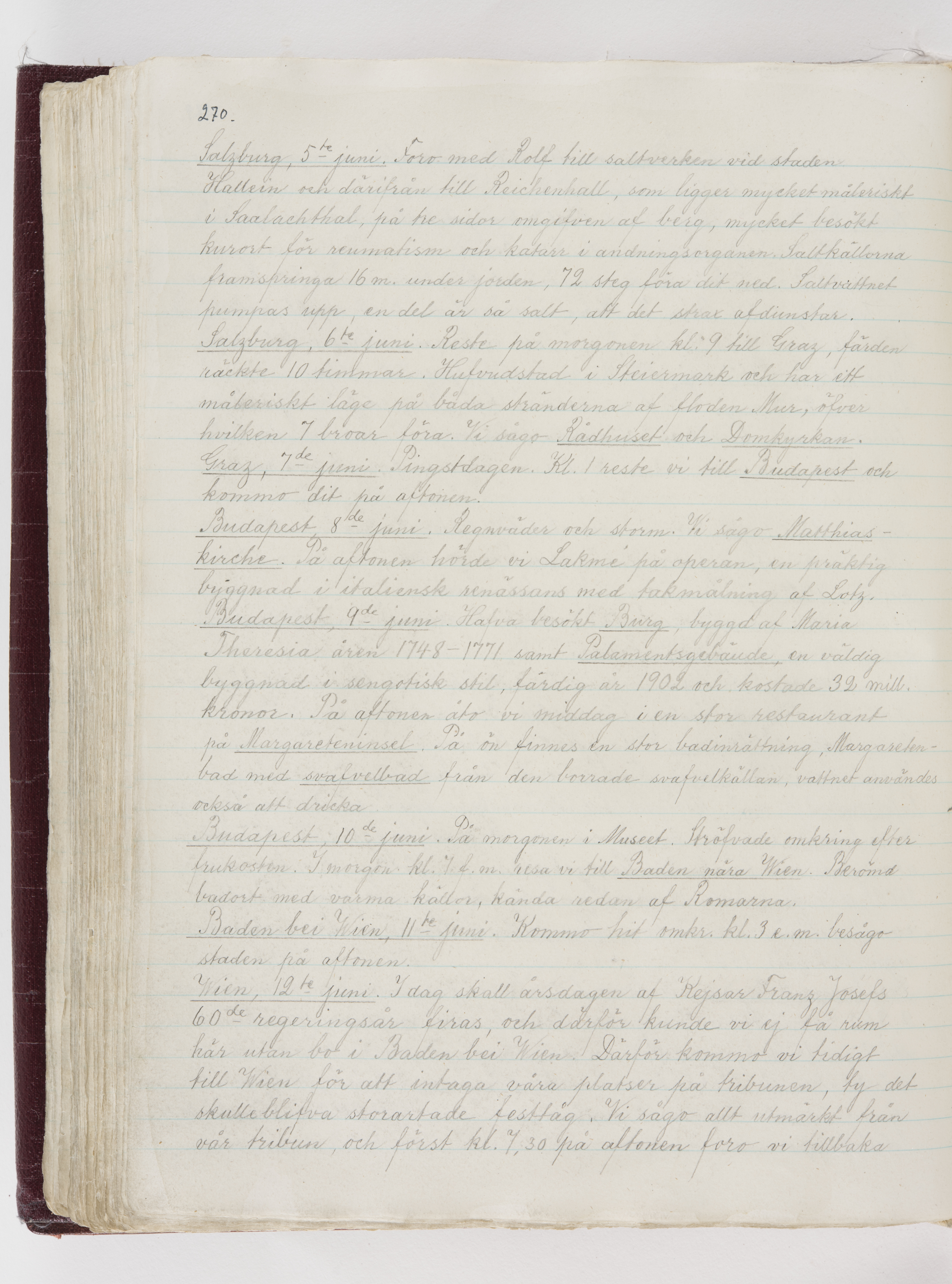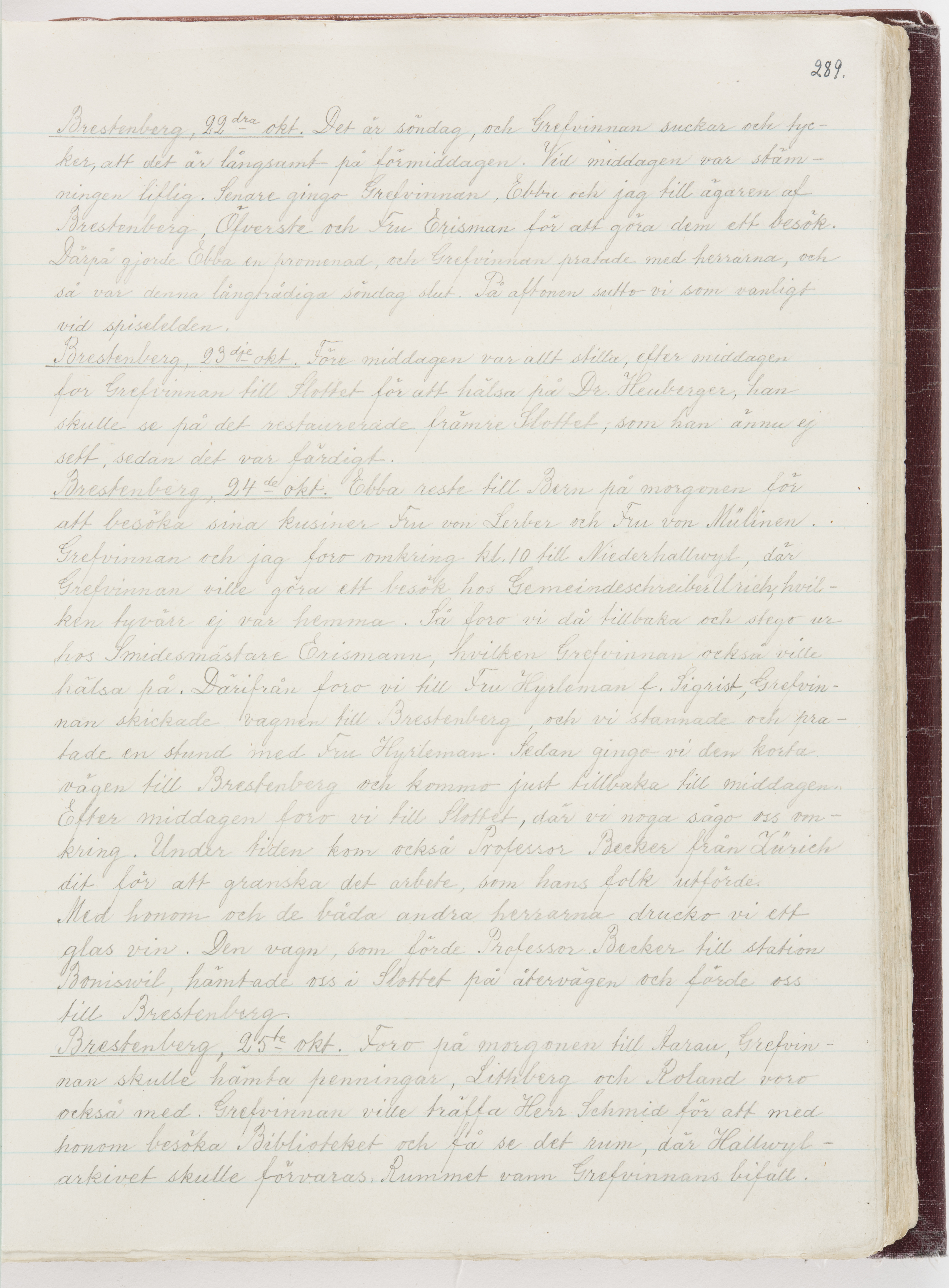 Översättning till svenska språket av dagbok skriven på tyska språket av Ida Uhse under resor tillsammans med Walther och Wilhelmina von Hallwyl åren 1880-1918 samt företeckning över fynd, gåvor och inköpta föremål under resorna åren 1881-1918. Av Signe Berglöf. 309 s. Skrivet med blyerts. Band (helt skinn-). Av brun >>oasis morocco>>, bundet med dubble ansättning och >>knäpprygg>>. Kapitäl av gult sämskskinn. Försättsblad av läderimitationspapper i brunt och svart. Fals av röd klot. 32*25*4,8 cm. Bundet av bokbindaren Otto Olsson.