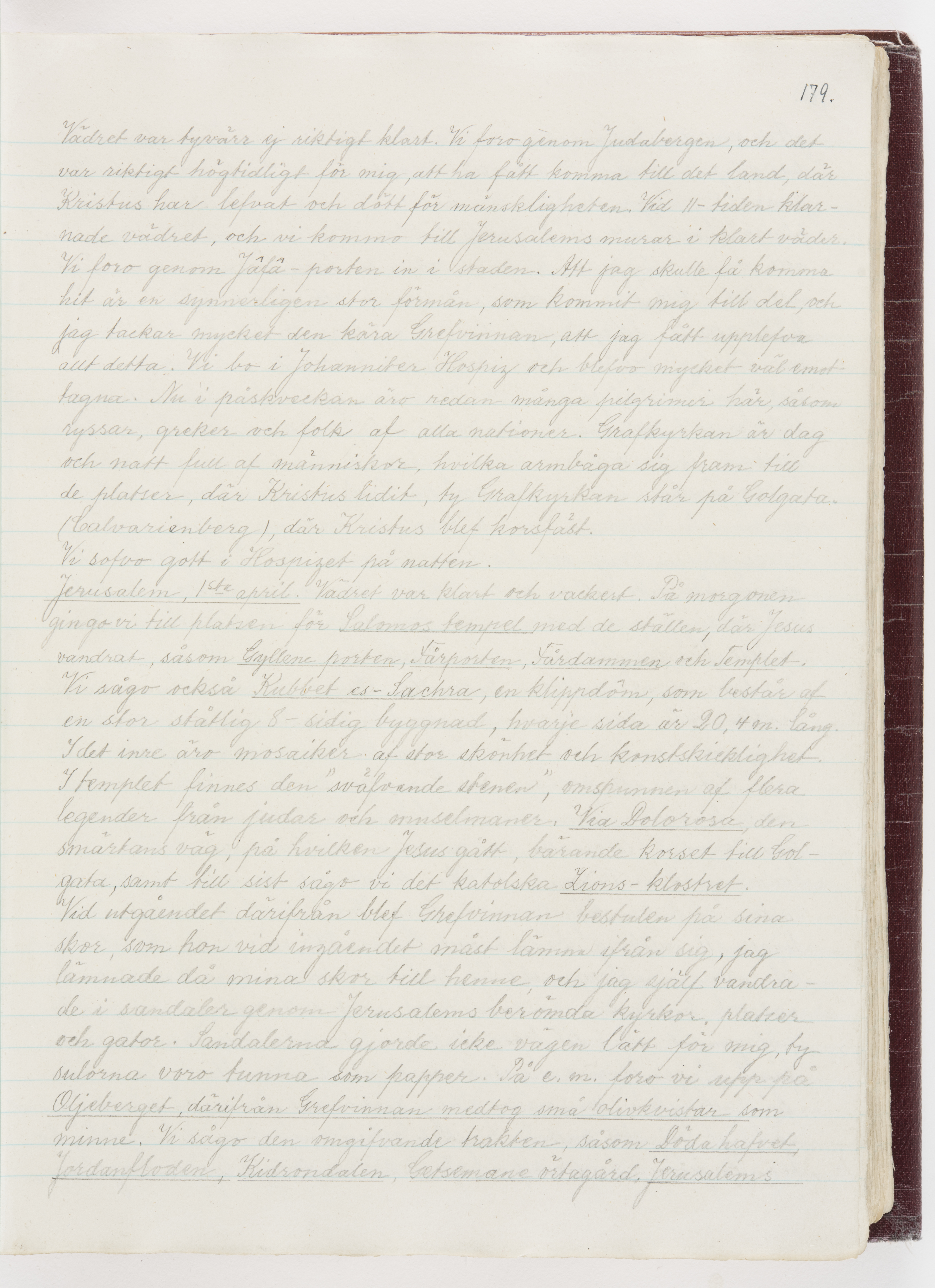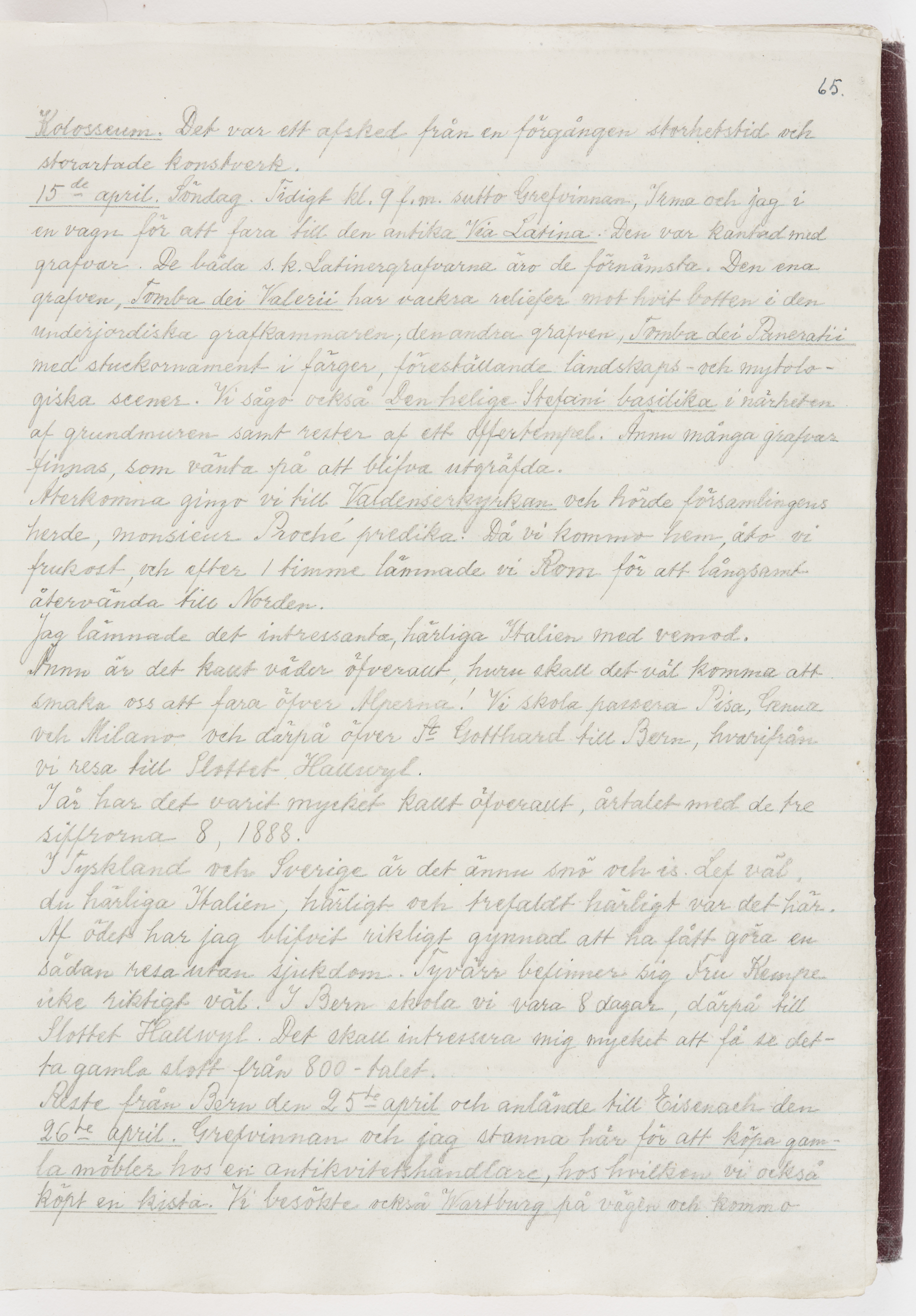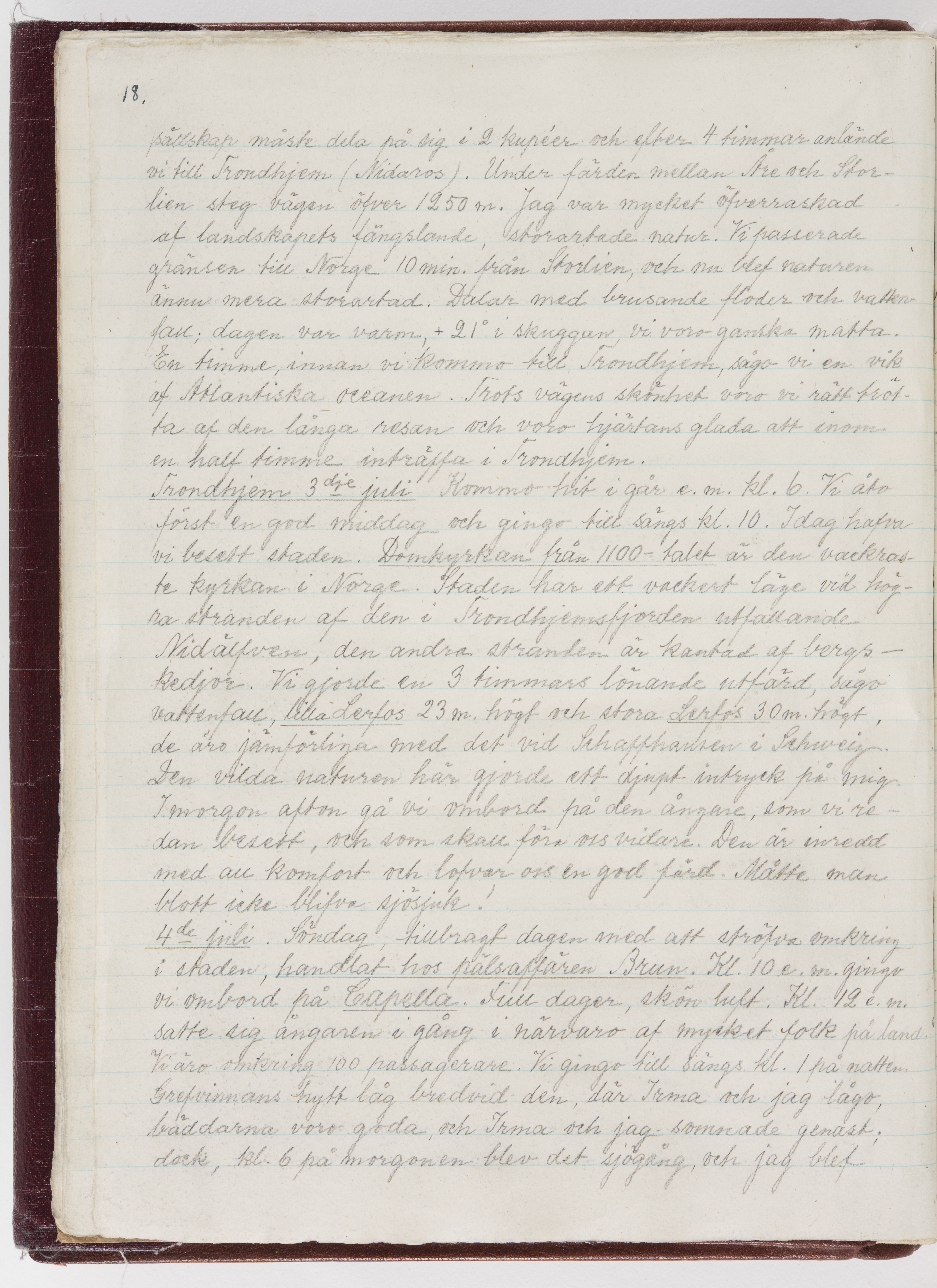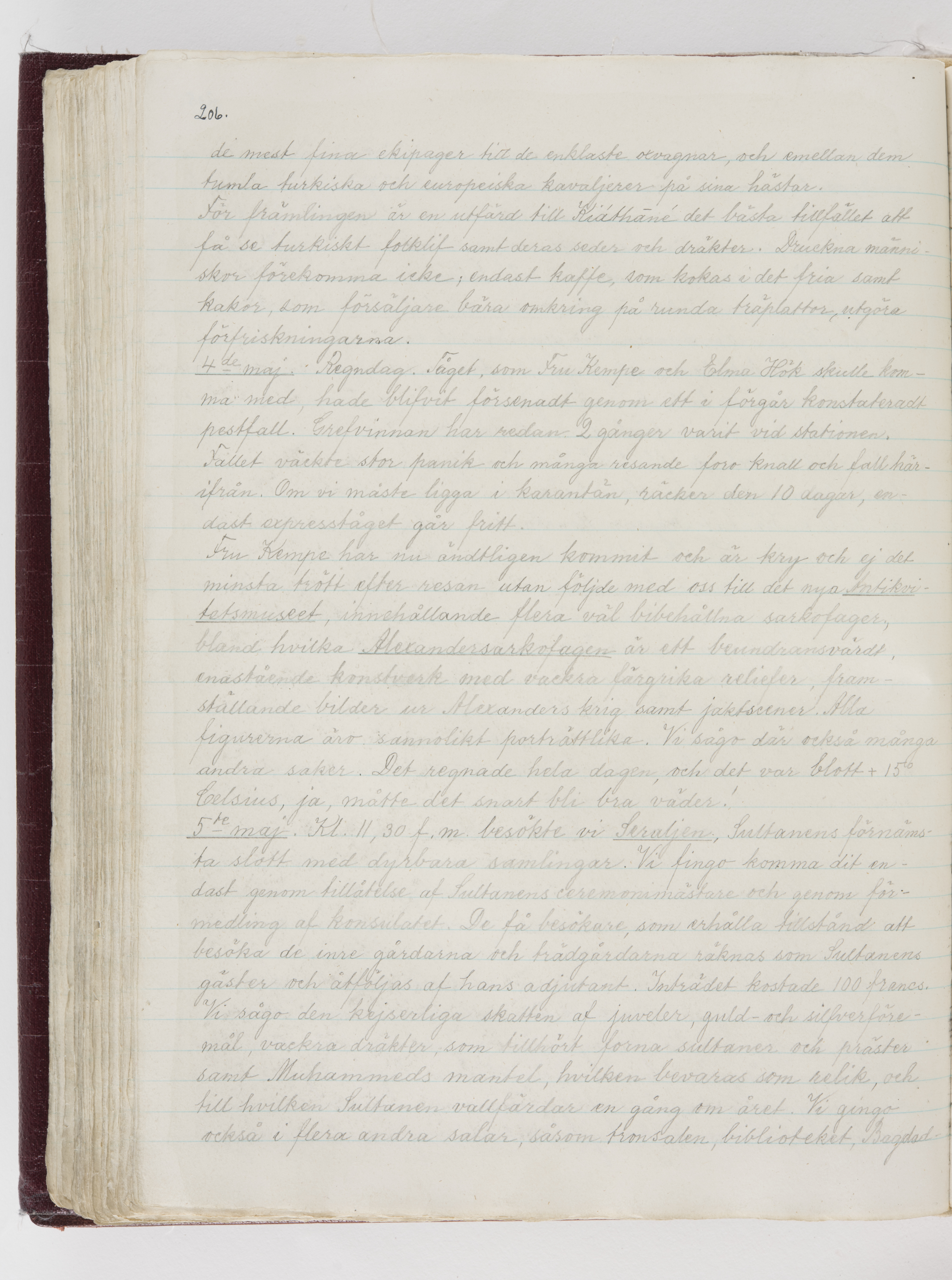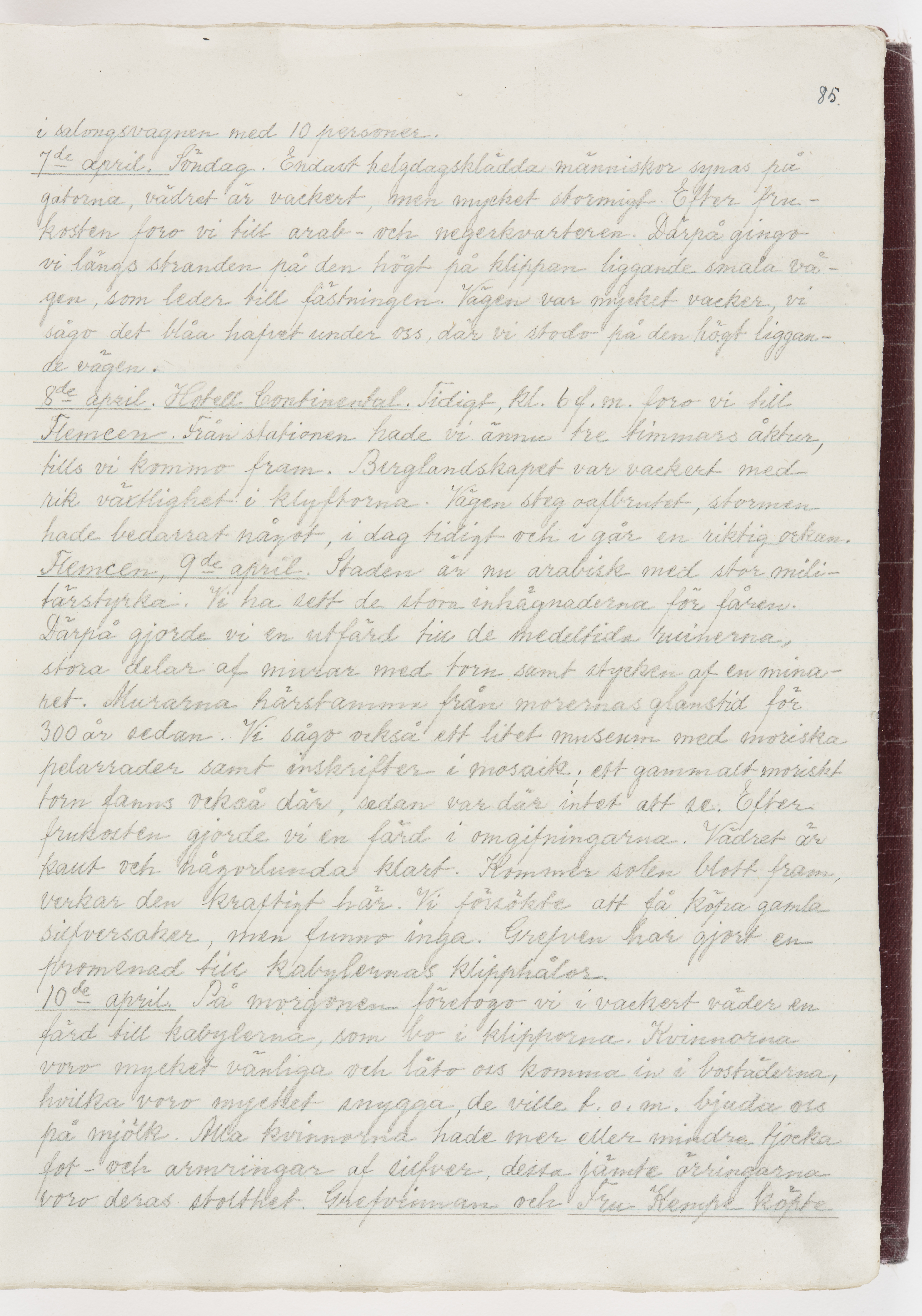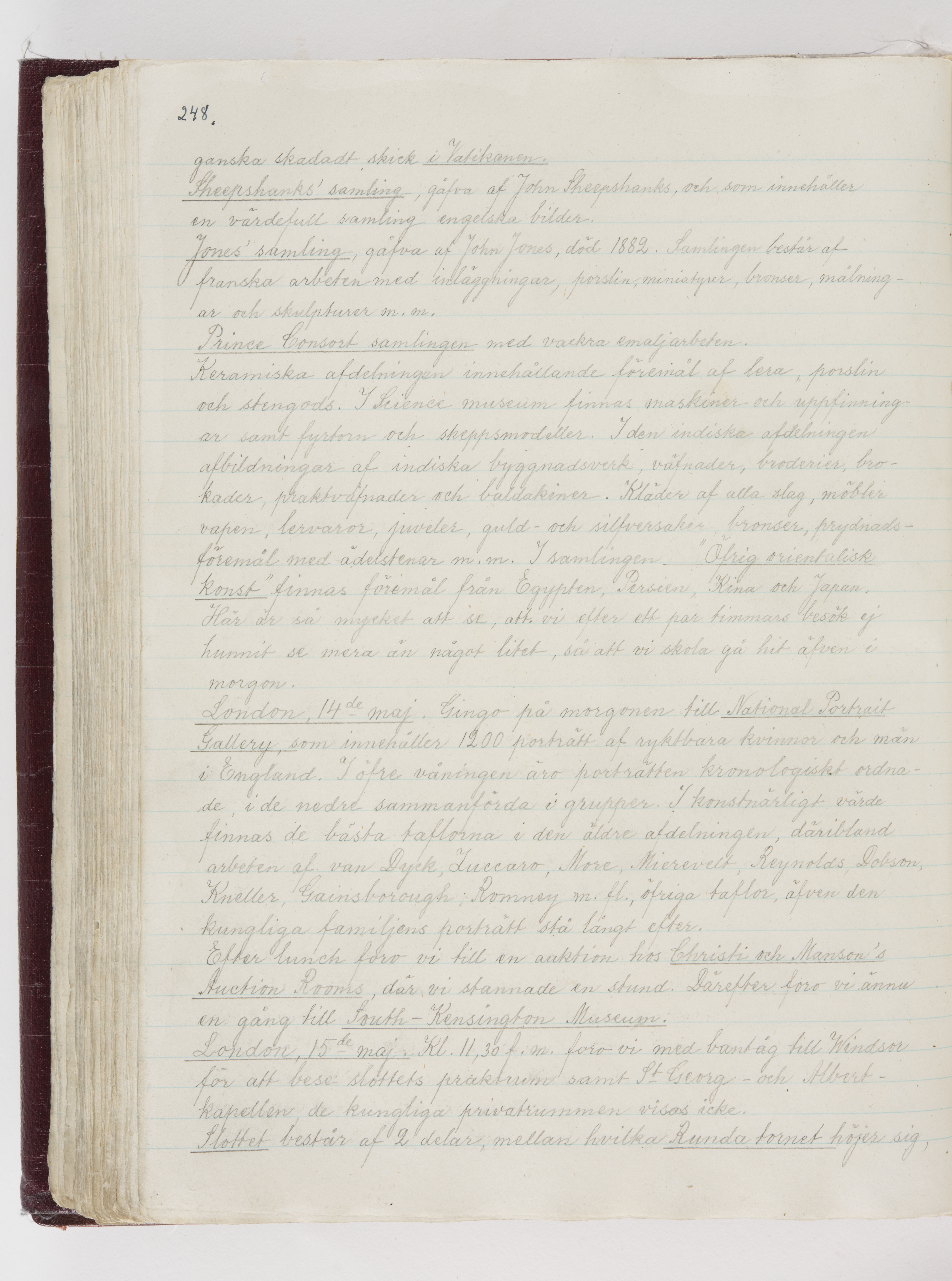 Översättning till svenska språket av dagbok skriven på tyska språket av Ida Uhse under resor tillsammans med Walther och Wilhelmina von Hallwyl åren 1880-1918 samt företeckning över fynd, gåvor och inköpta föremål under resorna åren 1881-1918. Av Signe Berglöf. 309 s. Skrivet med blyerts. Band (helt skinn-). Av brun >>oasis morocco>>, bundet med dubble ansättning och >>knäpprygg>>. Kapitäl av gult sämskskinn. Försättsblad av läderimitationspapper i brunt och svart. Fals av röd klot. 32*25*4,8 cm. Bundet av bokbindaren Otto Olsson.