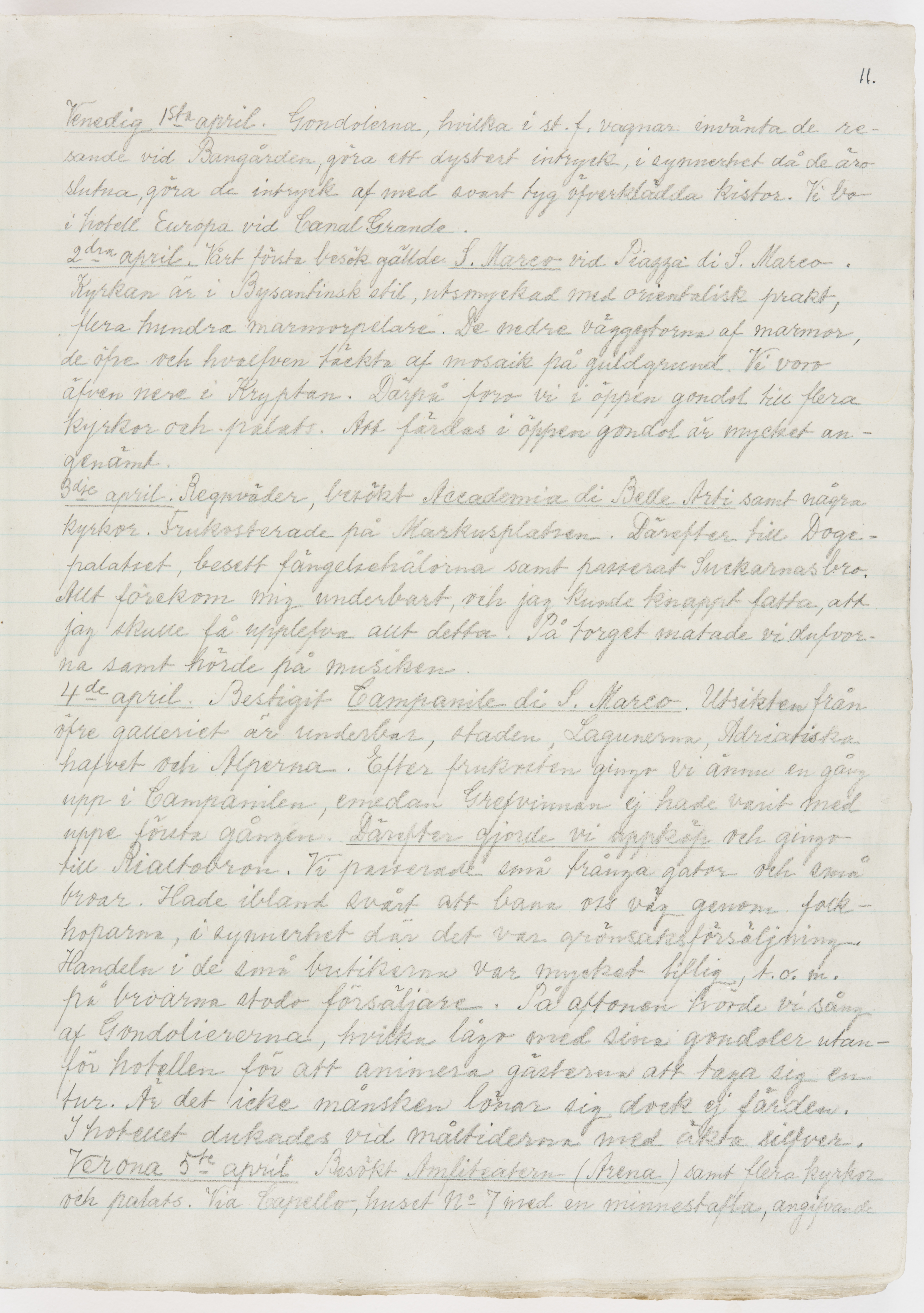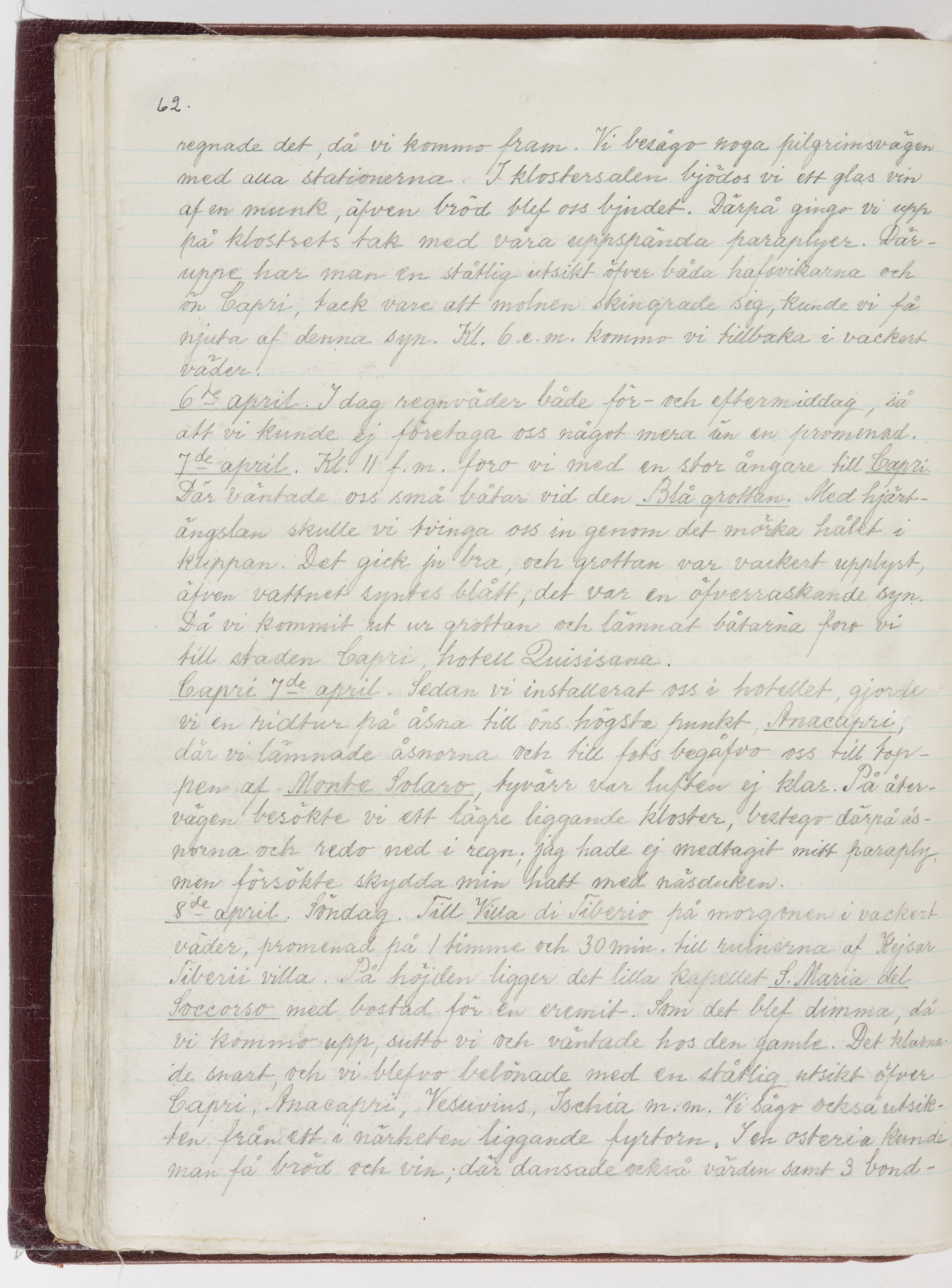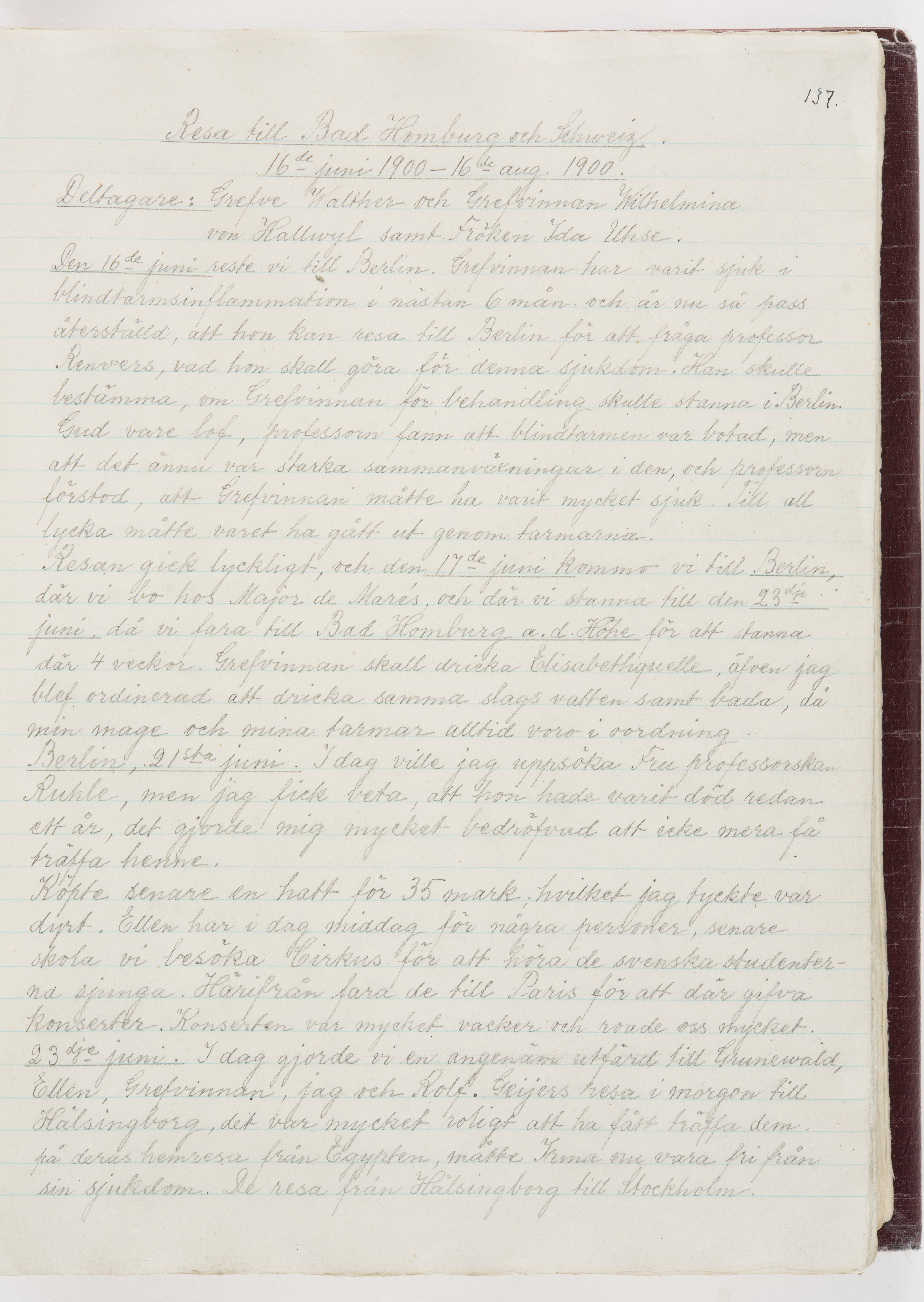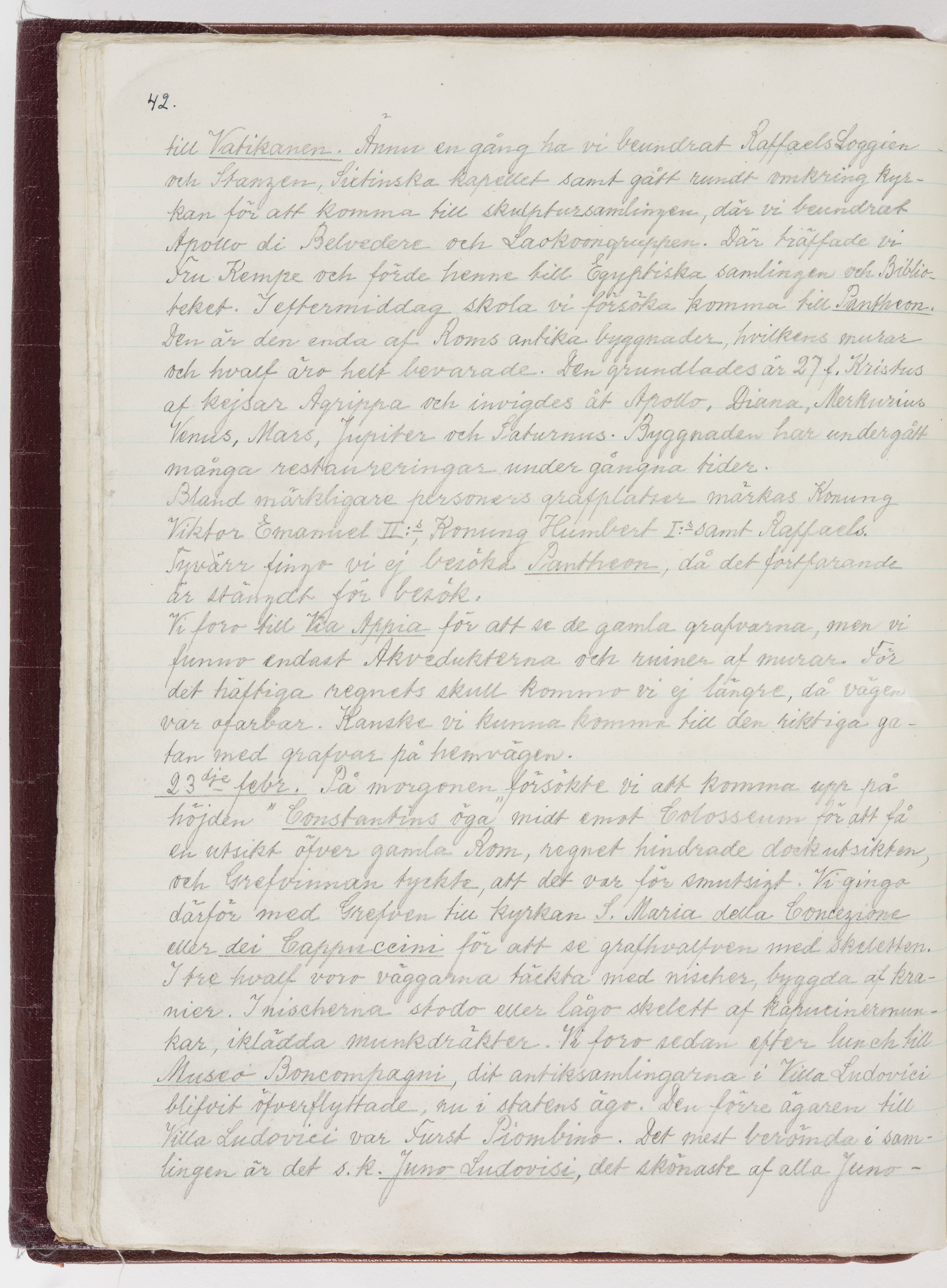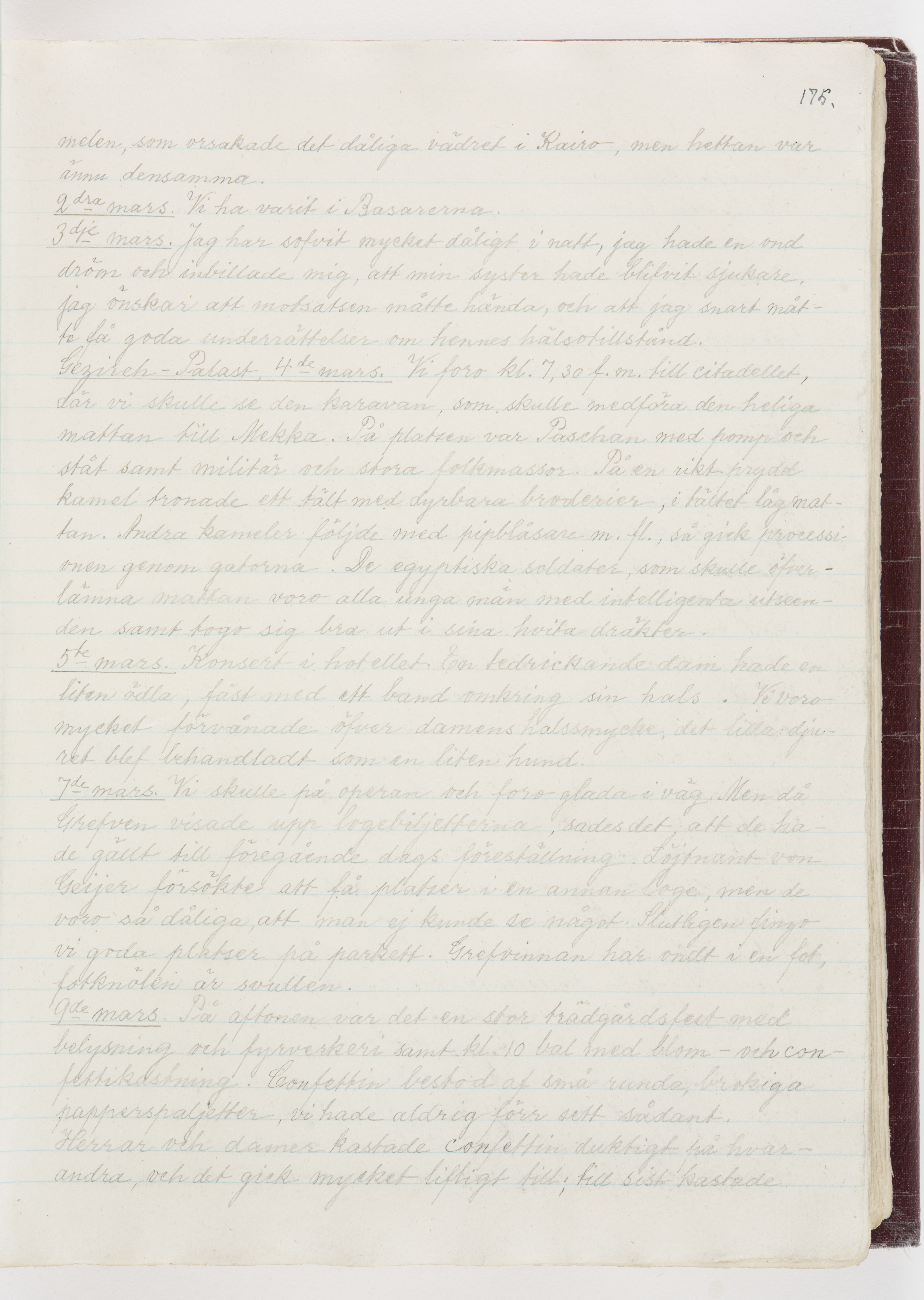 Översättning till svenska språket av dagbok skriven på tyska språket av Ida Uhse under resor tillsammans med Walther och Wilhelmina von Hallwyl åren 1880-1918 samt företeckning över fynd, gåvor och inköpta föremål under resorna åren 1881-1918. Av Signe Berglöf. 309 s. Skrivet med blyerts. Band (helt skinn-). Av brun >>oasis morocco>>, bundet med dubble ansättning och >>knäpprygg>>. Kapitäl av gult sämskskinn. Försättsblad av läderimitationspapper i brunt och svart. Fals av röd klot. 32*25*4,8 cm. Bundet av bokbindaren Otto Olsson.