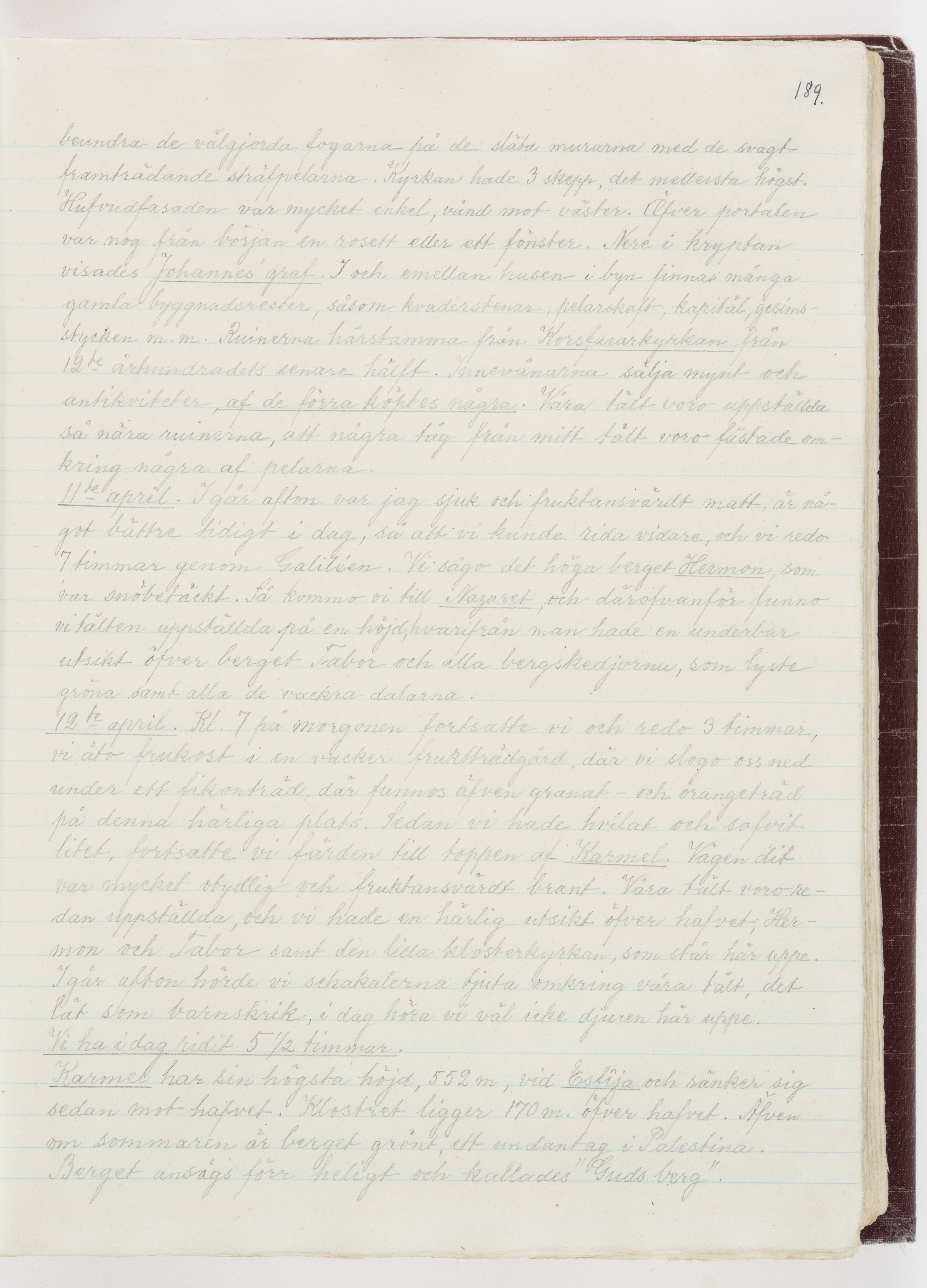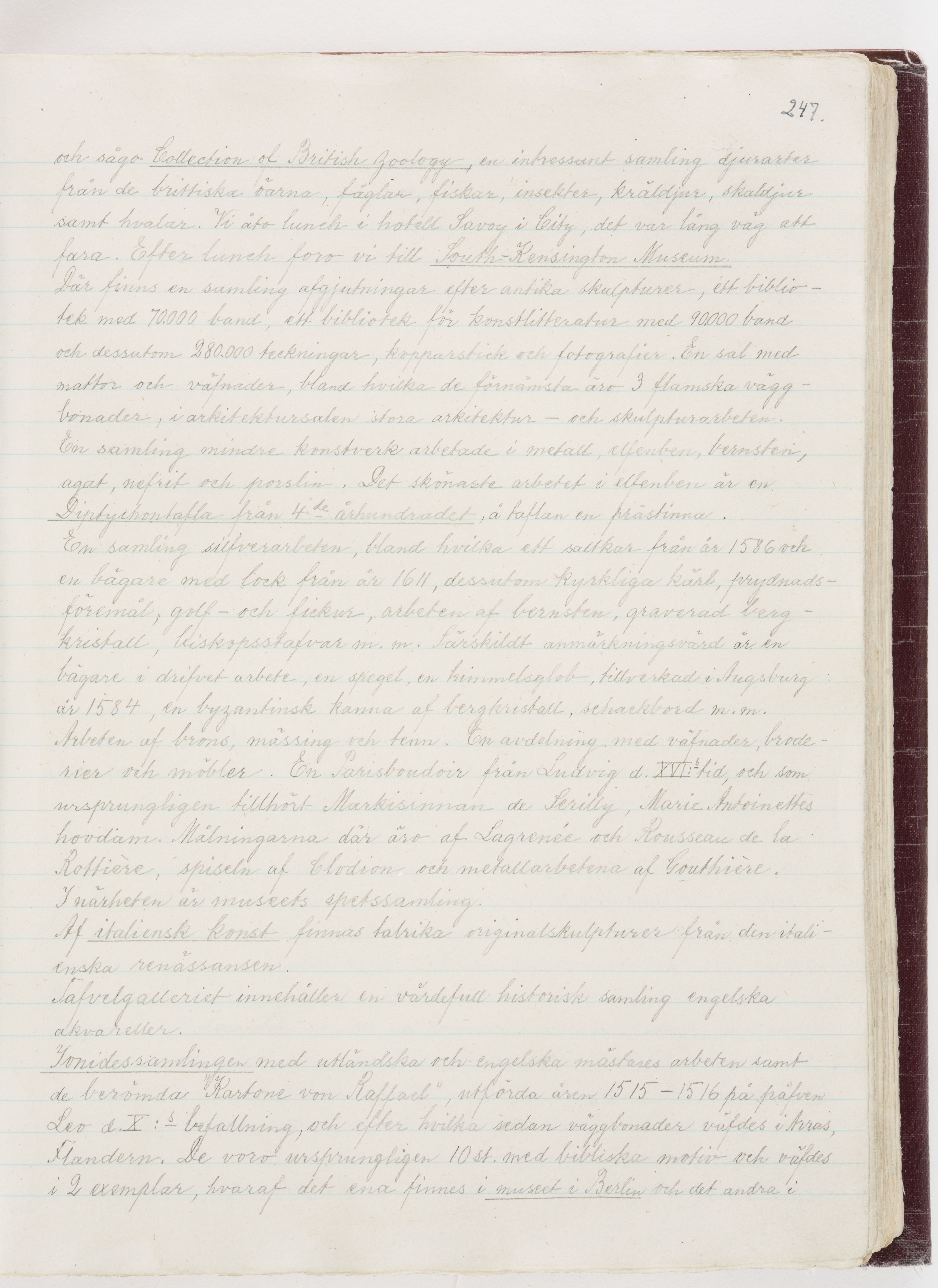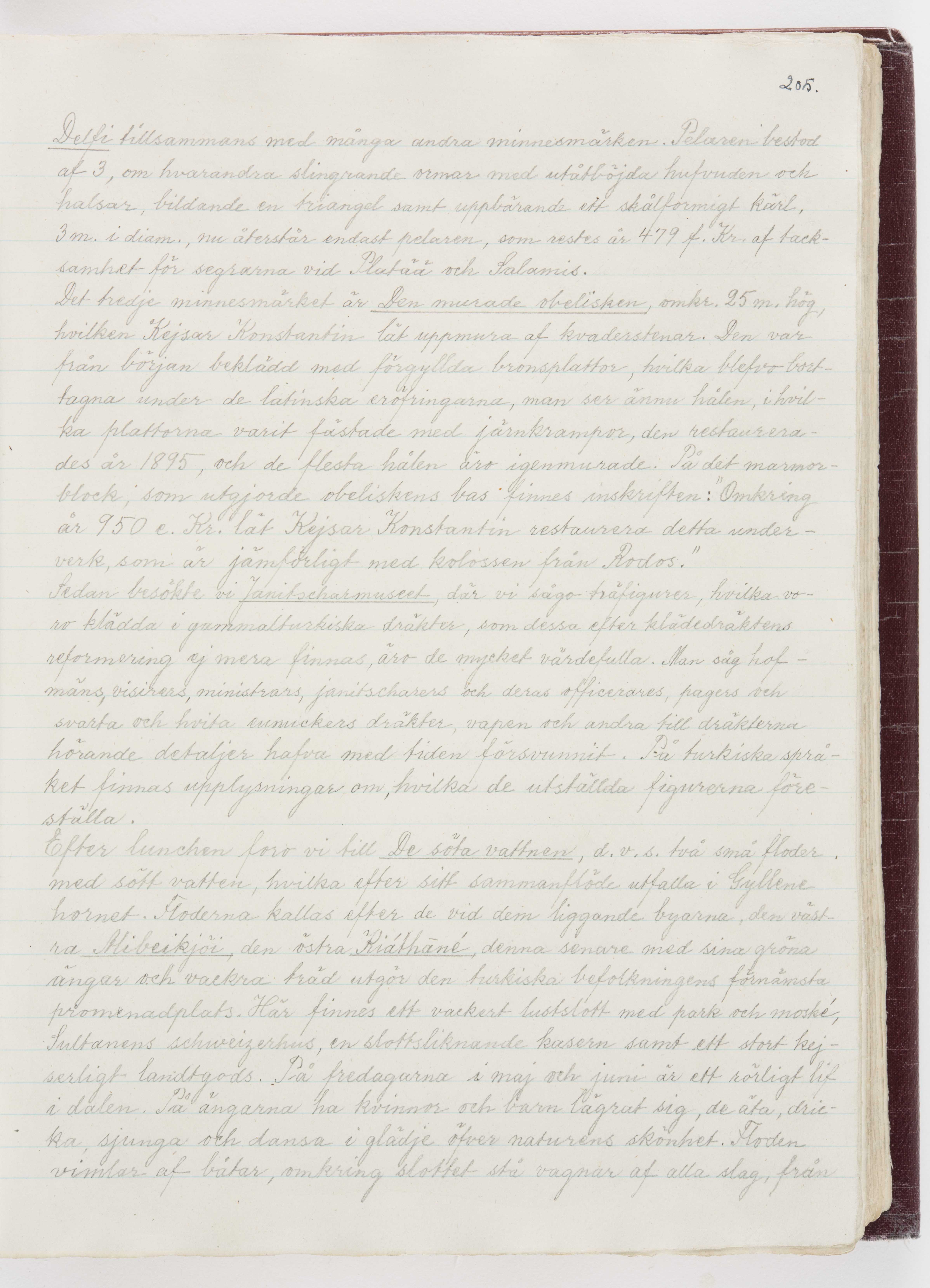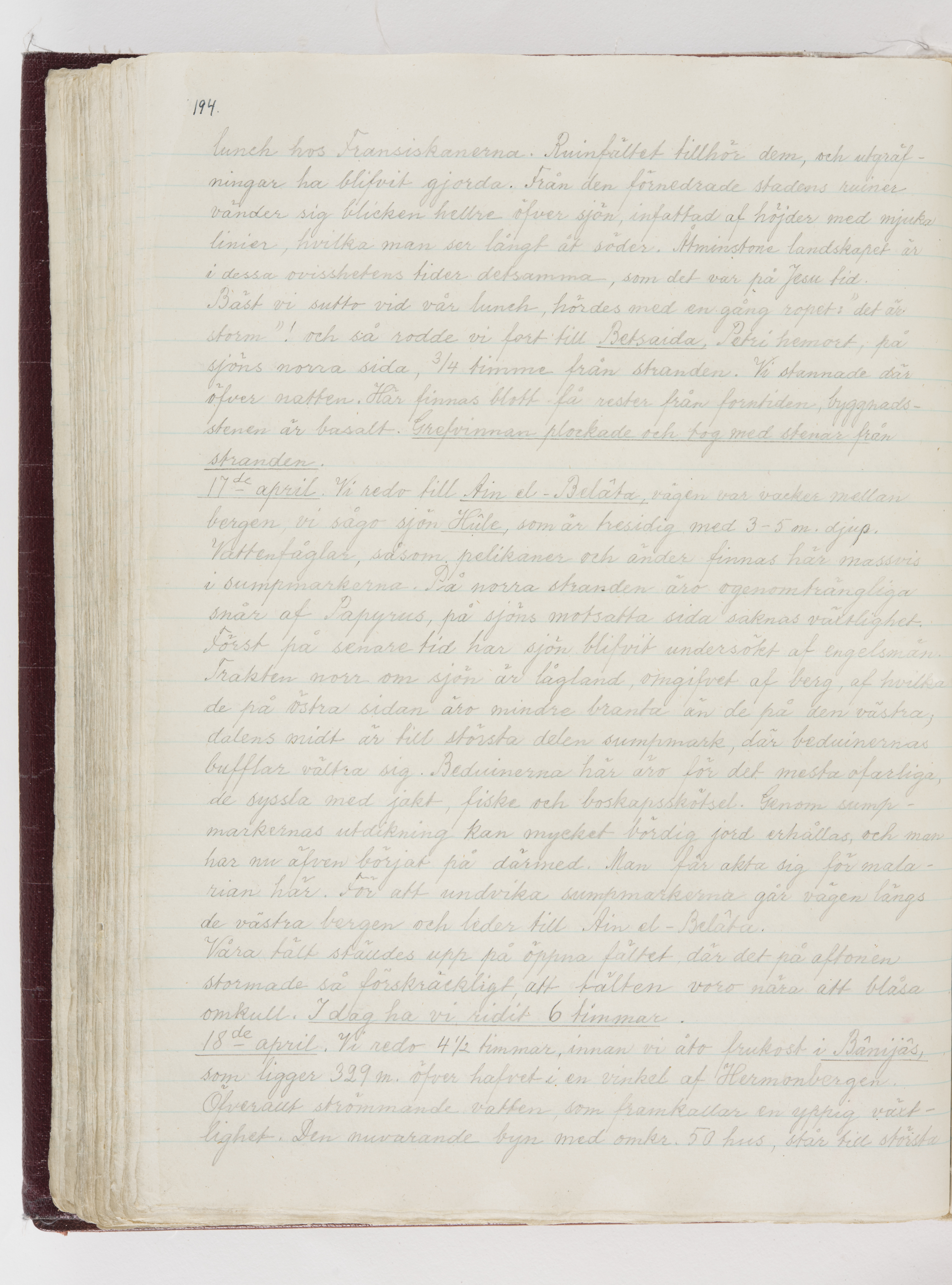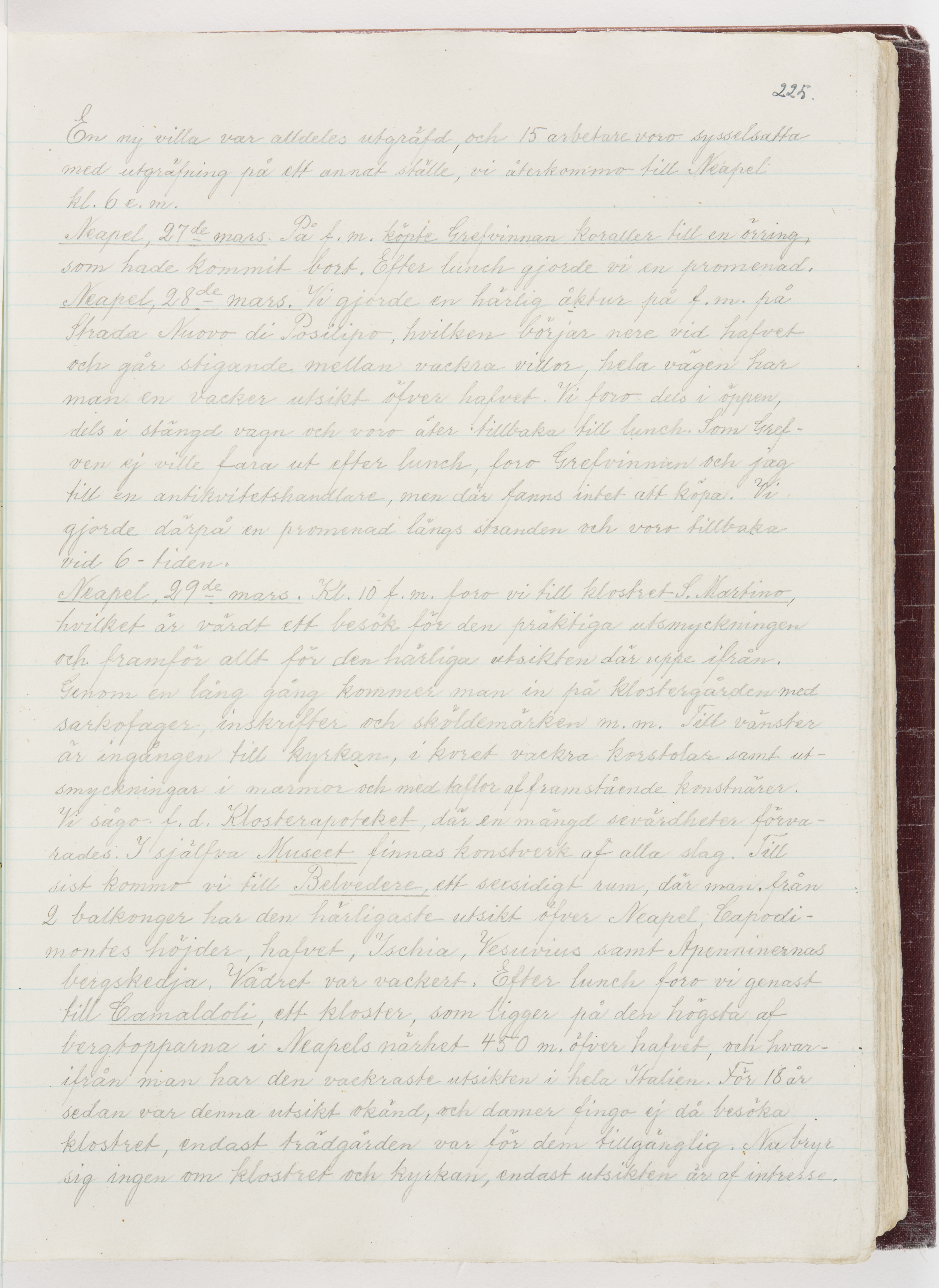 Översättning till svenska språket av dagbok skriven på tyska språket av Ida Uhse under resor tillsammans med Walther och Wilhelmina von Hallwyl åren 1880-1918 samt företeckning över fynd, gåvor och inköpta föremål under resorna åren 1881-1918. Av Signe Berglöf. 309 s. Skrivet med blyerts. Band (helt skinn-). Av brun >>oasis morocco>>, bundet med dubble ansättning och >>knäpprygg>>. Kapitäl av gult sämskskinn. Försättsblad av läderimitationspapper i brunt och svart. Fals av röd klot. 32*25*4,8 cm. Bundet av bokbindaren Otto Olsson.