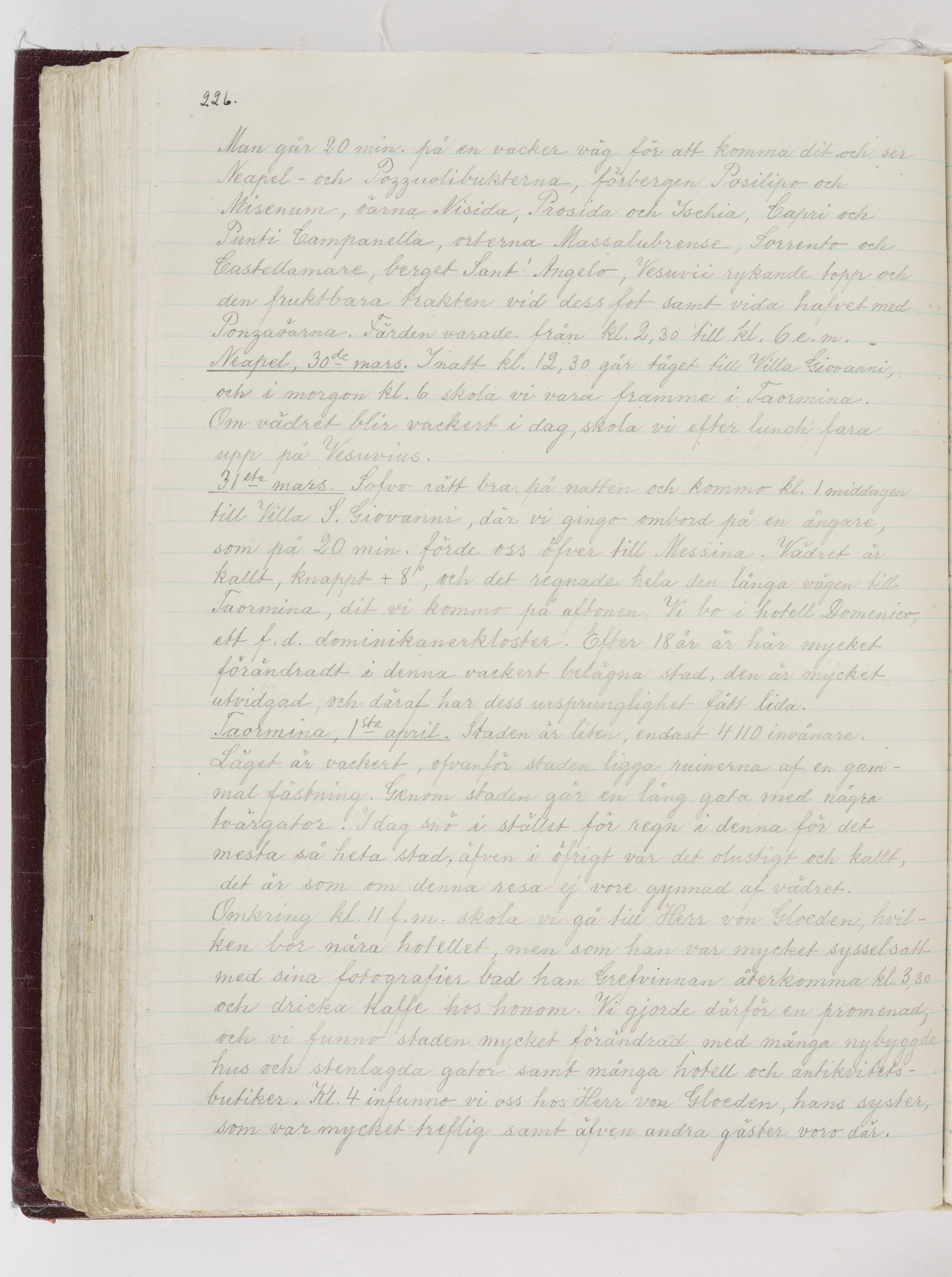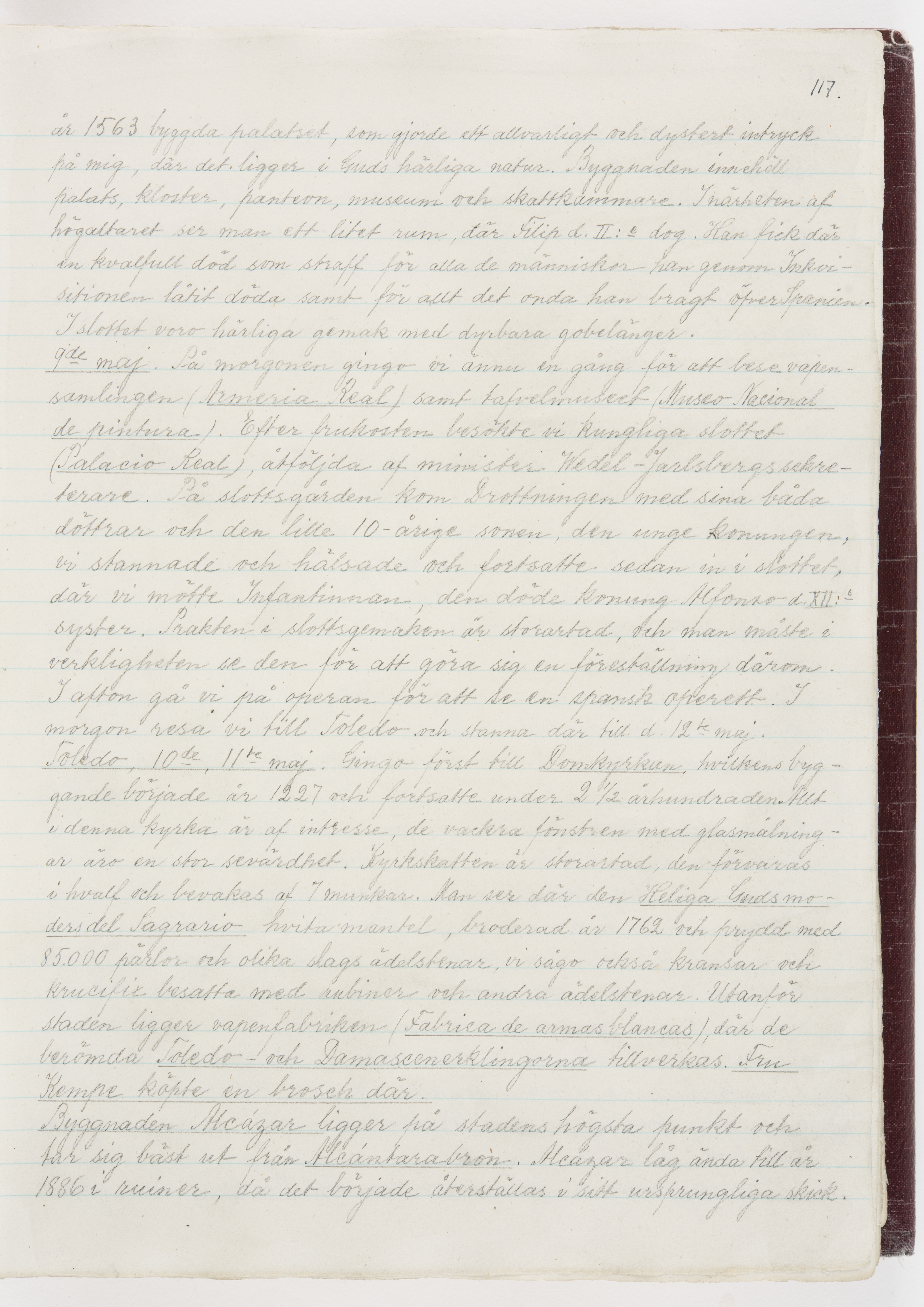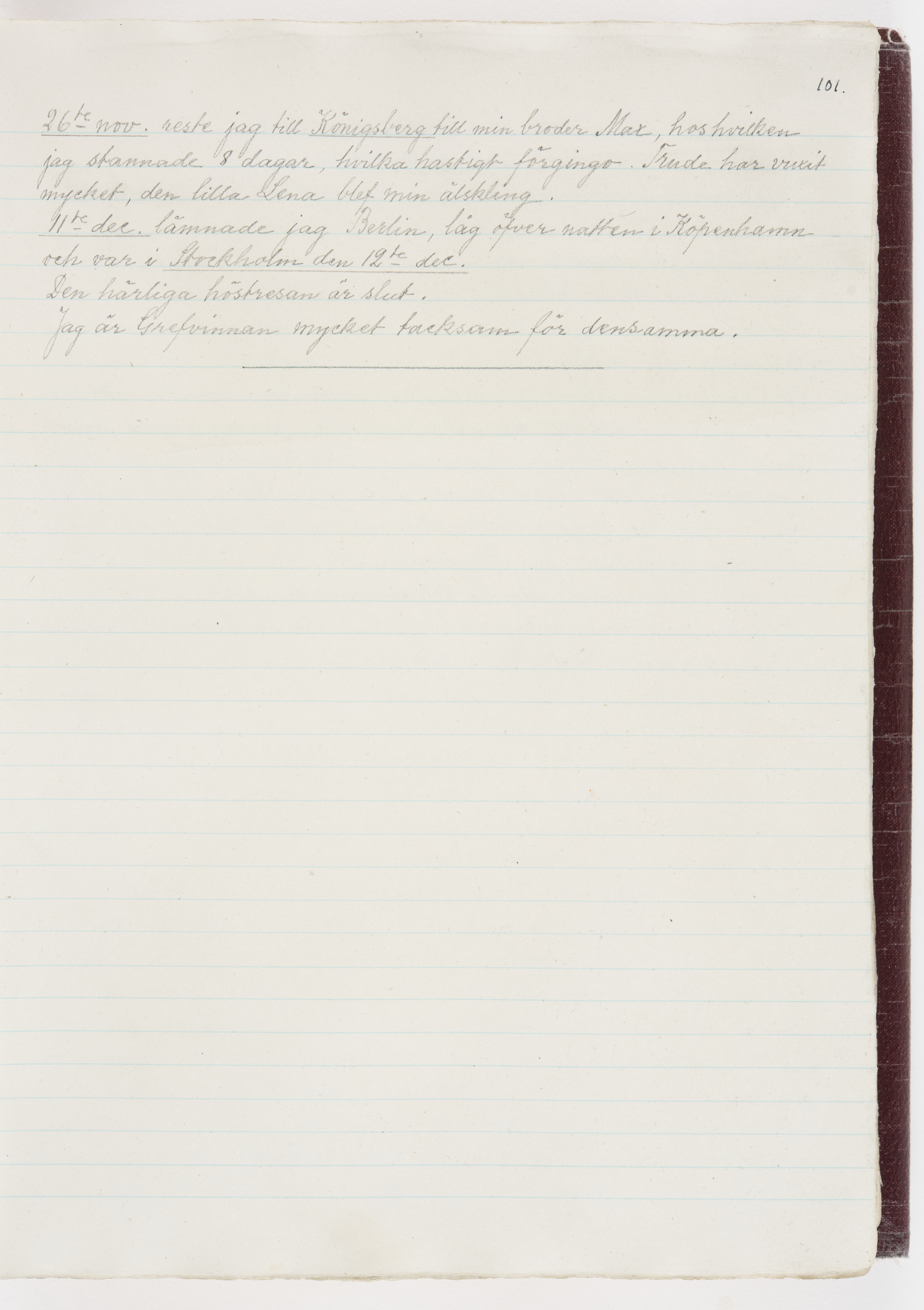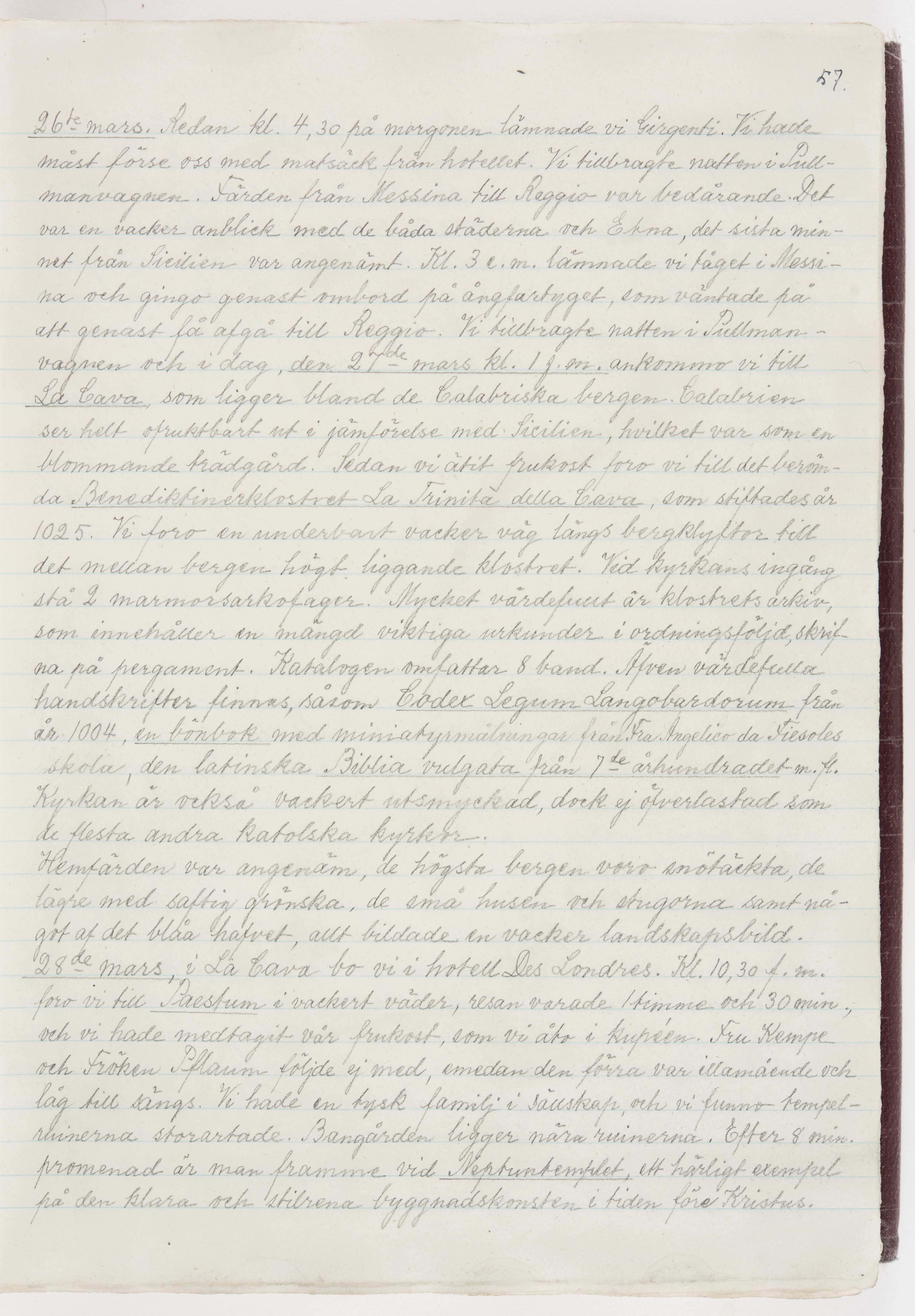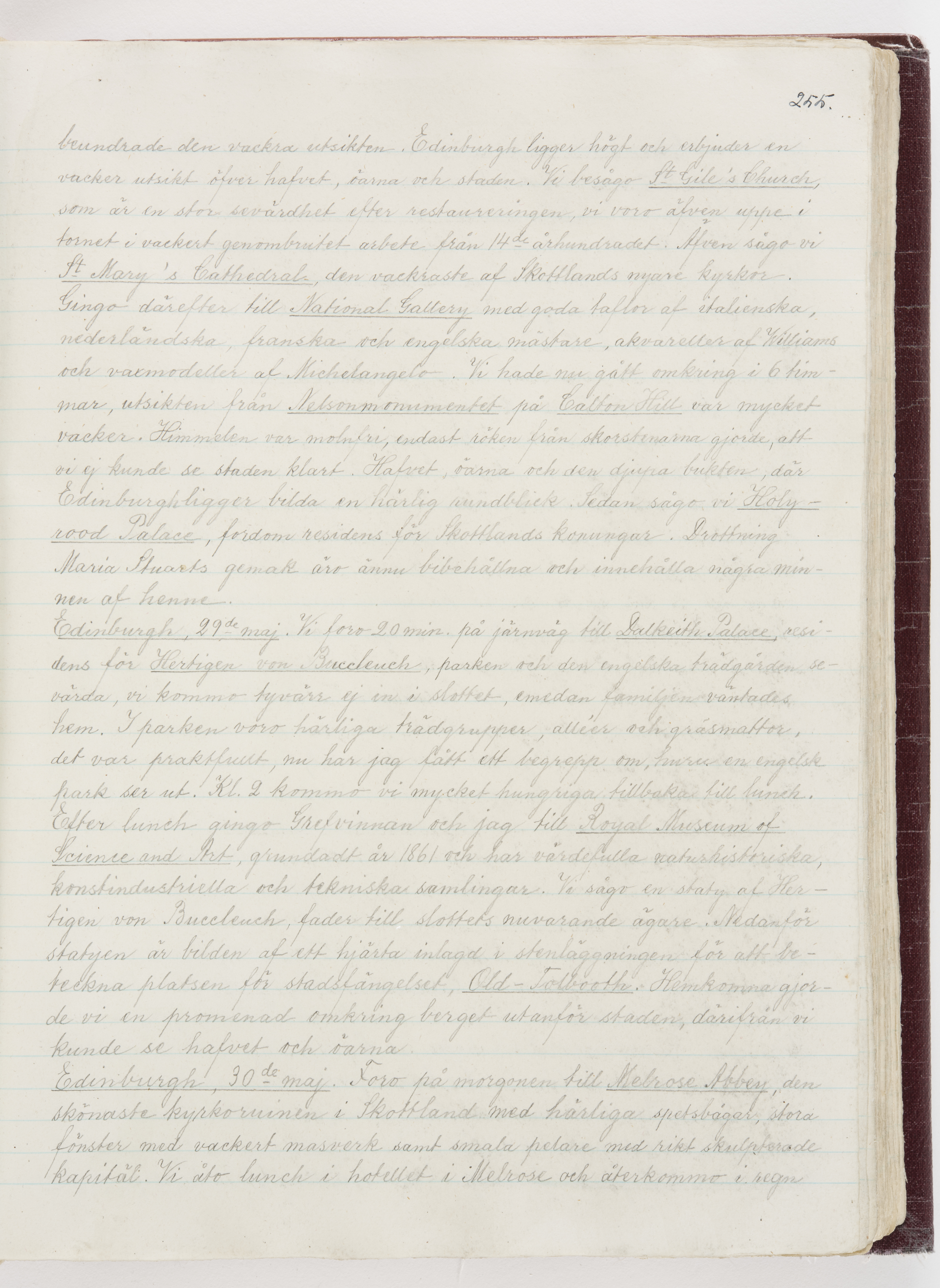 Översättning till svenska språket av dagbok skriven på tyska språket av Ida Uhse under resor tillsammans med Walther och Wilhelmina von Hallwyl åren 1880-1918 samt företeckning över fynd, gåvor och inköpta föremål under resorna åren 1881-1918. Av Signe Berglöf. 309 s. Skrivet med blyerts. Band (helt skinn-). Av brun >>oasis morocco>>, bundet med dubble ansättning och >>knäpprygg>>. Kapitäl av gult sämskskinn. Försättsblad av läderimitationspapper i brunt och svart. Fals av röd klot. 32*25*4,8 cm. Bundet av bokbindaren Otto Olsson.