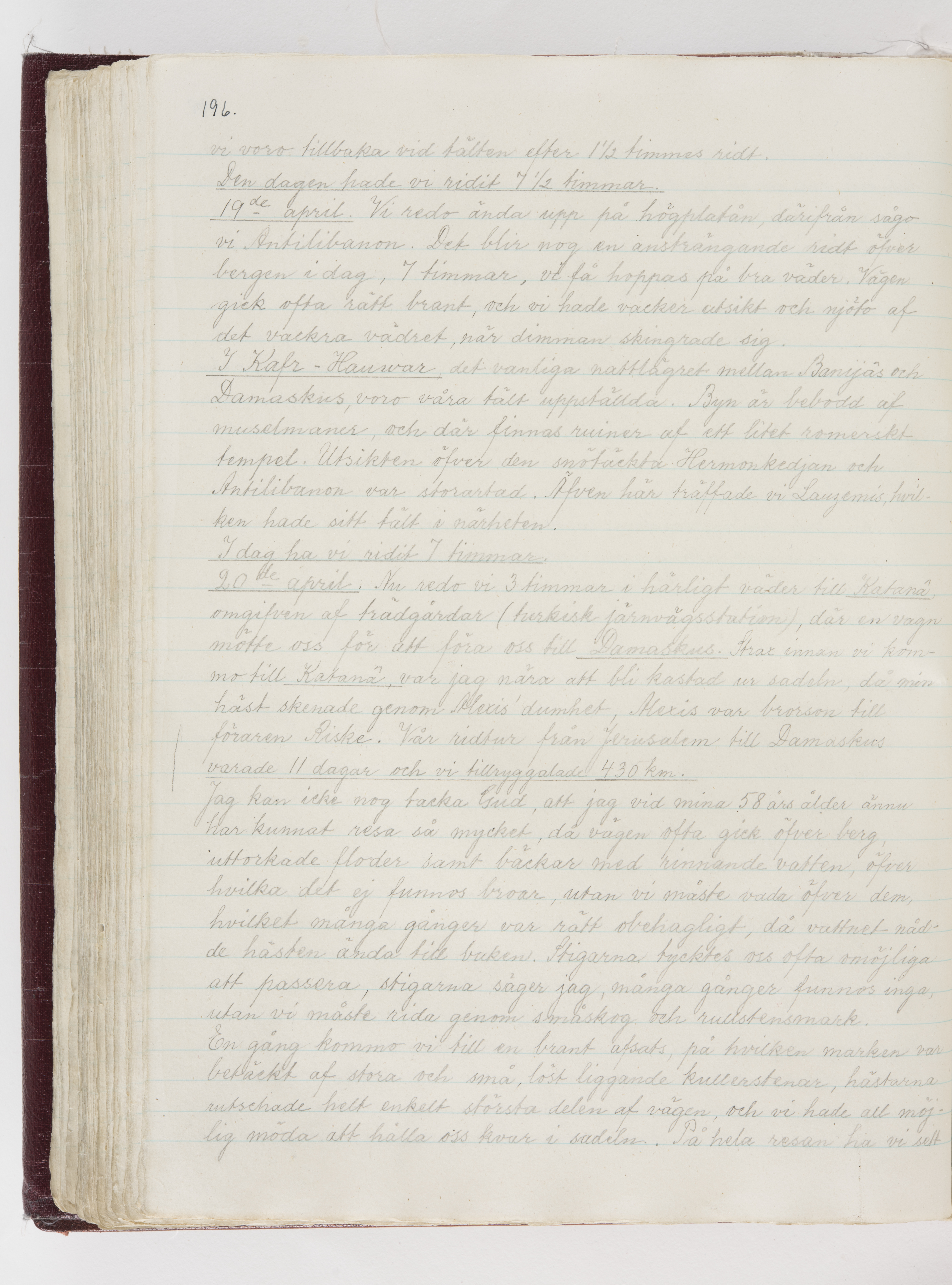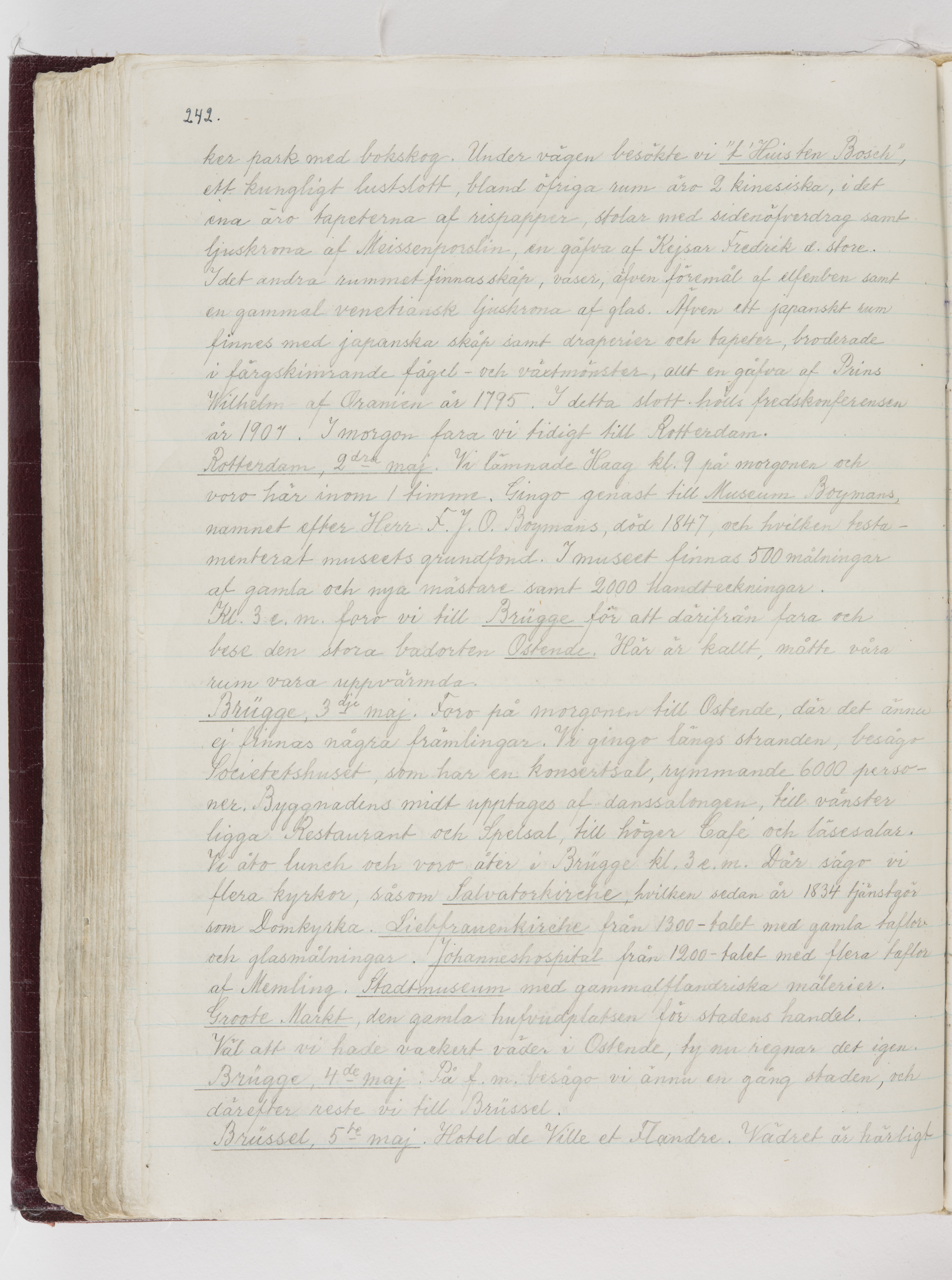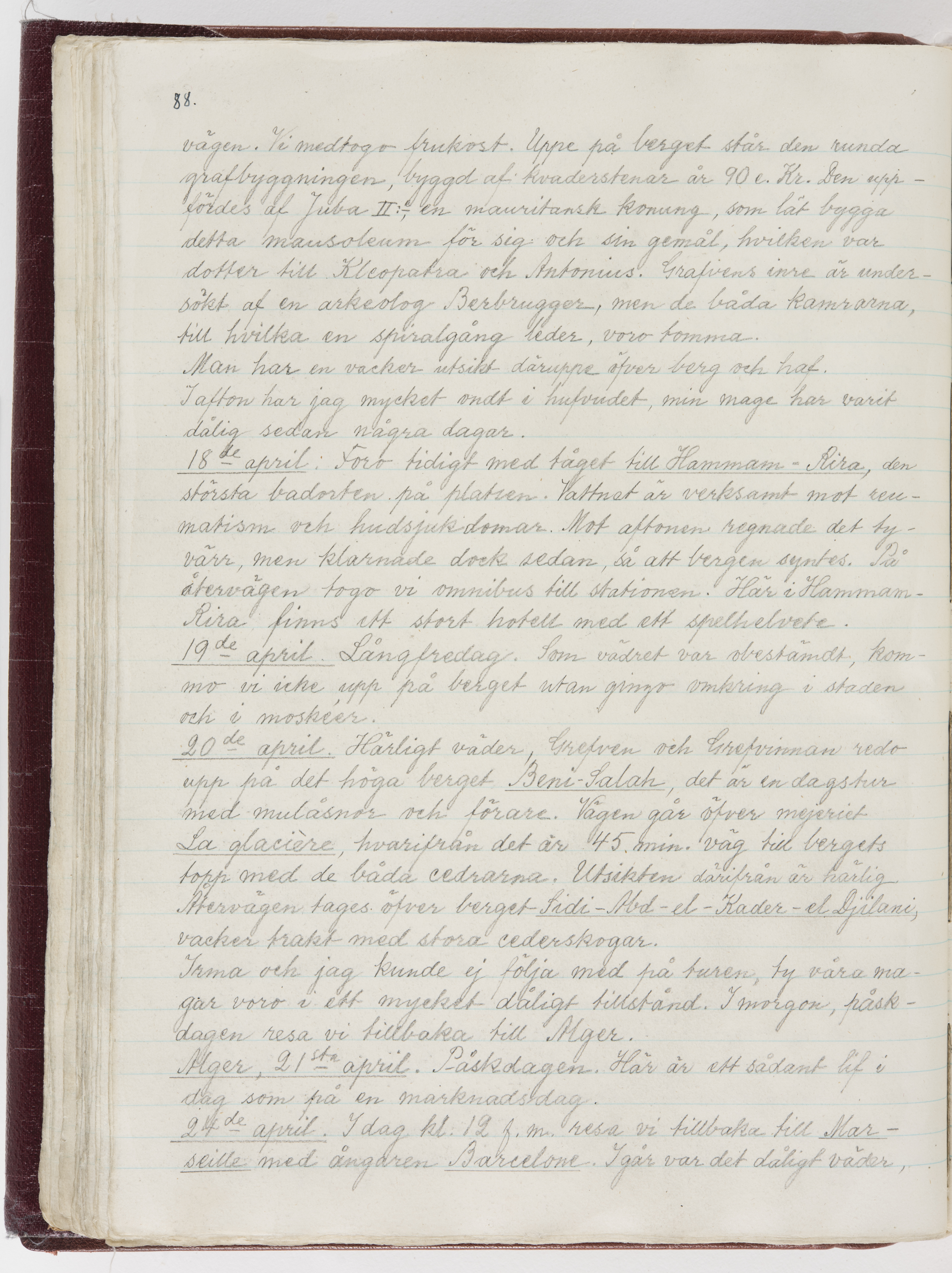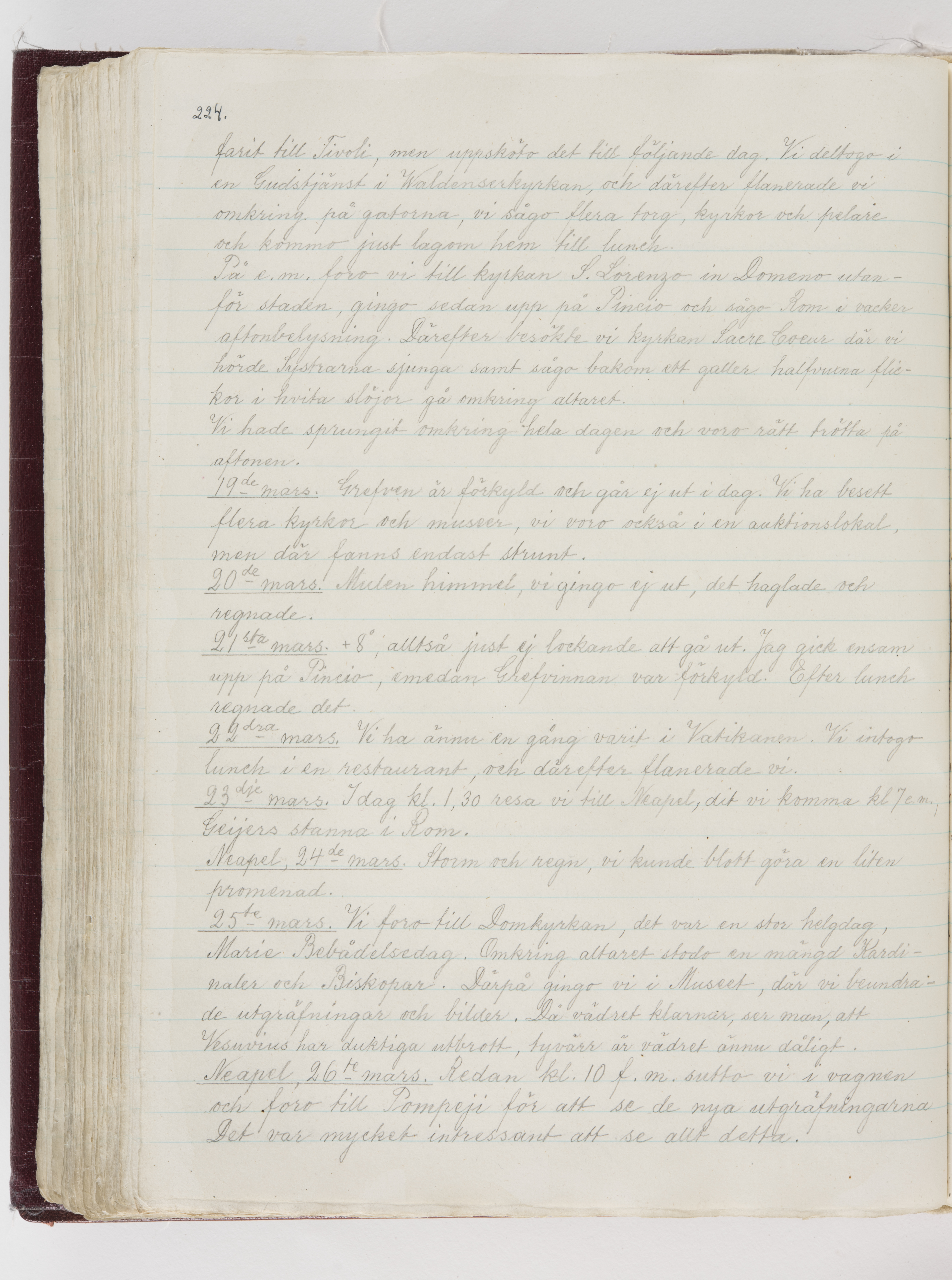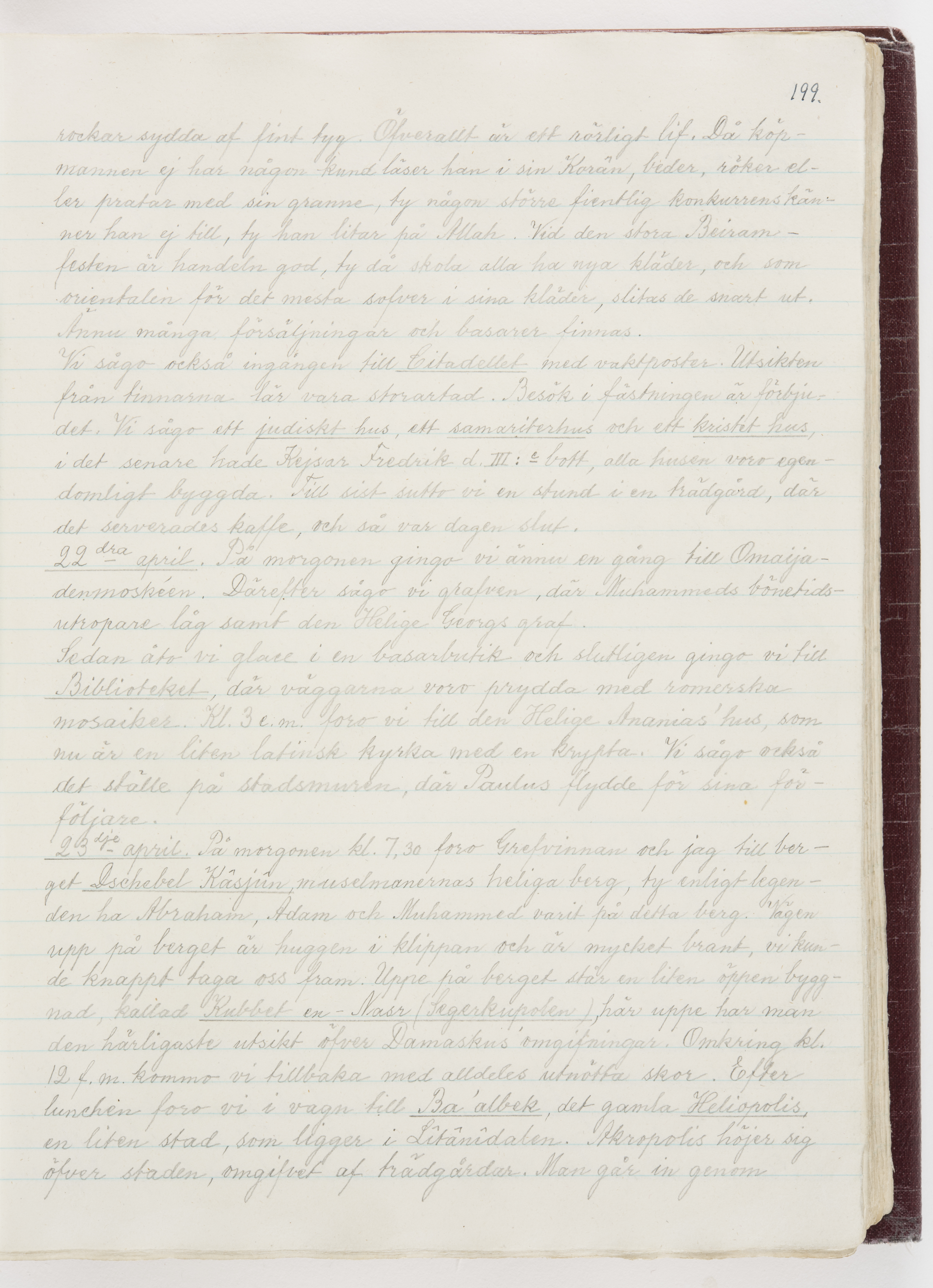 Översättning till svenska språket av dagbok skriven på tyska språket av Ida Uhse under resor tillsammans med Walther och Wilhelmina von Hallwyl åren 1880-1918 samt företeckning över fynd, gåvor och inköpta föremål under resorna åren 1881-1918. Av Signe Berglöf. 309 s. Skrivet med blyerts. Band (helt skinn-). Av brun >>oasis morocco>>, bundet med dubble ansättning och >>knäpprygg>>. Kapitäl av gult sämskskinn. Försättsblad av läderimitationspapper i brunt och svart. Fals av röd klot. 32*25*4,8 cm. Bundet av bokbindaren Otto Olsson.