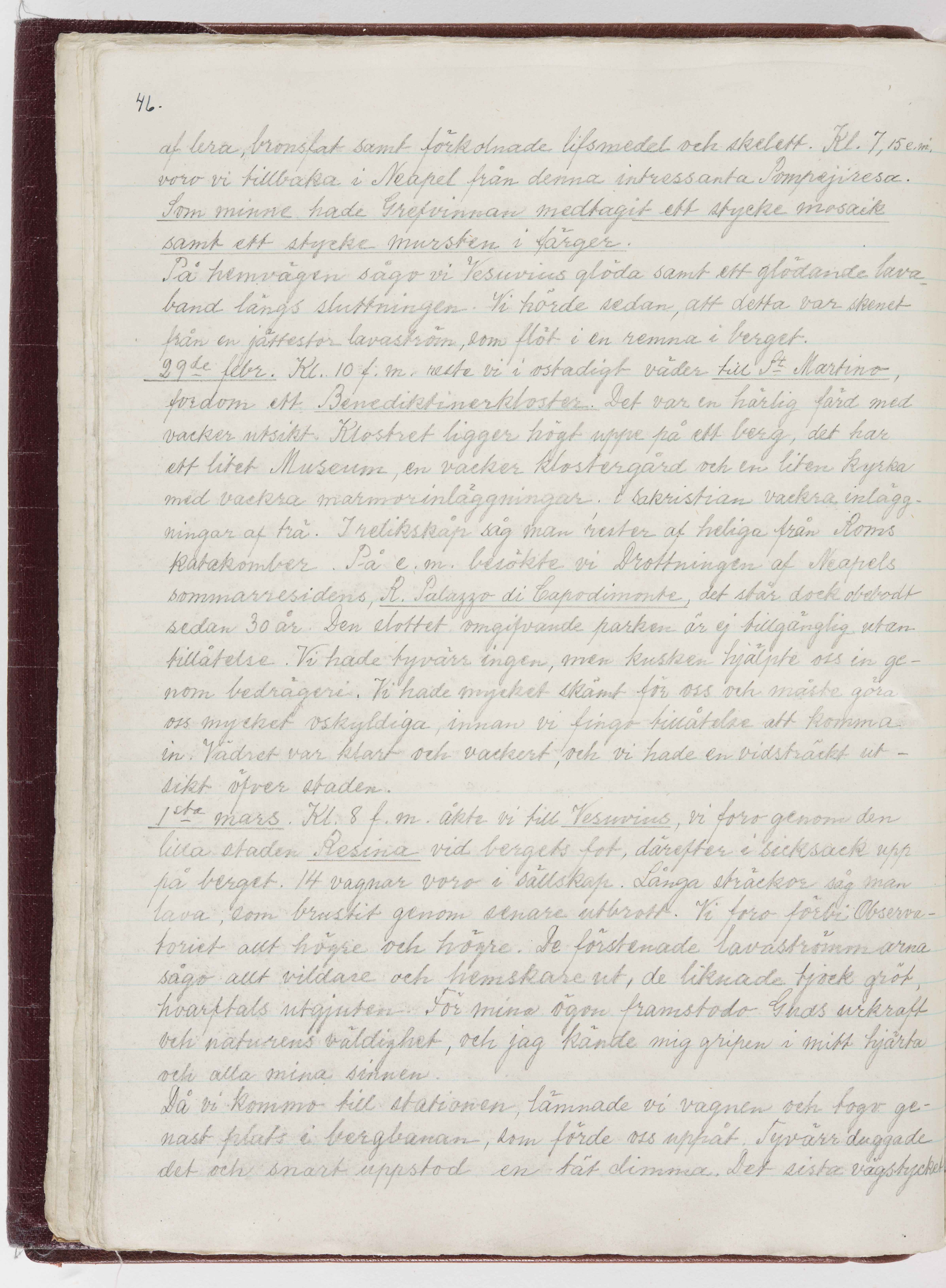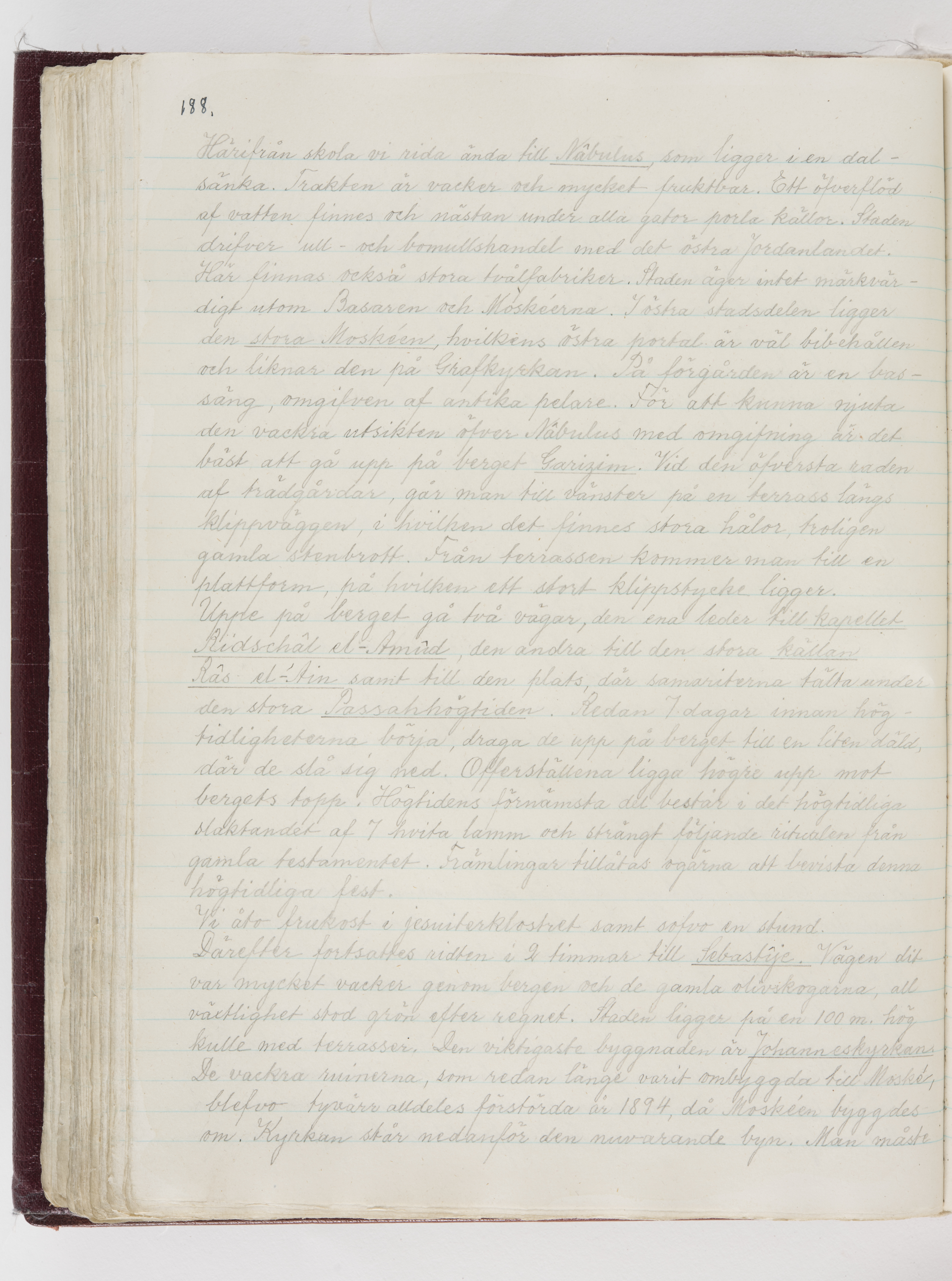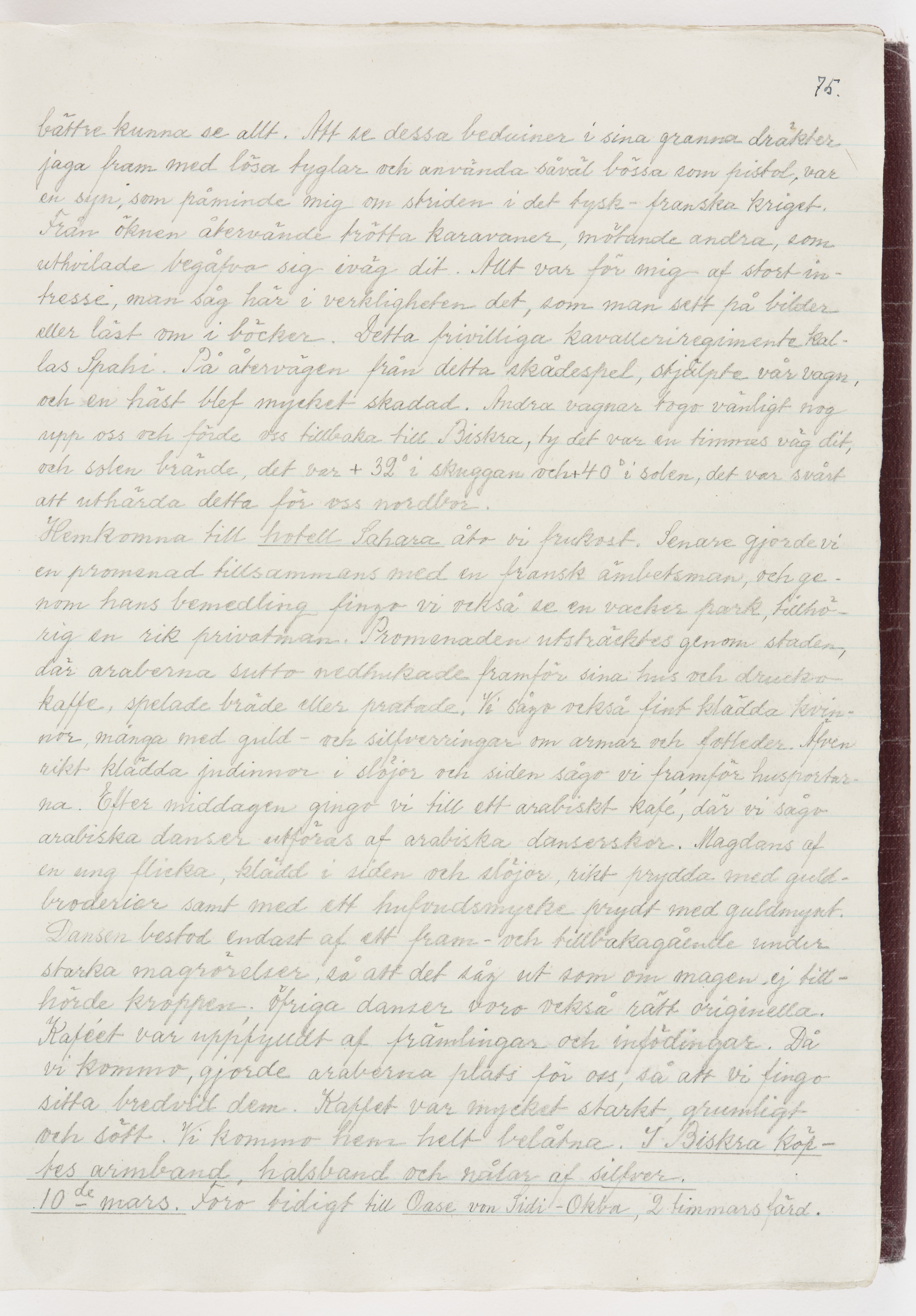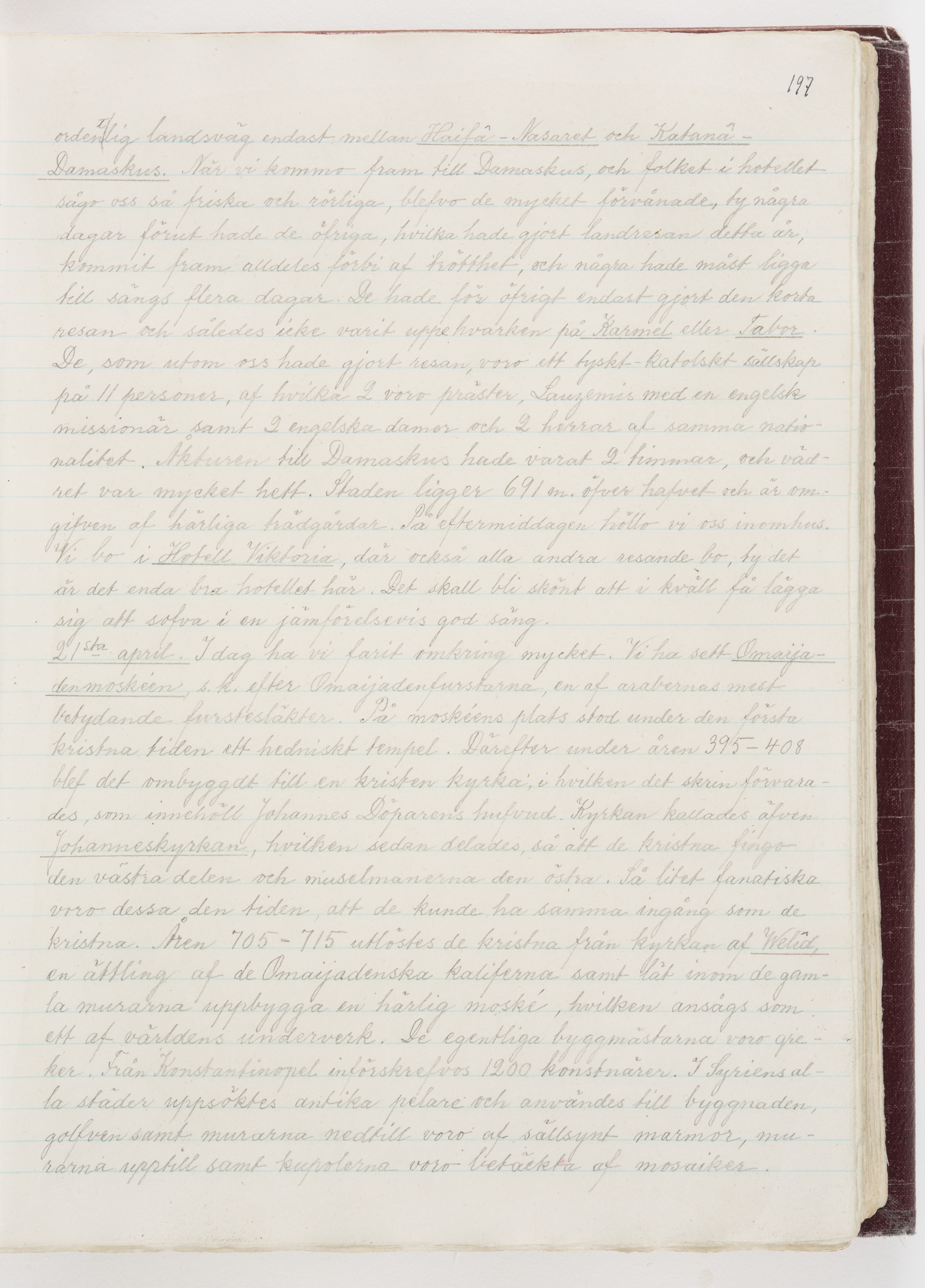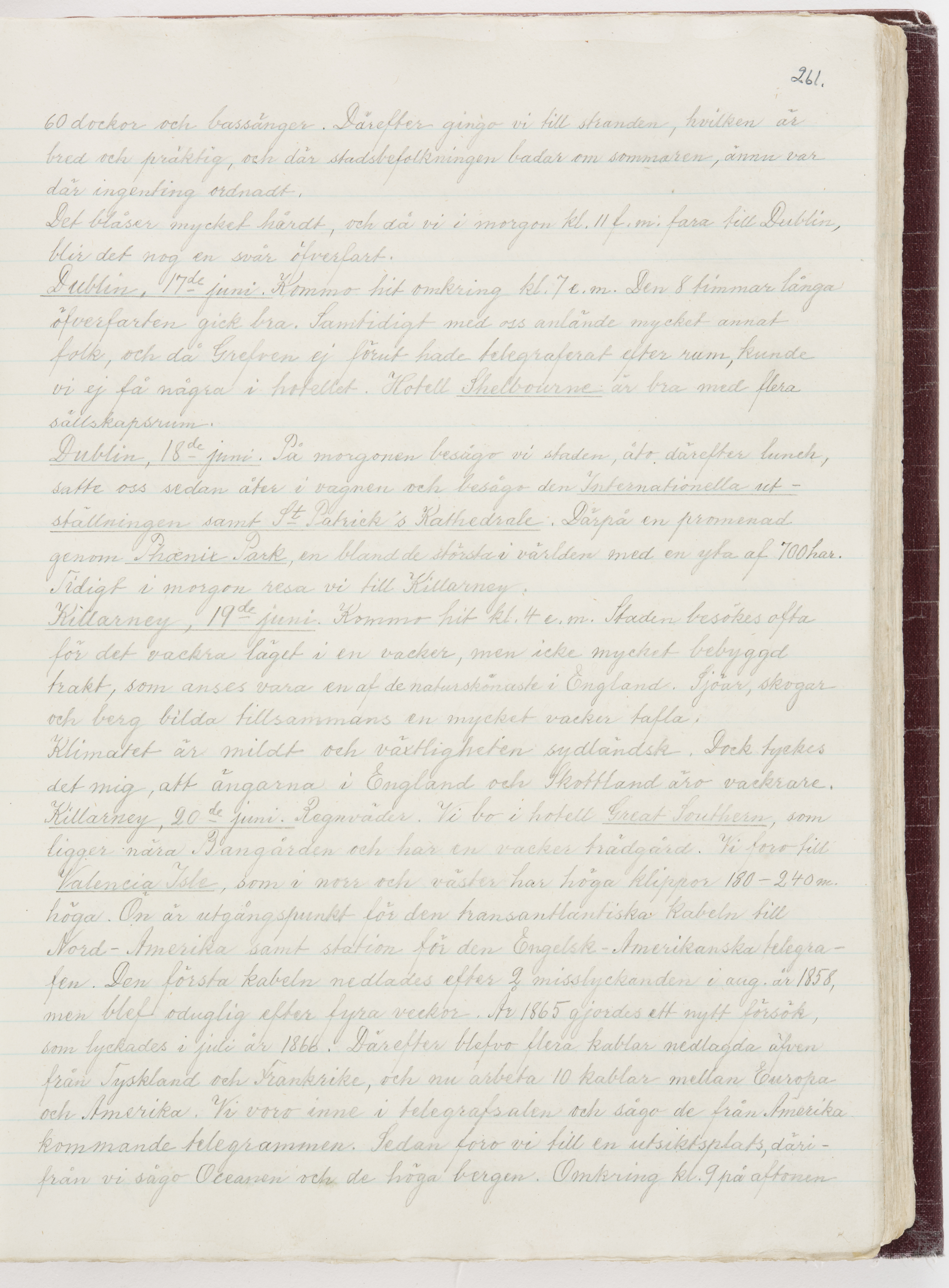 Översättning till svenska språket av dagbok skriven på tyska språket av Ida Uhse under resor tillsammans med Walther och Wilhelmina von Hallwyl åren 1880-1918 samt företeckning över fynd, gåvor och inköpta föremål under resorna åren 1881-1918. Av Signe Berglöf. 309 s. Skrivet med blyerts. Band (helt skinn-). Av brun >>oasis morocco>>, bundet med dubble ansättning och >>knäpprygg>>. Kapitäl av gult sämskskinn. Försättsblad av läderimitationspapper i brunt och svart. Fals av röd klot. 32*25*4,8 cm. Bundet av bokbindaren Otto Olsson.